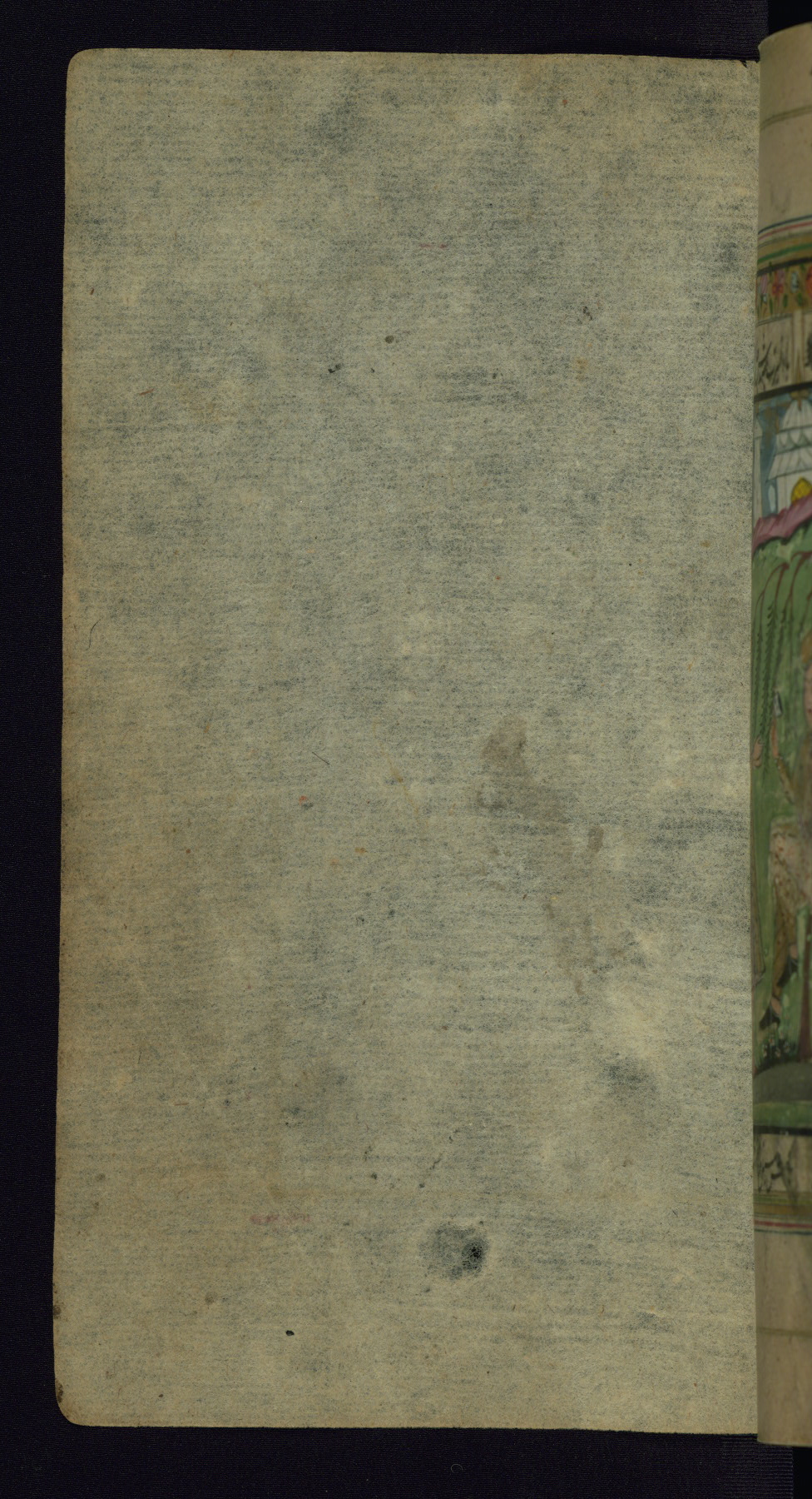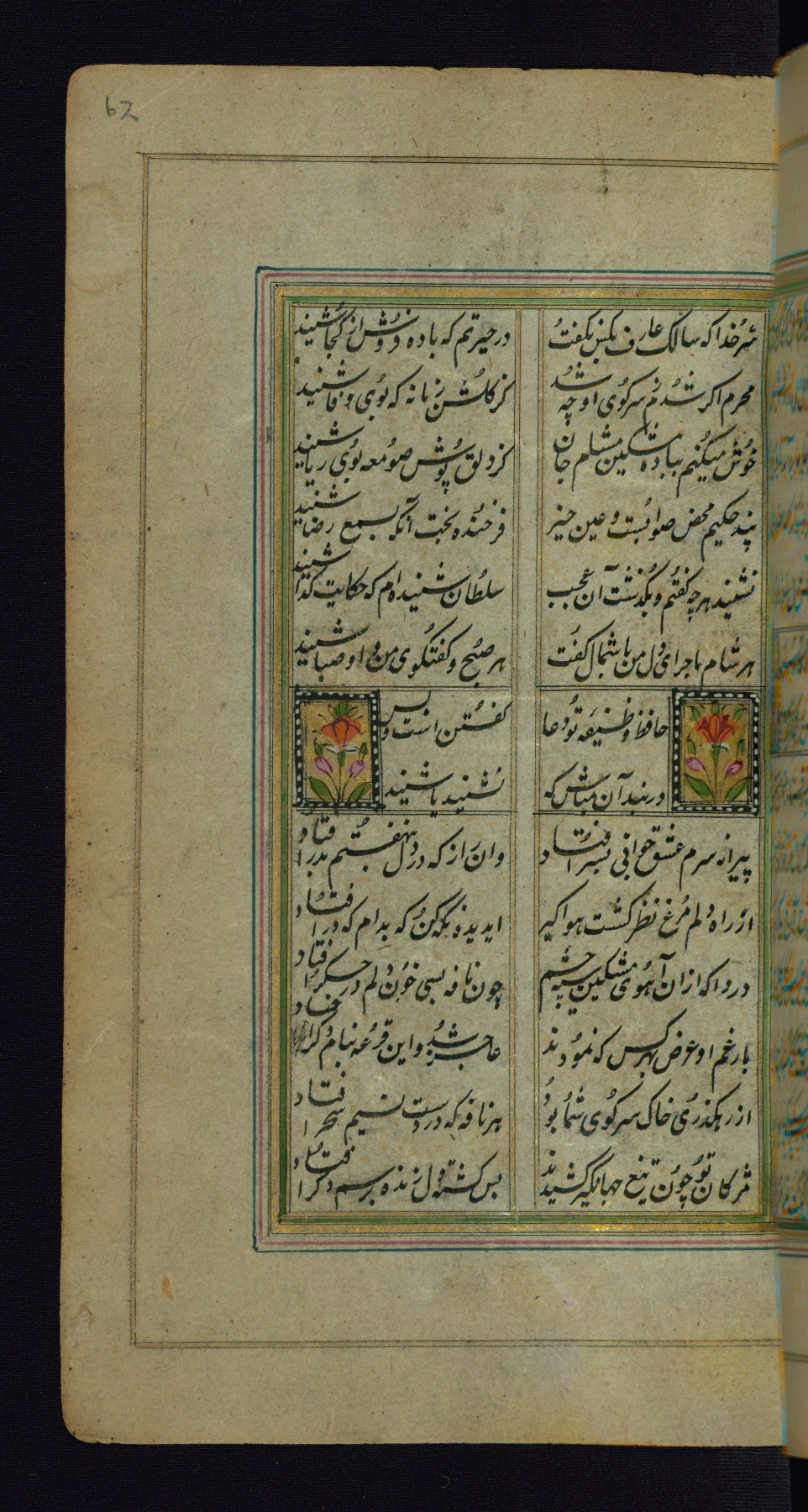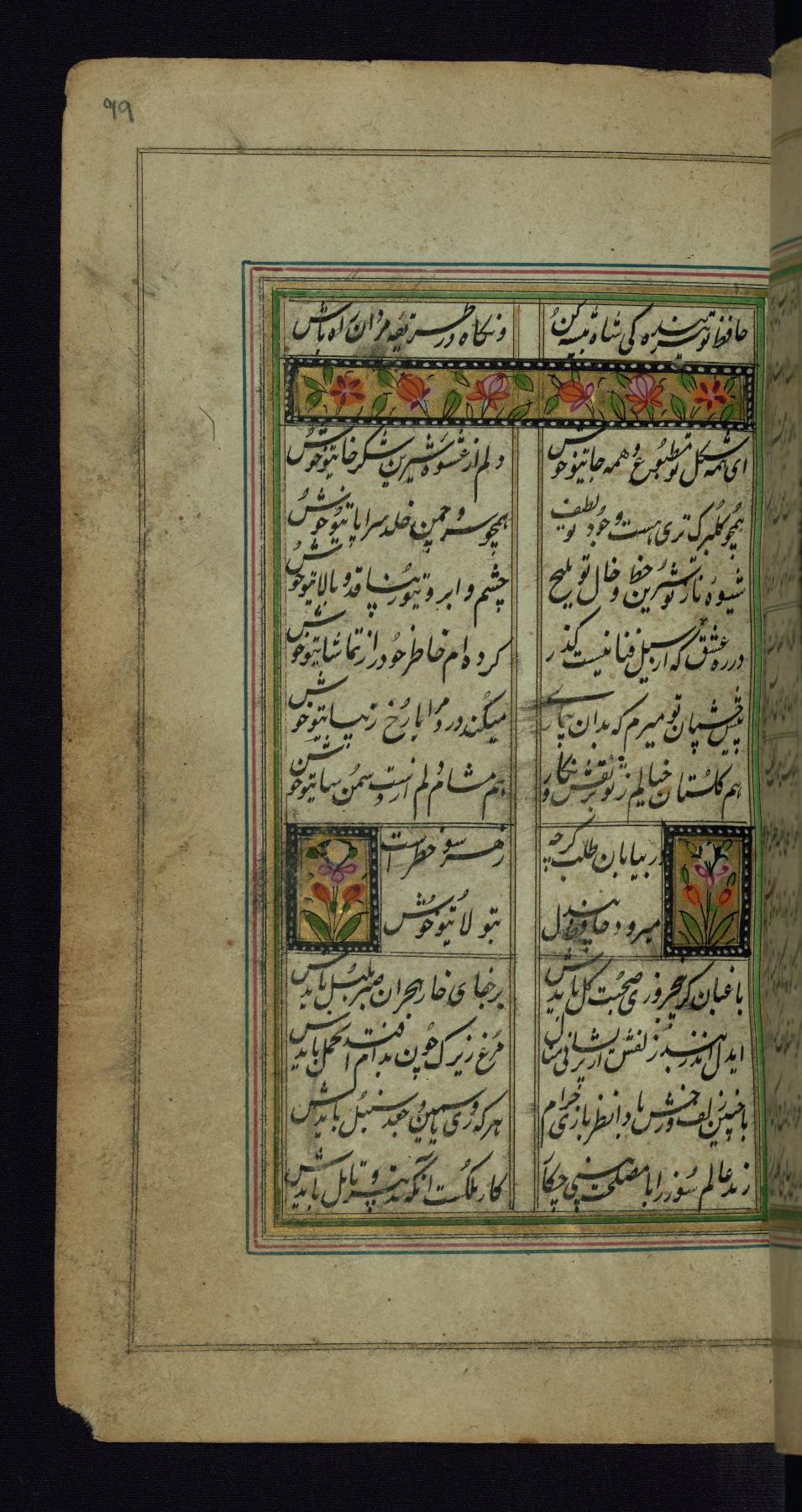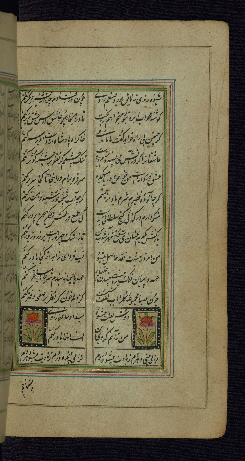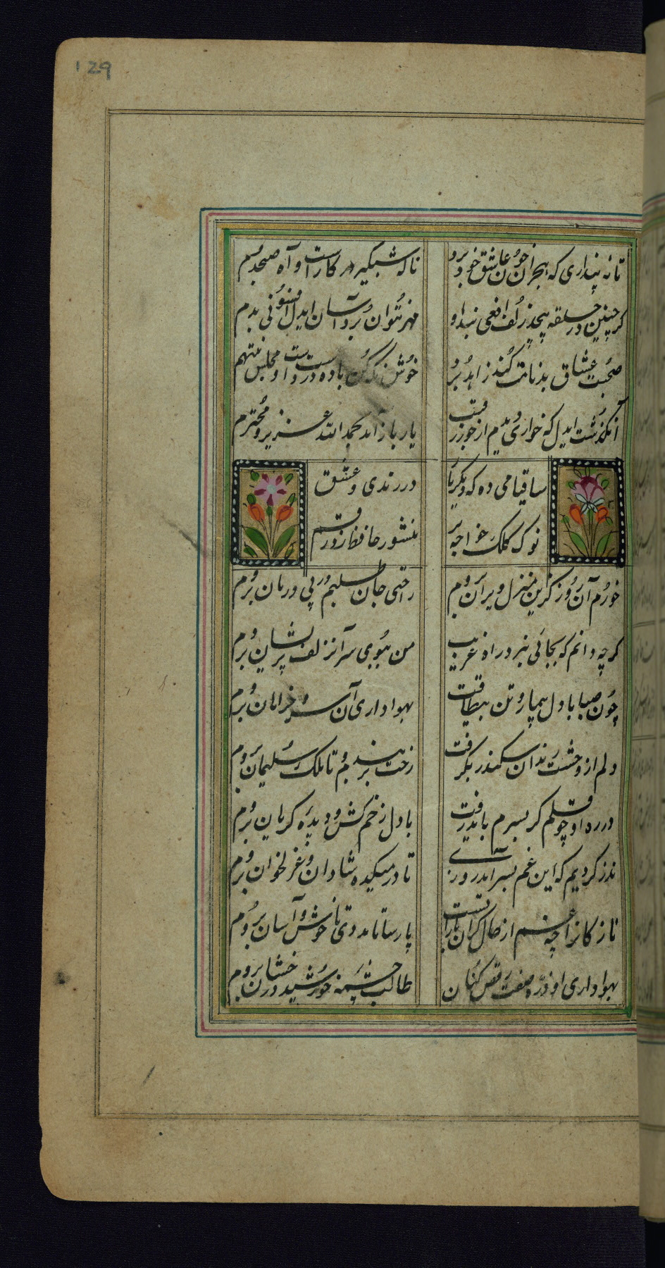 This is an illuminated and illustrated Collection of poems (dīvān) by Shams al-Dīn Muḥammad Ḥāfiz al-Shīrāzī (fl. eighth century AH / fourteenth CE), which was produced in India. According to the colophon, the manuscript was completed on the 19th Rajab 1202[?] AH / 1788[?] CE. It opens with a double-page illuminated incipit (fols. 1b-2a) with headpiece that introduces the preface (dībāchah) (fols. 1b-4b), followed by another double-page illuminated incipit with headpiece opening the main text of the Dīvān (fols. 5b-6a). The codex is decorated throughout with square and rectangular panels, as well as horizontal bands with floral decoration marking the end of odes, quatrains, or series of verses. There are forty-nine illustrations. The brown leather binding with medallion and pendants is contemporary with the manuscript.