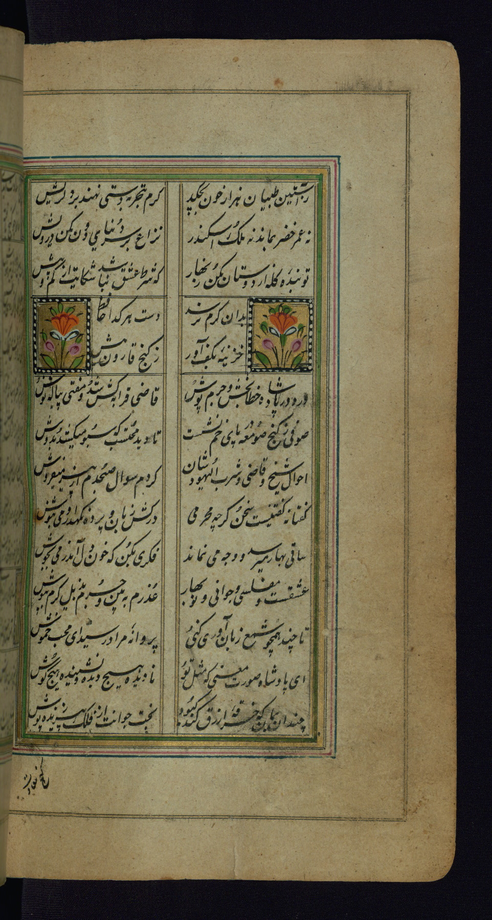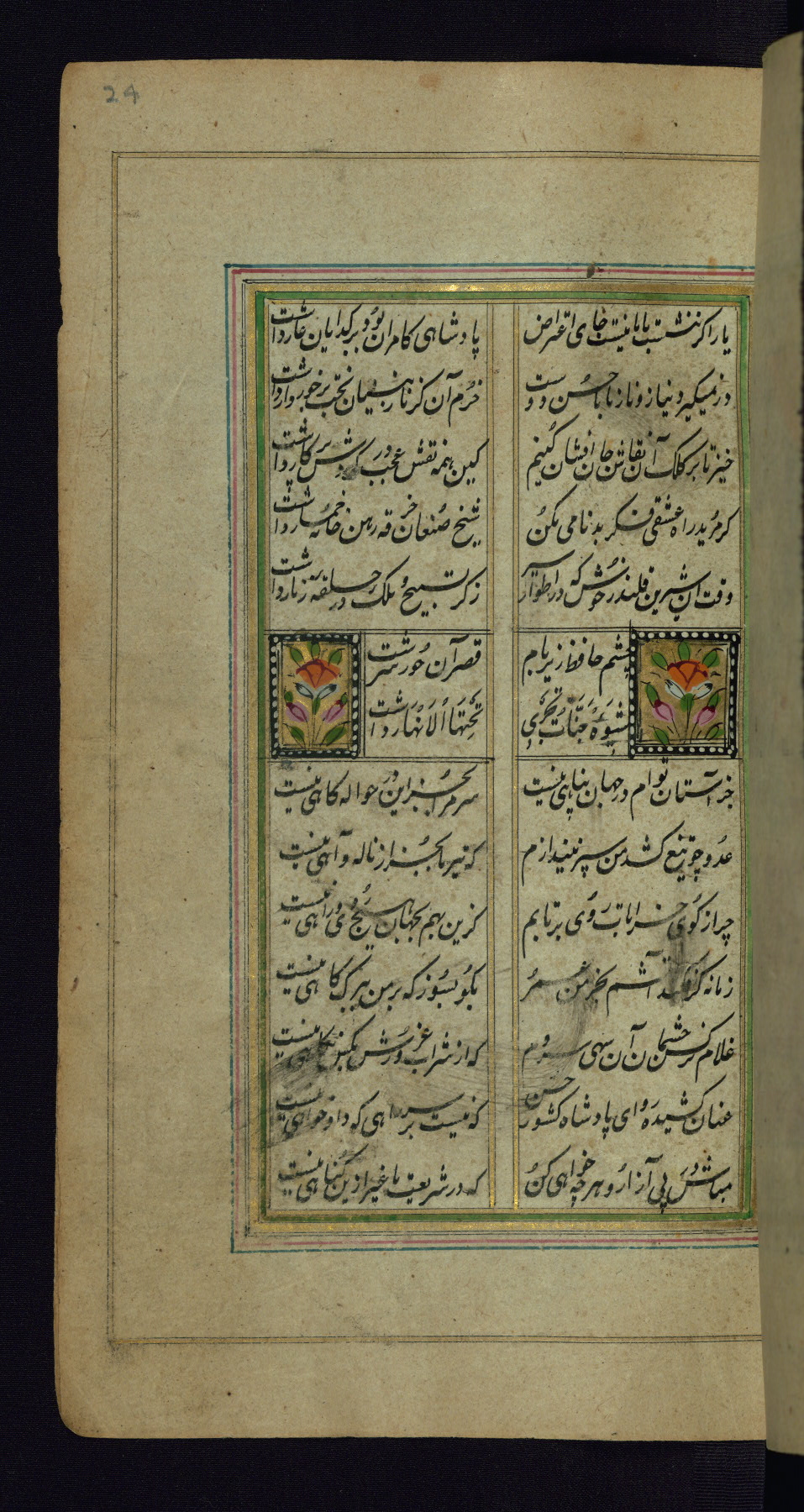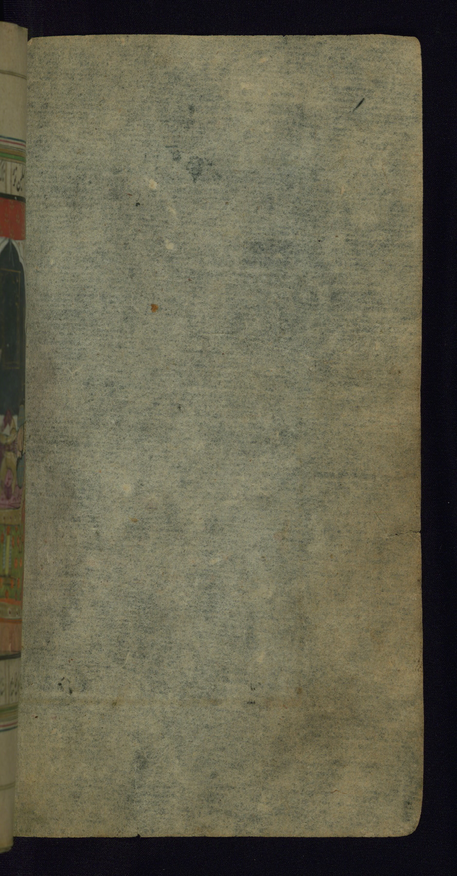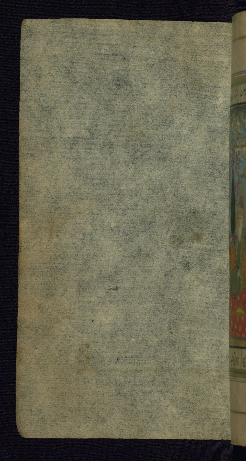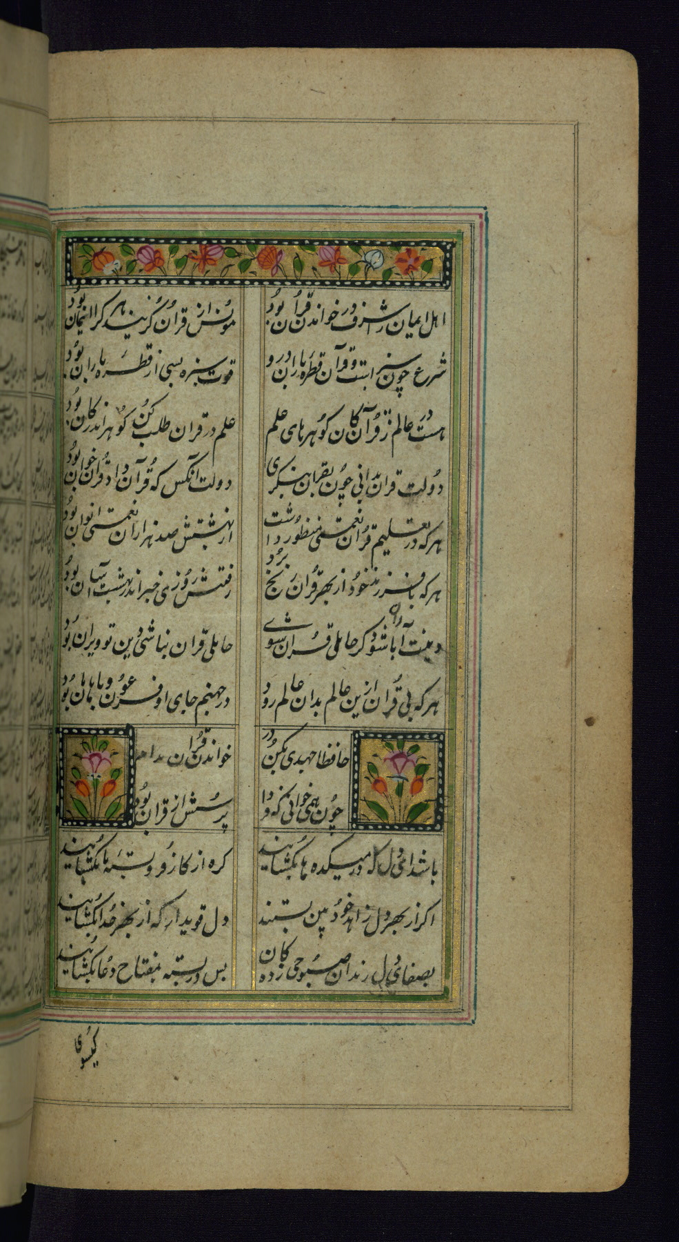This is an illuminated and illustrated Collection of poems (dīvān) by Shams al-Dīn Muḥammad Ḥāfiz al-Shīrāzī (fl. eighth century AH / fourteenth CE), which was produced in India. According to the colophon, the manuscript was completed on the 19th Rajab 1202[?] AH / 1788[?] CE. It opens with a double-page illuminated incipit (fols. 1b-2a) with headpiece that introduces the preface (dībāchah) (fols. 1b-4b), followed by another double-page illuminated incipit with headpiece opening the main text of the Dīvān (fols. 5b-6a). The codex is decorated throughout with square and rectangular panels, as well as horizontal bands with floral decoration marking the end of odes, quatrains, or series of verses. There are forty-nine illustrations. The brown leather binding with medallion and pendants is contemporary with the manuscript.