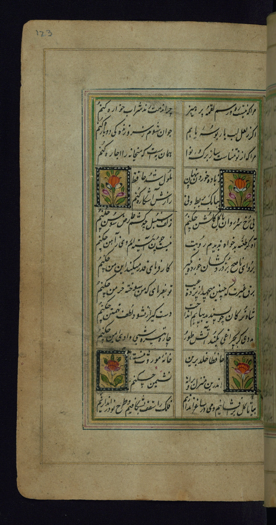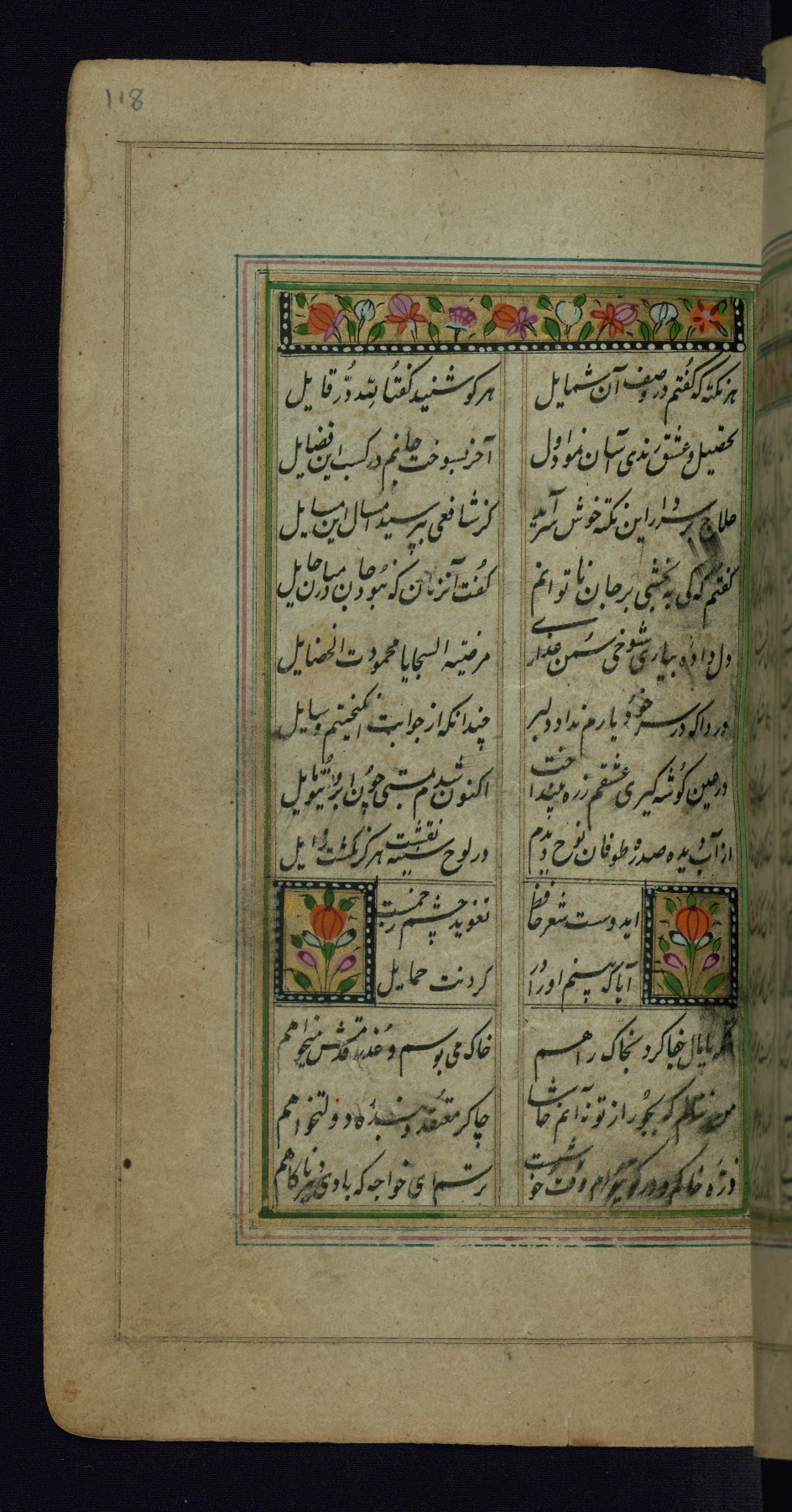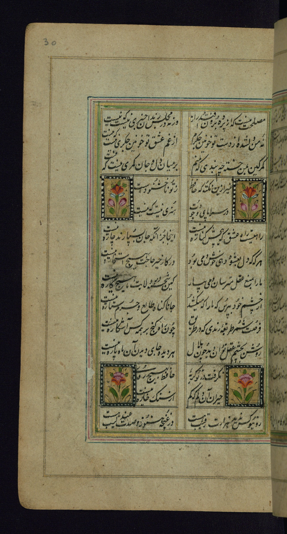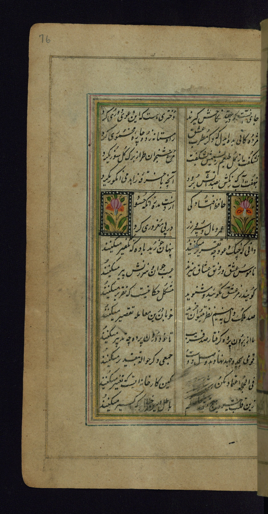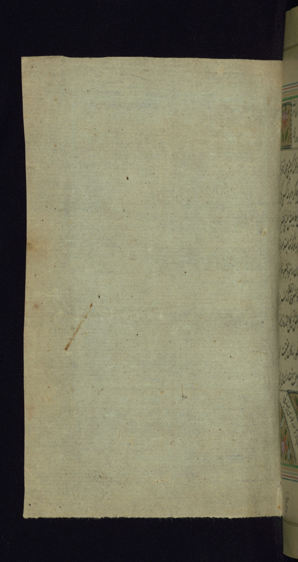 This is an illuminated and illustrated Collection of poems (dīvān) by Shams al-Dīn Muḥammad Ḥāfiz al-Shīrāzī (fl. eighth century AH / fourteenth CE), which was produced in India. According to the colophon, the manuscript was completed on the 19th Rajab 1202[?] AH / 1788[?] CE. It opens with a double-page illuminated incipit (fols. 1b-2a) with headpiece that introduces the preface (dībāchah) (fols. 1b-4b), followed by another double-page illuminated incipit with headpiece opening the main text of the Dīvān (fols. 5b-6a). The codex is decorated throughout with square and rectangular panels, as well as horizontal bands with floral decoration marking the end of odes, quatrains, or series of verses. There are forty-nine illustrations. The brown leather binding with medallion and pendants is contemporary with the manuscript.