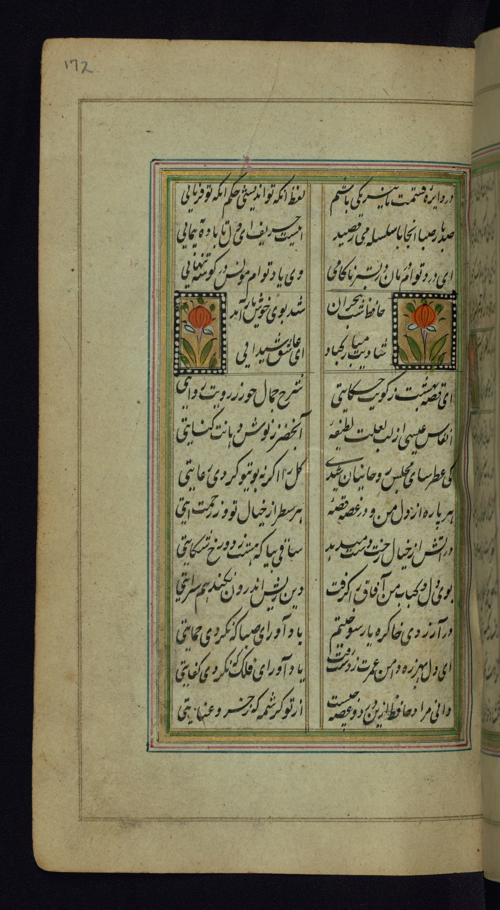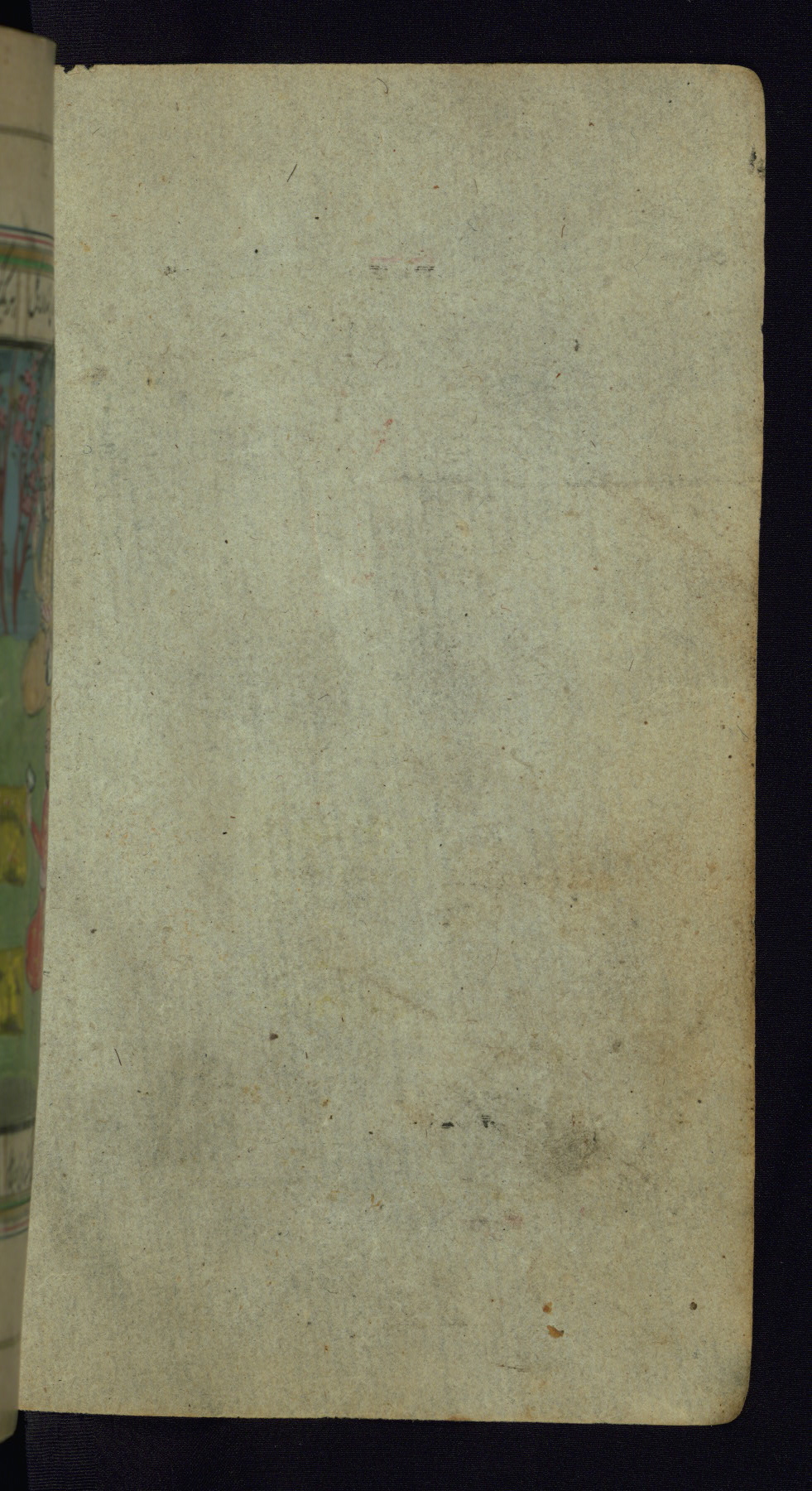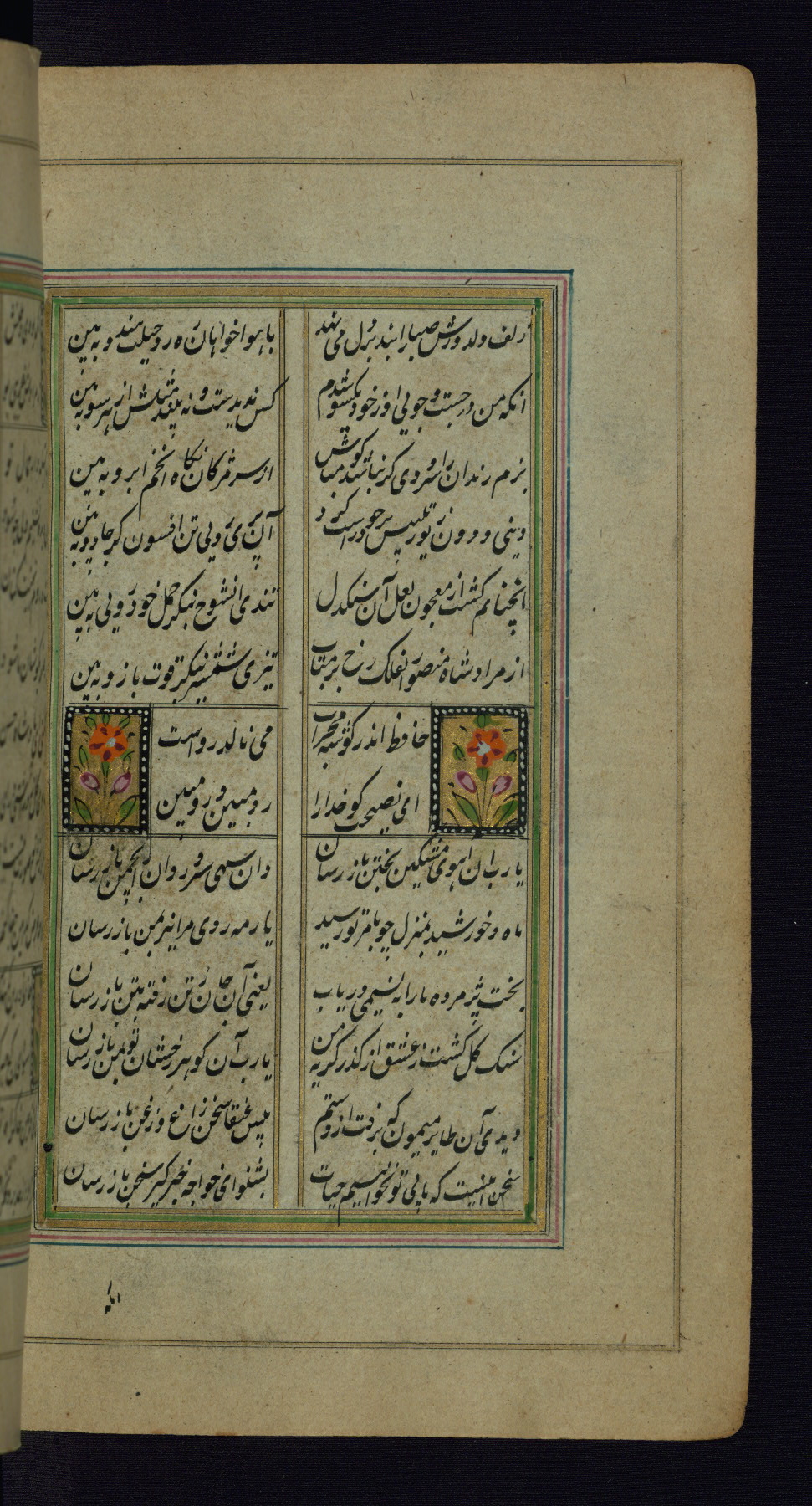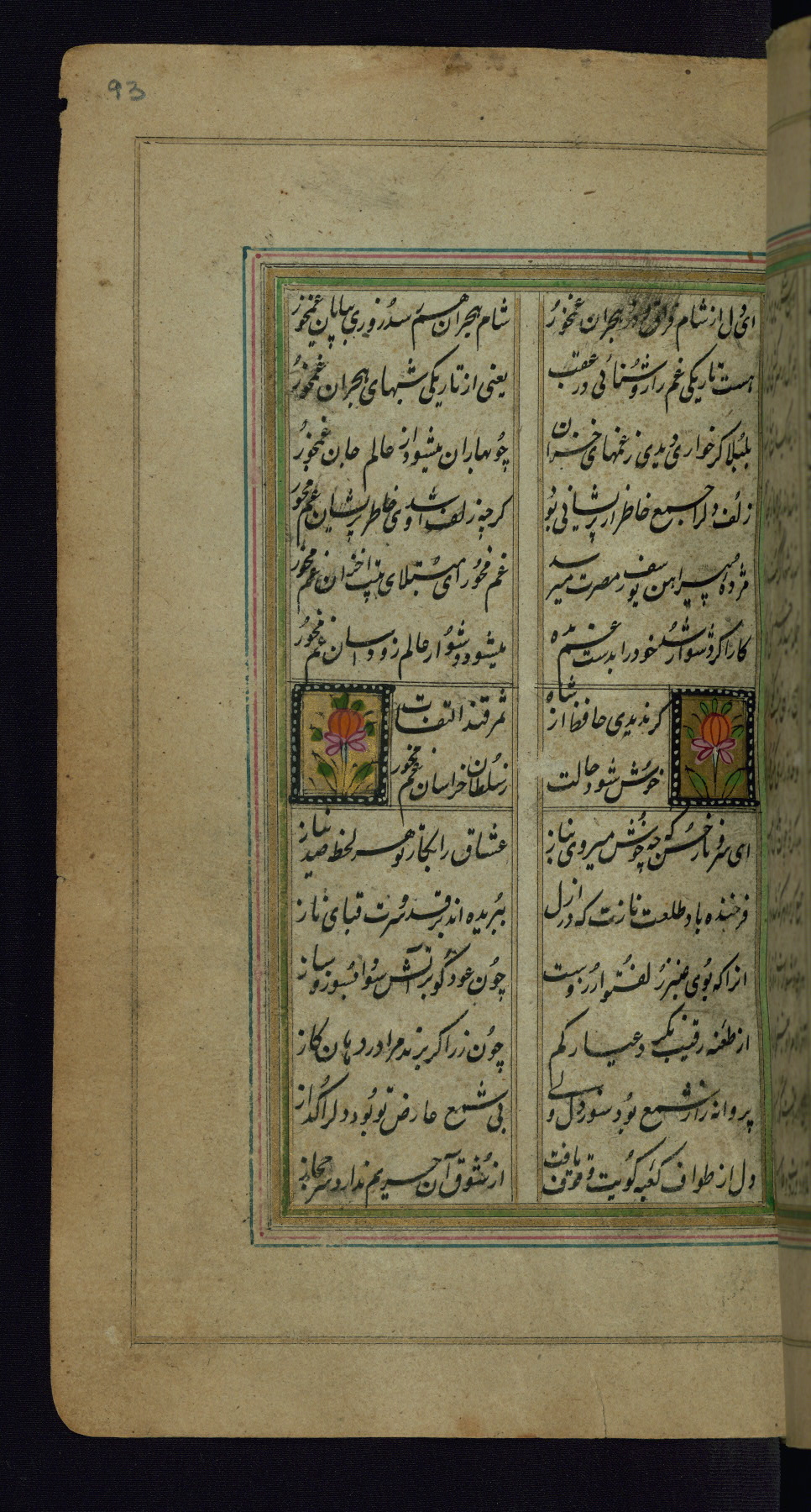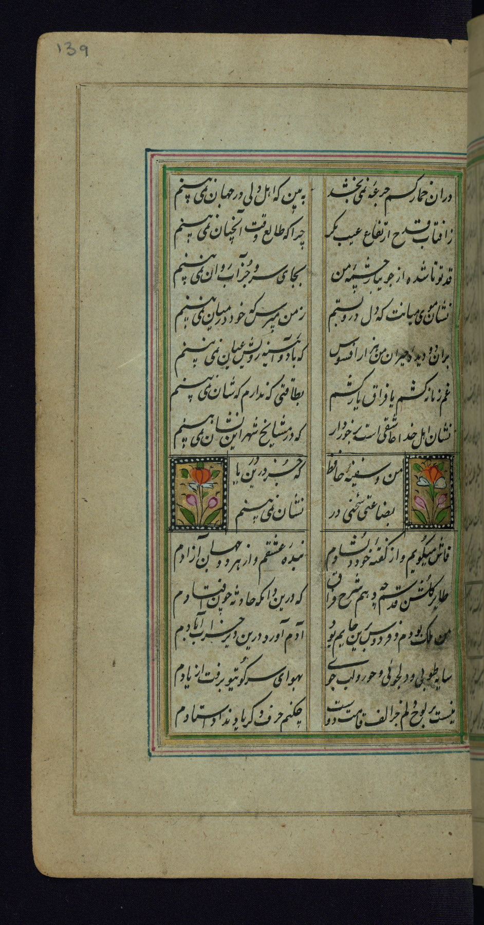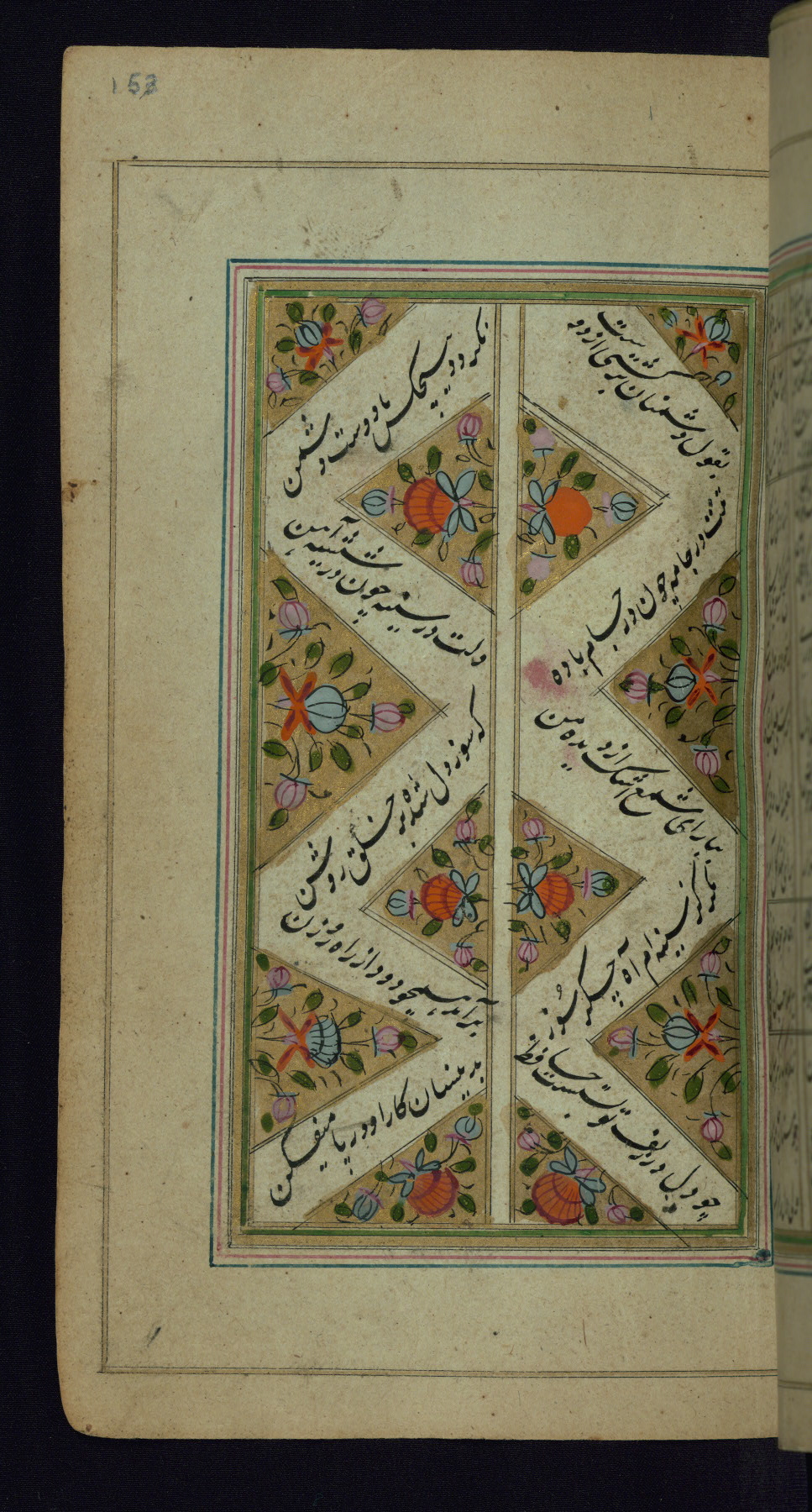 This is an illuminated and illustrated Collection of poems (dīvān) by Shams al-Dīn Muḥammad Ḥāfiz al-Shīrāzī (fl. eighth century AH / fourteenth CE), which was produced in India. According to the colophon, the manuscript was completed on the 19th Rajab 1202[?] AH / 1788[?] CE. It opens with a double-page illuminated incipit (fols. 1b-2a) with headpiece that introduces the preface (dībāchah) (fols. 1b-4b), followed by another double-page illuminated incipit with headpiece opening the main text of the Dīvān (fols. 5b-6a). The codex is decorated throughout with square and rectangular panels, as well as horizontal bands with floral decoration marking the end of odes, quatrains, or series of verses. There are forty-nine illustrations. The brown leather binding with medallion and pendants is contemporary with the manuscript.