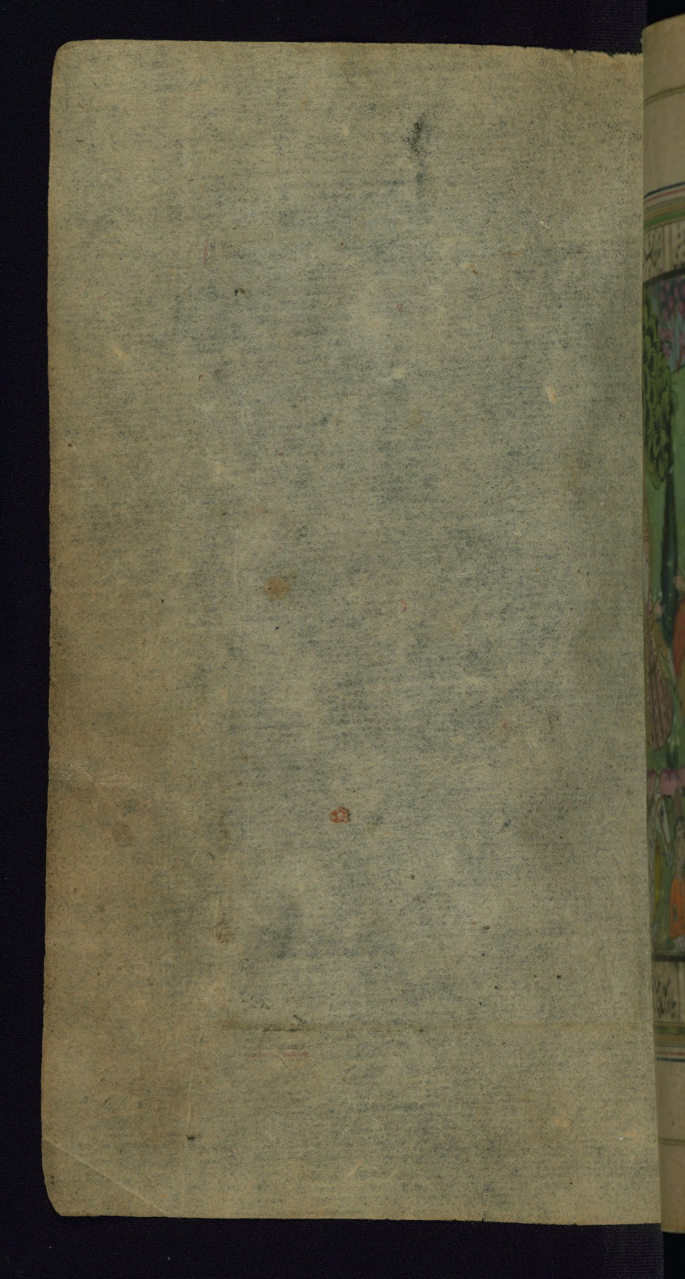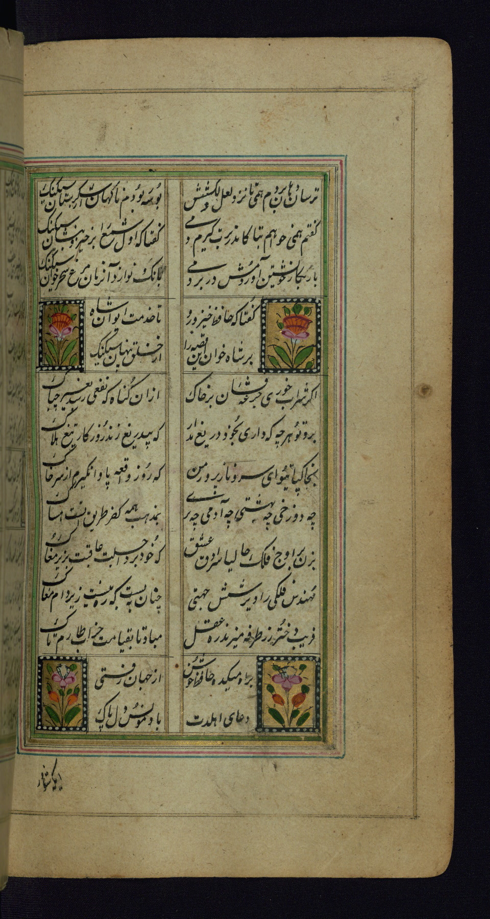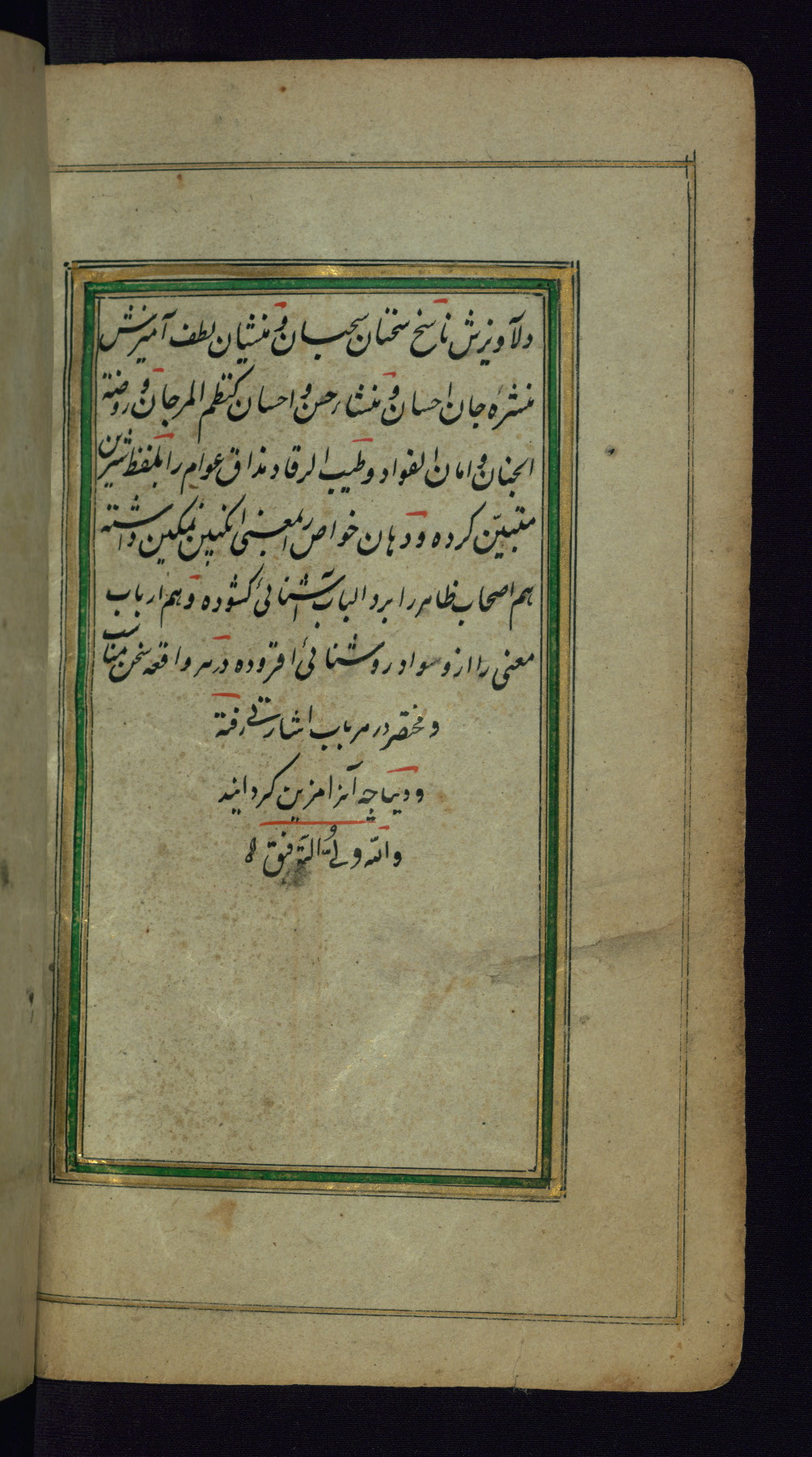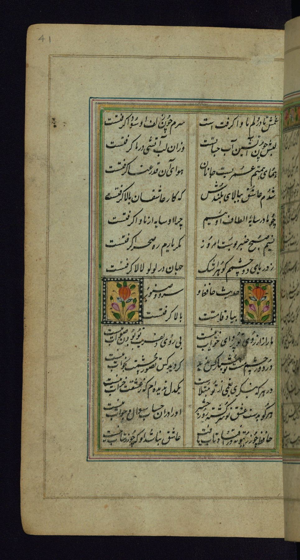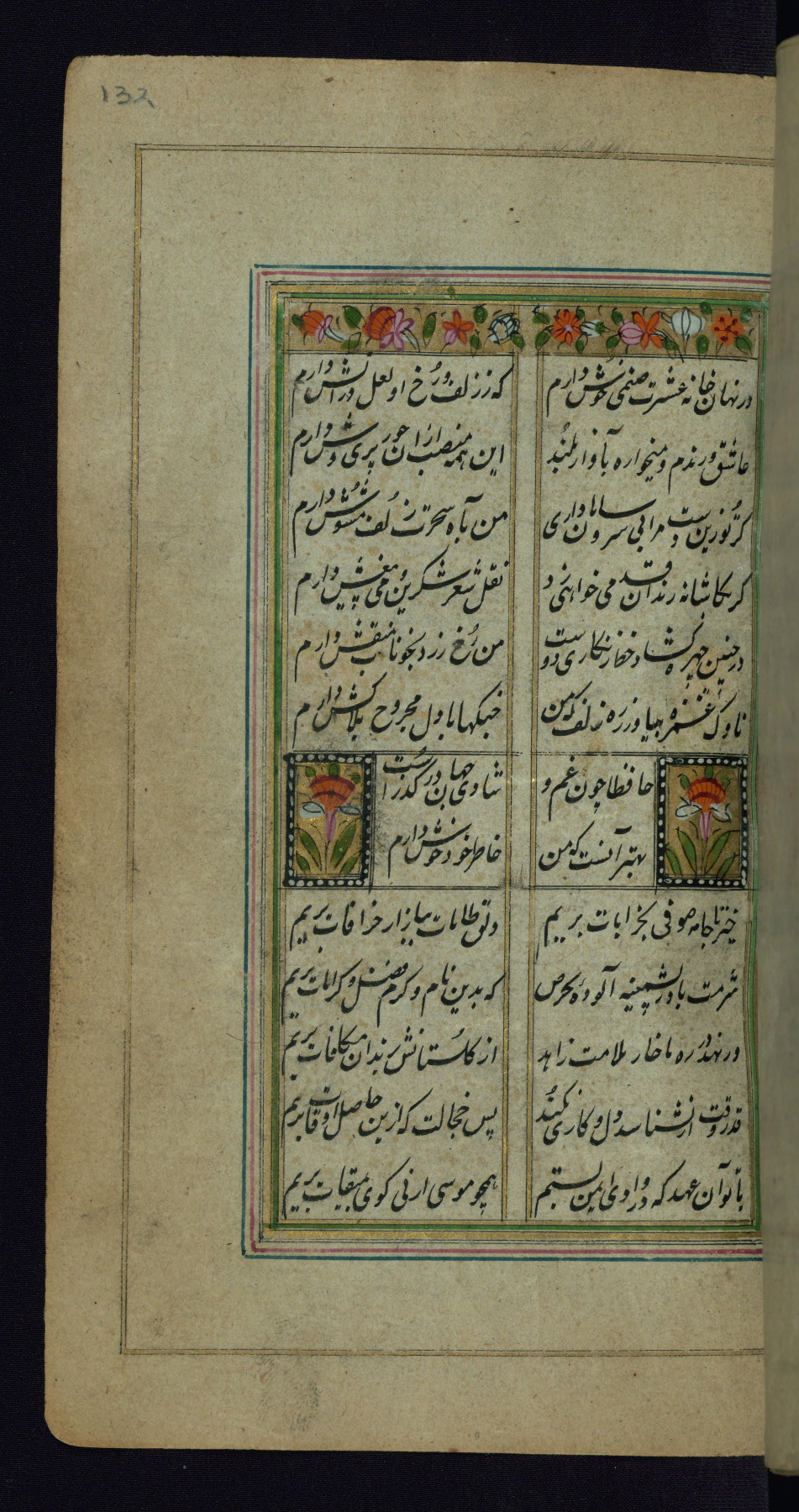 This is an illuminated and illustrated Collection of poems (dīvān) by Shams al-Dīn Muḥammad Ḥāfiz al-Shīrāzī (fl. eighth century AH / fourteenth CE), which was produced in India. According to the colophon, the manuscript was completed on the 19th Rajab 1202[?] AH / 1788[?] CE. It opens with a double-page illuminated incipit (fols. 1b-2a) with headpiece that introduces the preface (dībāchah) (fols. 1b-4b), followed by another double-page illuminated incipit with headpiece opening the main text of the Dīvān (fols. 5b-6a). The codex is decorated throughout with square and rectangular panels, as well as horizontal bands with floral decoration marking the end of odes, quatrains, or series of verses. There are forty-nine illustrations. The brown leather binding with medallion and pendants is contemporary with the manuscript.