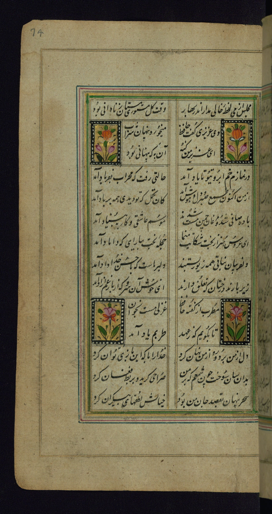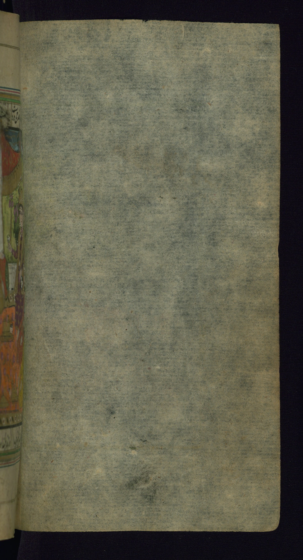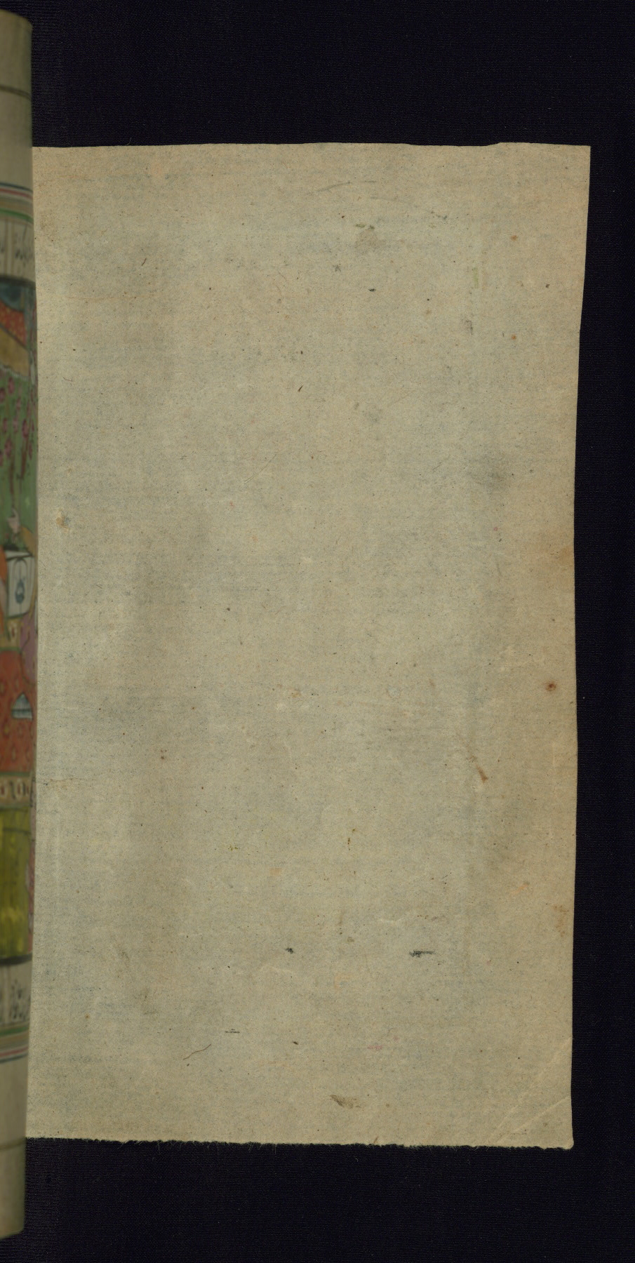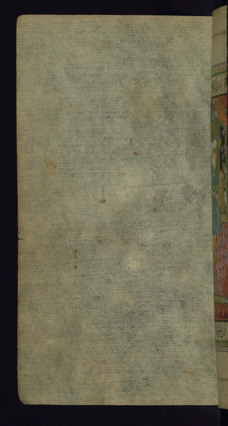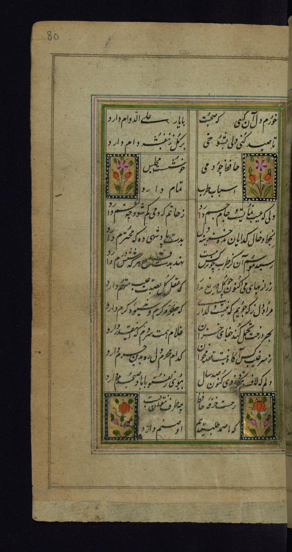 This is an illuminated and illustrated Collection of poems (dīvān) by Shams al-Dīn Muḥammad Ḥāfiz al-Shīrāzī (fl. eighth century AH / fourteenth CE), which was produced in India. According to the colophon, the manuscript was completed on the 19th Rajab 1202[?] AH / 1788[?] CE. It opens with a double-page illuminated incipit (fols. 1b-2a) with headpiece that introduces the preface (dībāchah) (fols. 1b-4b), followed by another double-page illuminated incipit with headpiece opening the main text of the Dīvān (fols. 5b-6a). The codex is decorated throughout with square and rectangular panels, as well as horizontal bands with floral decoration marking the end of odes, quatrains, or series of verses. There are forty-nine illustrations. The brown leather binding with medallion and pendants is contemporary with the manuscript.