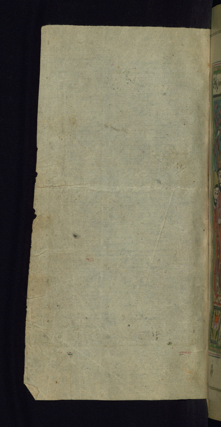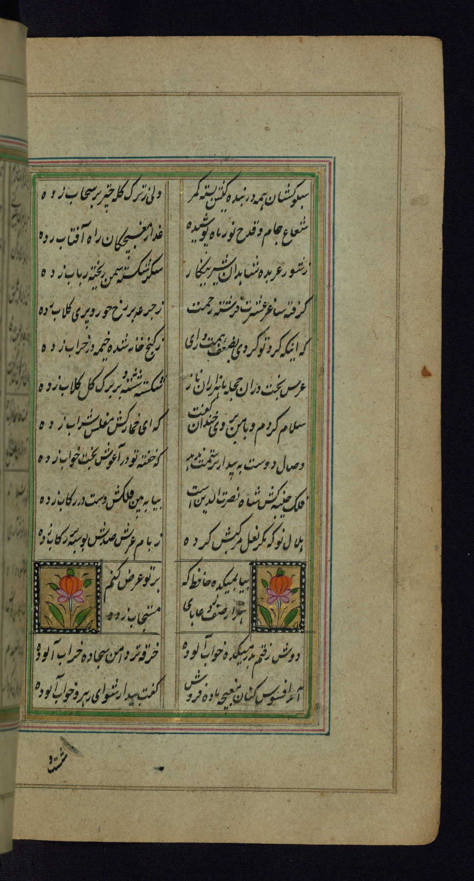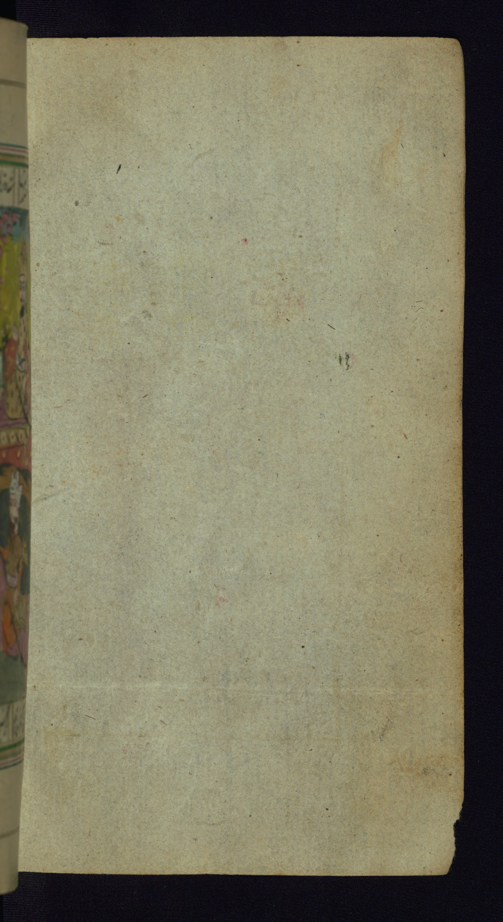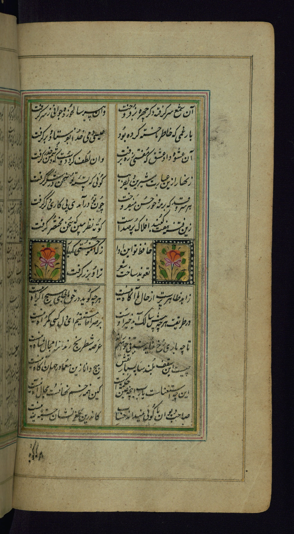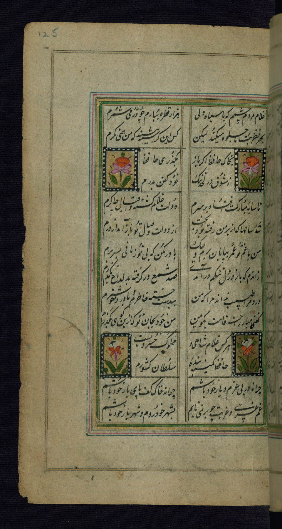 This is an illuminated and illustrated Collection of poems (dīvān) by Shams al-Dīn Muḥammad Ḥāfiz al-Shīrāzī (fl. eighth century AH / fourteenth CE), which was produced in India. According to the colophon, the manuscript was completed on the 19th Rajab 1202[?] AH / 1788[?] CE. It opens with a double-page illuminated incipit (fols. 1b-2a) with headpiece that introduces the preface (dībāchah) (fols. 1b-4b), followed by another double-page illuminated incipit with headpiece opening the main text of the Dīvān (fols. 5b-6a). The codex is decorated throughout with square and rectangular panels, as well as horizontal bands with floral decoration marking the end of odes, quatrains, or series of verses. There are forty-nine illustrations. The brown leather binding with medallion and pendants is contemporary with the manuscript.