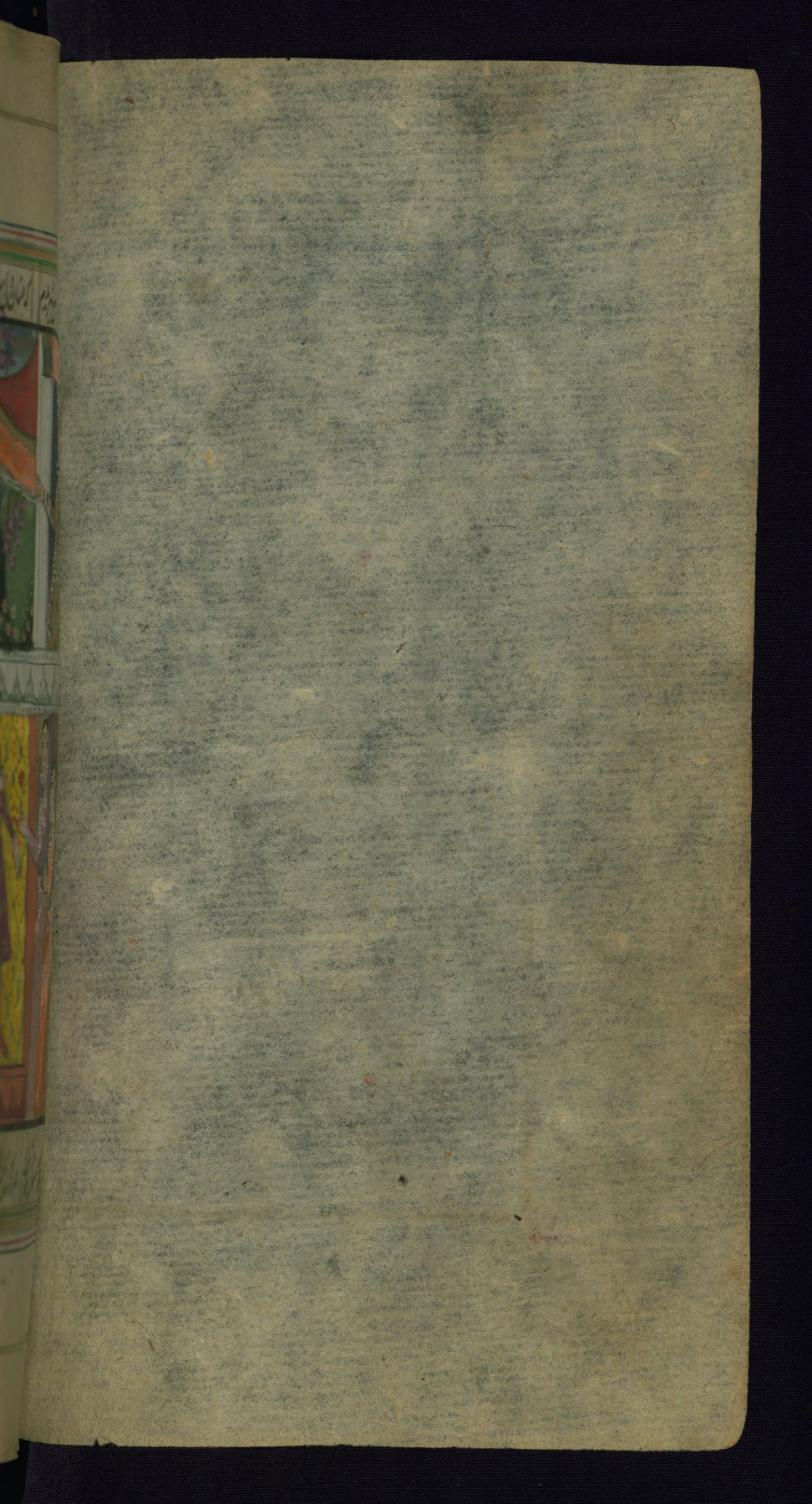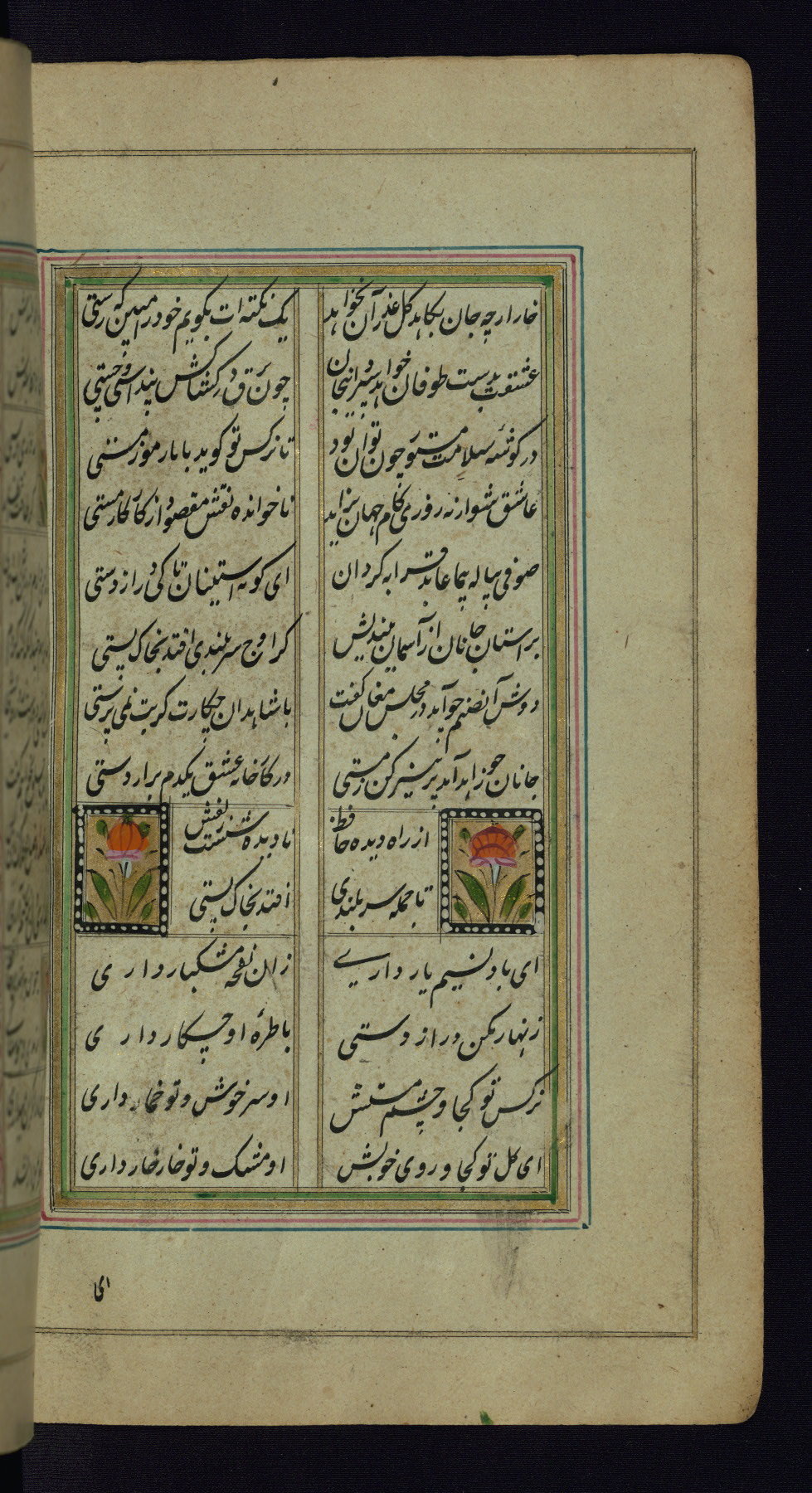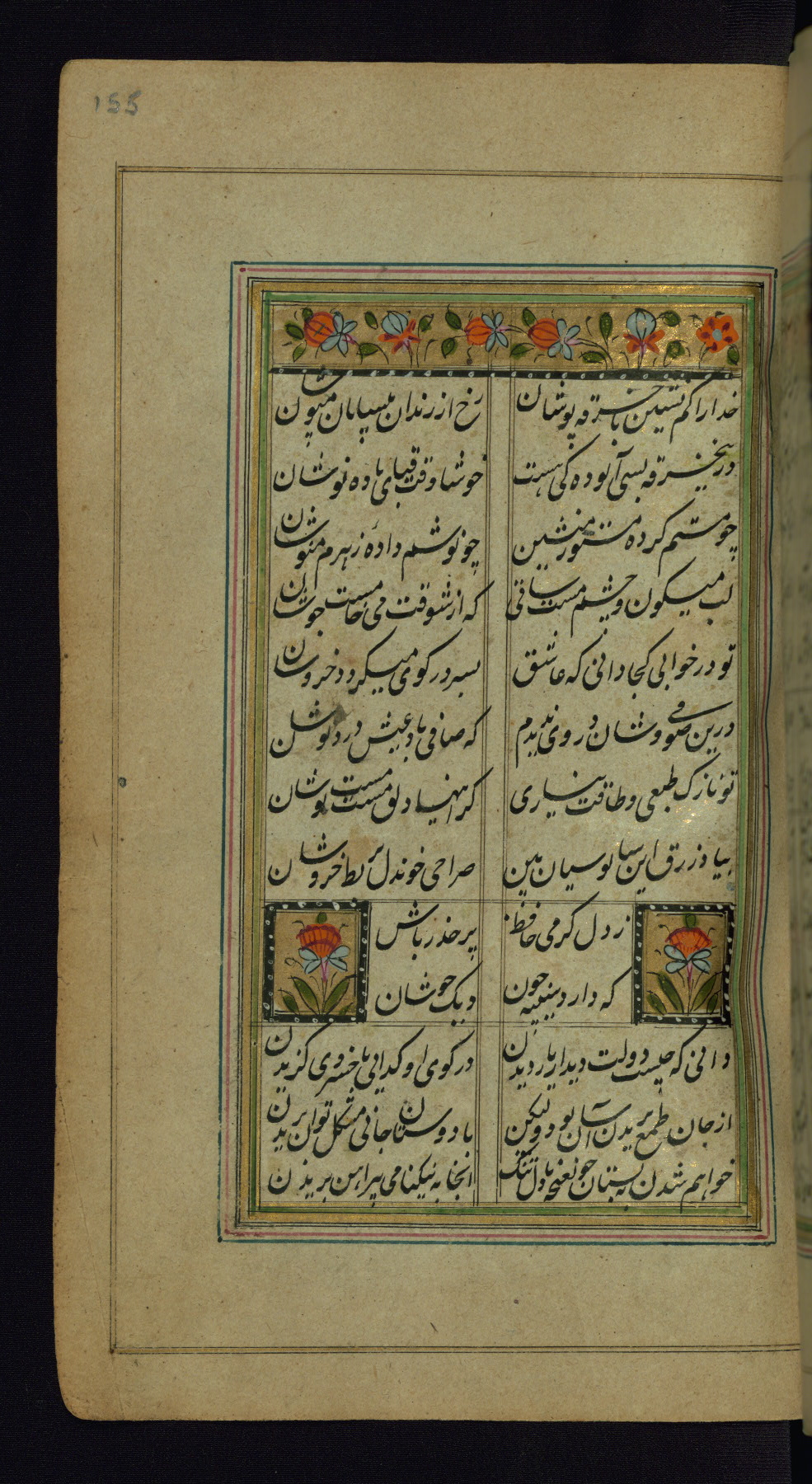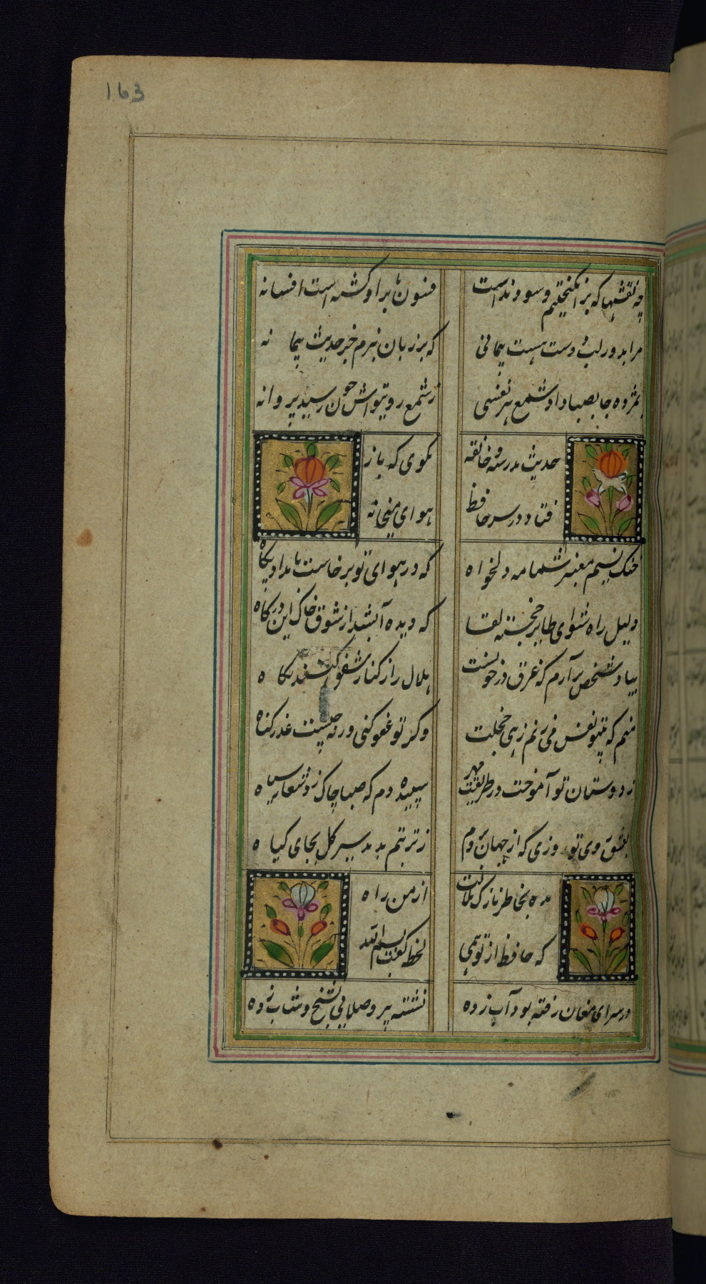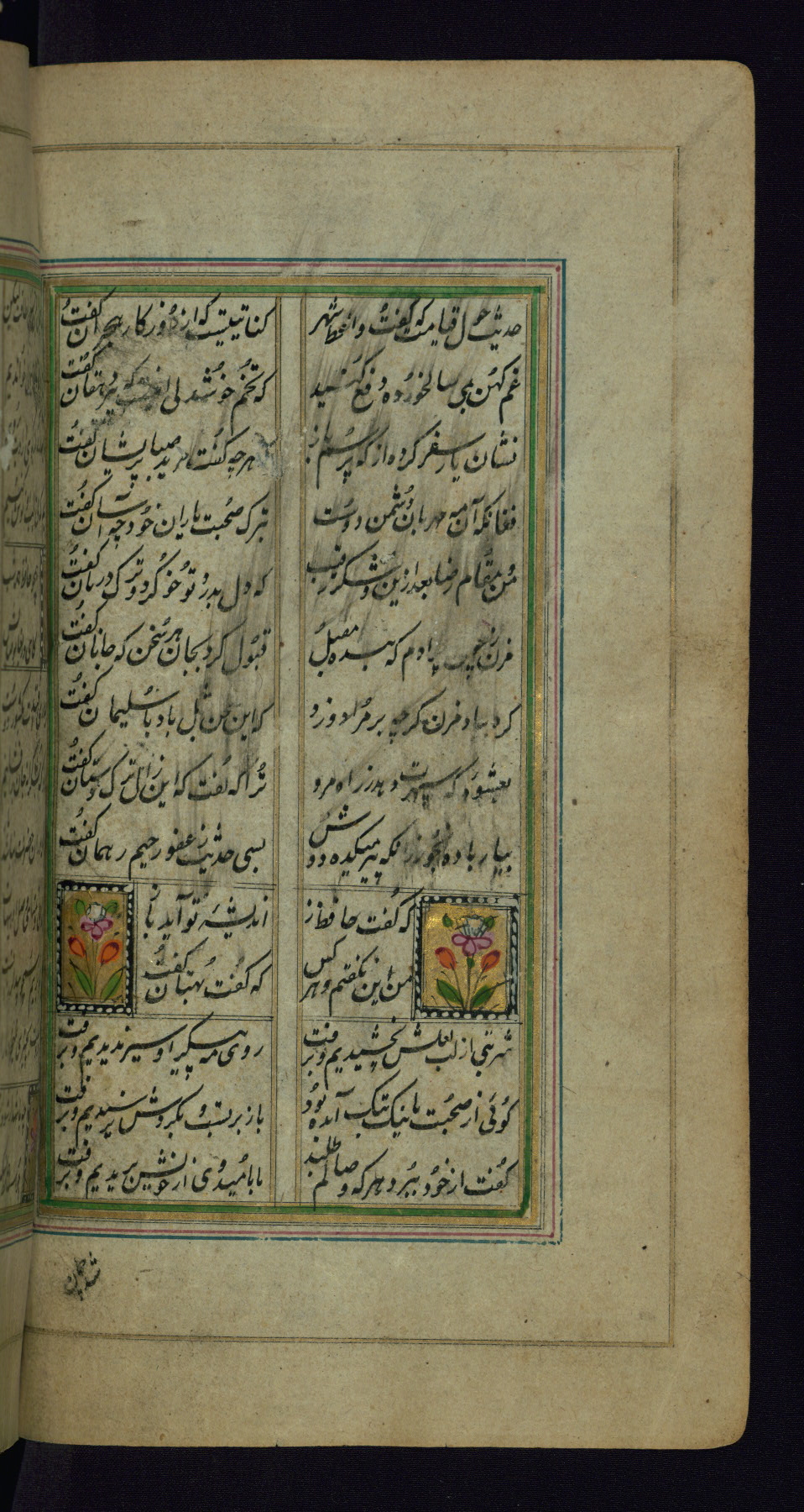 This is an illuminated and illustrated Collection of poems (dīvān) by Shams al-Dīn Muḥammad Ḥāfiz al-Shīrāzī (fl. eighth century AH / fourteenth CE), which was produced in India. According to the colophon, the manuscript was completed on the 19th Rajab 1202[?] AH / 1788[?] CE. It opens with a double-page illuminated incipit (fols. 1b-2a) with headpiece that introduces the preface (dībāchah) (fols. 1b-4b), followed by another double-page illuminated incipit with headpiece opening the main text of the Dīvān (fols. 5b-6a). The codex is decorated throughout with square and rectangular panels, as well as horizontal bands with floral decoration marking the end of odes, quatrains, or series of verses. There are forty-nine illustrations. The brown leather binding with medallion and pendants is contemporary with the manuscript.