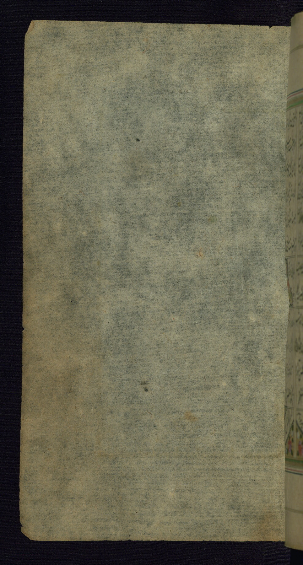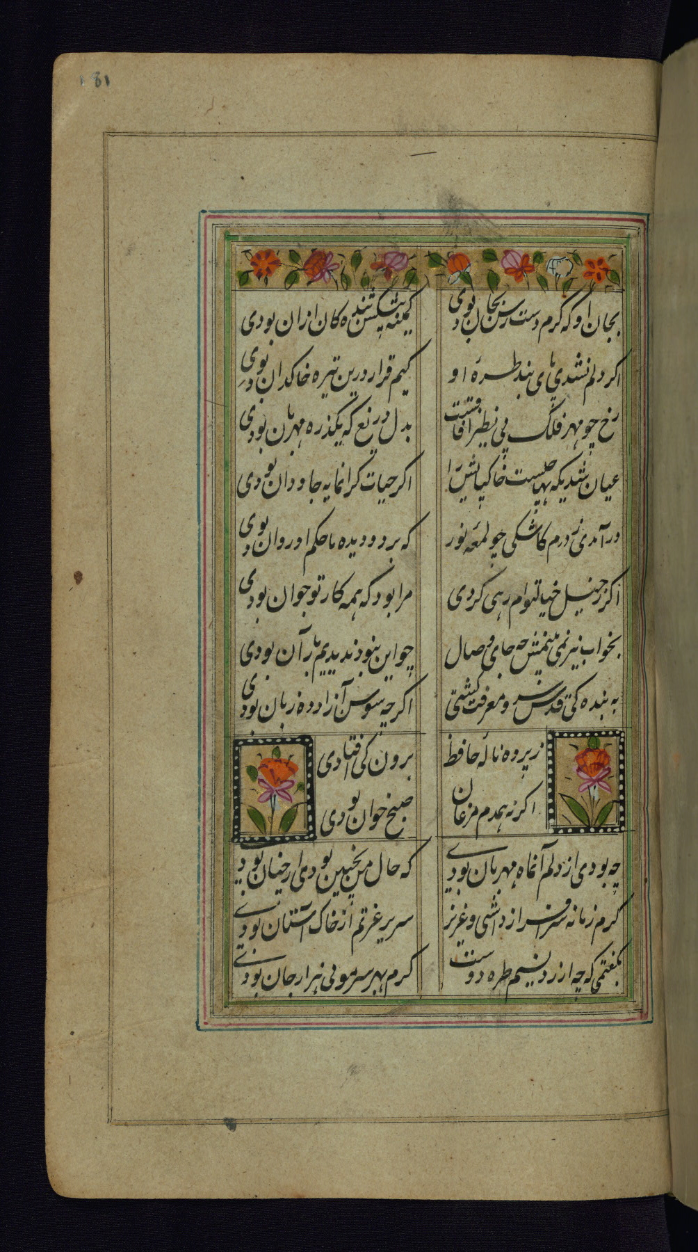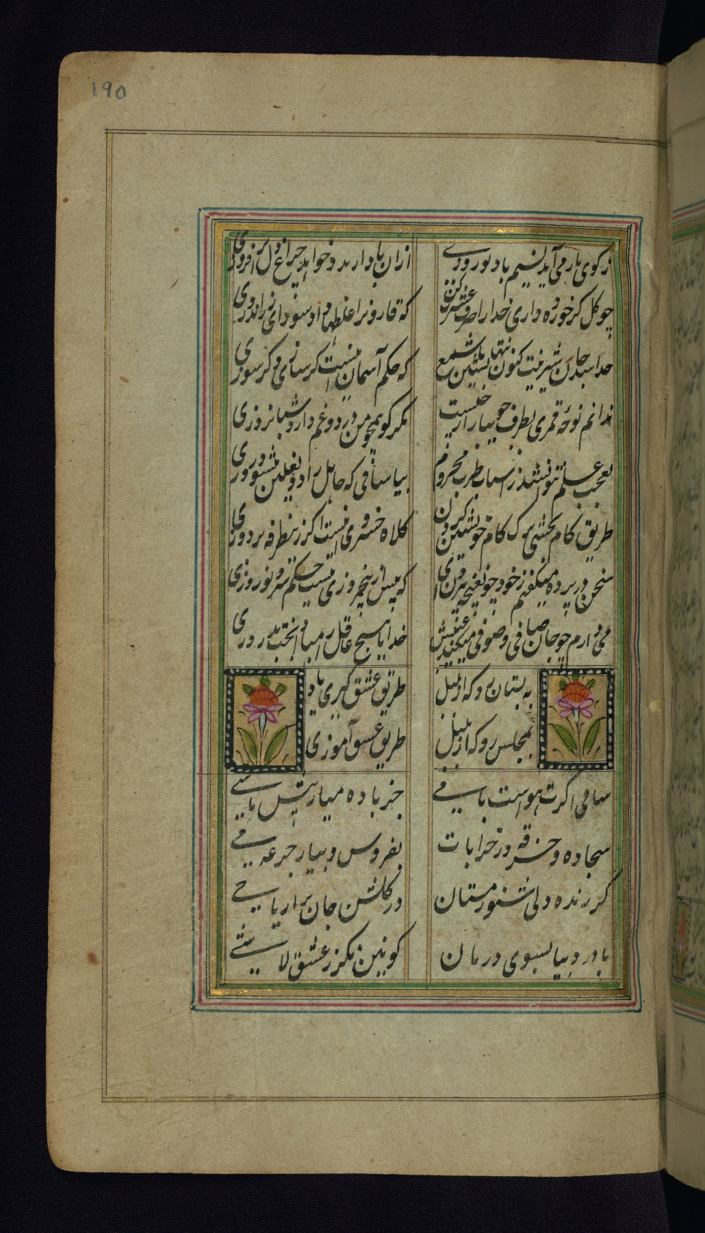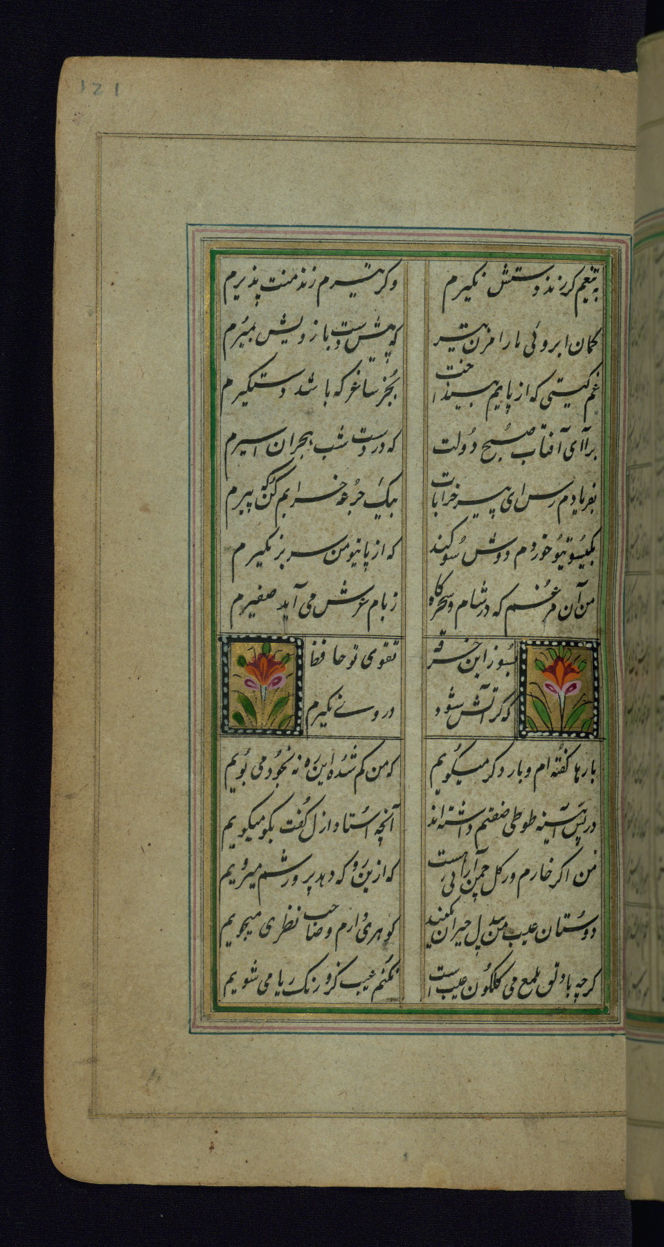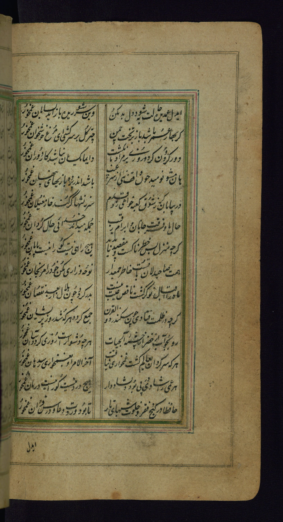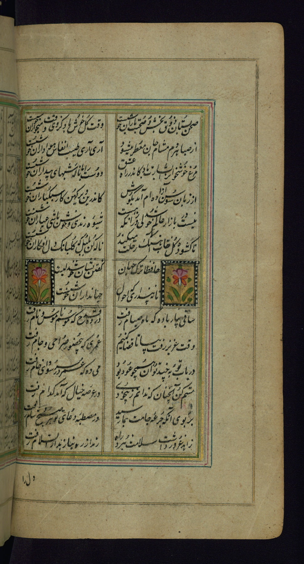 This is an illuminated and illustrated Collection of poems (dīvān) by Shams al-Dīn Muḥammad Ḥāfiz al-Shīrāzī (fl. eighth century AH / fourteenth CE), which was produced in India. According to the colophon, the manuscript was completed on the 19th Rajab 1202[?] AH / 1788[?] CE. It opens with a double-page illuminated incipit (fols. 1b-2a) with headpiece that introduces the preface (dībāchah) (fols. 1b-4b), followed by another double-page illuminated incipit with headpiece opening the main text of the Dīvān (fols. 5b-6a). The codex is decorated throughout with square and rectangular panels, as well as horizontal bands with floral decoration marking the end of odes, quatrains, or series of verses. There are forty-nine illustrations. The brown leather binding with medallion and pendants is contemporary with the manuscript.