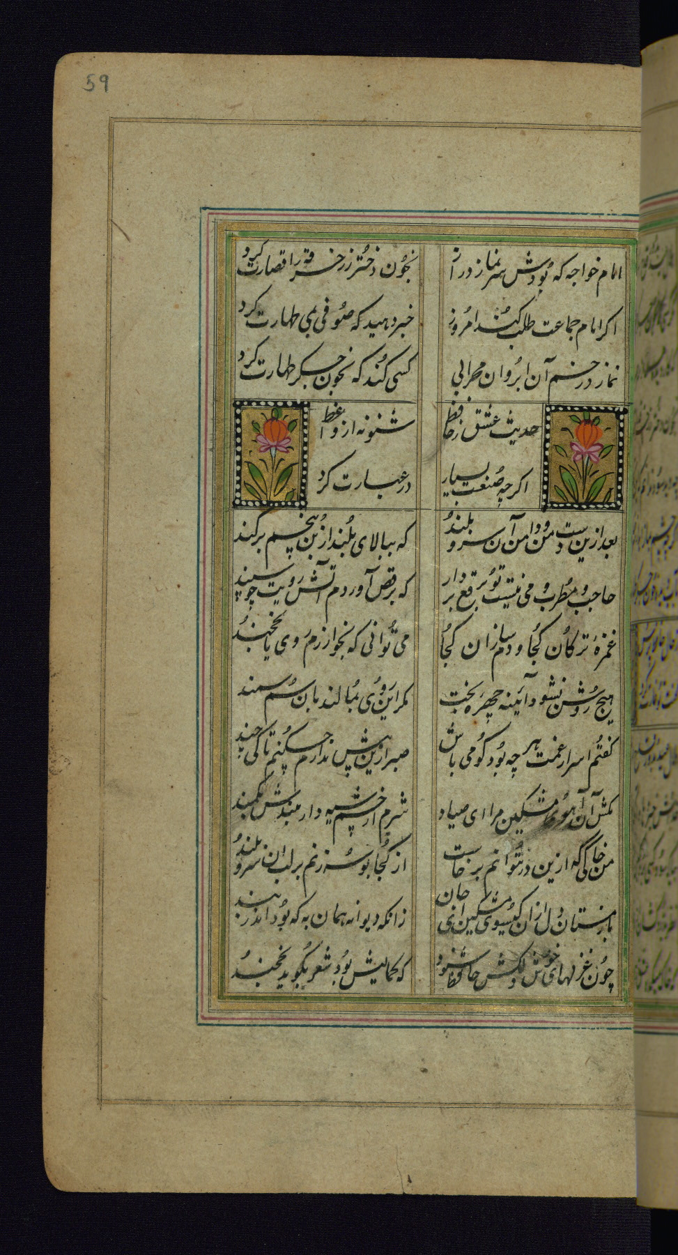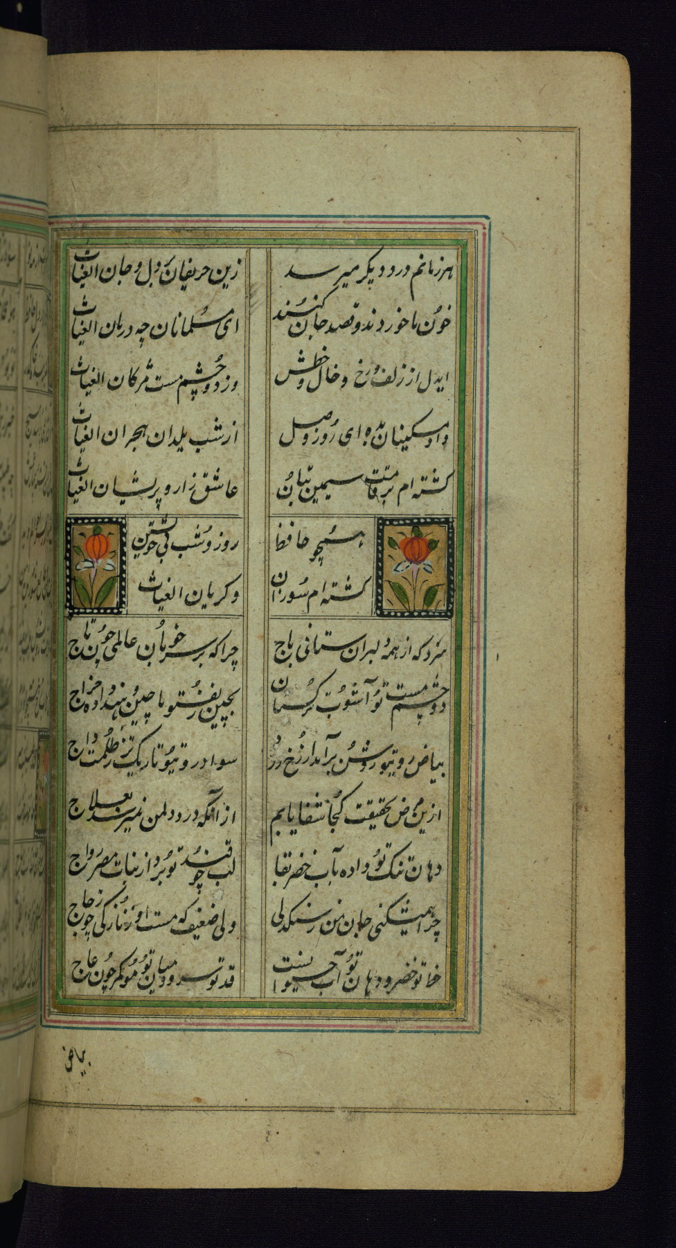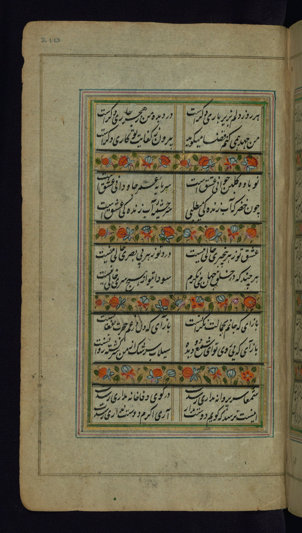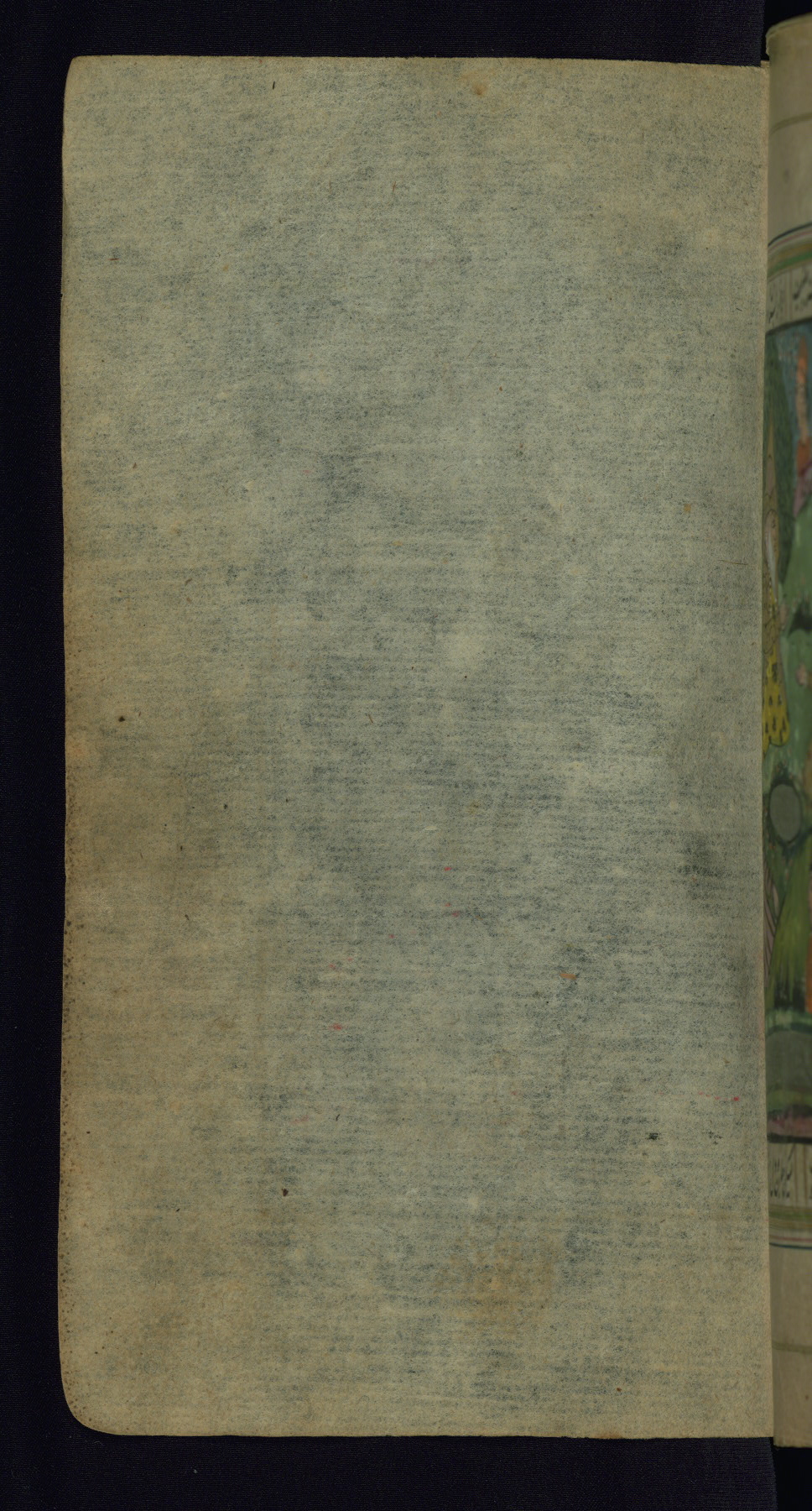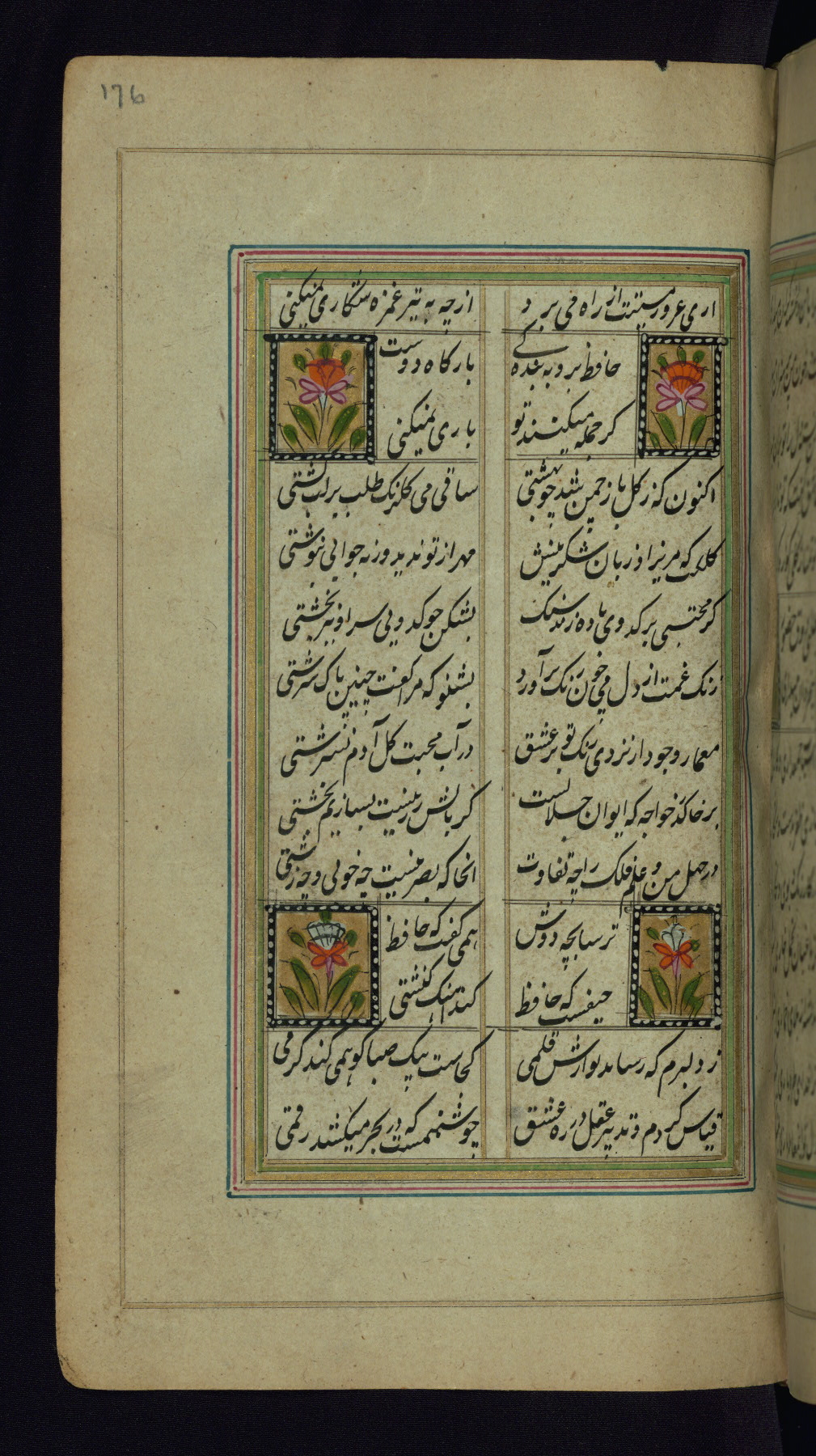 This is an illuminated and illustrated Collection of poems (dīvān) by Shams al-Dīn Muḥammad Ḥāfiz al-Shīrāzī (fl. eighth century AH / fourteenth CE), which was produced in India. According to the colophon, the manuscript was completed on the 19th Rajab 1202[?] AH / 1788[?] CE. It opens with a double-page illuminated incipit (fols. 1b-2a) with headpiece that introduces the preface (dībāchah) (fols. 1b-4b), followed by another double-page illuminated incipit with headpiece opening the main text of the Dīvān (fols. 5b-6a). The codex is decorated throughout with square and rectangular panels, as well as horizontal bands with floral decoration marking the end of odes, quatrains, or series of verses. There are forty-nine illustrations. The brown leather binding with medallion and pendants is contemporary with the manuscript.
