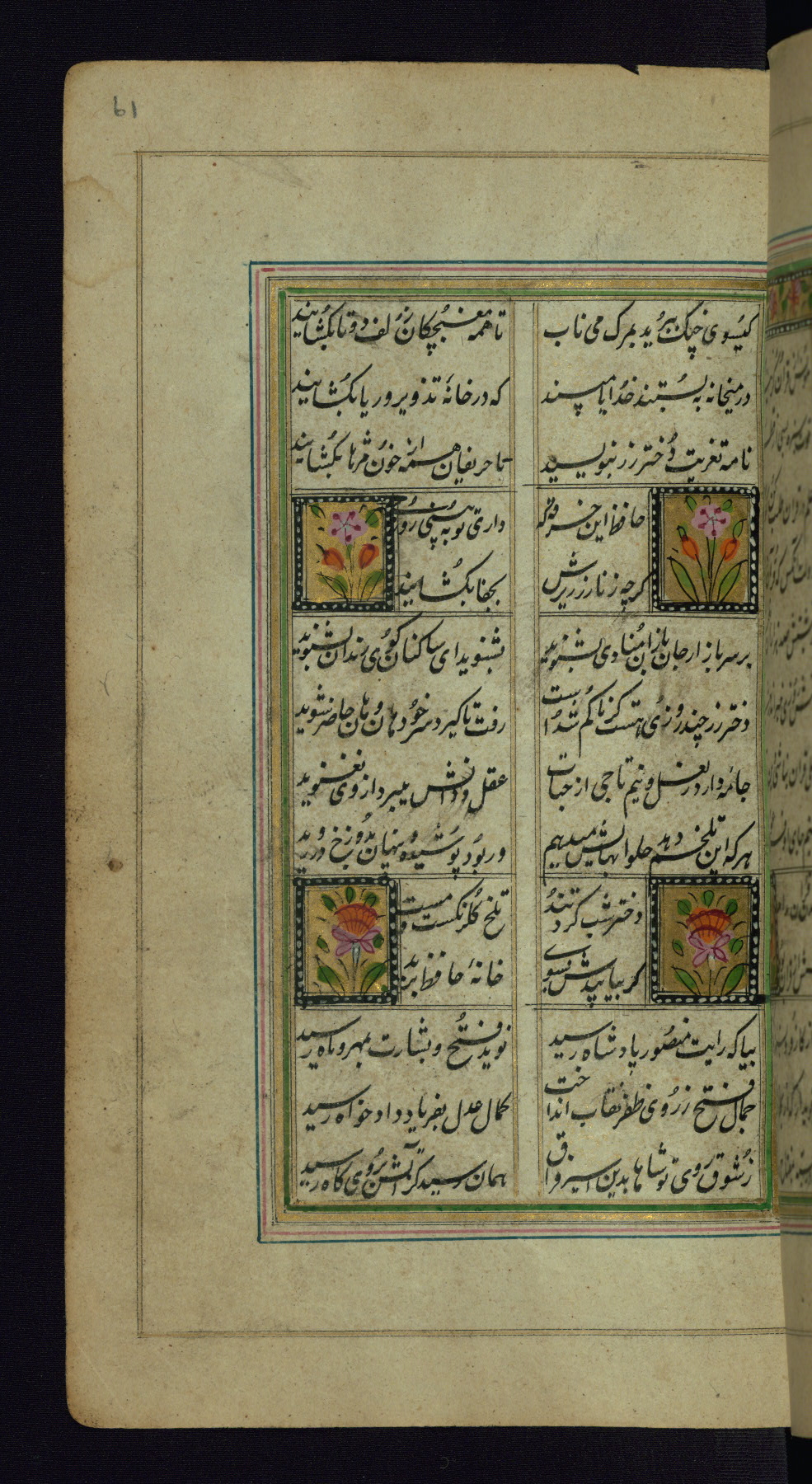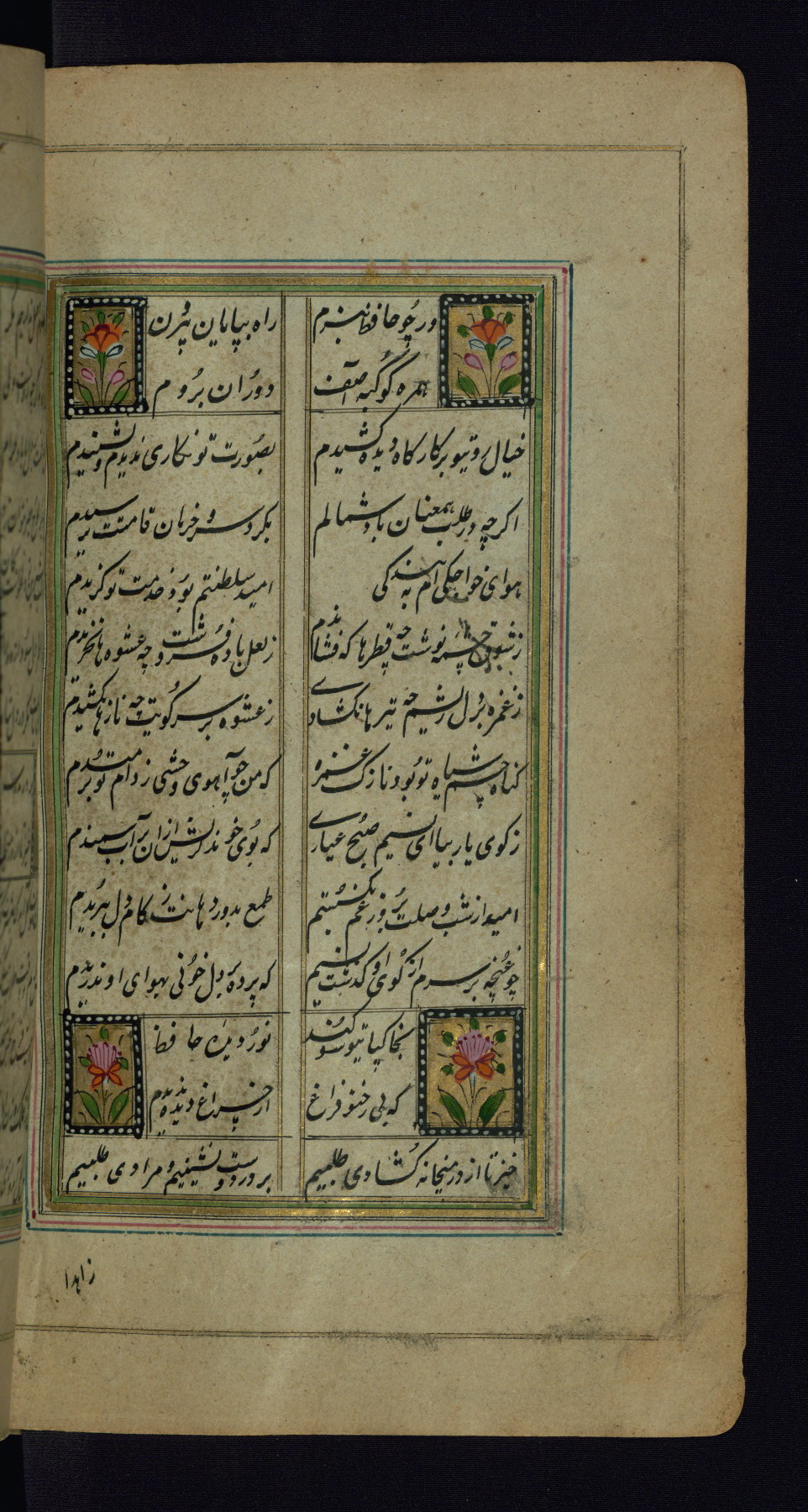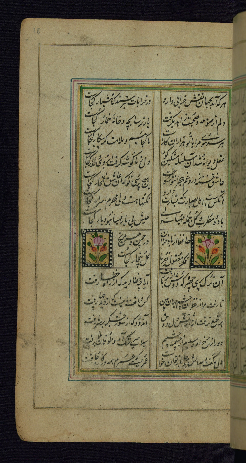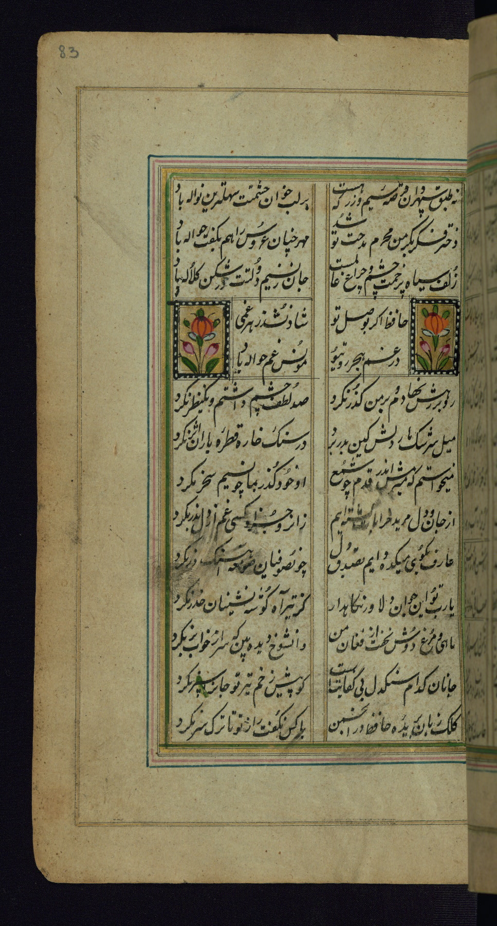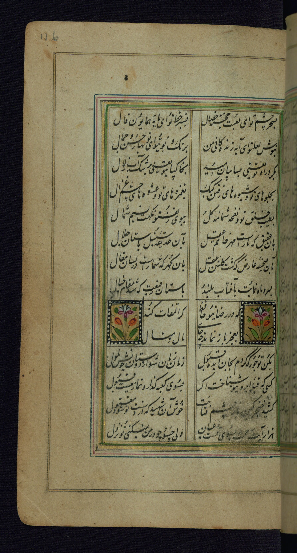 This is an illuminated and illustrated Collection of poems (dīvān) by Shams al-Dīn Muḥammad Ḥāfiz al-Shīrāzī (fl. eighth century AH / fourteenth CE), which was produced in India. According to the colophon, the manuscript was completed on the 19th Rajab 1202[?] AH / 1788[?] CE. It opens with a double-page illuminated incipit (fols. 1b-2a) with headpiece that introduces the preface (dībāchah) (fols. 1b-4b), followed by another double-page illuminated incipit with headpiece opening the main text of the Dīvān (fols. 5b-6a). The codex is decorated throughout with square and rectangular panels, as well as horizontal bands with floral decoration marking the end of odes, quatrains, or series of verses. There are forty-nine illustrations. The brown leather binding with medallion and pendants is contemporary with the manuscript.