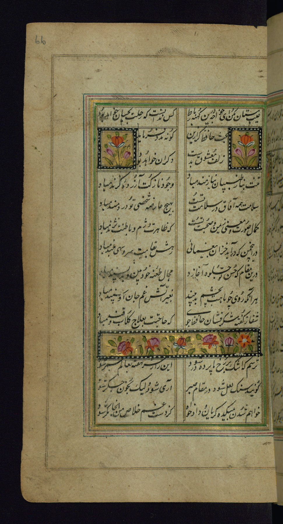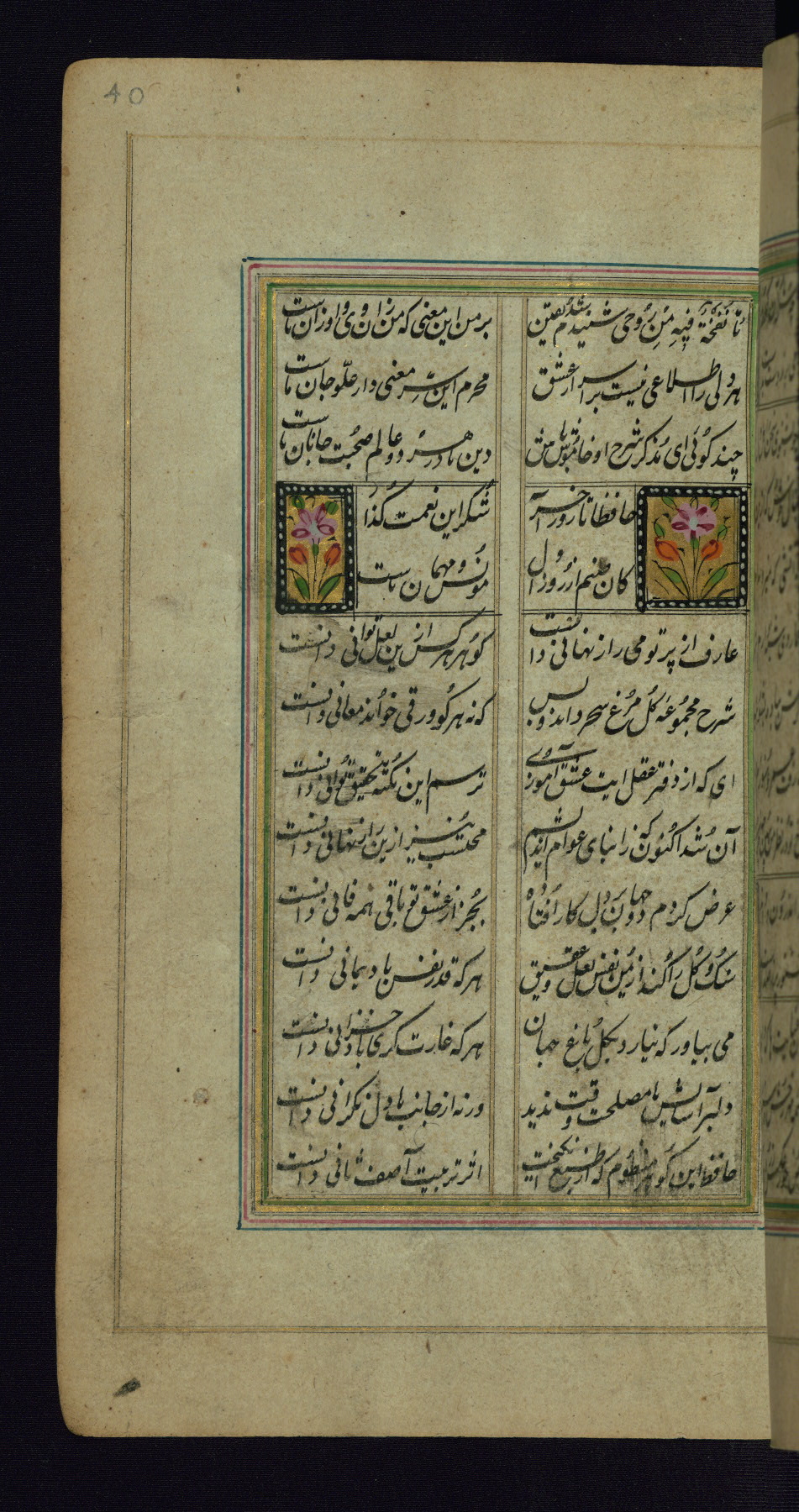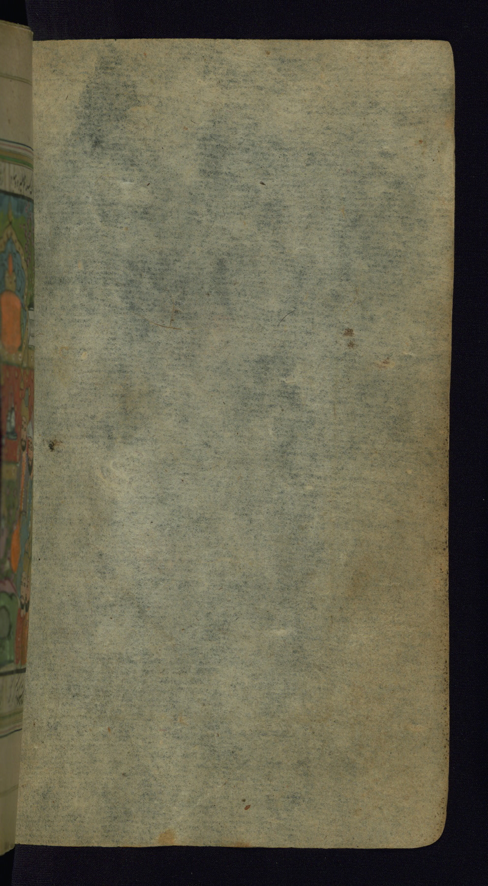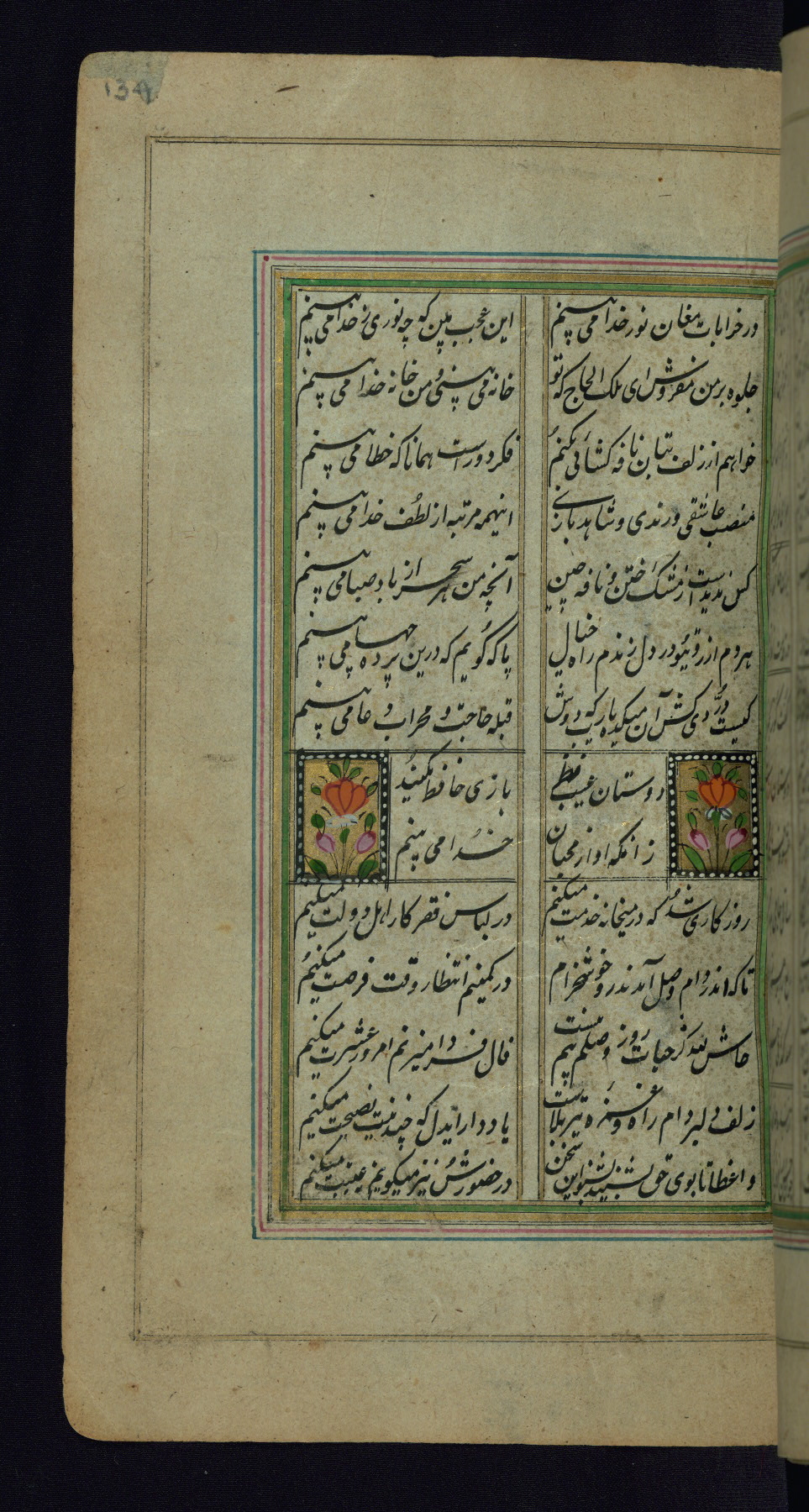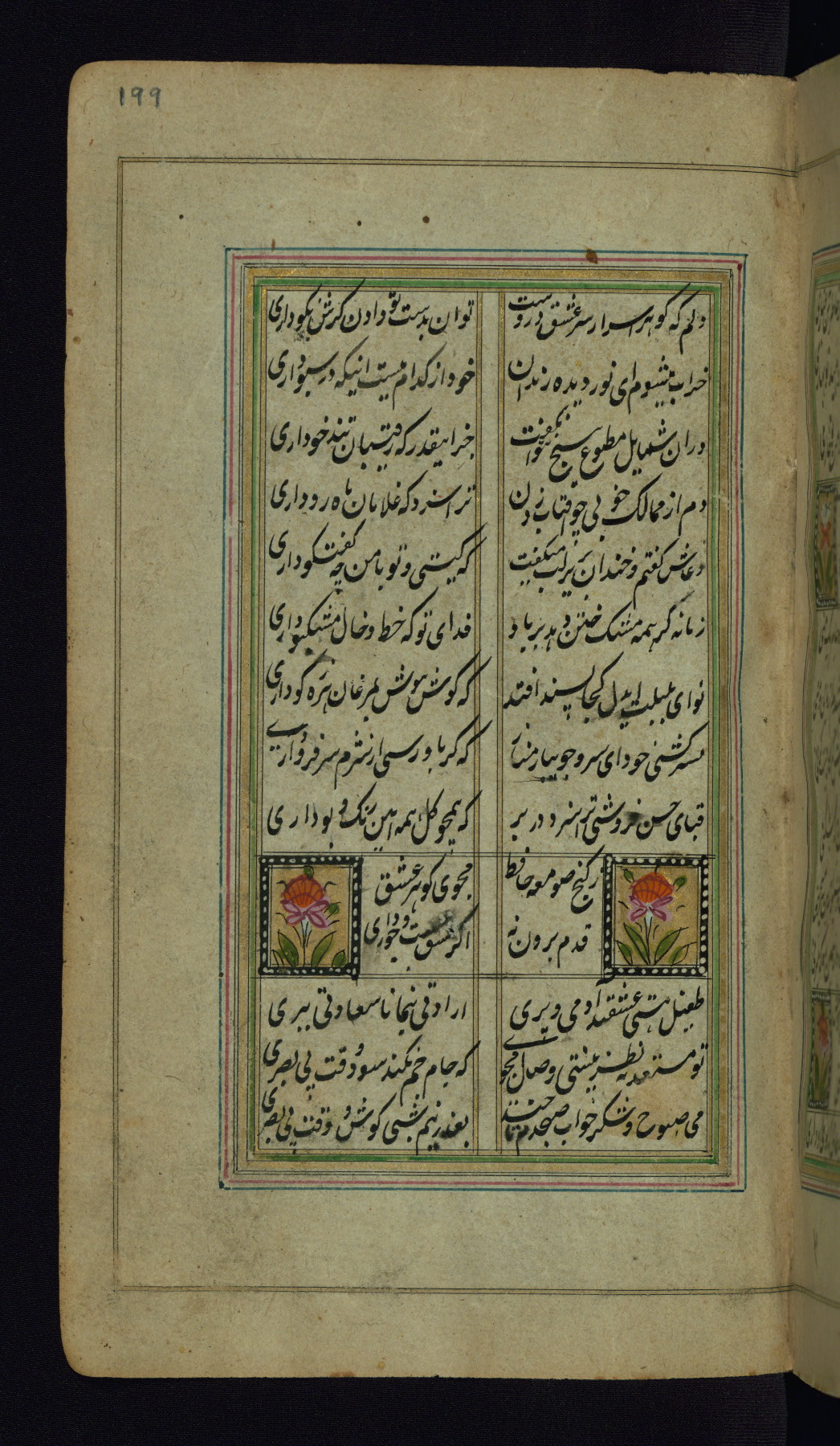 This is an illuminated and illustrated Collection of poems (dīvān) by Shams al-Dīn Muḥammad Ḥāfiz al-Shīrāzī (fl. eighth century AH / fourteenth CE), which was produced in India. According to the colophon, the manuscript was completed on the 19th Rajab 1202[?] AH / 1788[?] CE. It opens with a double-page illuminated incipit (fols. 1b-2a) with headpiece that introduces the preface (dībāchah) (fols. 1b-4b), followed by another double-page illuminated incipit with headpiece opening the main text of the Dīvān (fols. 5b-6a). The codex is decorated throughout with square and rectangular panels, as well as horizontal bands with floral decoration marking the end of odes, quatrains, or series of verses. There are forty-nine illustrations. The brown leather binding with medallion and pendants is contemporary with the manuscript.