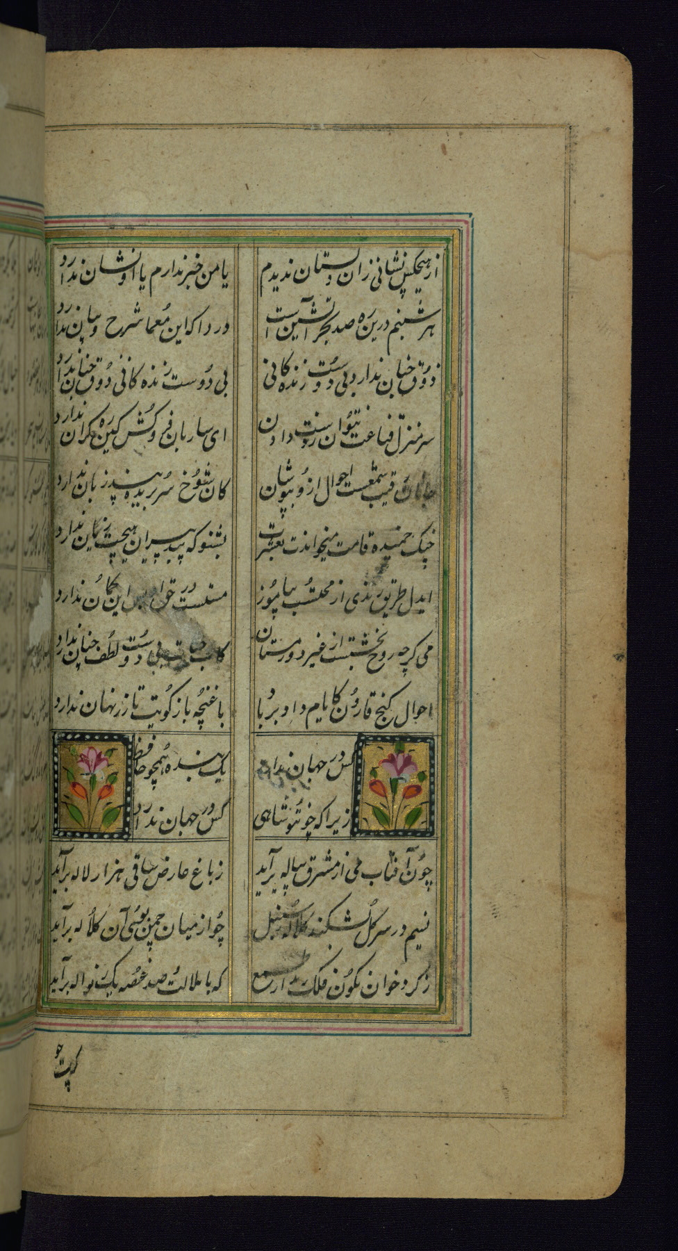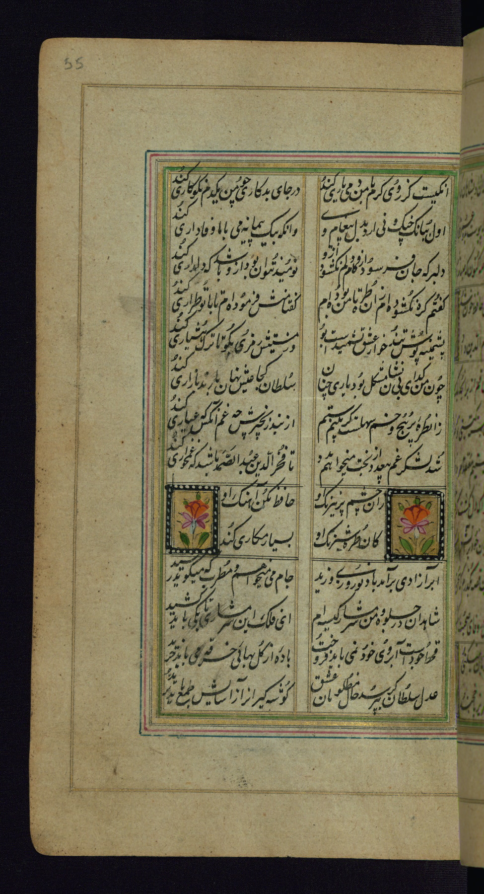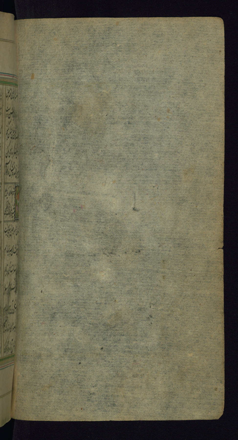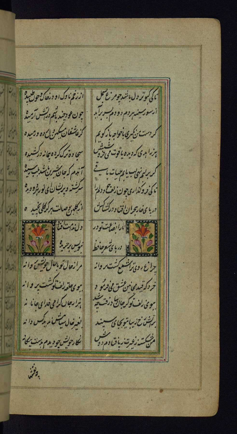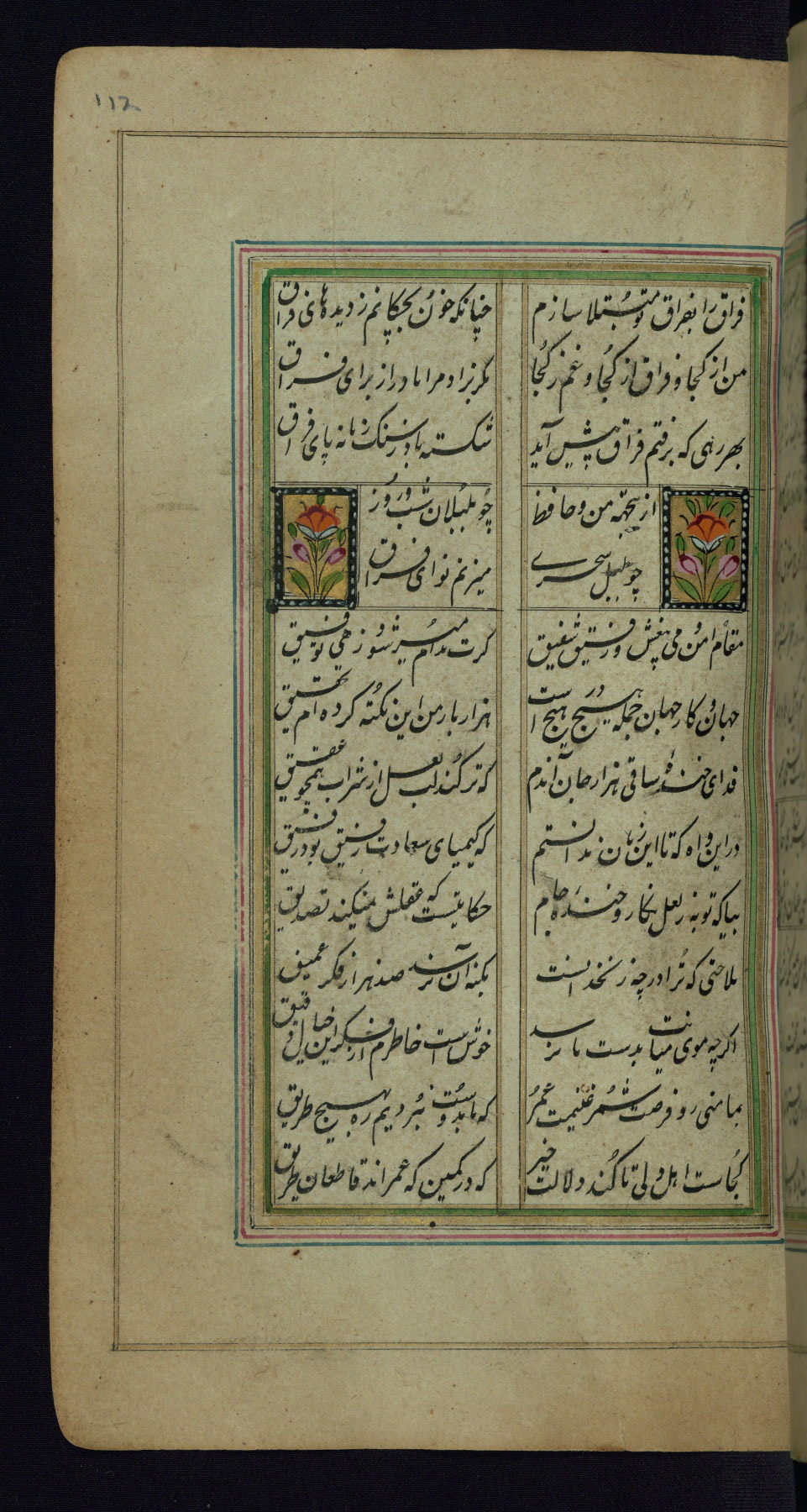 This is an illuminated and illustrated Collection of poems (dīvān) by Shams al-Dīn Muḥammad Ḥāfiz al-Shīrāzī (fl. eighth century AH / fourteenth CE), which was produced in India. According to the colophon, the manuscript was completed on the 19th Rajab 1202[?] AH / 1788[?] CE. It opens with a double-page illuminated incipit (fols. 1b-2a) with headpiece that introduces the preface (dībāchah) (fols. 1b-4b), followed by another double-page illuminated incipit with headpiece opening the main text of the Dīvān (fols. 5b-6a). The codex is decorated throughout with square and rectangular panels, as well as horizontal bands with floral decoration marking the end of odes, quatrains, or series of verses. There are forty-nine illustrations. The brown leather binding with medallion and pendants is contemporary with the manuscript.