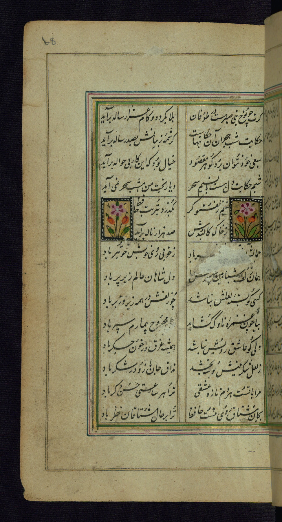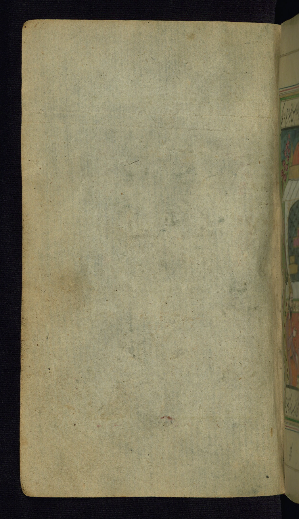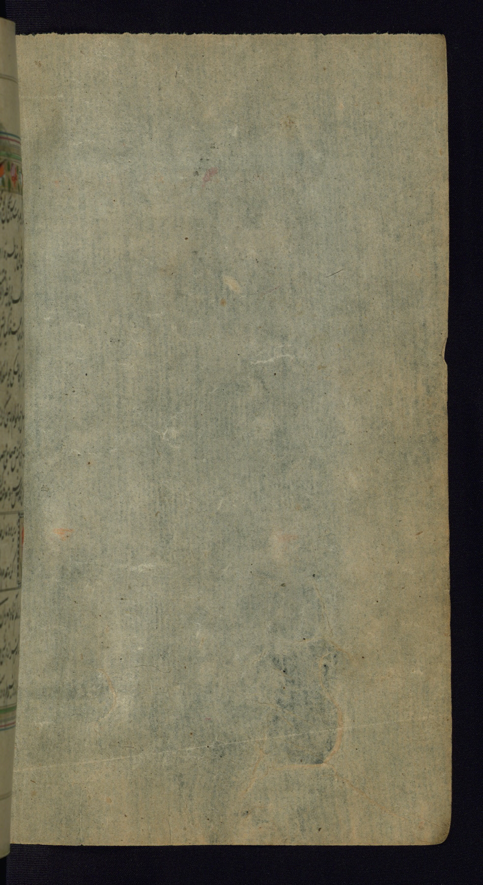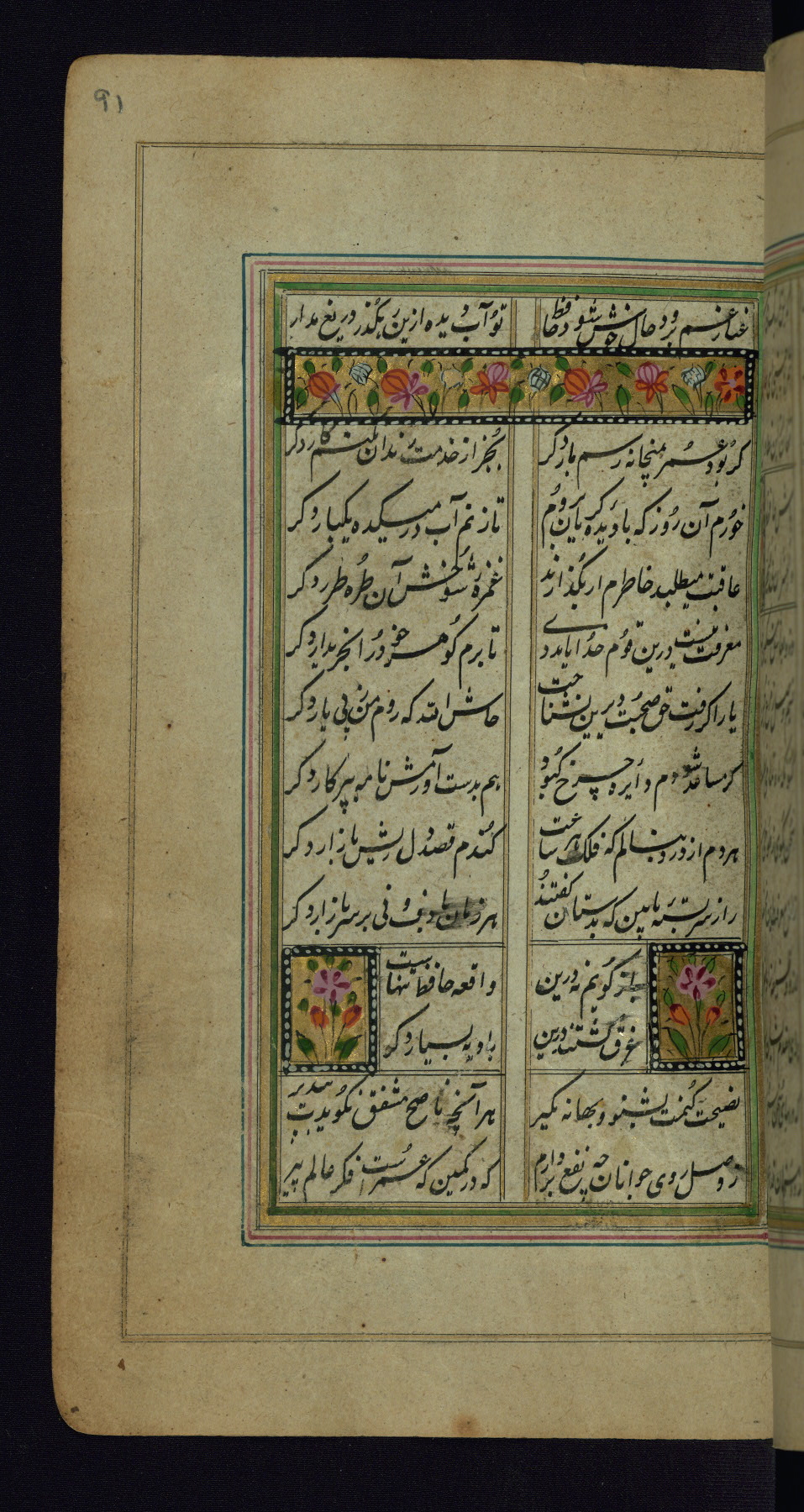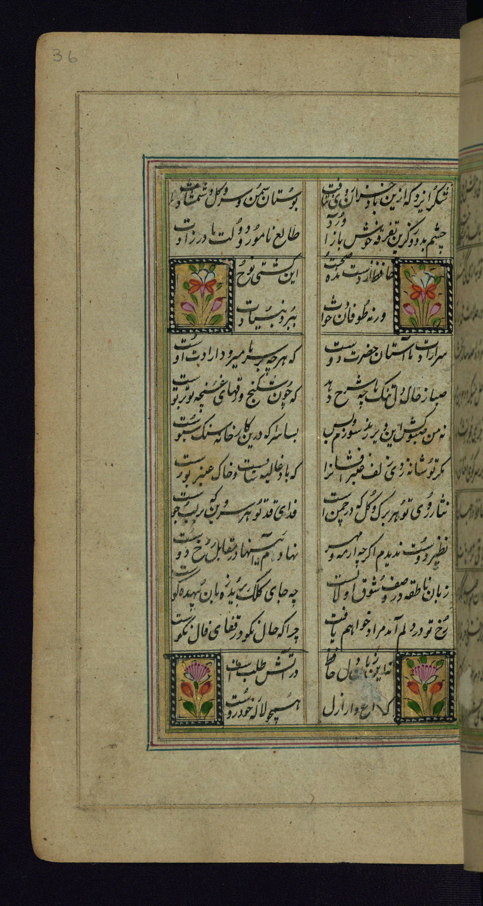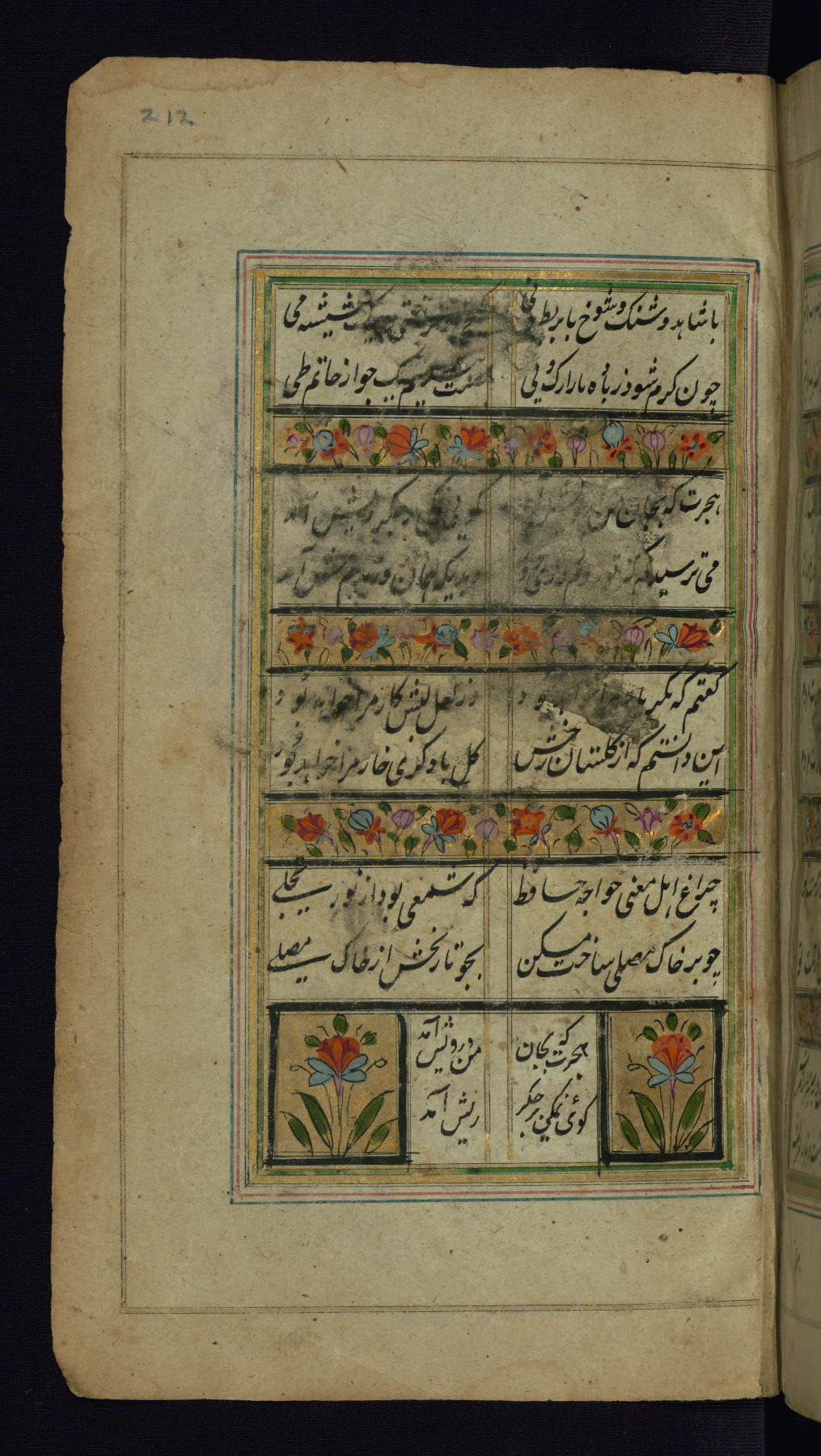 This is an illuminated and illustrated Collection of poems (dīvān) by Shams al-Dīn Muḥammad Ḥāfiz al-Shīrāzī (fl. eighth century AH / fourteenth CE), which was produced in India. According to the colophon, the manuscript was completed on the 19th Rajab 1202[?] AH / 1788[?] CE. It opens with a double-page illuminated incipit (fols. 1b-2a) with headpiece that introduces the preface (dībāchah) (fols. 1b-4b), followed by another double-page illuminated incipit with headpiece opening the main text of the Dīvān (fols. 5b-6a). The codex is decorated throughout with square and rectangular panels, as well as horizontal bands with floral decoration marking the end of odes, quatrains, or series of verses. There are forty-nine illustrations. The brown leather binding with medallion and pendants is contemporary with the manuscript.