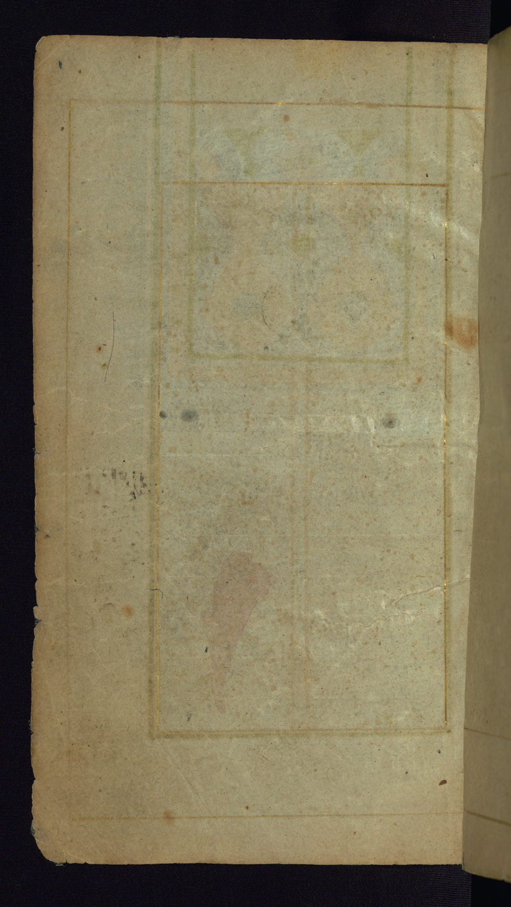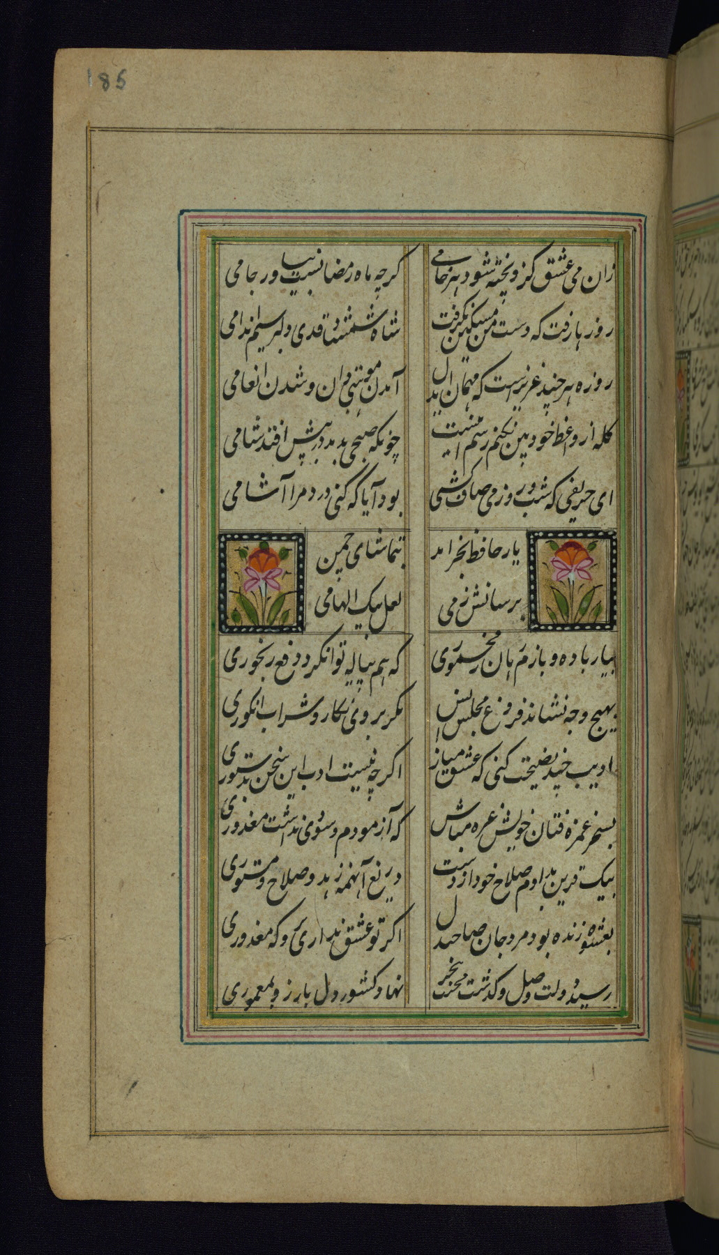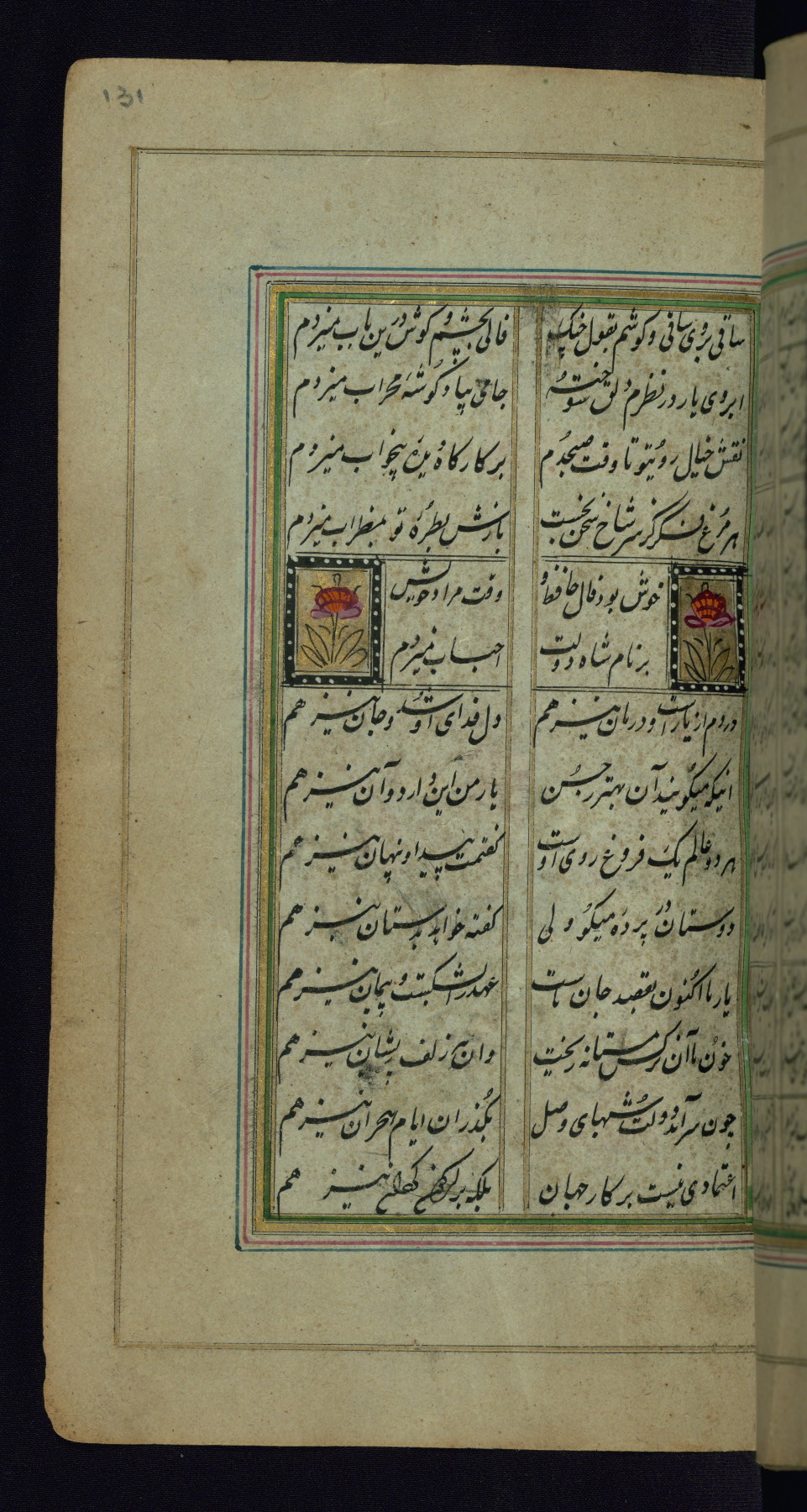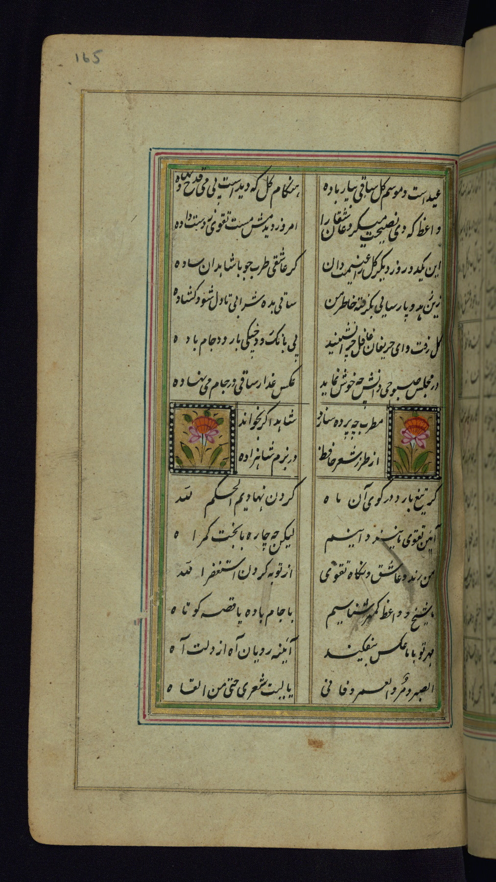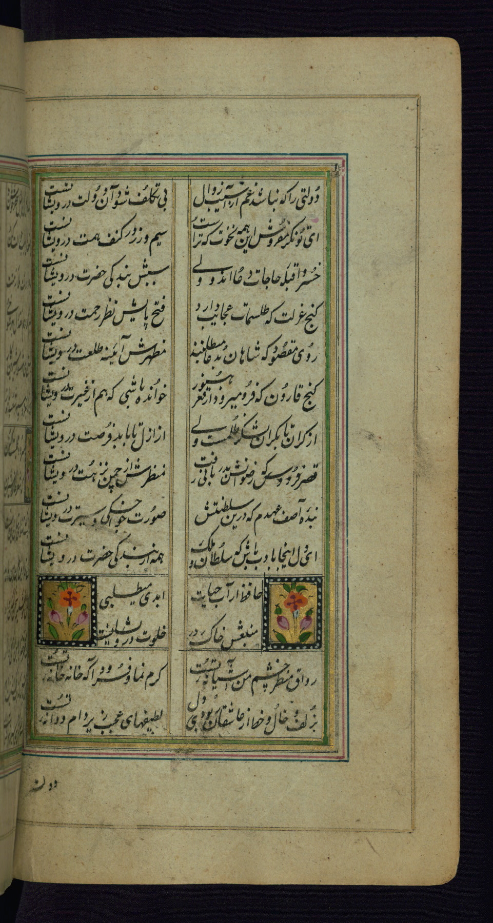 This is an illuminated and illustrated Collection of poems (dīvān) by Shams al-Dīn Muḥammad Ḥāfiz al-Shīrāzī (fl. eighth century AH / fourteenth CE), which was produced in India. According to the colophon, the manuscript was completed on the 19th Rajab 1202[?] AH / 1788[?] CE. It opens with a double-page illuminated incipit (fols. 1b-2a) with headpiece that introduces the preface (dībāchah) (fols. 1b-4b), followed by another double-page illuminated incipit with headpiece opening the main text of the Dīvān (fols. 5b-6a). The codex is decorated throughout with square and rectangular panels, as well as horizontal bands with floral decoration marking the end of odes, quatrains, or series of verses. There are forty-nine illustrations. The brown leather binding with medallion and pendants is contemporary with the manuscript.