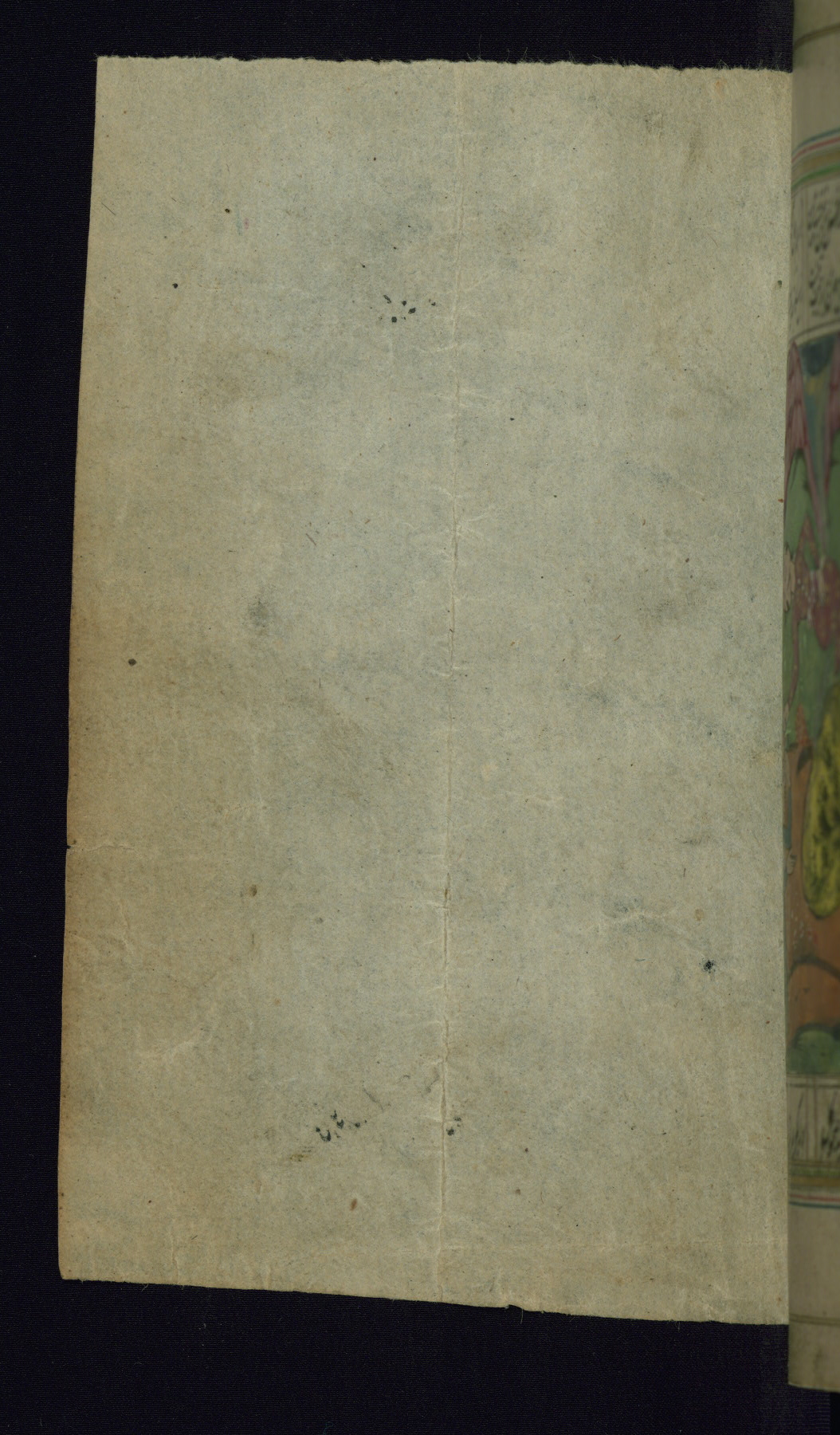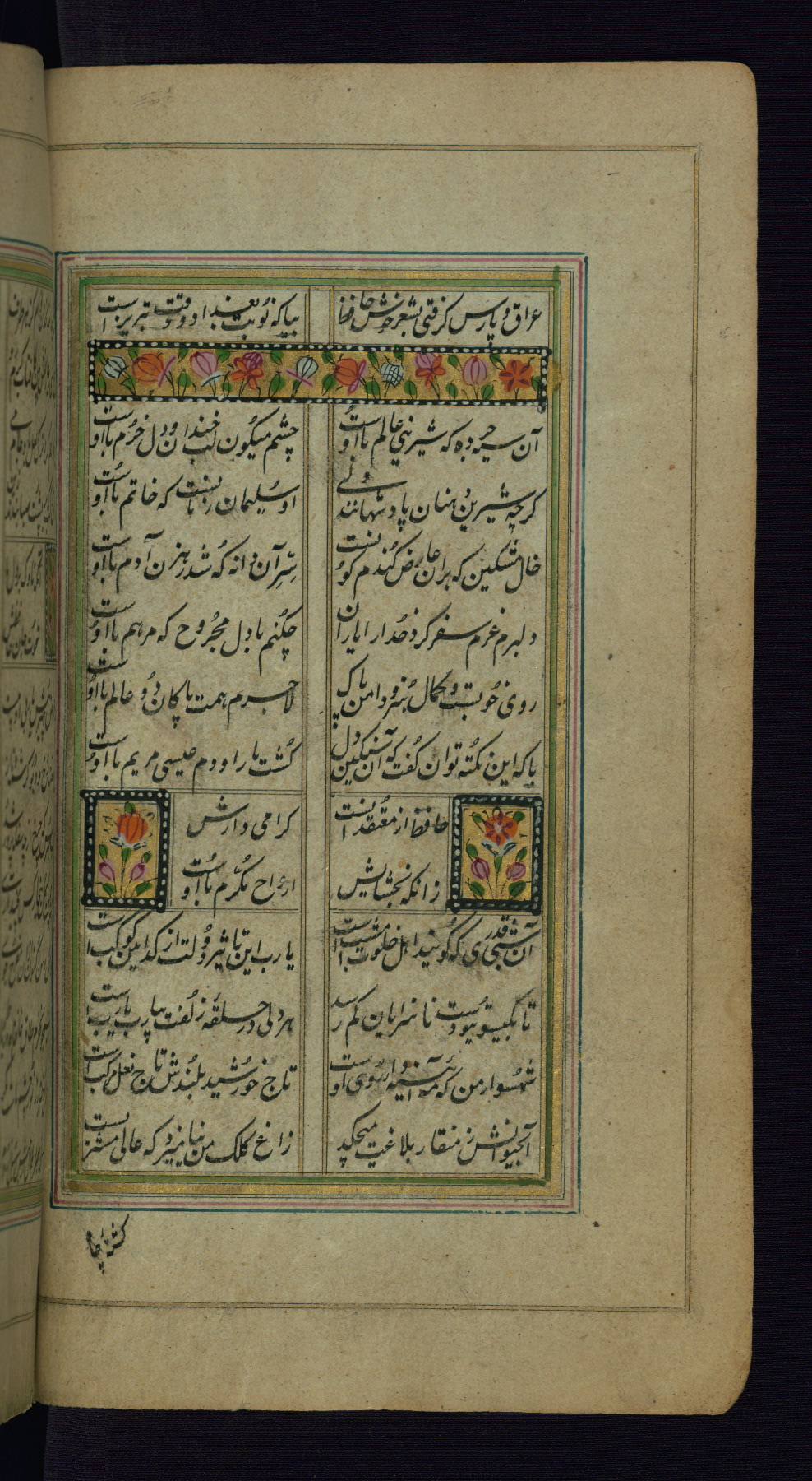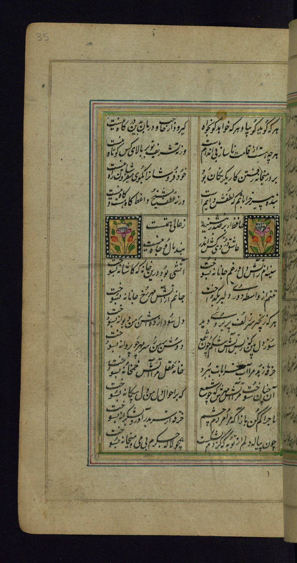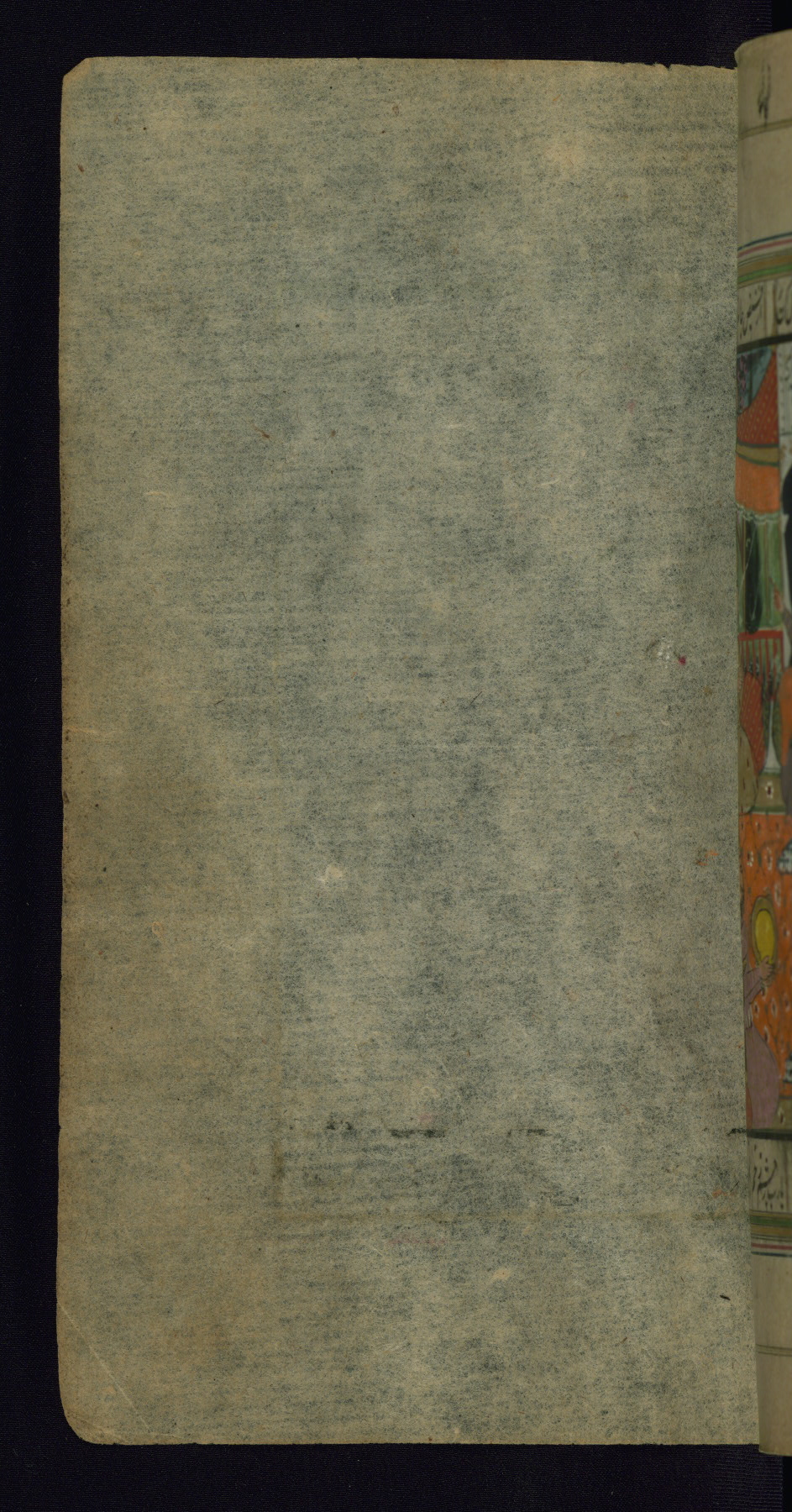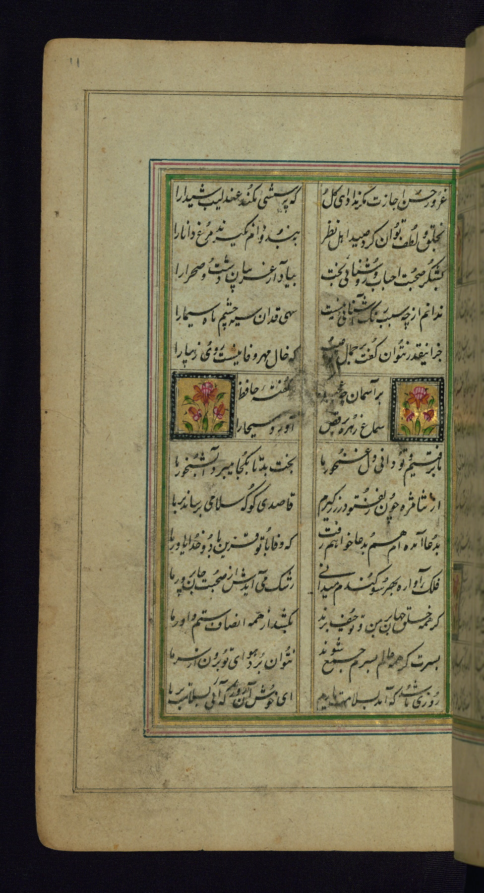 This is an illuminated and illustrated Collection of poems (dīvān) by Shams al-Dīn Muḥammad Ḥāfiz al-Shīrāzī (fl. eighth century AH / fourteenth CE), which was produced in India. According to the colophon, the manuscript was completed on the 19th Rajab 1202[?] AH / 1788[?] CE. It opens with a double-page illuminated incipit (fols. 1b-2a) with headpiece that introduces the preface (dībāchah) (fols. 1b-4b), followed by another double-page illuminated incipit with headpiece opening the main text of the Dīvān (fols. 5b-6a). The codex is decorated throughout with square and rectangular panels, as well as horizontal bands with floral decoration marking the end of odes, quatrains, or series of verses. There are forty-nine illustrations. The brown leather binding with medallion and pendants is contemporary with the manuscript.