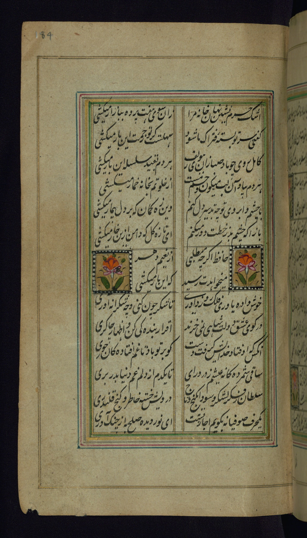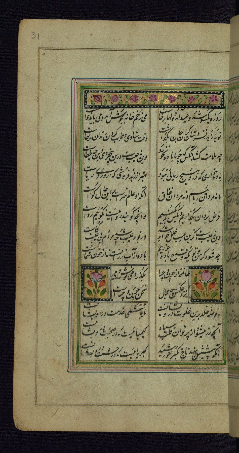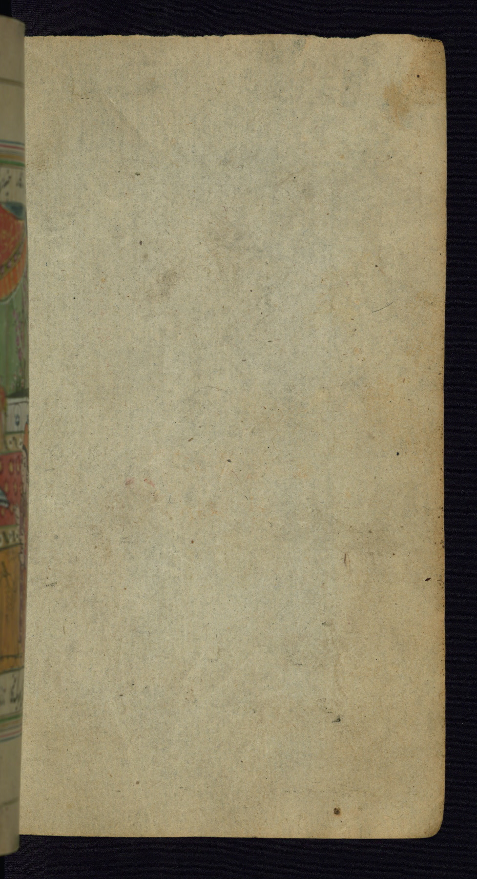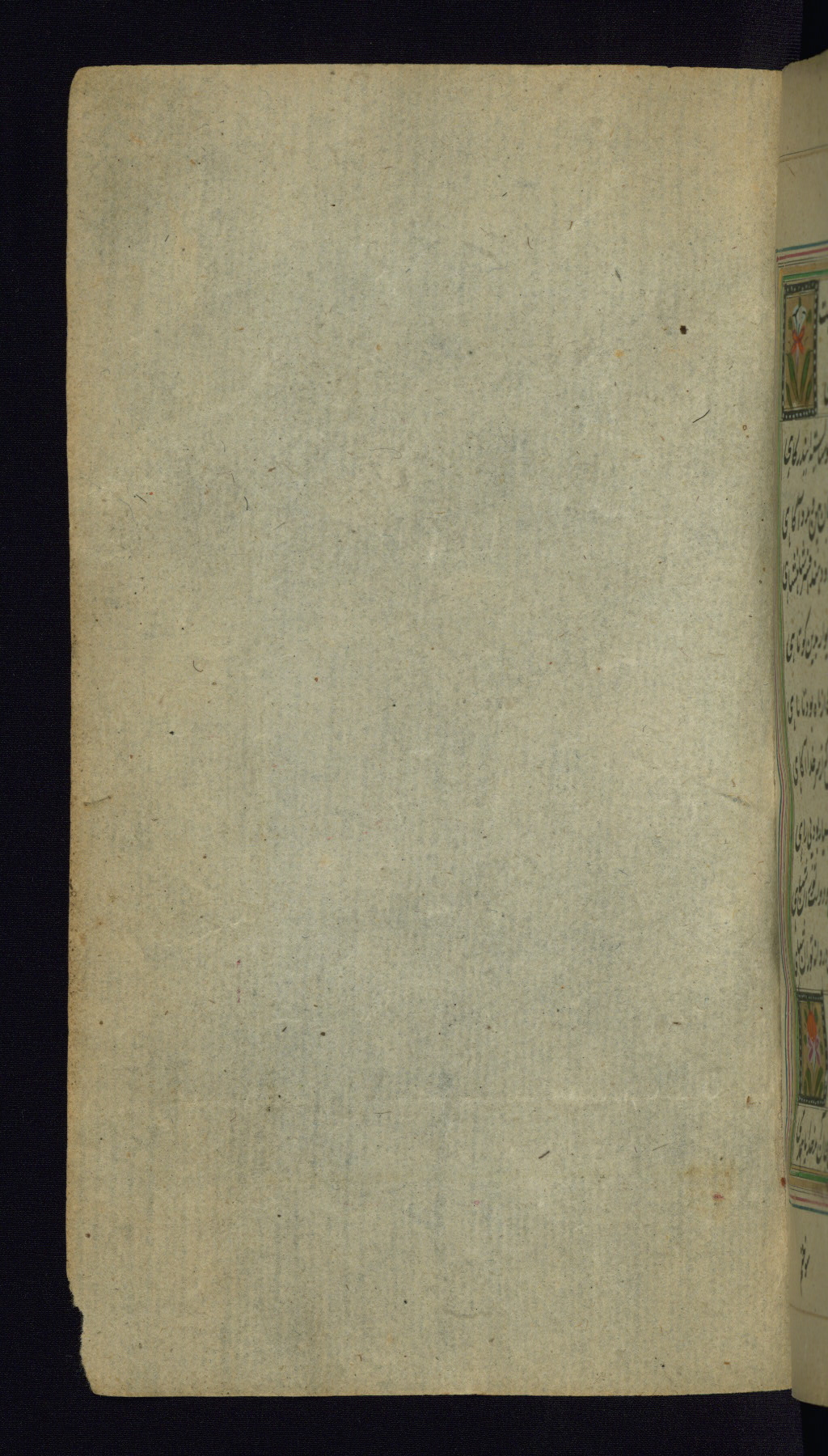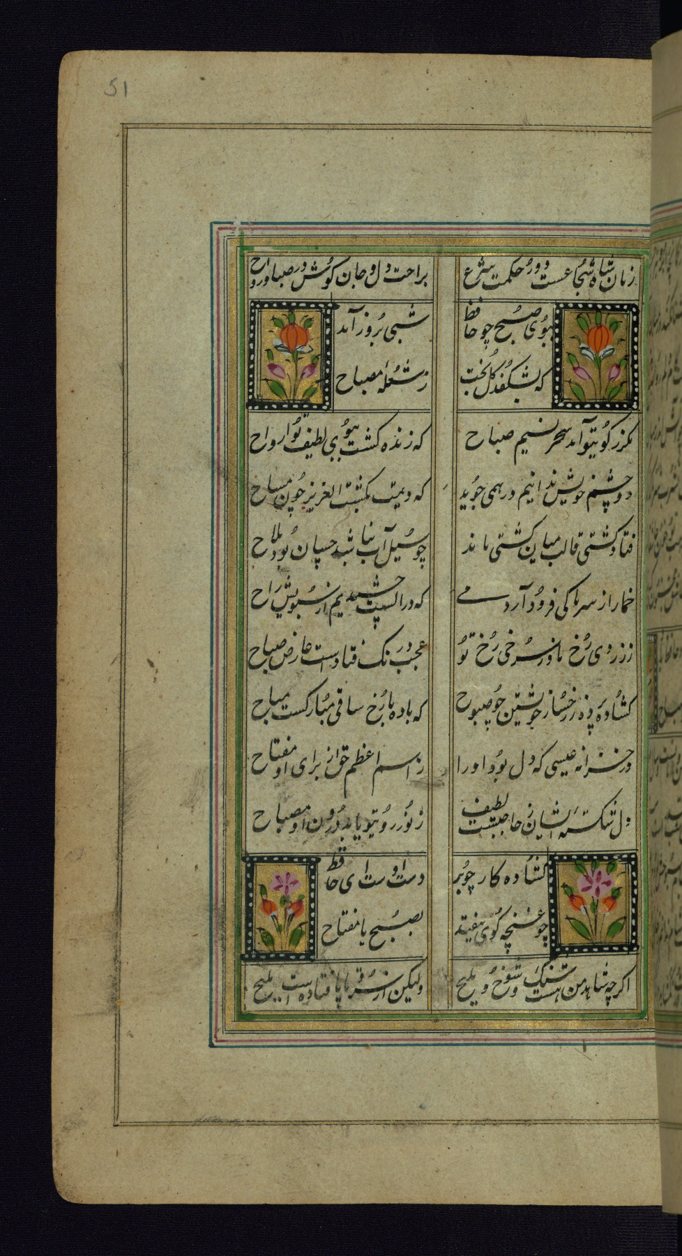 This is an illuminated and illustrated Collection of poems (dīvān) by Shams al-Dīn Muḥammad Ḥāfiz al-Shīrāzī (fl. eighth century AH / fourteenth CE), which was produced in India. According to the colophon, the manuscript was completed on the 19th Rajab 1202[?] AH / 1788[?] CE. It opens with a double-page illuminated incipit (fols. 1b-2a) with headpiece that introduces the preface (dībāchah) (fols. 1b-4b), followed by another double-page illuminated incipit with headpiece opening the main text of the Dīvān (fols. 5b-6a). The codex is decorated throughout with square and rectangular panels, as well as horizontal bands with floral decoration marking the end of odes, quatrains, or series of verses. There are forty-nine illustrations. The brown leather binding with medallion and pendants is contemporary with the manuscript.