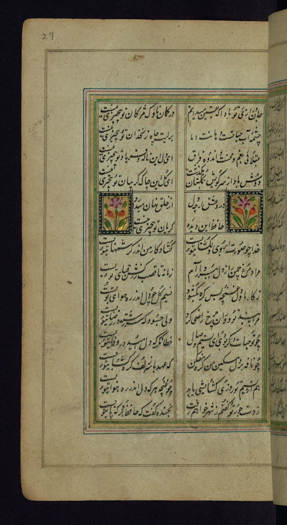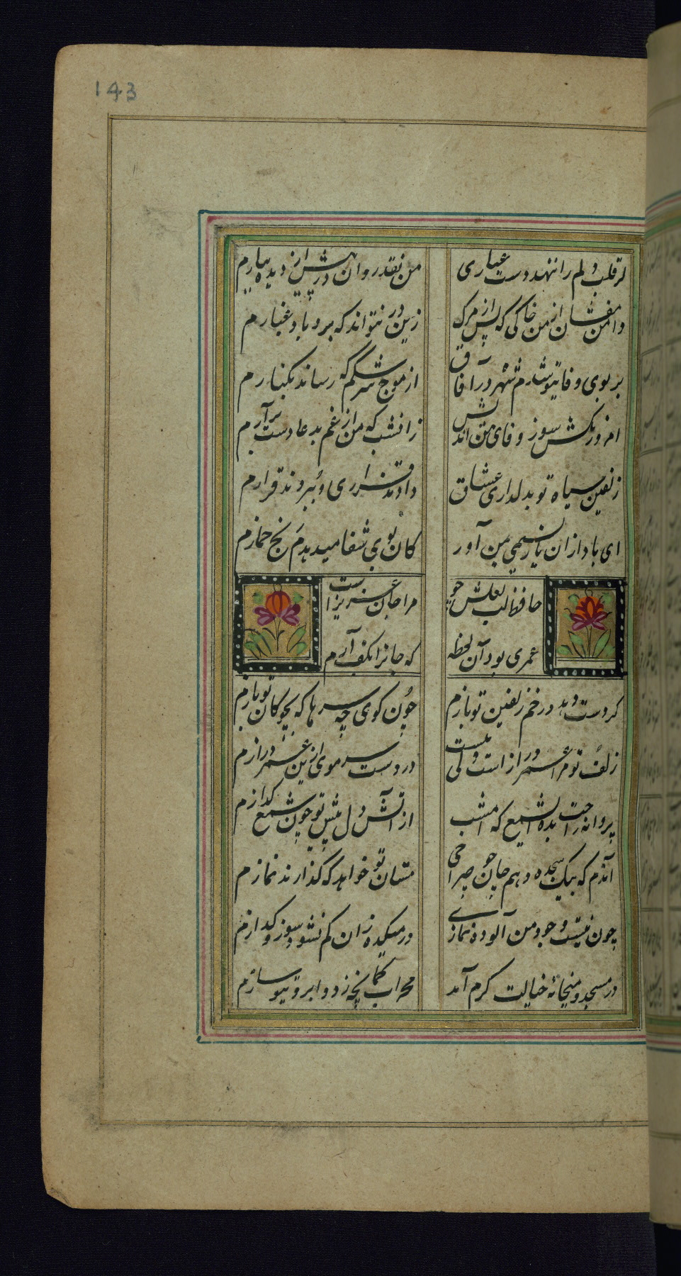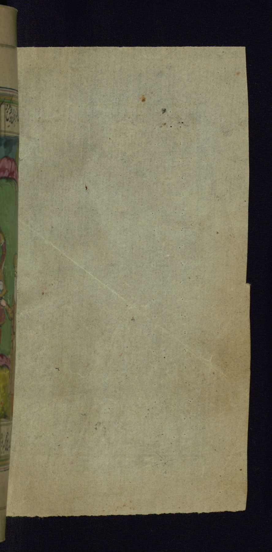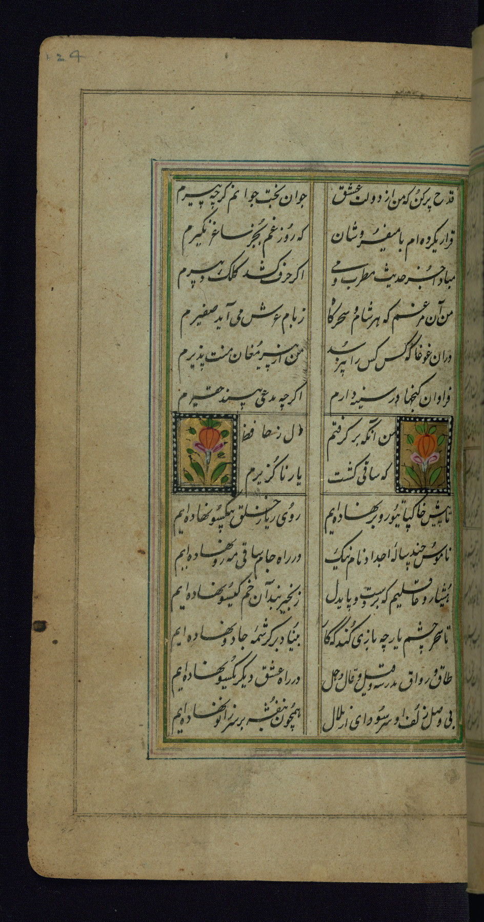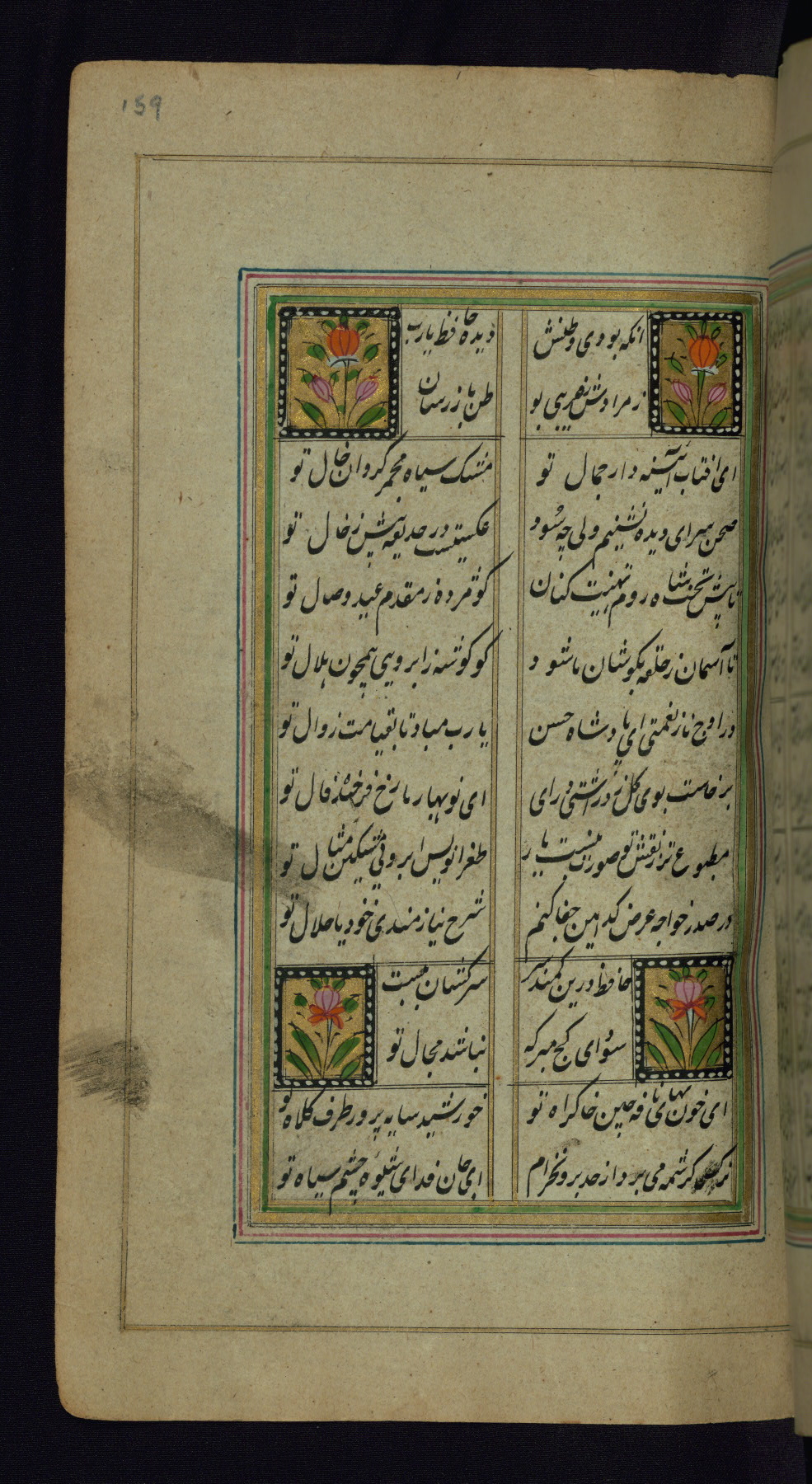 This is an illuminated and illustrated Collection of poems (dīvān) by Shams al-Dīn Muḥammad Ḥāfiz al-Shīrāzī (fl. eighth century AH / fourteenth CE), which was produced in India. According to the colophon, the manuscript was completed on the 19th Rajab 1202[?] AH / 1788[?] CE. It opens with a double-page illuminated incipit (fols. 1b-2a) with headpiece that introduces the preface (dībāchah) (fols. 1b-4b), followed by another double-page illuminated incipit with headpiece opening the main text of the Dīvān (fols. 5b-6a). The codex is decorated throughout with square and rectangular panels, as well as horizontal bands with floral decoration marking the end of odes, quatrains, or series of verses. There are forty-nine illustrations. The brown leather binding with medallion and pendants is contemporary with the manuscript.