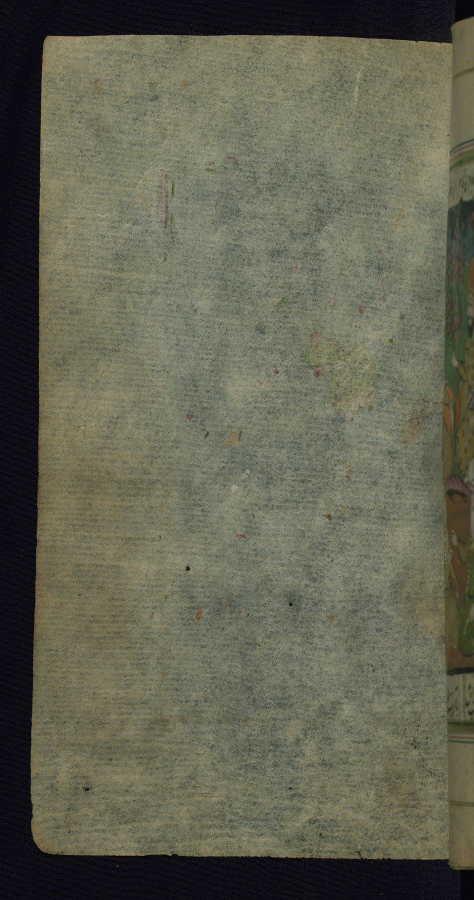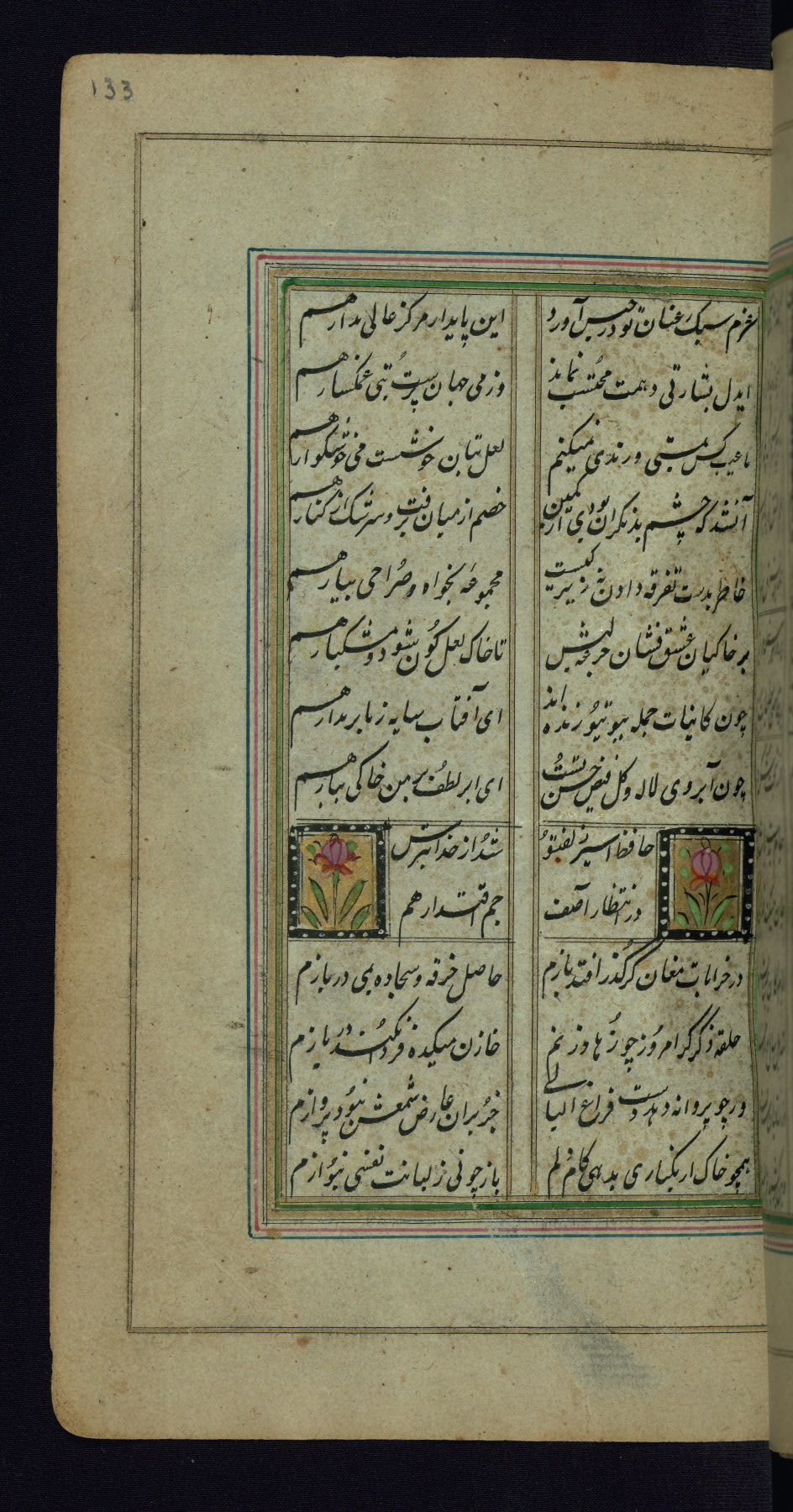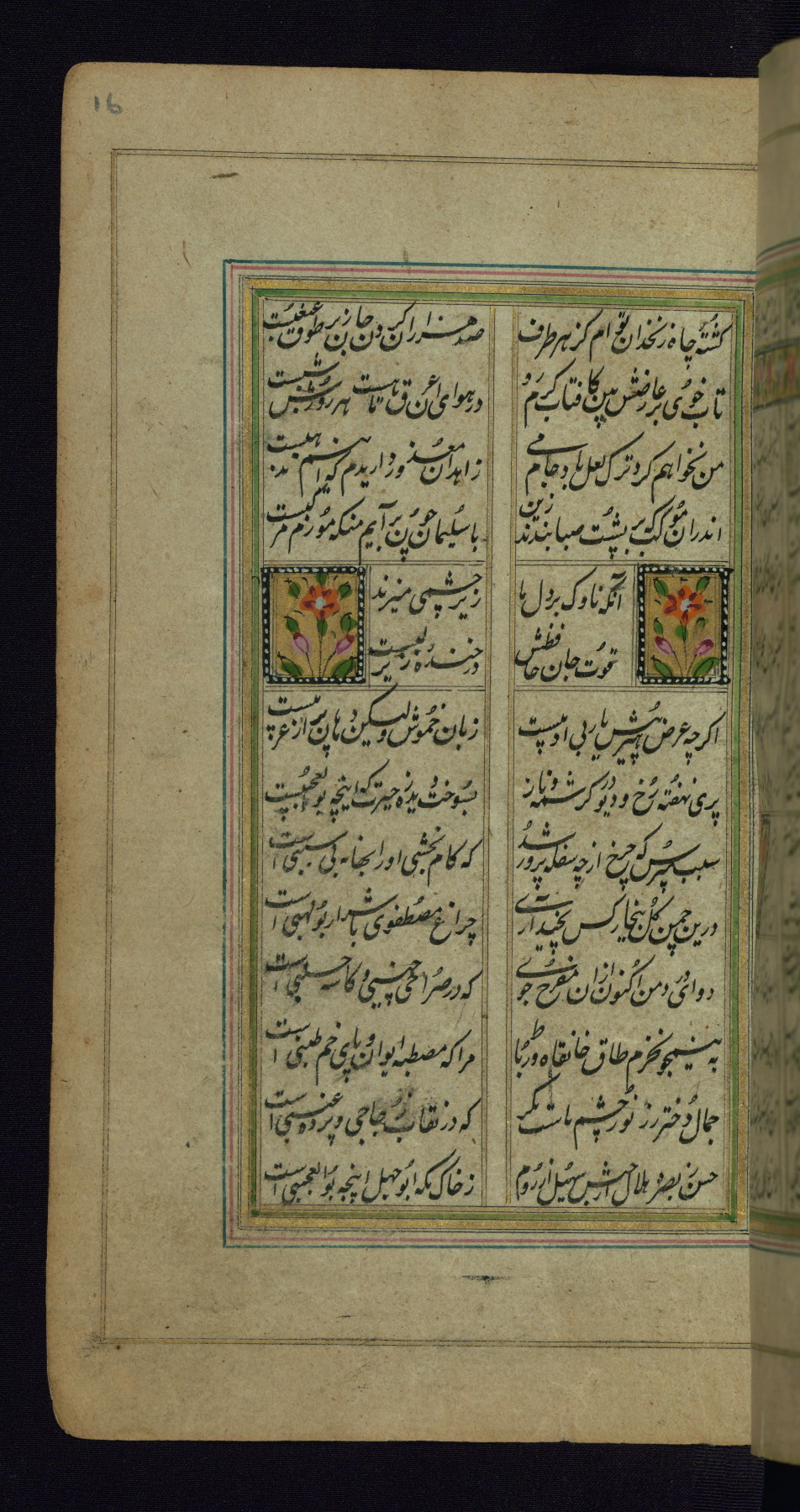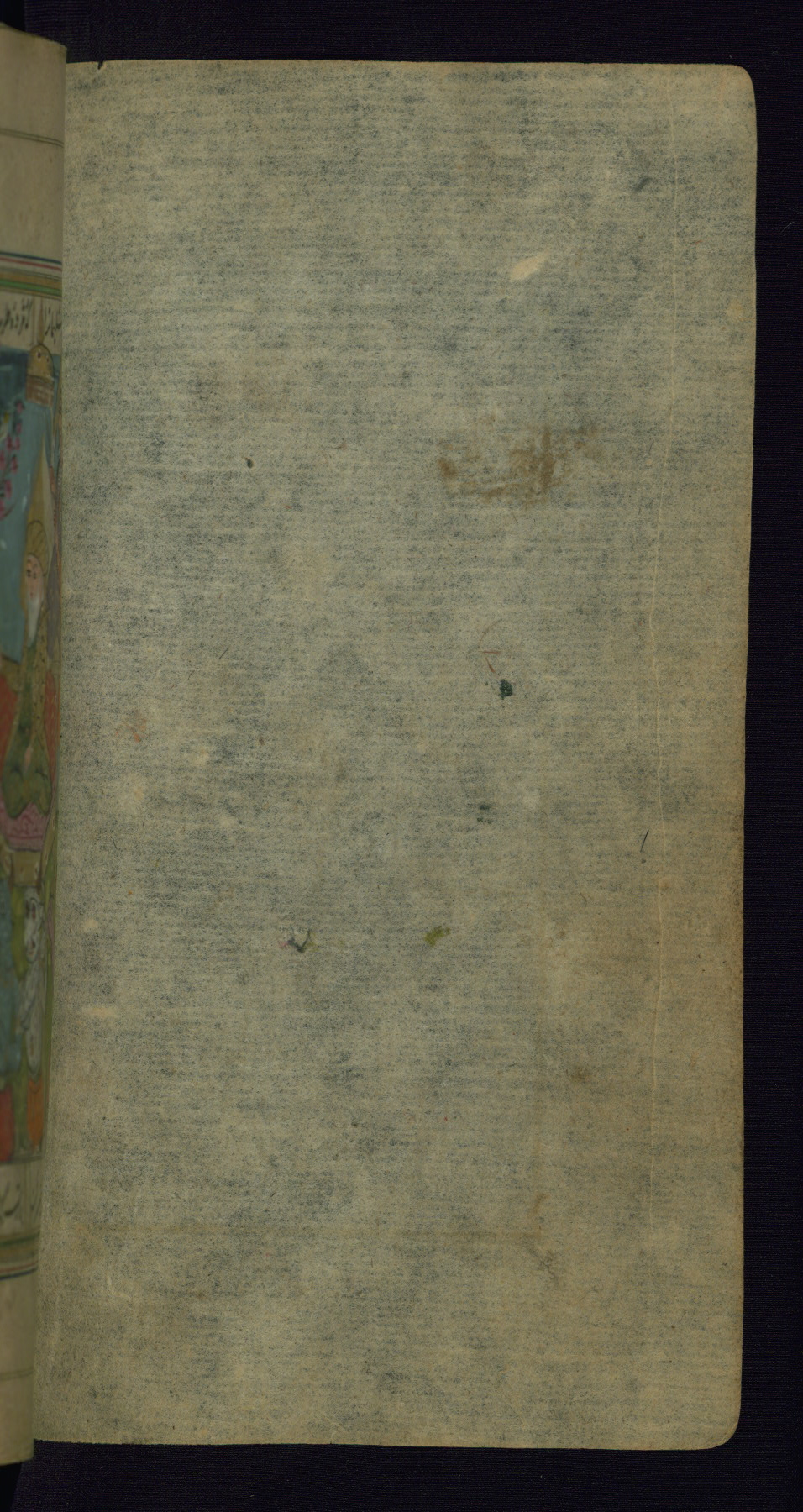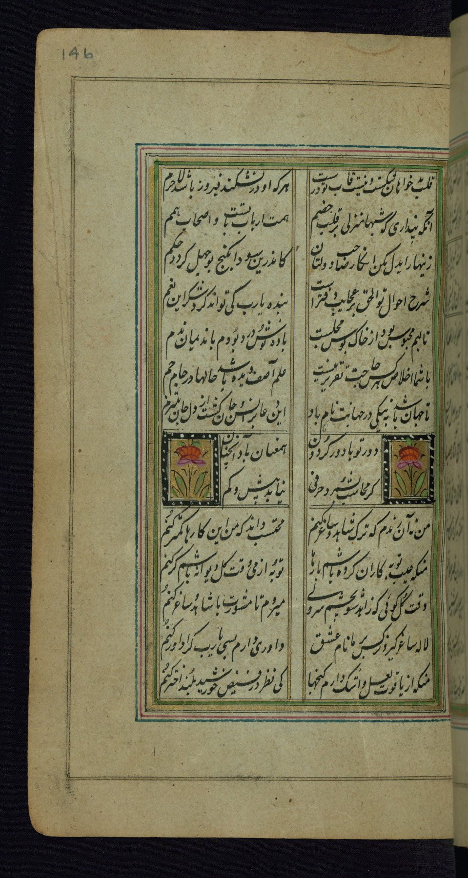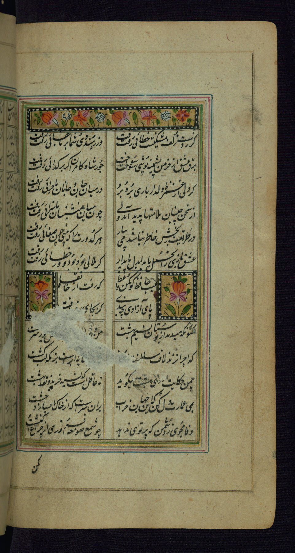 This is an illuminated and illustrated Collection of poems (dīvān) by Shams al-Dīn Muḥammad Ḥāfiz al-Shīrāzī (fl. eighth century AH / fourteenth CE), which was produced in India. According to the colophon, the manuscript was completed on the 19th Rajab 1202[?] AH / 1788[?] CE. It opens with a double-page illuminated incipit (fols. 1b-2a) with headpiece that introduces the preface (dībāchah) (fols. 1b-4b), followed by another double-page illuminated incipit with headpiece opening the main text of the Dīvān (fols. 5b-6a). The codex is decorated throughout with square and rectangular panels, as well as horizontal bands with floral decoration marking the end of odes, quatrains, or series of verses. There are forty-nine illustrations. The brown leather binding with medallion and pendants is contemporary with the manuscript.