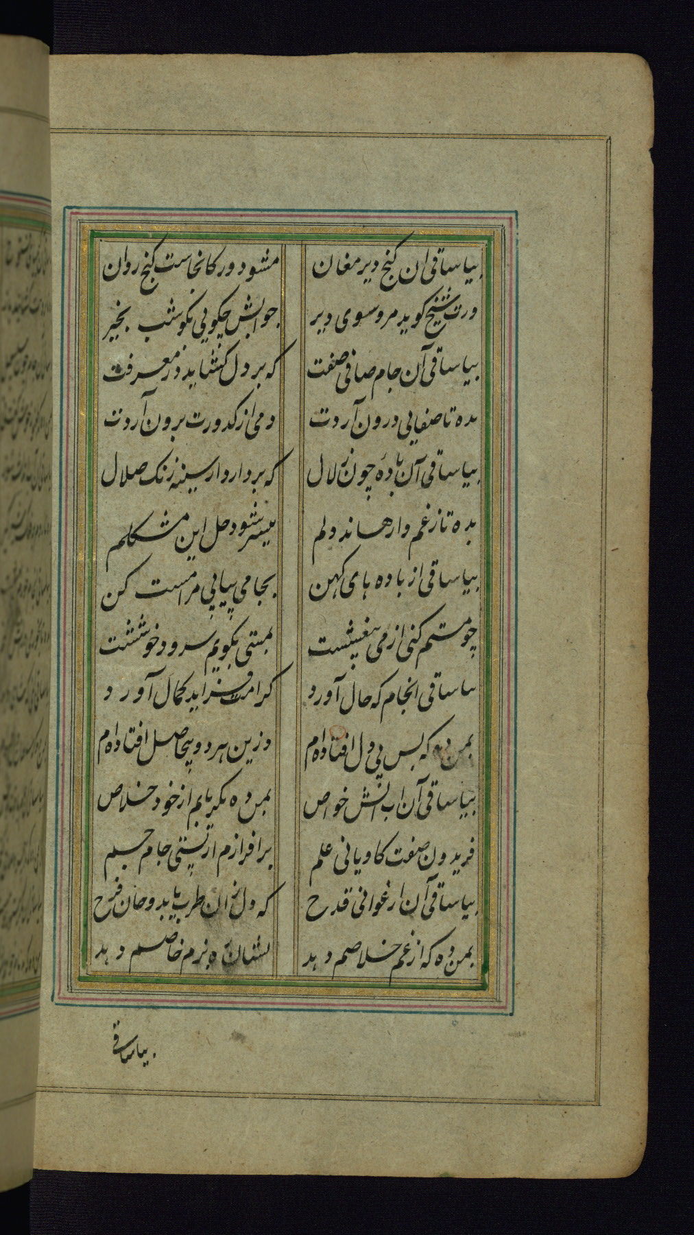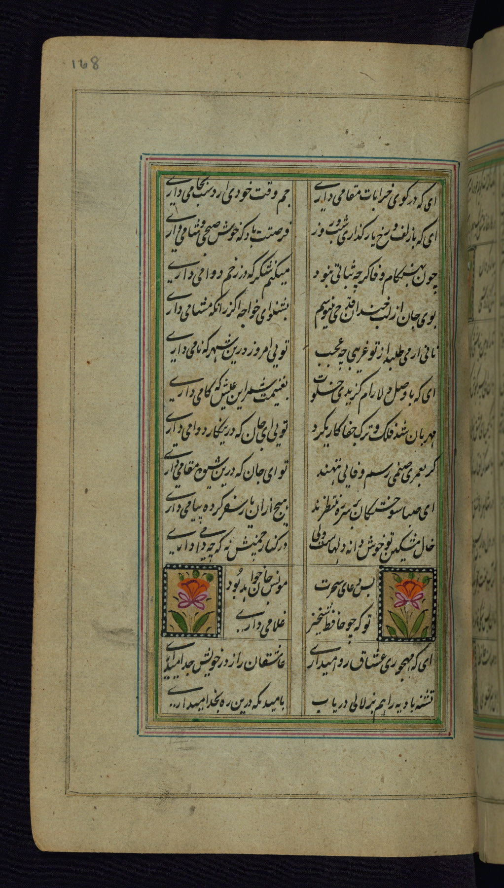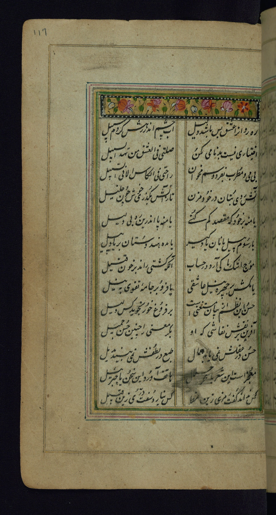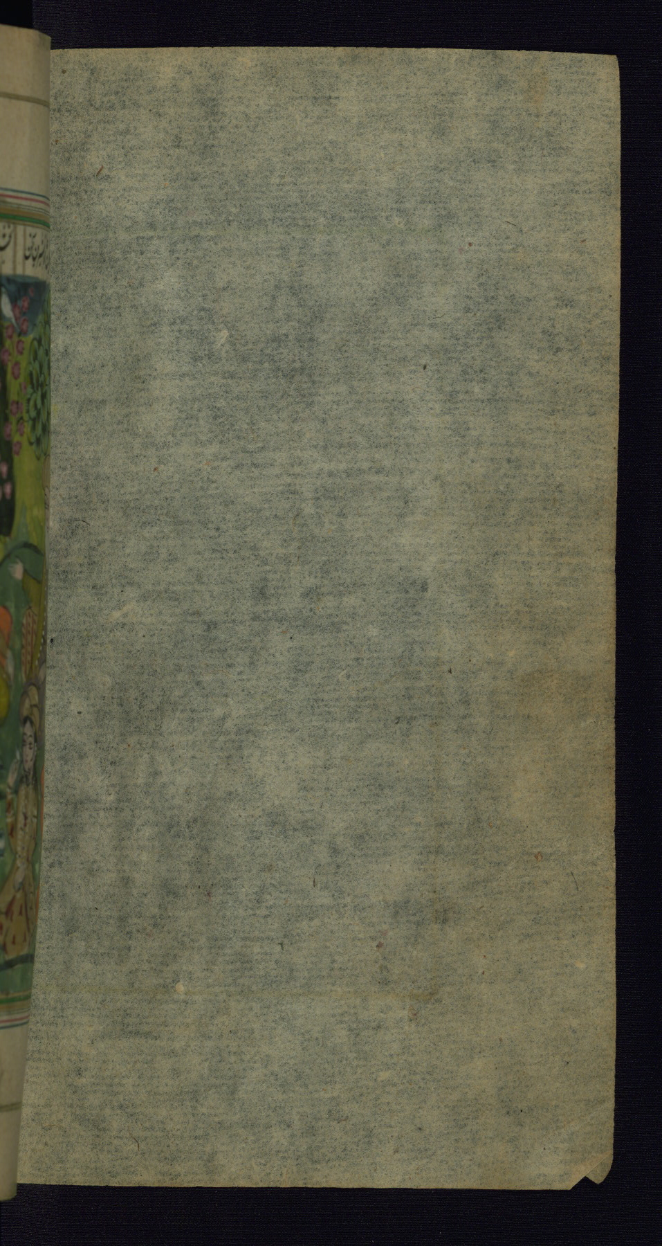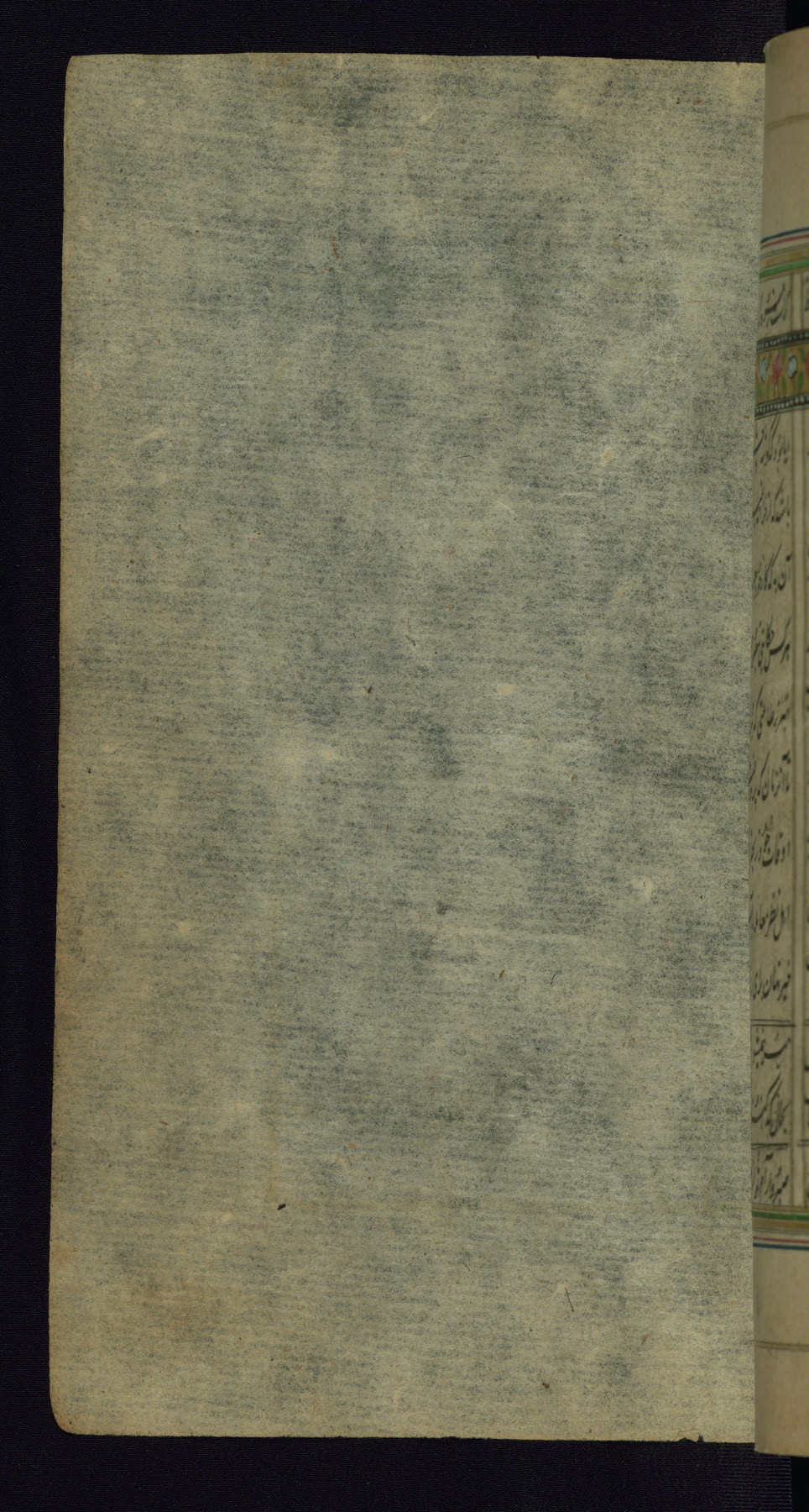 This is an illuminated and illustrated Collection of poems (dīvān) by Shams al-Dīn Muḥammad Ḥāfiz al-Shīrāzī (fl. eighth century AH / fourteenth CE), which was produced in India. According to the colophon, the manuscript was completed on the 19th Rajab 1202[?] AH / 1788[?] CE. It opens with a double-page illuminated incipit (fols. 1b-2a) with headpiece that introduces the preface (dībāchah) (fols. 1b-4b), followed by another double-page illuminated incipit with headpiece opening the main text of the Dīvān (fols. 5b-6a). The codex is decorated throughout with square and rectangular panels, as well as horizontal bands with floral decoration marking the end of odes, quatrains, or series of verses. There are forty-nine illustrations. The brown leather binding with medallion and pendants is contemporary with the manuscript.