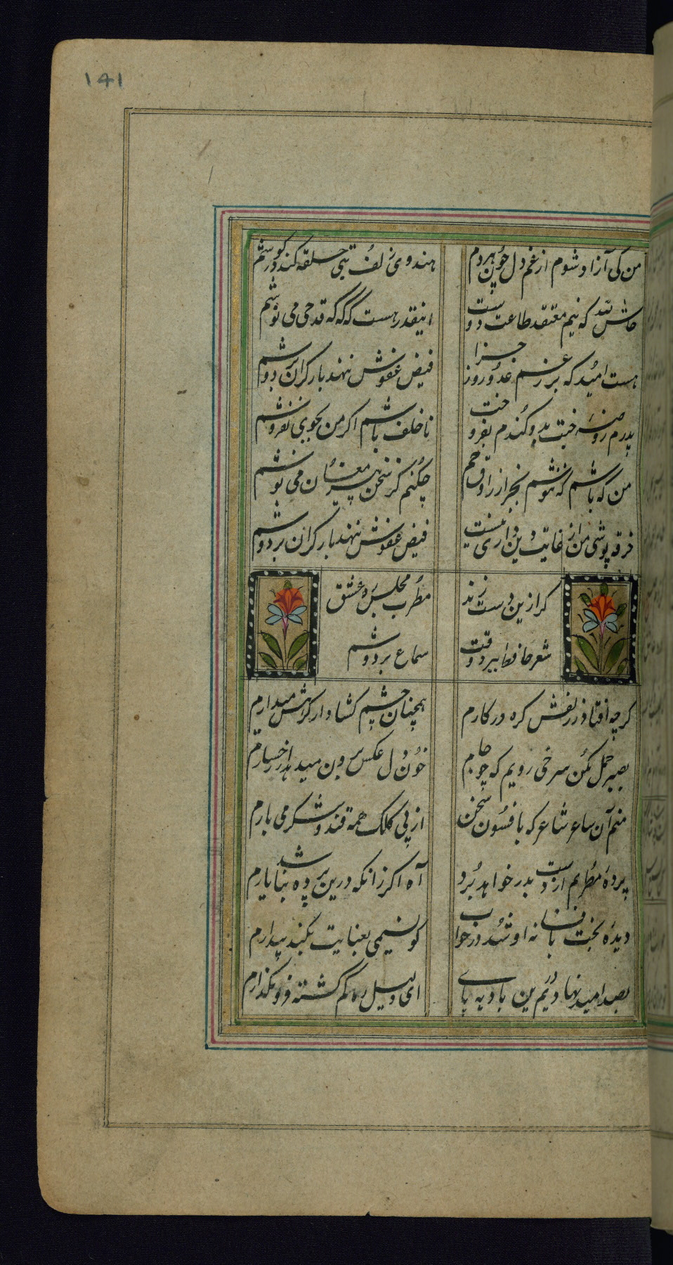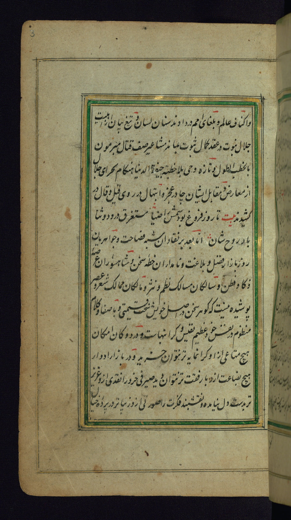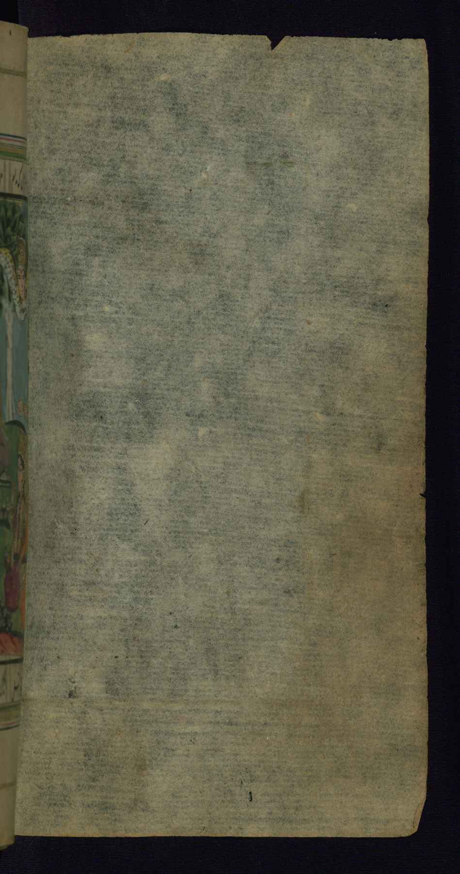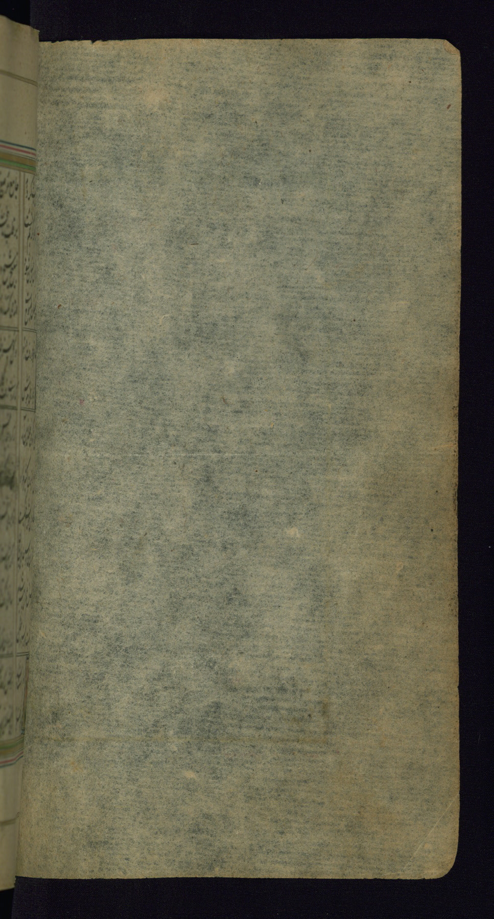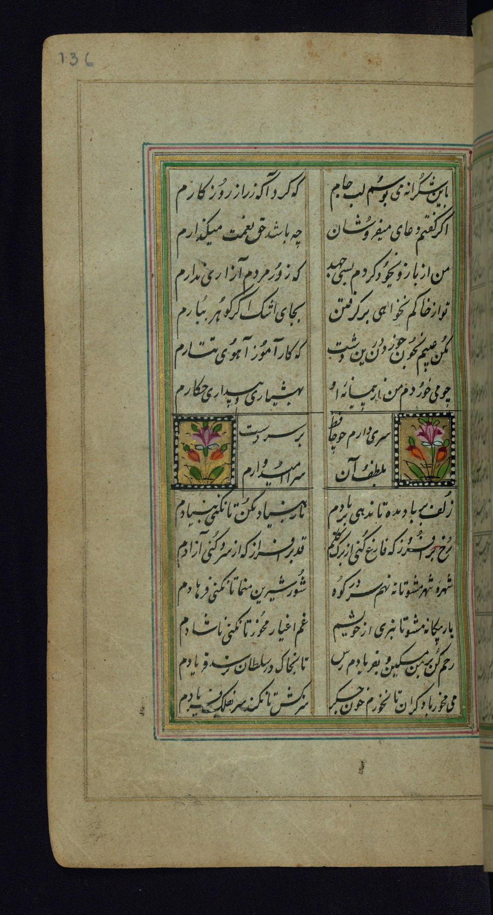 This is an illuminated and illustrated Collection of poems (dīvān) by Shams al-Dīn Muḥammad Ḥāfiz al-Shīrāzī (fl. eighth century AH / fourteenth CE), which was produced in India. According to the colophon, the manuscript was completed on the 19th Rajab 1202[?] AH / 1788[?] CE. It opens with a double-page illuminated incipit (fols. 1b-2a) with headpiece that introduces the preface (dībāchah) (fols. 1b-4b), followed by another double-page illuminated incipit with headpiece opening the main text of the Dīvān (fols. 5b-6a). The codex is decorated throughout with square and rectangular panels, as well as horizontal bands with floral decoration marking the end of odes, quatrains, or series of verses. There are forty-nine illustrations. The brown leather binding with medallion and pendants is contemporary with the manuscript.