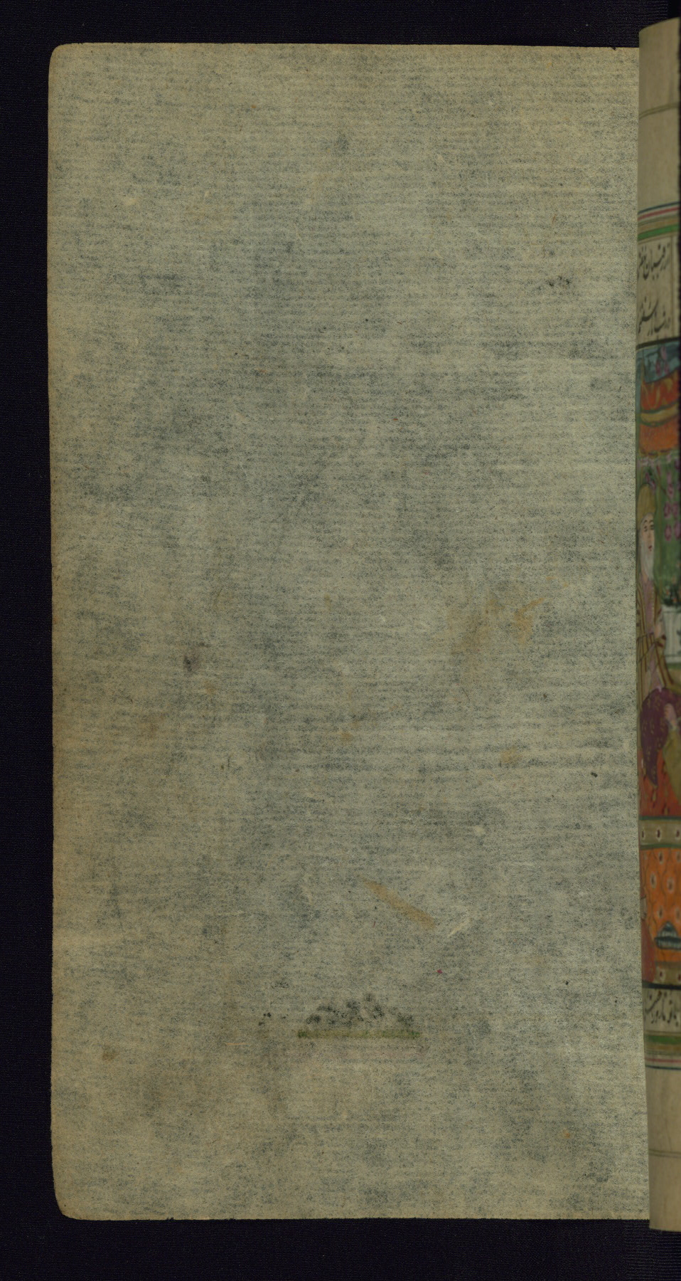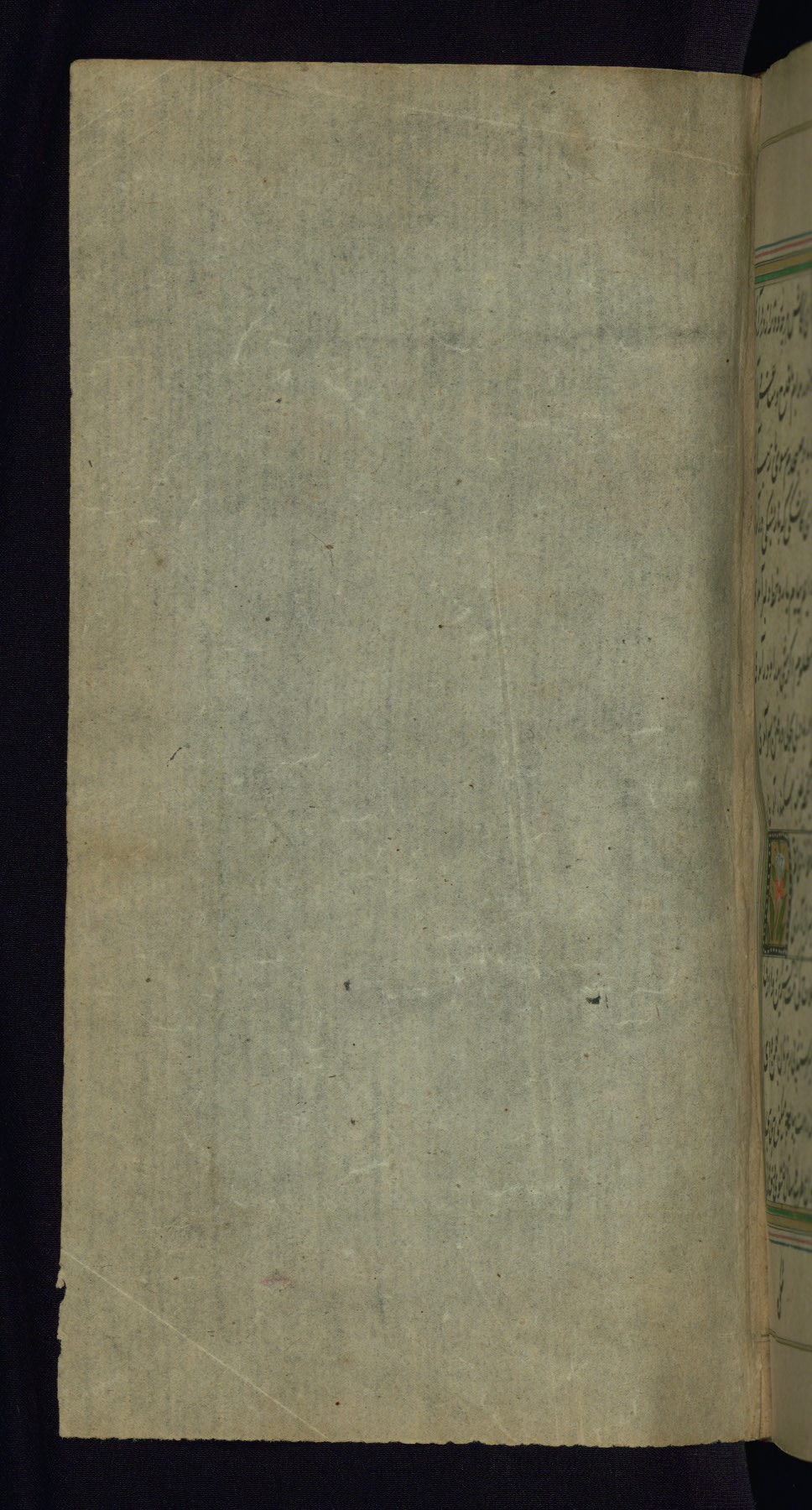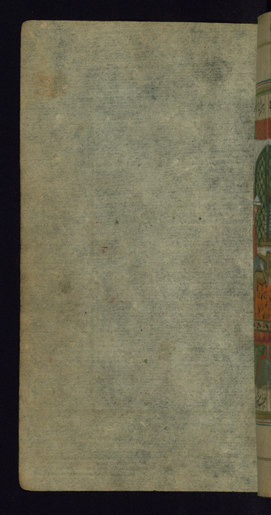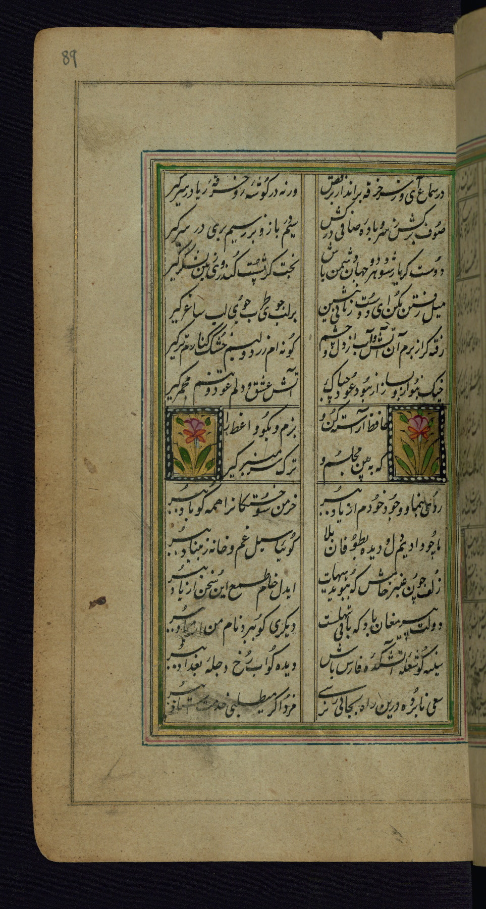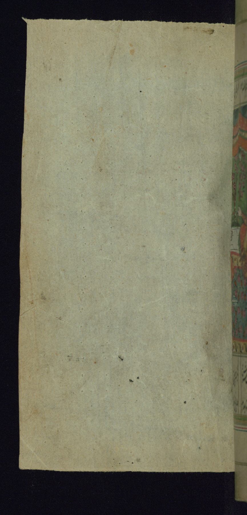 This is an illuminated and illustrated Collection of poems (dīvān) by Shams al-Dīn Muḥammad Ḥāfiz al-Shīrāzī (fl. eighth century AH / fourteenth CE), which was produced in India. According to the colophon, the manuscript was completed on the 19th Rajab 1202[?] AH / 1788[?] CE. It opens with a double-page illuminated incipit (fols. 1b-2a) with headpiece that introduces the preface (dībāchah) (fols. 1b-4b), followed by another double-page illuminated incipit with headpiece opening the main text of the Dīvān (fols. 5b-6a). The codex is decorated throughout with square and rectangular panels, as well as horizontal bands with floral decoration marking the end of odes, quatrains, or series of verses. There are forty-nine illustrations. The brown leather binding with medallion and pendants is contemporary with the manuscript.