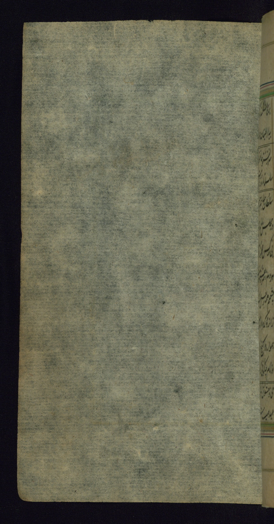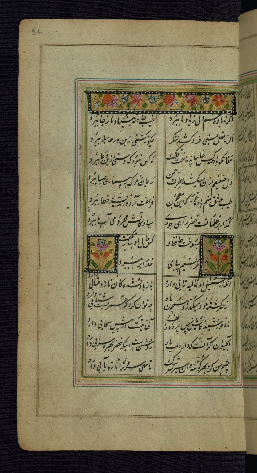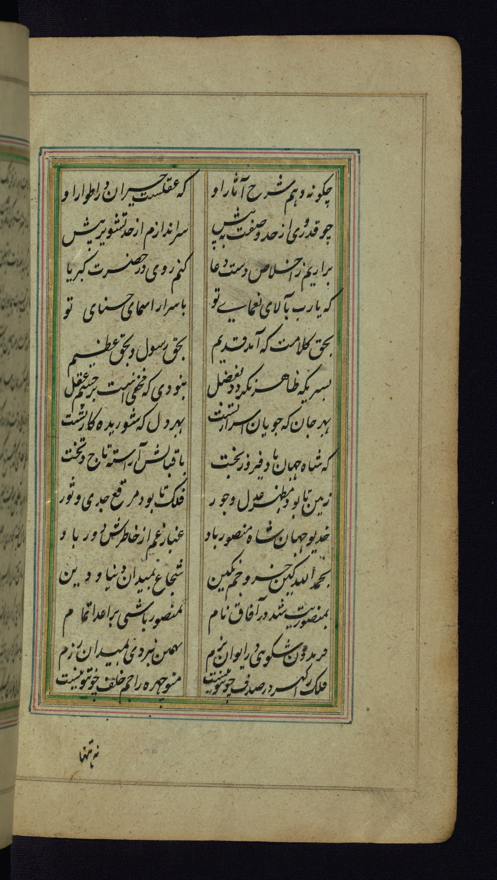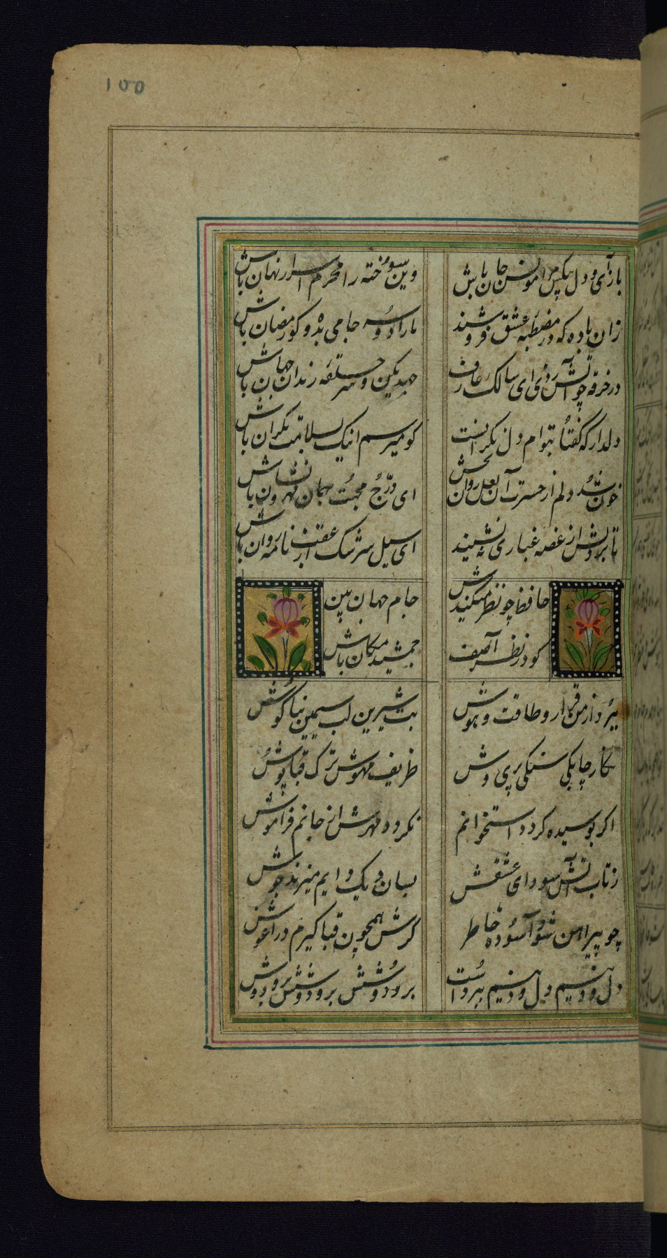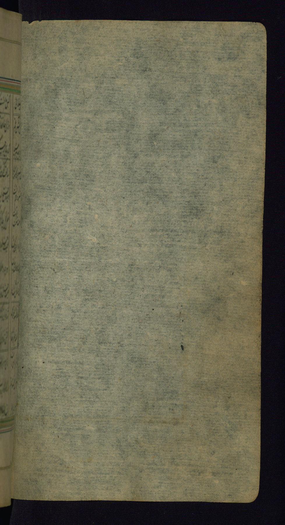 This is an illuminated and illustrated Collection of poems (dīvān) by Shams al-Dīn Muḥammad Ḥāfiz al-Shīrāzī (fl. eighth century AH / fourteenth CE), which was produced in India. According to the colophon, the manuscript was completed on the 19th Rajab 1202[?] AH / 1788[?] CE. It opens with a double-page illuminated incipit (fols. 1b-2a) with headpiece that introduces the preface (dībāchah) (fols. 1b-4b), followed by another double-page illuminated incipit with headpiece opening the main text of the Dīvān (fols. 5b-6a). The codex is decorated throughout with square and rectangular panels, as well as horizontal bands with floral decoration marking the end of odes, quatrains, or series of verses. There are forty-nine illustrations. The brown leather binding with medallion and pendants is contemporary with the manuscript.