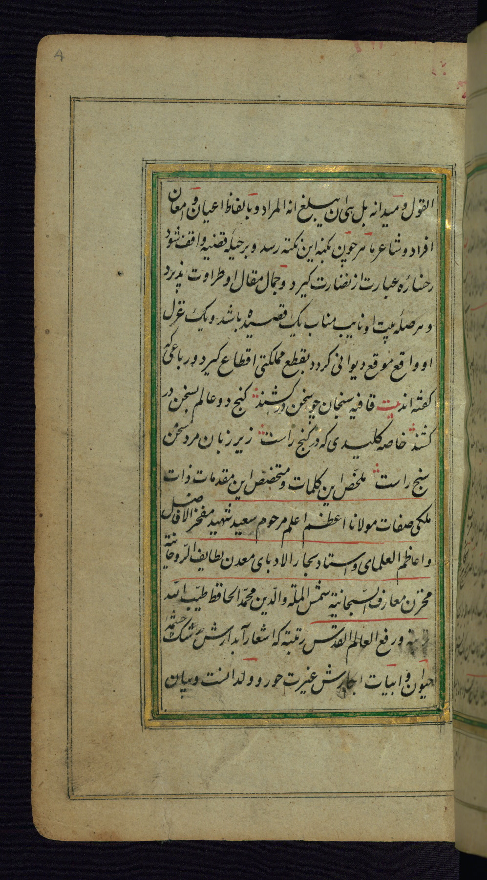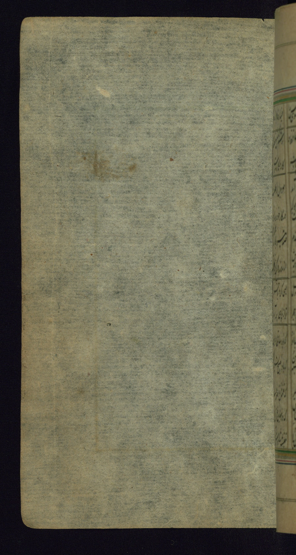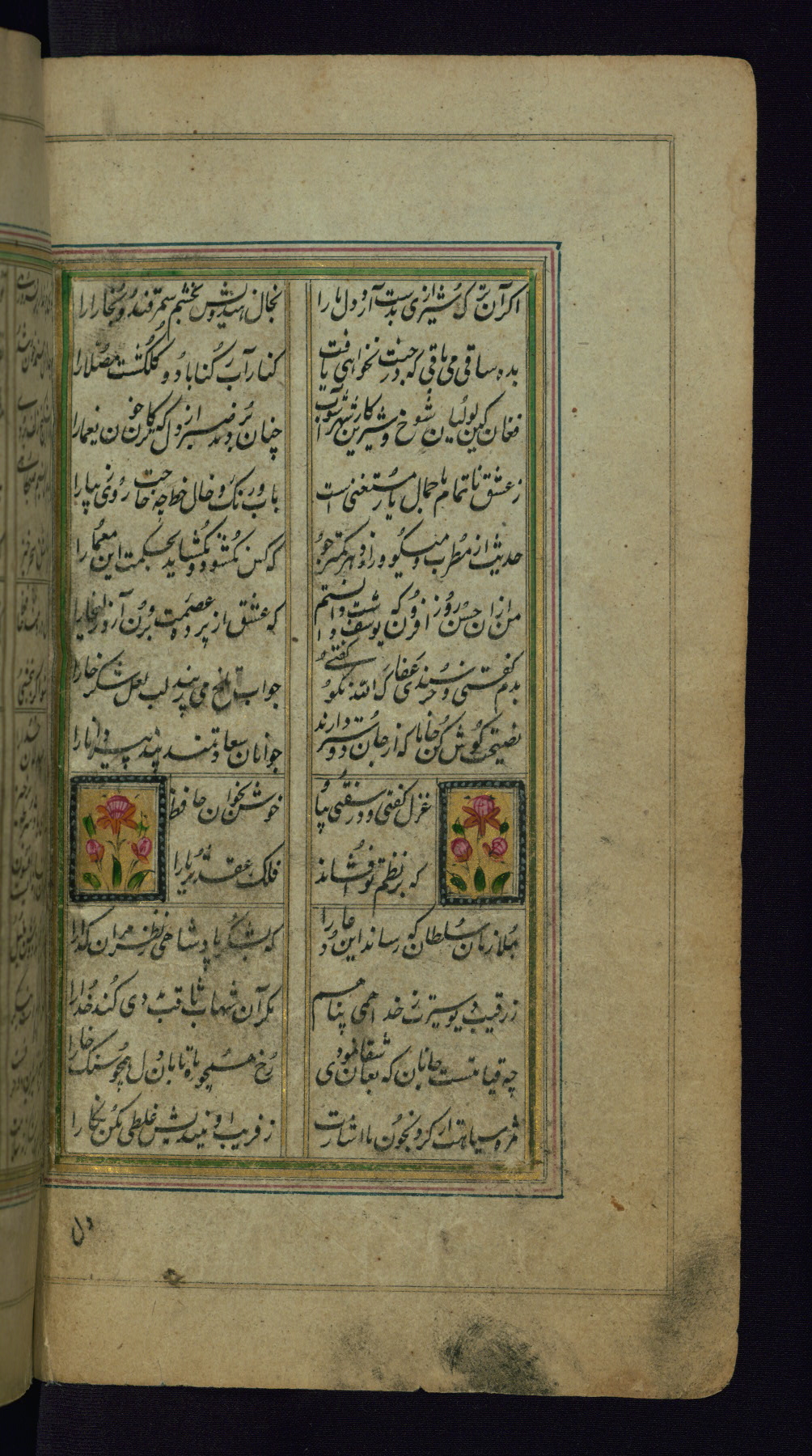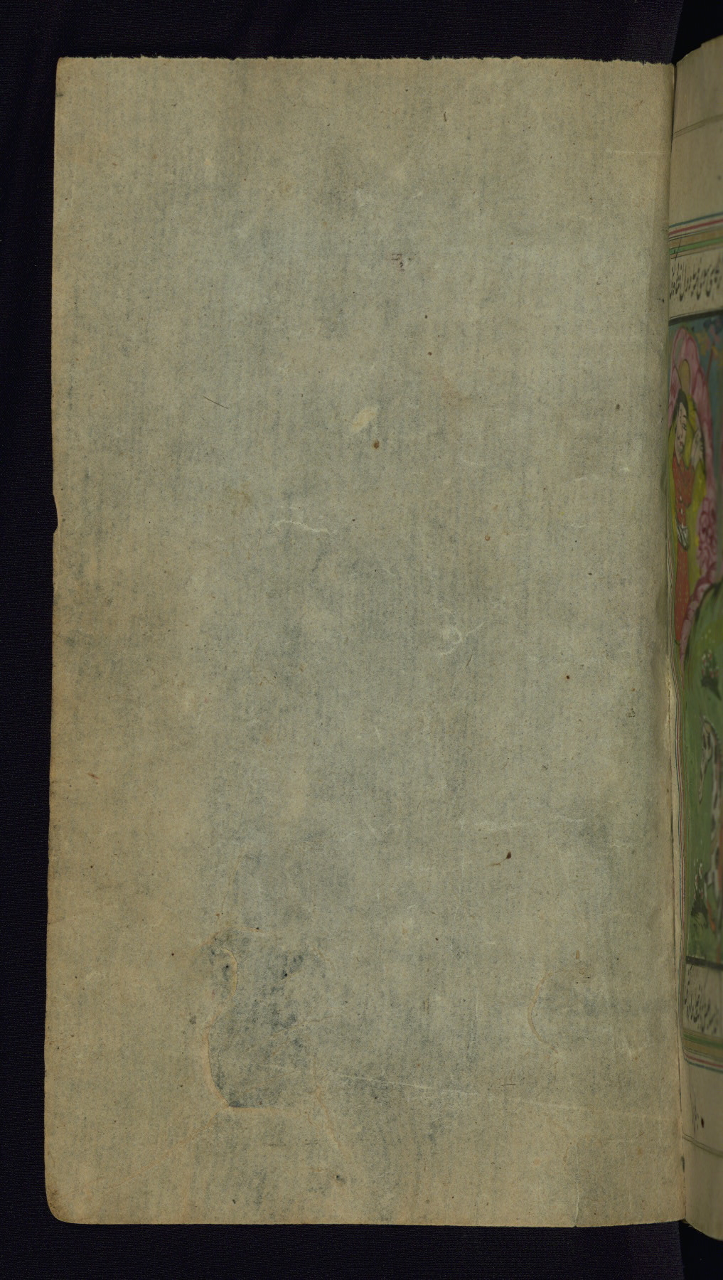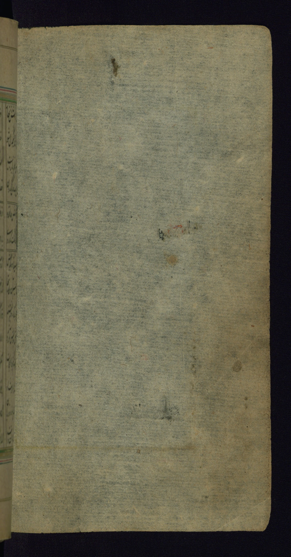 This is an illuminated and illustrated Collection of poems (dīvān) by Shams al-Dīn Muḥammad Ḥāfiz al-Shīrāzī (fl. eighth century AH / fourteenth CE), which was produced in India. According to the colophon, the manuscript was completed on the 19th Rajab 1202[?] AH / 1788[?] CE. It opens with a double-page illuminated incipit (fols. 1b-2a) with headpiece that introduces the preface (dībāchah) (fols. 1b-4b), followed by another double-page illuminated incipit with headpiece opening the main text of the Dīvān (fols. 5b-6a). The codex is decorated throughout with square and rectangular panels, as well as horizontal bands with floral decoration marking the end of odes, quatrains, or series of verses. There are forty-nine illustrations. The brown leather binding with medallion and pendants is contemporary with the manuscript.