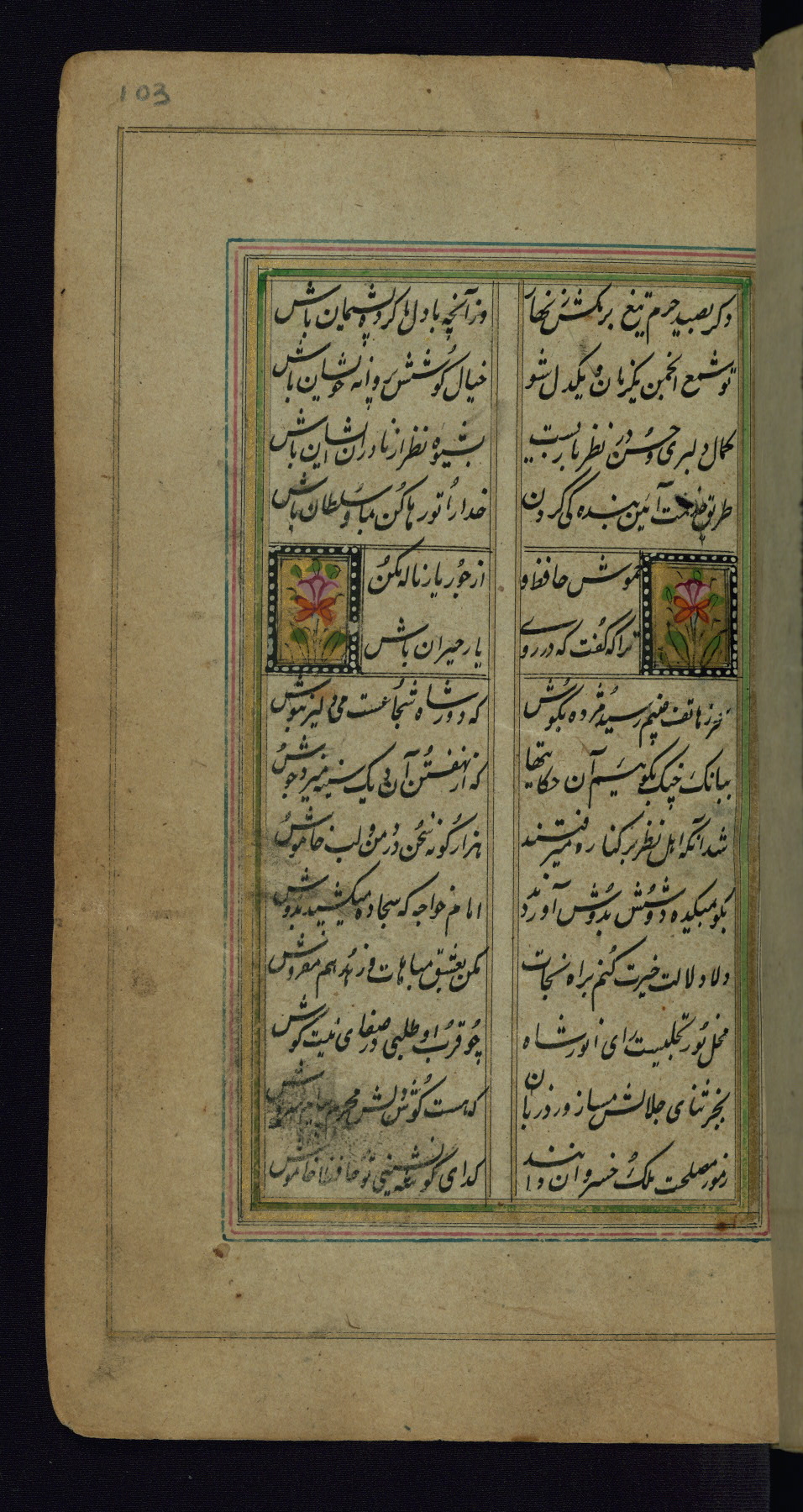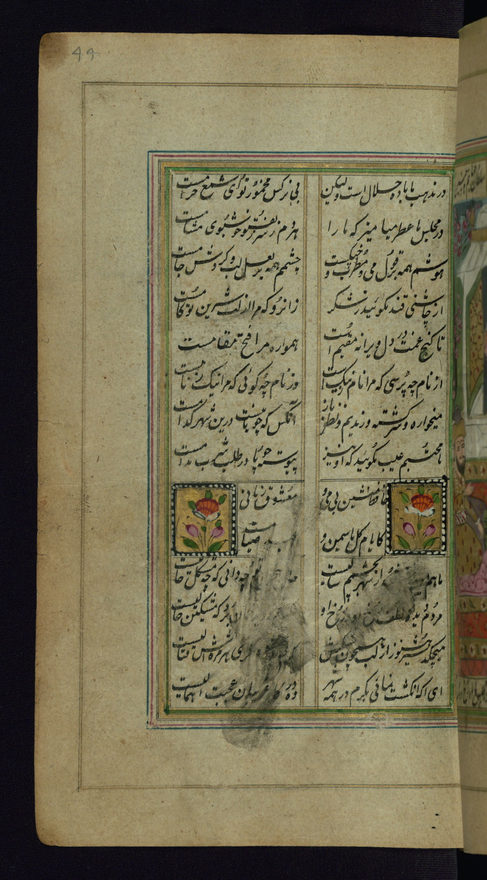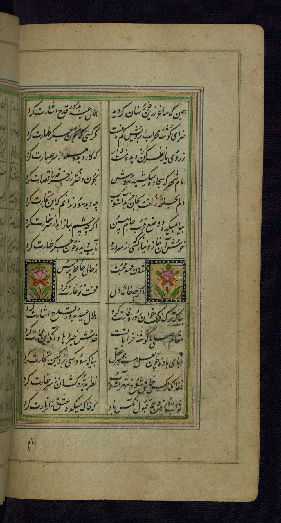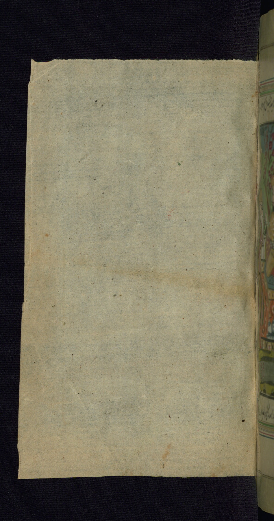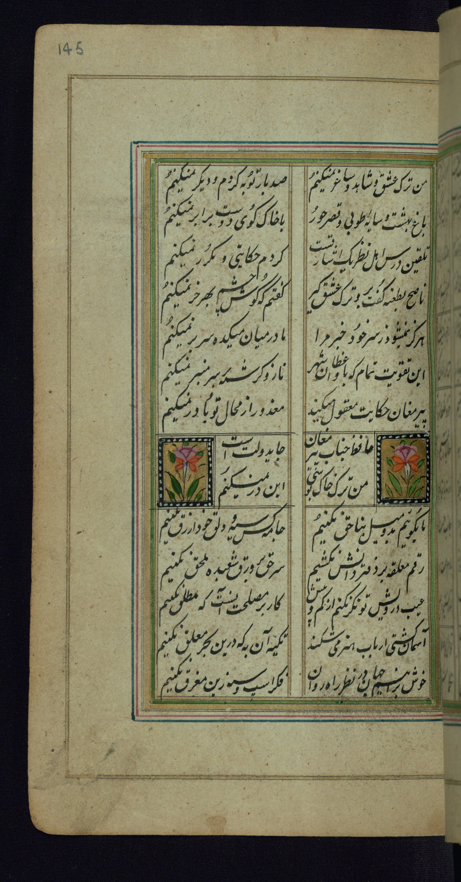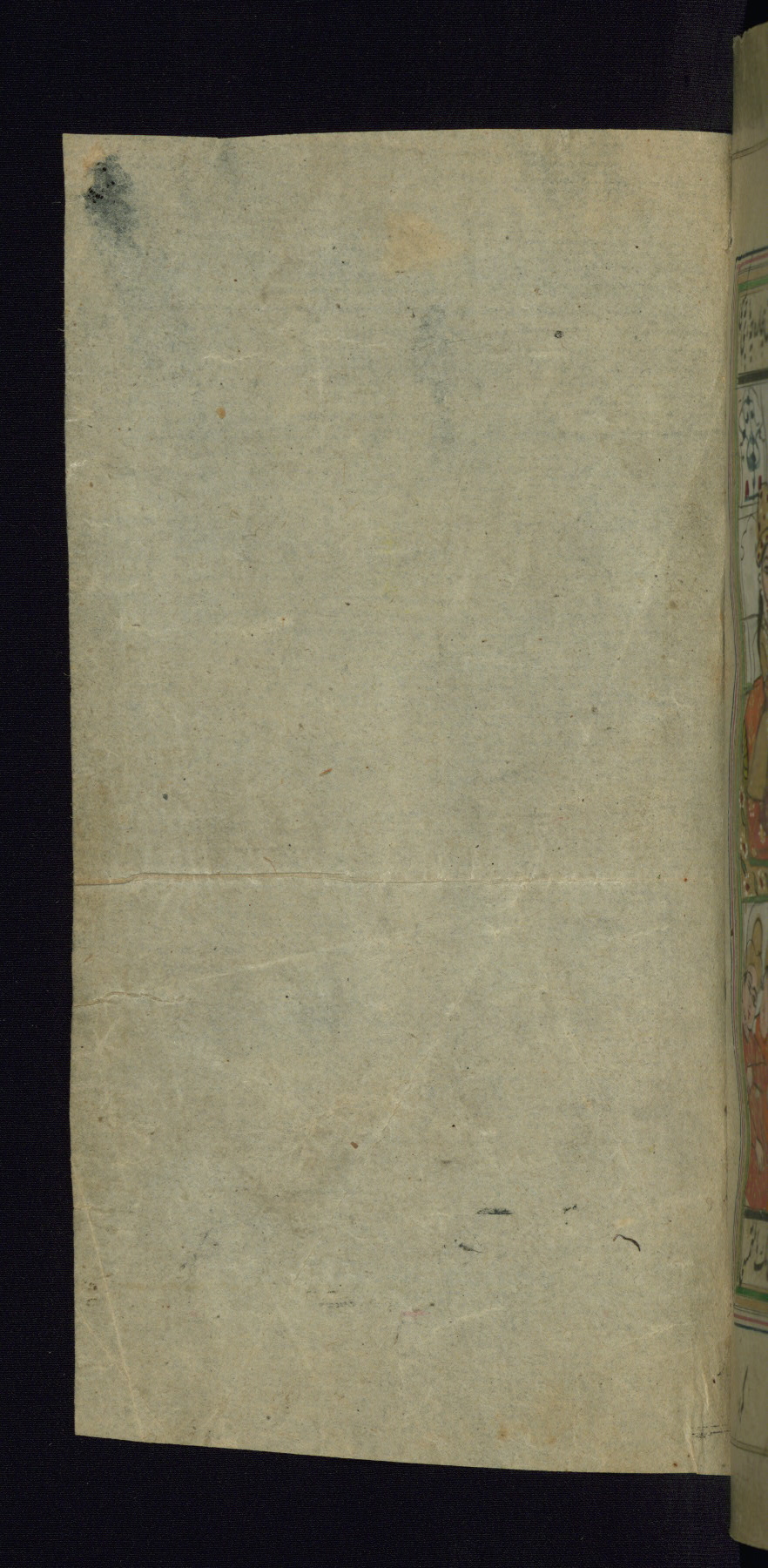 This is an illuminated and illustrated Collection of poems (dīvān) by Shams al-Dīn Muḥammad Ḥāfiz al-Shīrāzī (fl. eighth century AH / fourteenth CE), which was produced in India. According to the colophon, the manuscript was completed on the 19th Rajab 1202[?] AH / 1788[?] CE. It opens with a double-page illuminated incipit (fols. 1b-2a) with headpiece that introduces the preface (dībāchah) (fols. 1b-4b), followed by another double-page illuminated incipit with headpiece opening the main text of the Dīvān (fols. 5b-6a). The codex is decorated throughout with square and rectangular panels, as well as horizontal bands with floral decoration marking the end of odes, quatrains, or series of verses. There are forty-nine illustrations. The brown leather binding with medallion and pendants is contemporary with the manuscript.