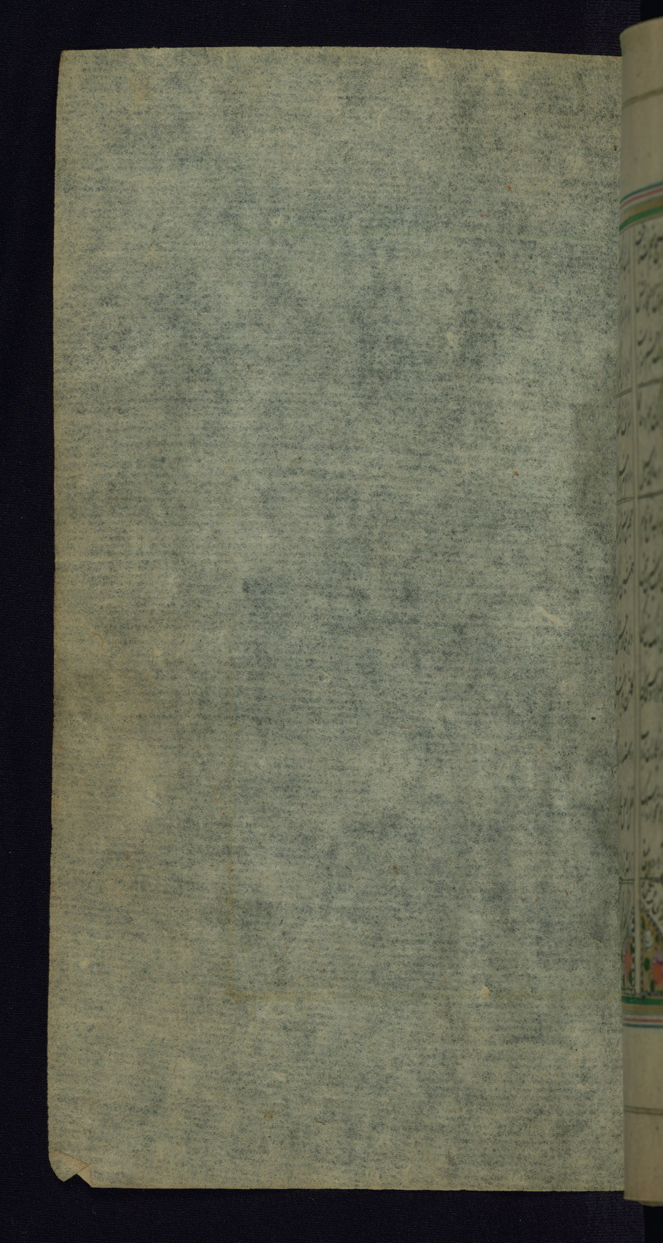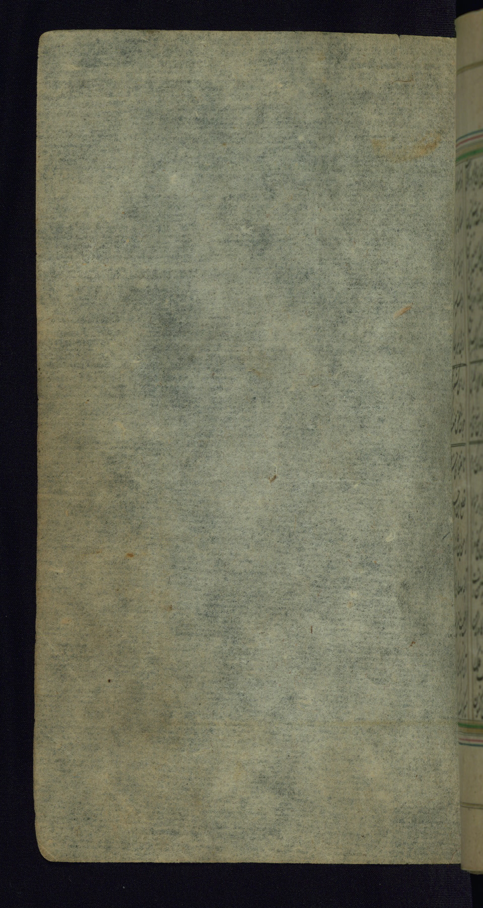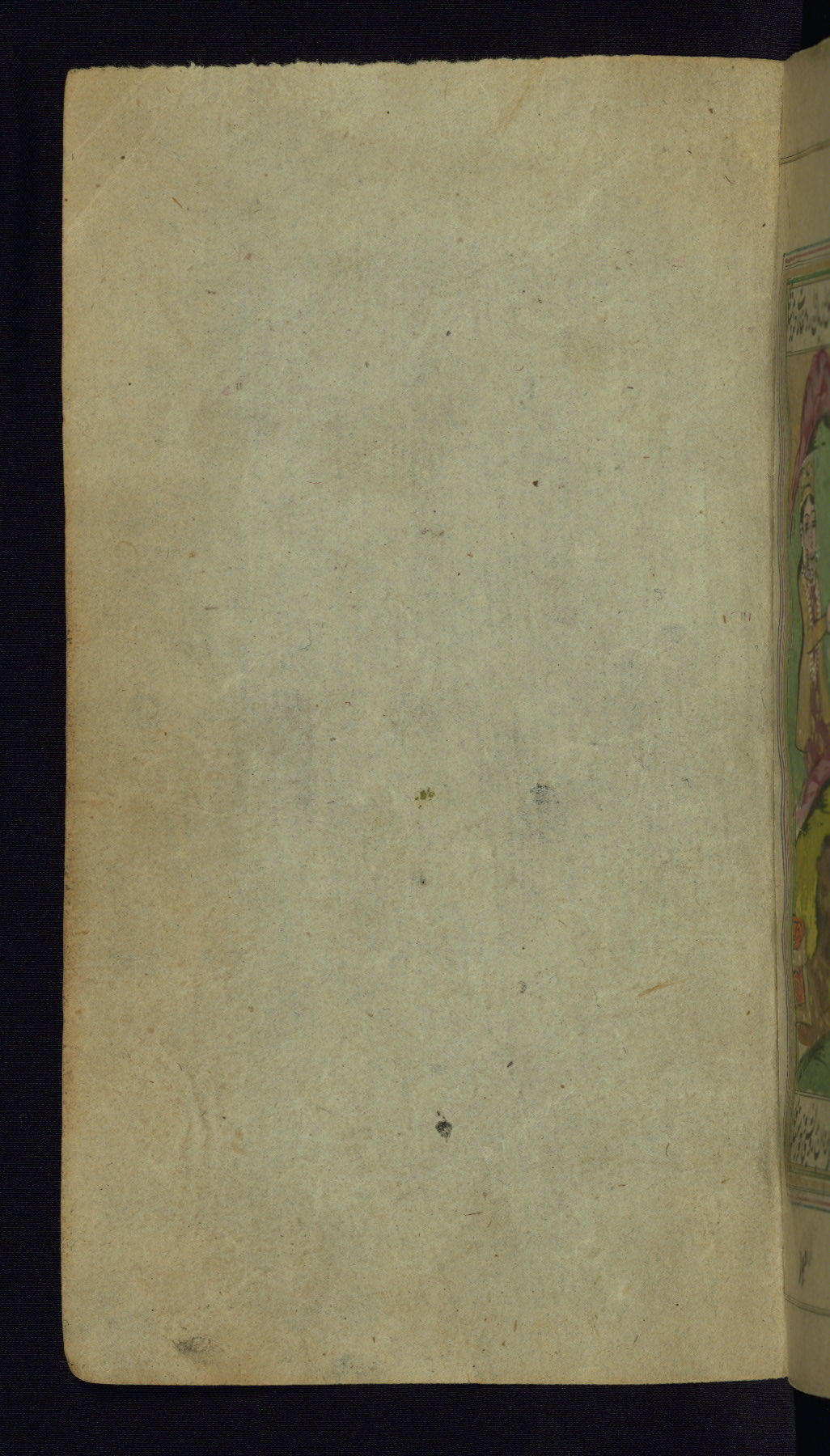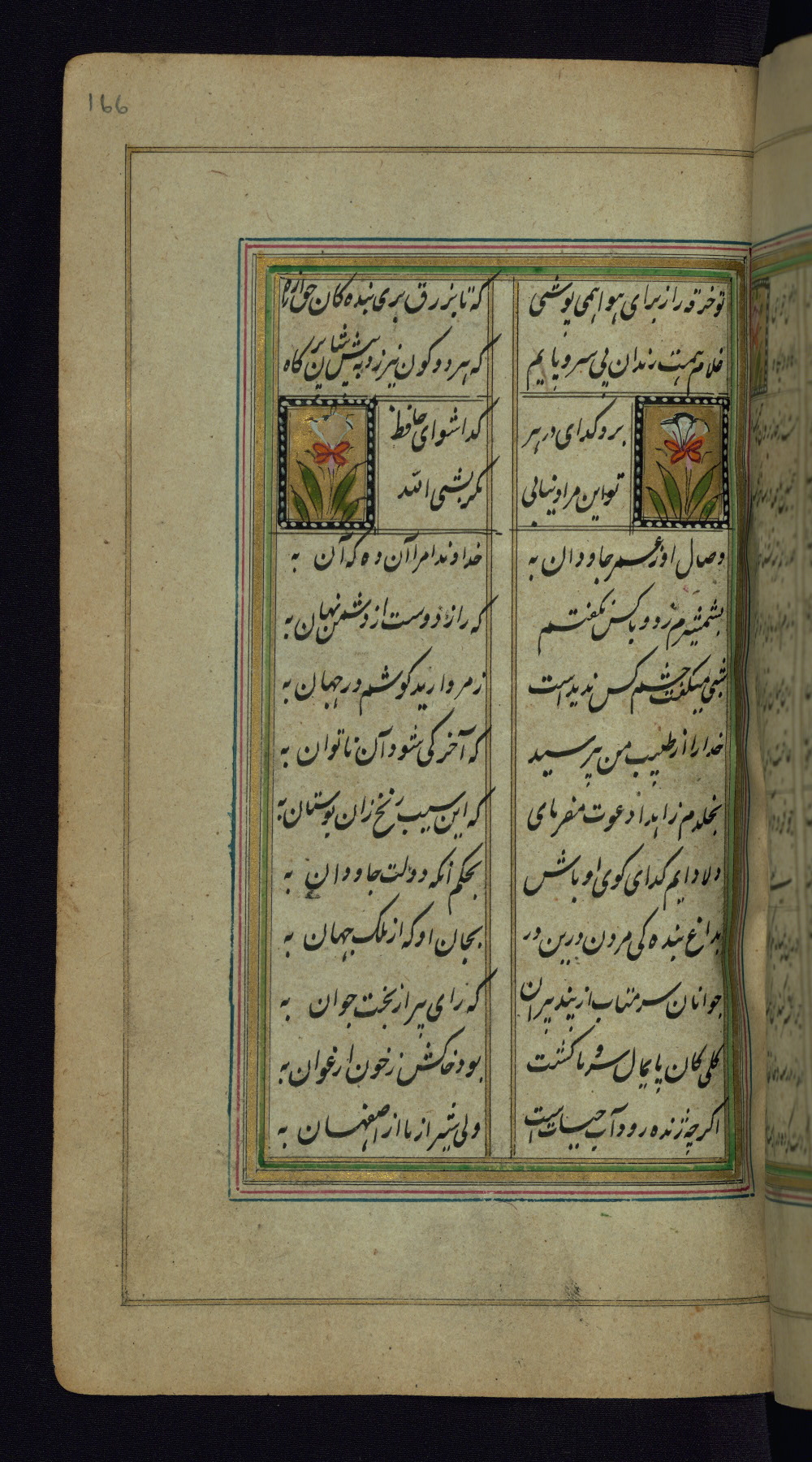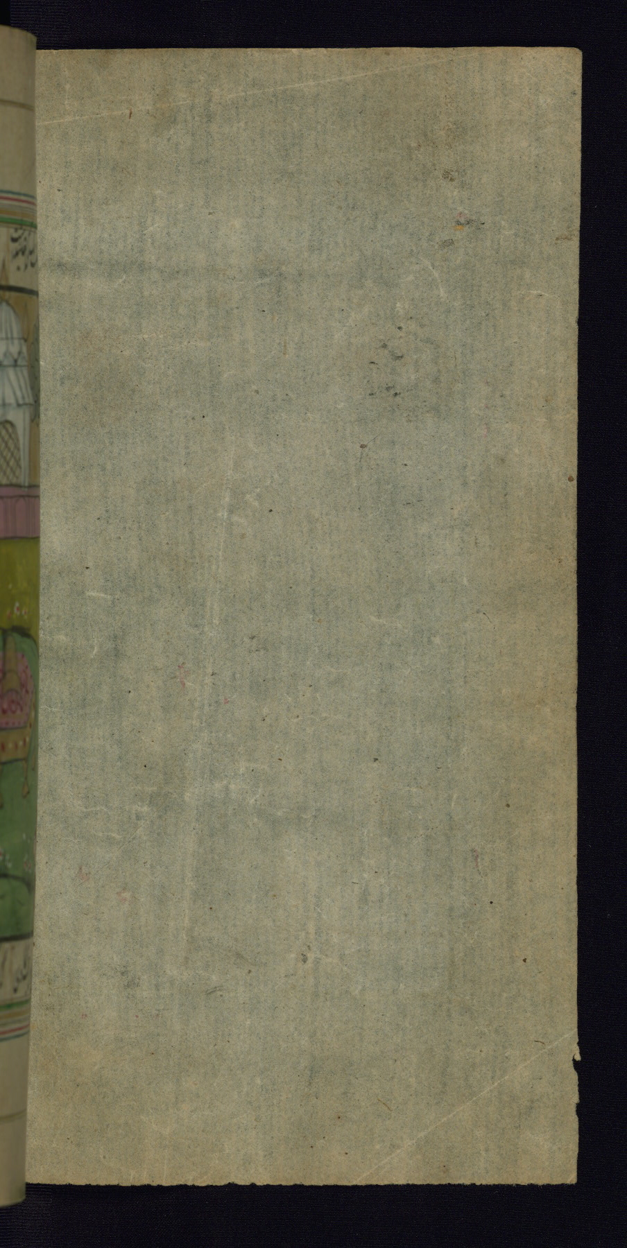This is an illuminated and illustrated Collection of poems (dīvān) by Shams al-Dīn Muḥammad Ḥāfiz al-Shīrāzī (fl. eighth century AH / fourteenth CE), which was produced in India. According to the colophon, the manuscript was completed on the 19th Rajab 1202[?] AH / 1788[?] CE. It opens with a double-page illuminated incipit (fols. 1b-2a) with headpiece that introduces the preface (dībāchah) (fols. 1b-4b), followed by another double-page illuminated incipit with headpiece opening the main text of the Dīvān (fols. 5b-6a). The codex is decorated throughout with square and rectangular panels, as well as horizontal bands with floral decoration marking the end of odes, quatrains, or series of verses. There are forty-nine illustrations. The brown leather binding with medallion and pendants is contemporary with the manuscript.
