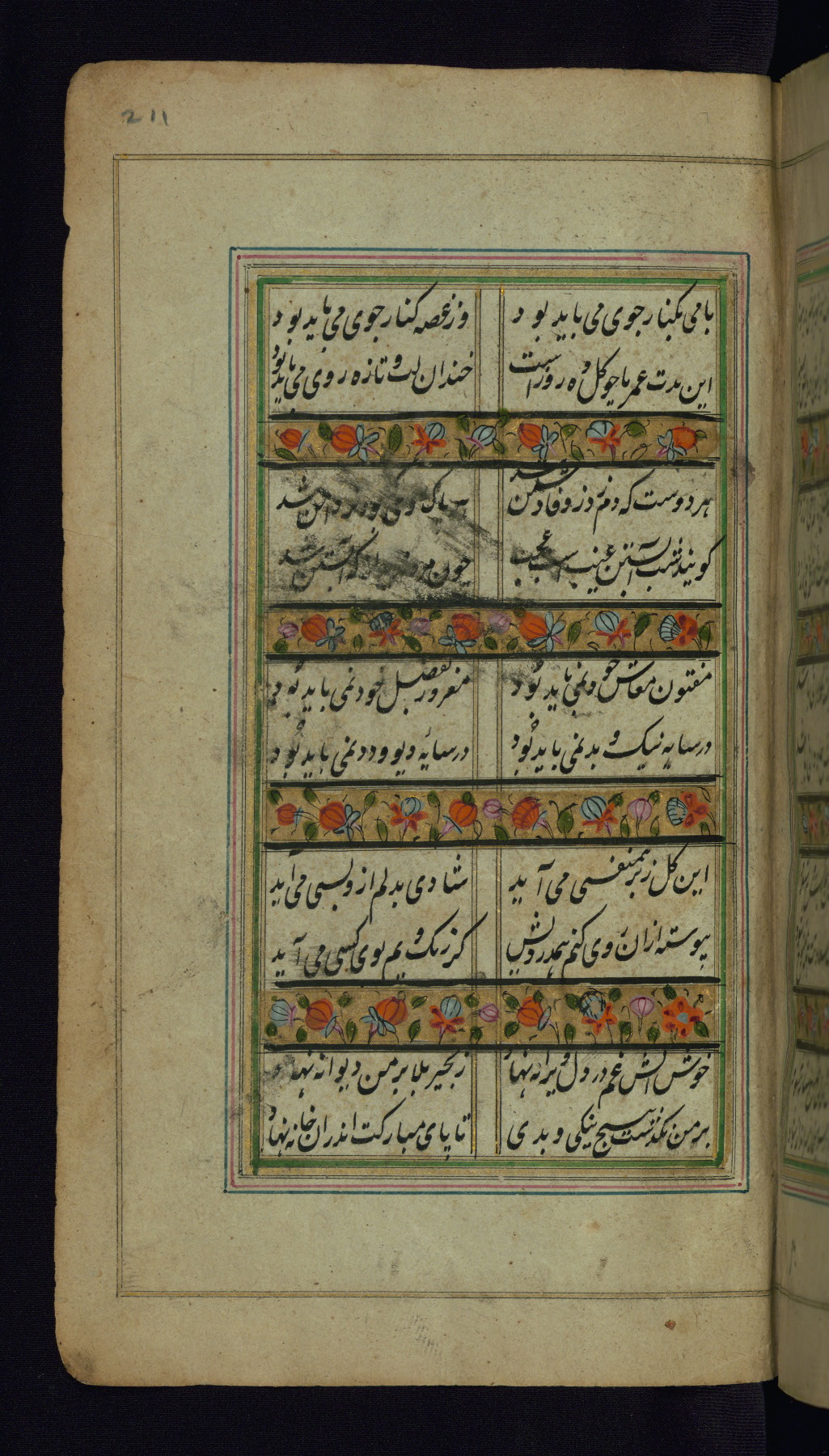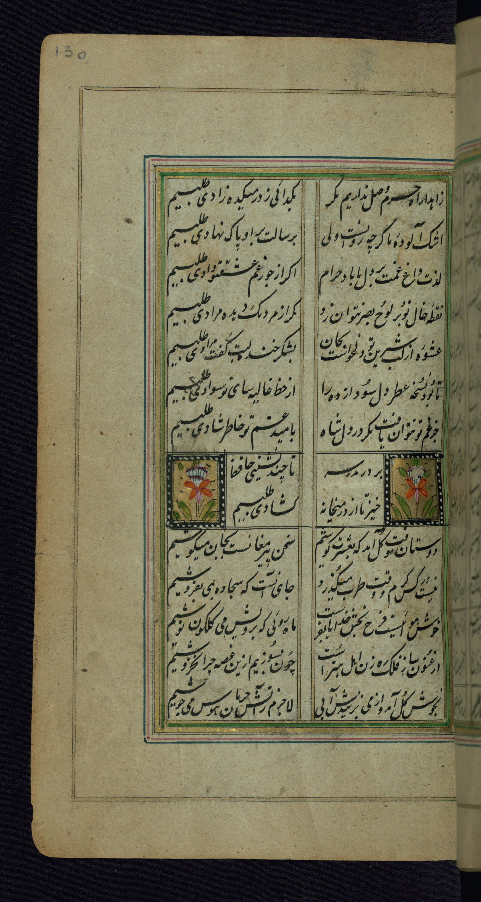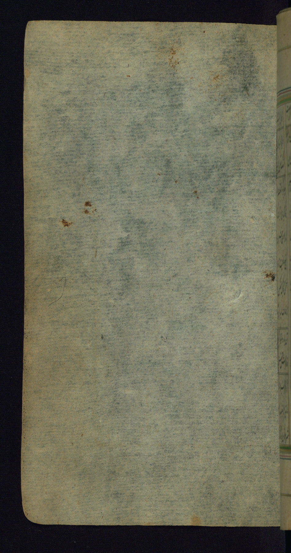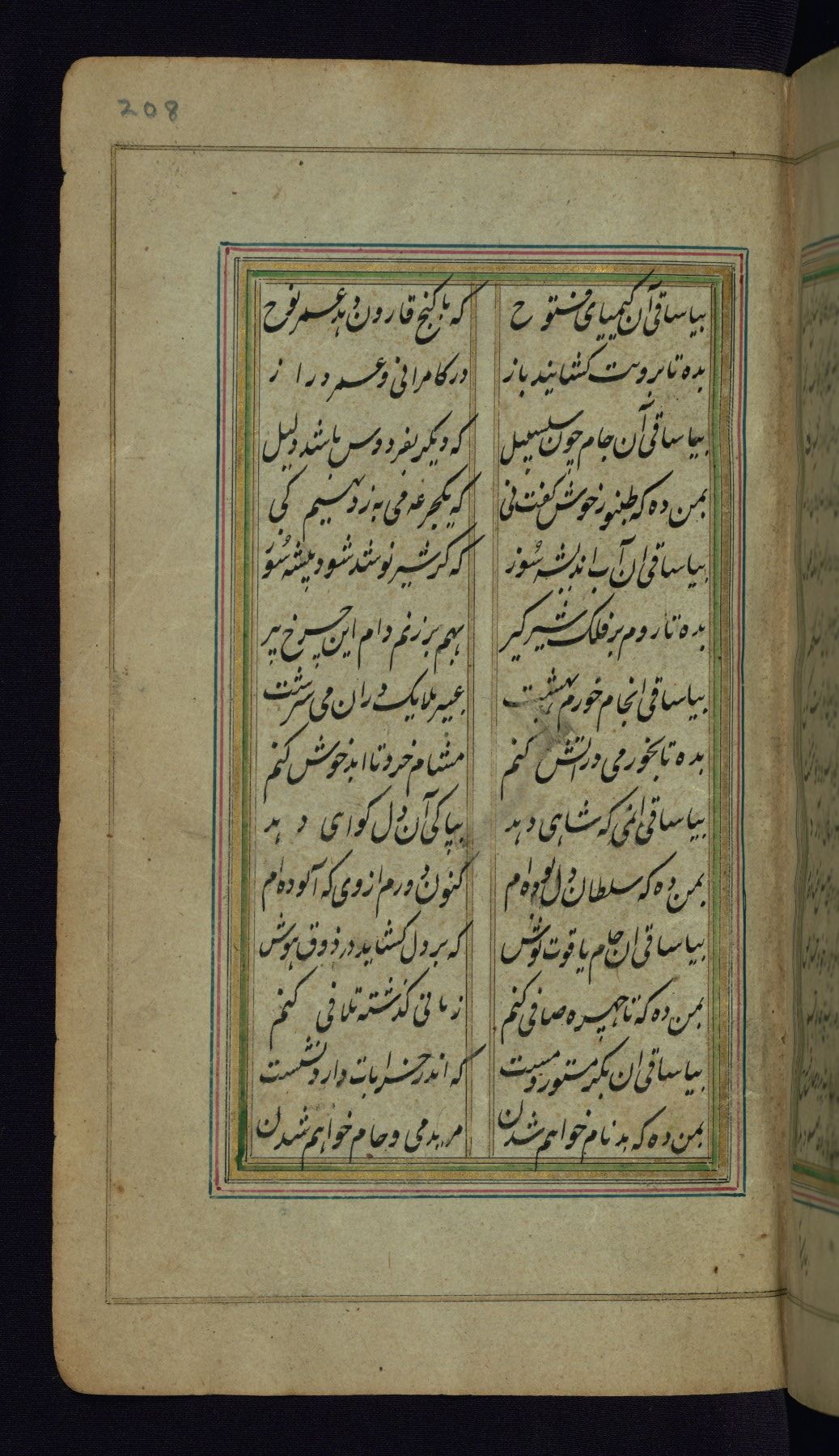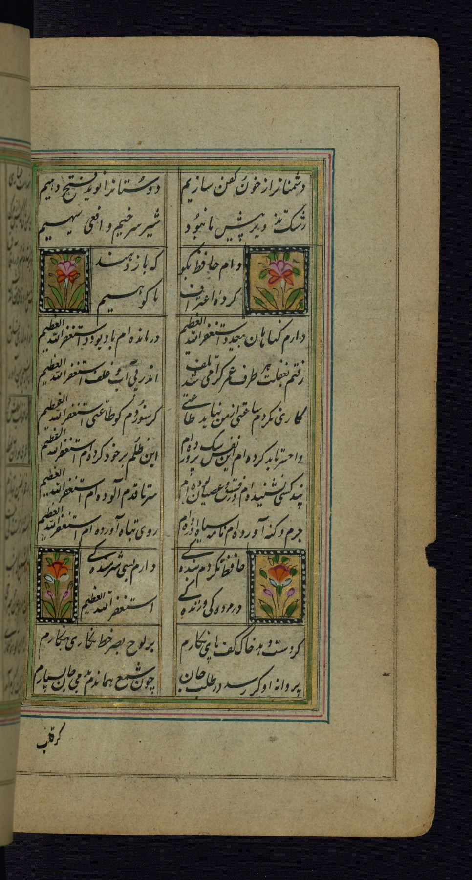 This is an illuminated and illustrated Collection of poems (dīvān) by Shams al-Dīn Muḥammad Ḥāfiz al-Shīrāzī (fl. eighth century AH / fourteenth CE), which was produced in India. According to the colophon, the manuscript was completed on the 19th Rajab 1202[?] AH / 1788[?] CE. It opens with a double-page illuminated incipit (fols. 1b-2a) with headpiece that introduces the preface (dībāchah) (fols. 1b-4b), followed by another double-page illuminated incipit with headpiece opening the main text of the Dīvān (fols. 5b-6a). The codex is decorated throughout with square and rectangular panels, as well as horizontal bands with floral decoration marking the end of odes, quatrains, or series of verses. There are forty-nine illustrations. The brown leather binding with medallion and pendants is contemporary with the manuscript.