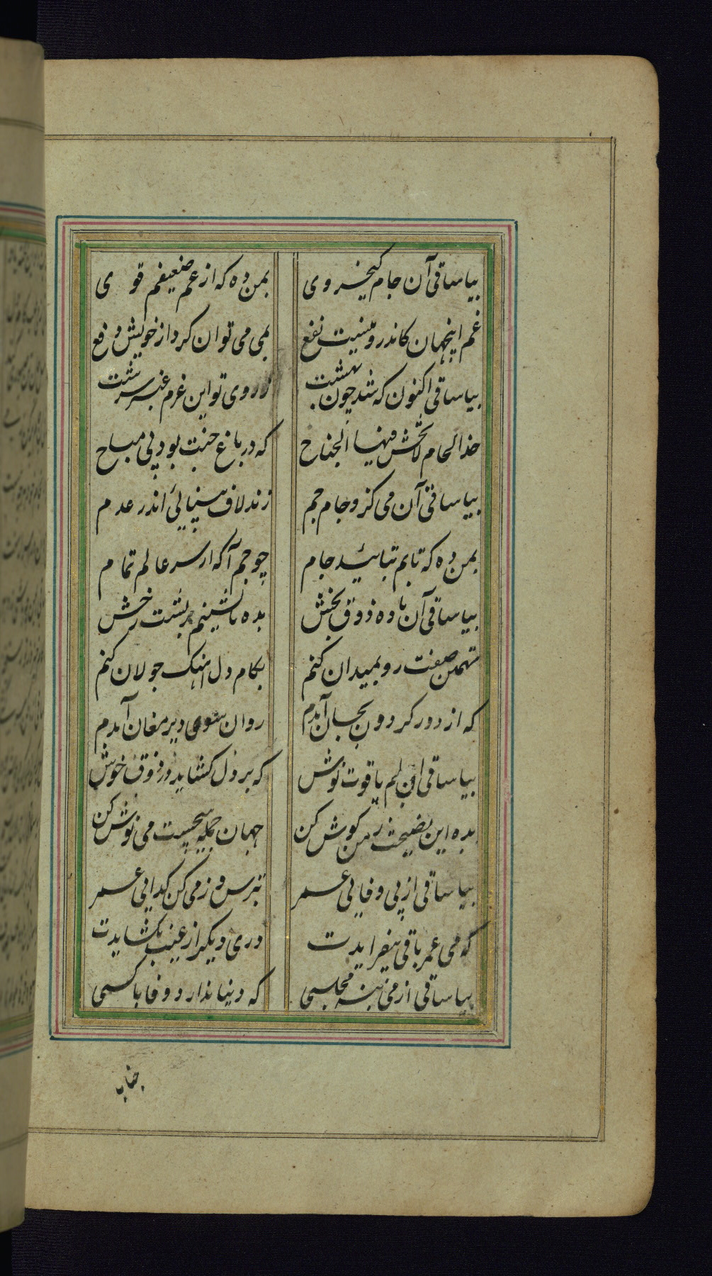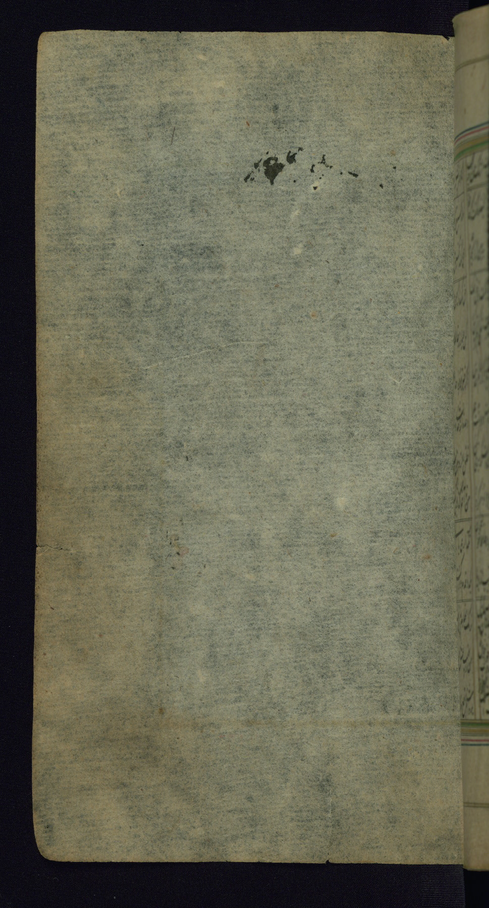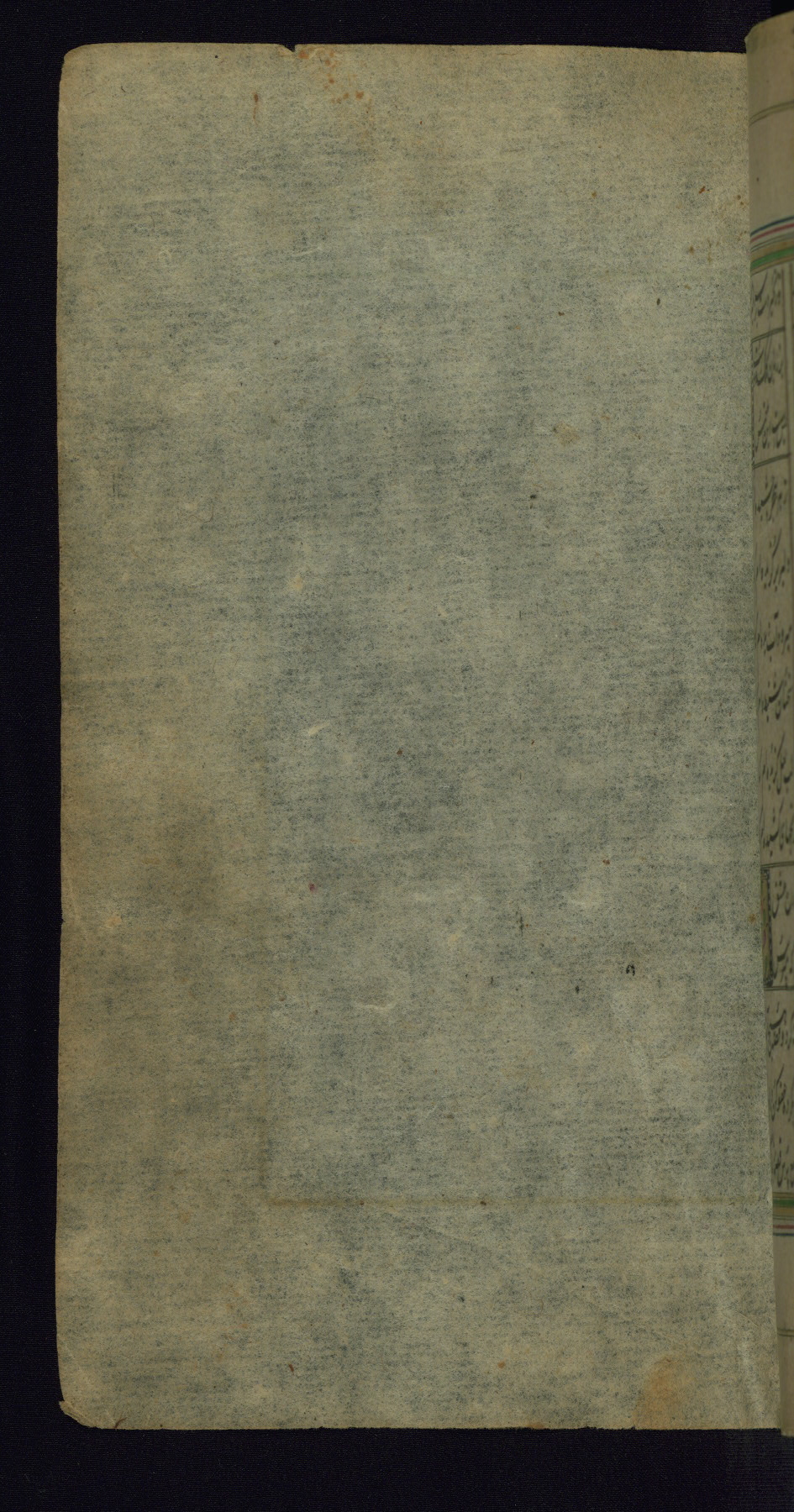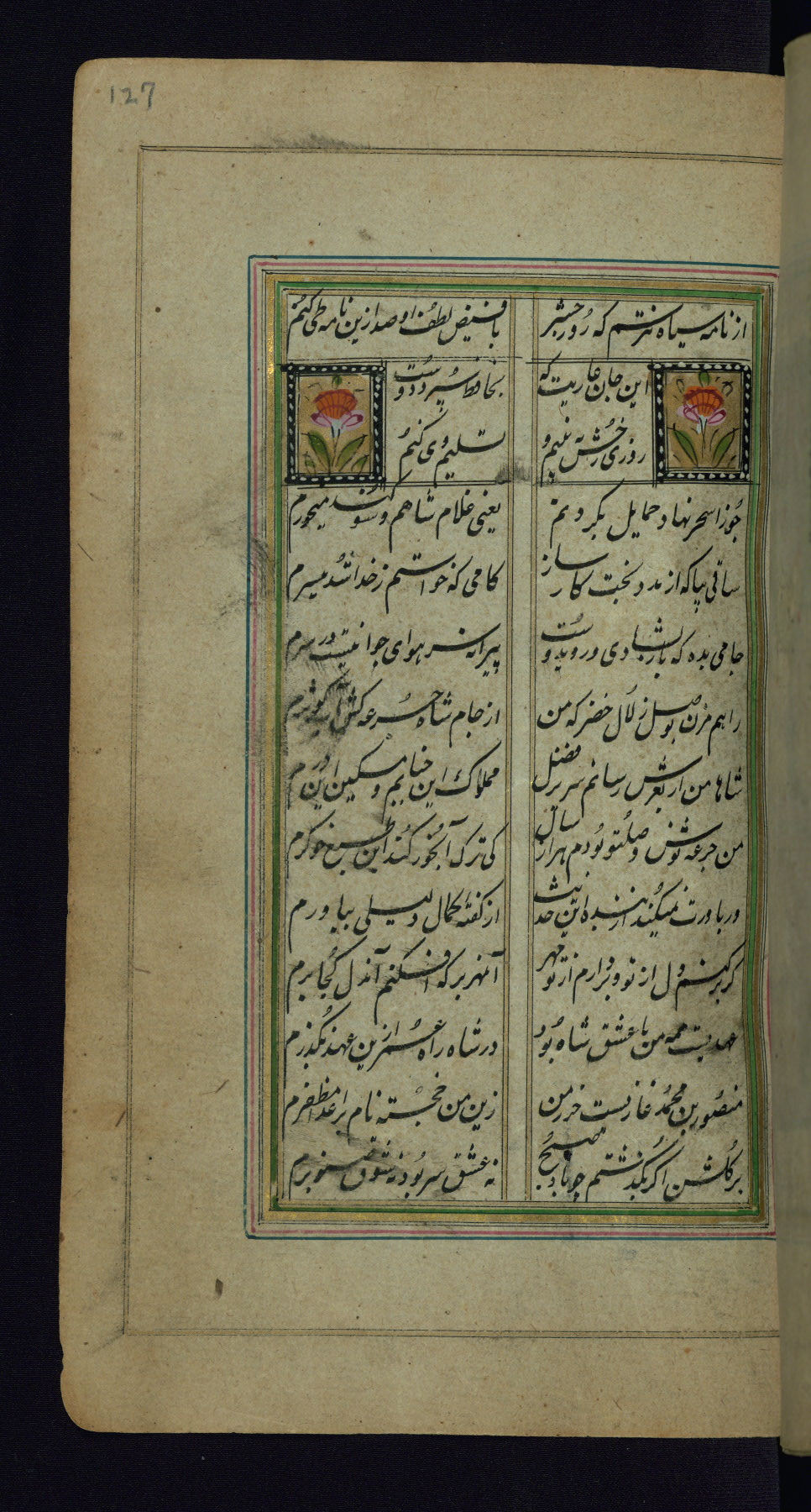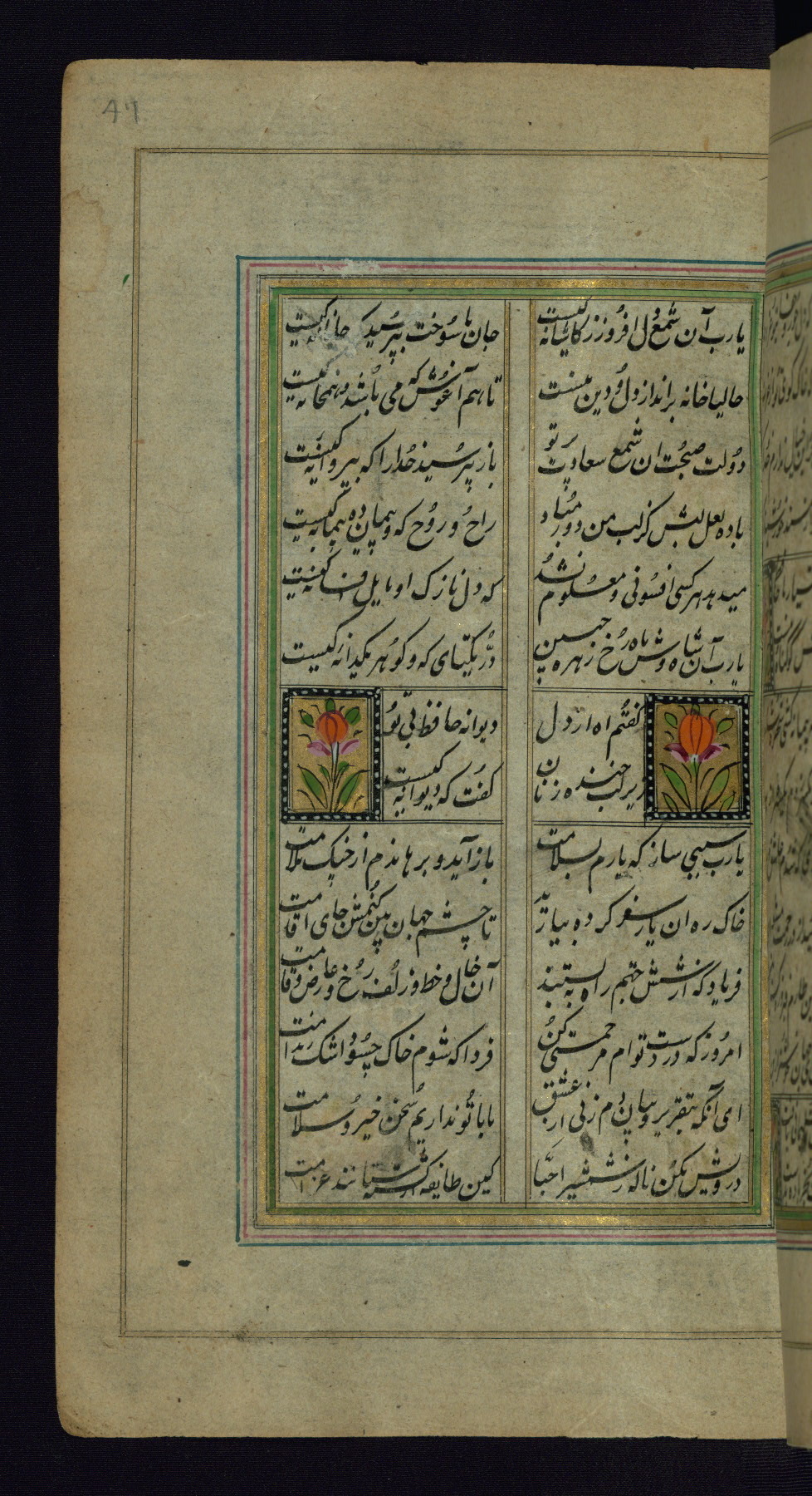 This is an illuminated and illustrated Collection of poems (dīvān) by Shams al-Dīn Muḥammad Ḥāfiz al-Shīrāzī (fl. eighth century AH / fourteenth CE), which was produced in India. According to the colophon, the manuscript was completed on the 19th Rajab 1202[?] AH / 1788[?] CE. It opens with a double-page illuminated incipit (fols. 1b-2a) with headpiece that introduces the preface (dībāchah) (fols. 1b-4b), followed by another double-page illuminated incipit with headpiece opening the main text of the Dīvān (fols. 5b-6a). The codex is decorated throughout with square and rectangular panels, as well as horizontal bands with floral decoration marking the end of odes, quatrains, or series of verses. There are forty-nine illustrations. The brown leather binding with medallion and pendants is contemporary with the manuscript.