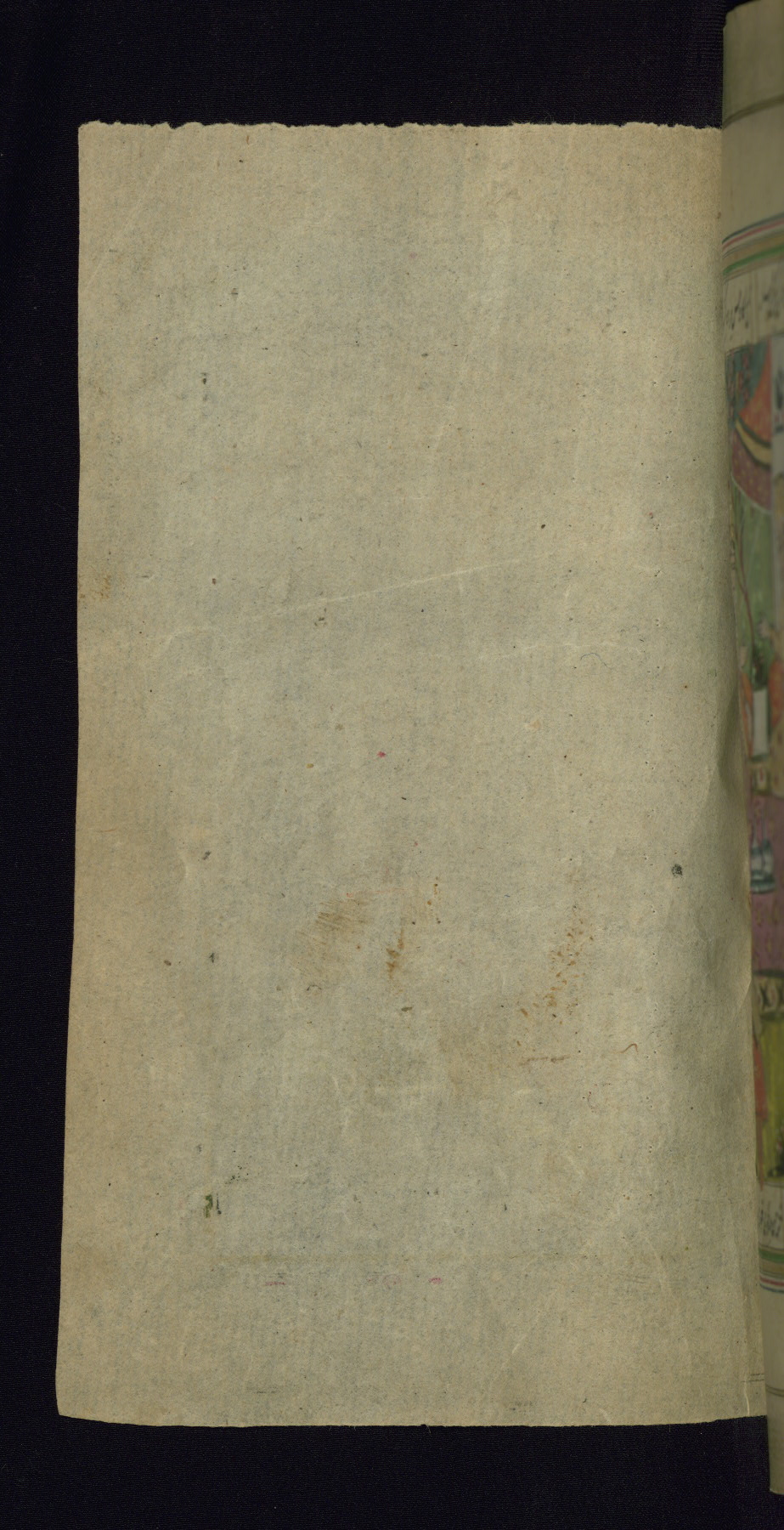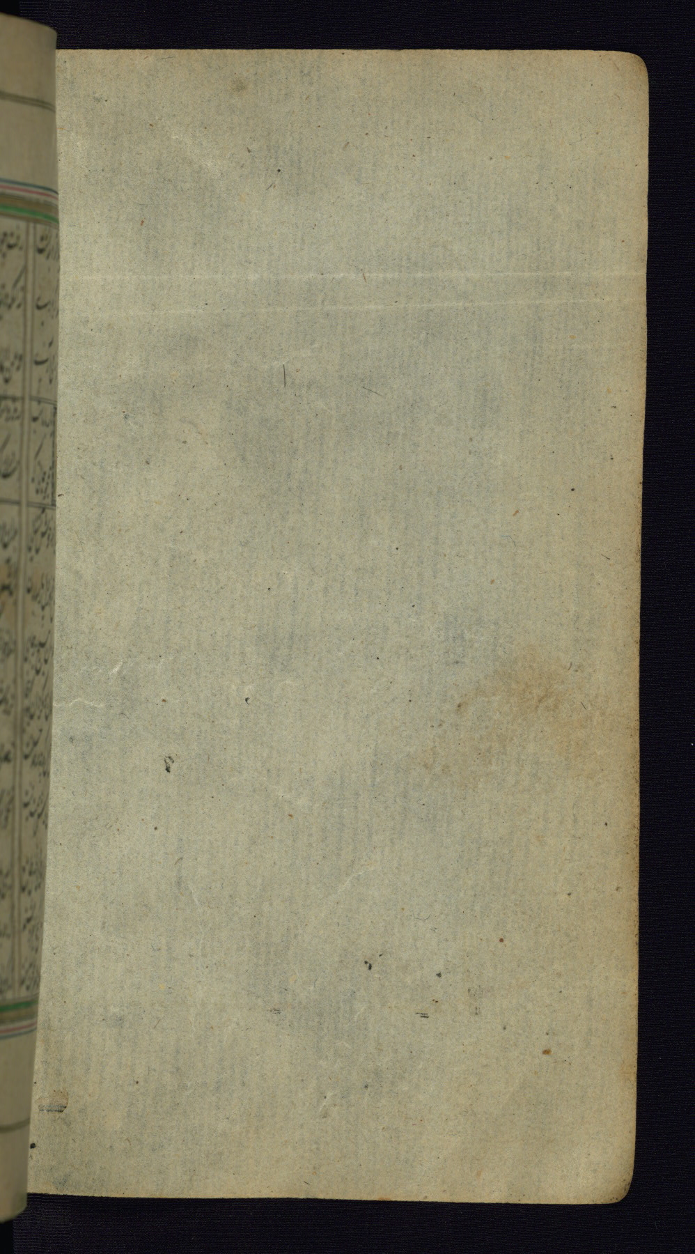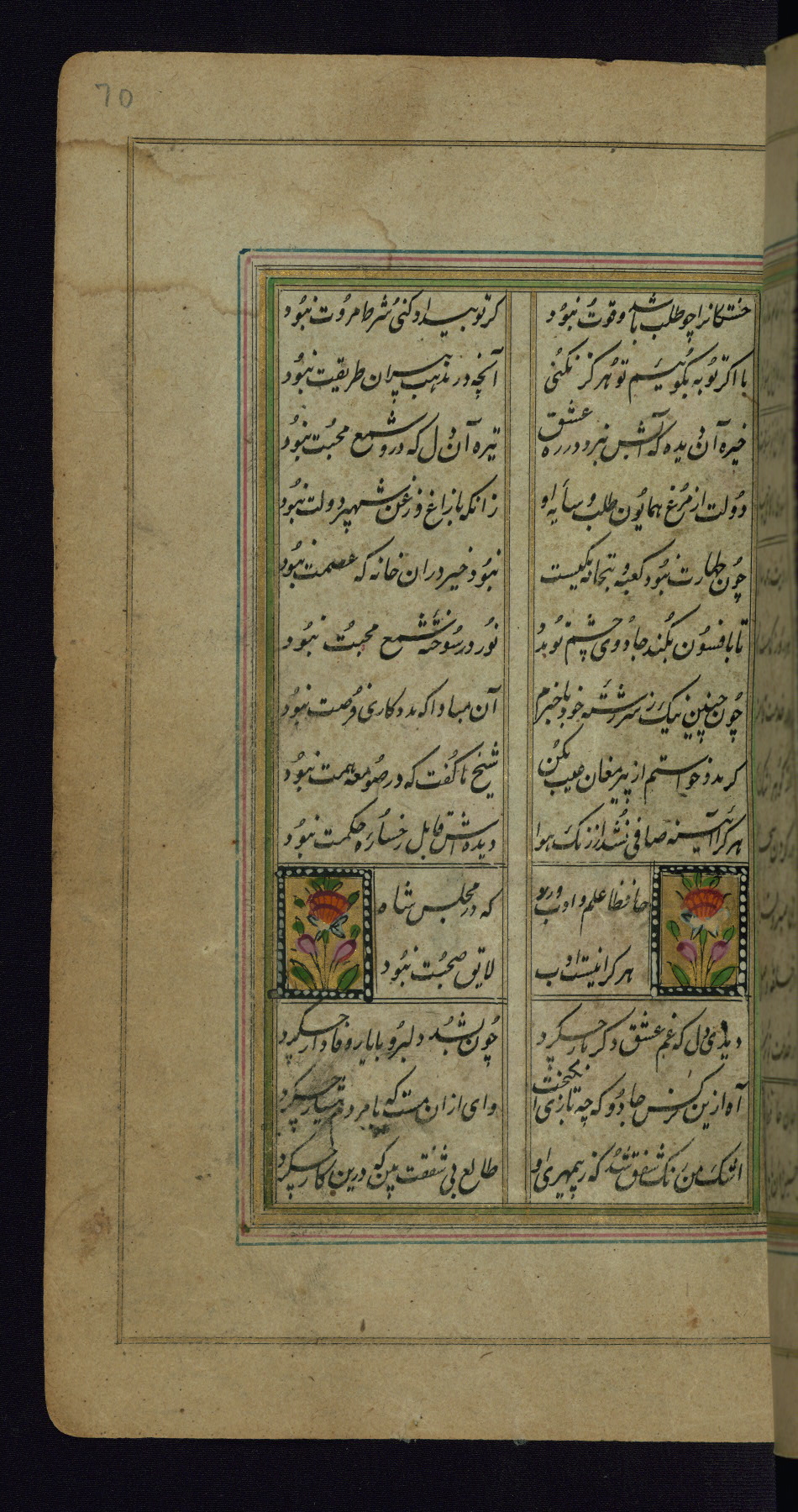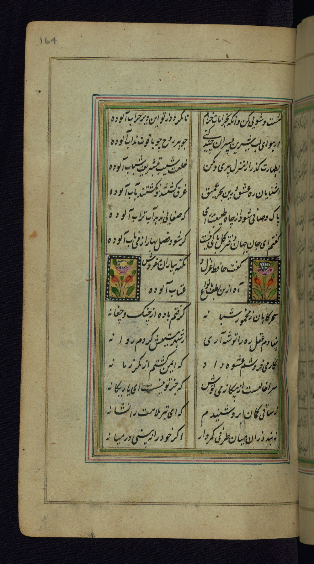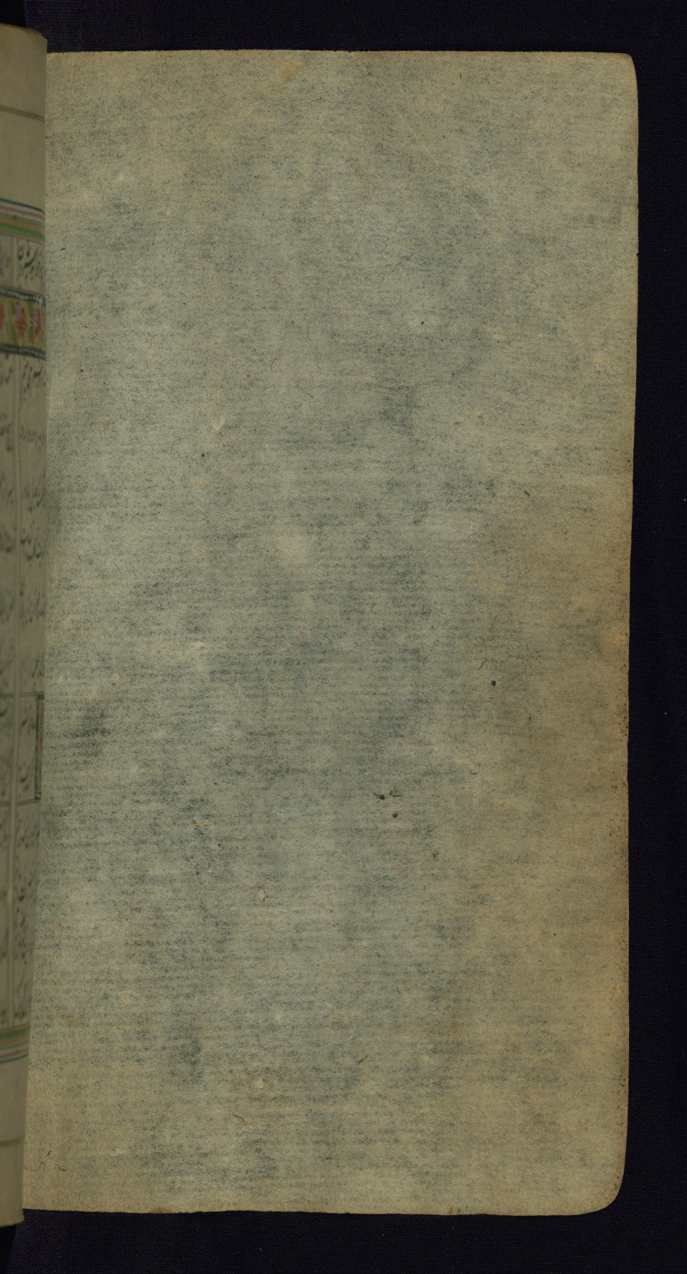 This is an illuminated and illustrated Collection of poems (dīvān) by Shams al-Dīn Muḥammad Ḥāfiz al-Shīrāzī (fl. eighth century AH / fourteenth CE), which was produced in India. According to the colophon, the manuscript was completed on the 19th Rajab 1202[?] AH / 1788[?] CE. It opens with a double-page illuminated incipit (fols. 1b-2a) with headpiece that introduces the preface (dībāchah) (fols. 1b-4b), followed by another double-page illuminated incipit with headpiece opening the main text of the Dīvān (fols. 5b-6a). The codex is decorated throughout with square and rectangular panels, as well as horizontal bands with floral decoration marking the end of odes, quatrains, or series of verses. There are forty-nine illustrations. The brown leather binding with medallion and pendants is contemporary with the manuscript.