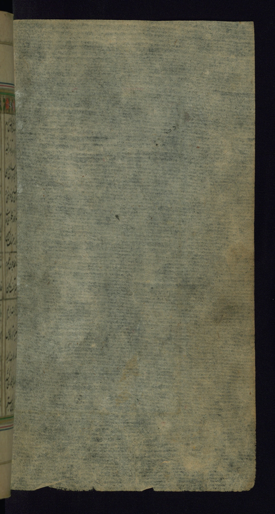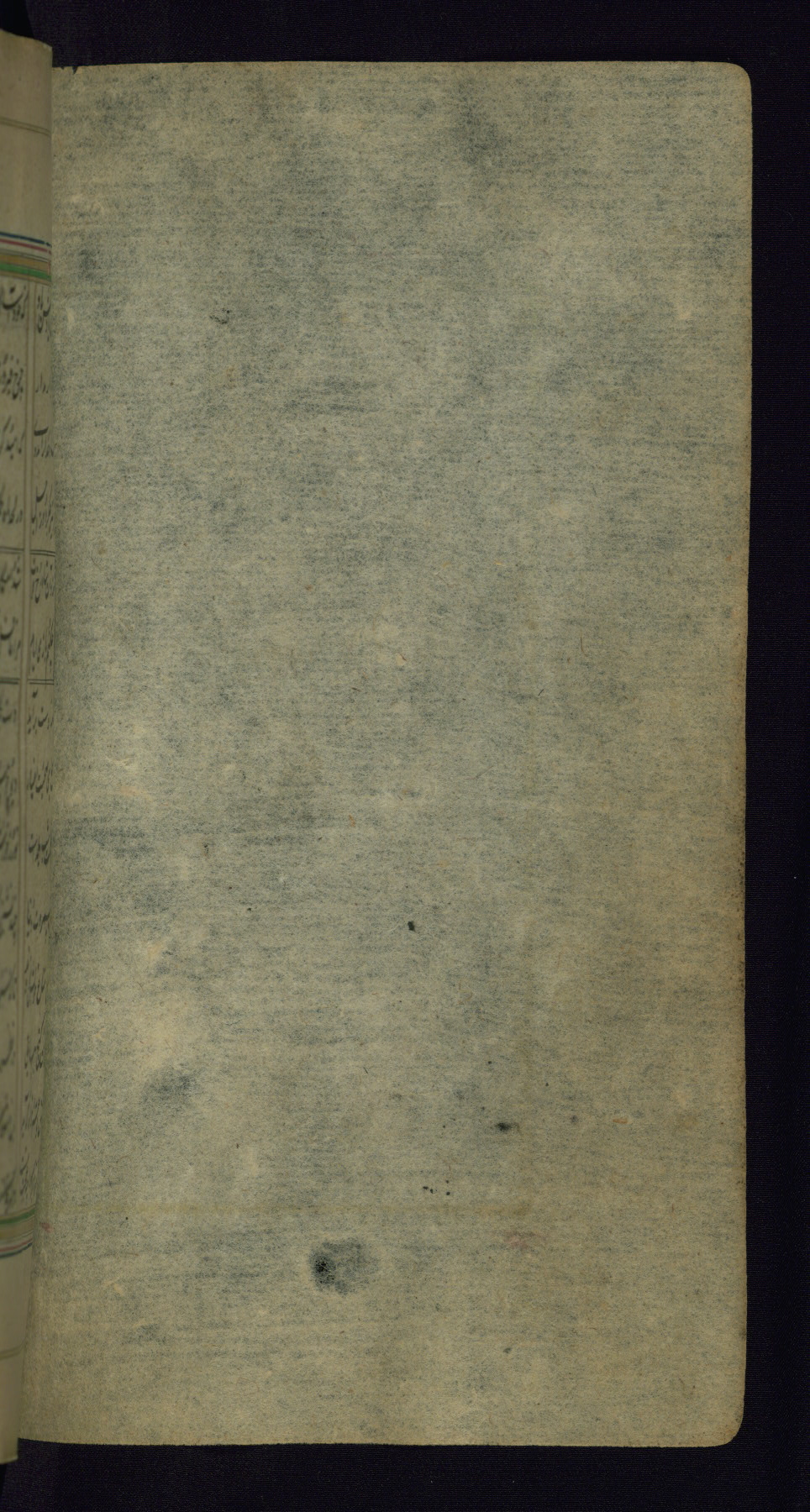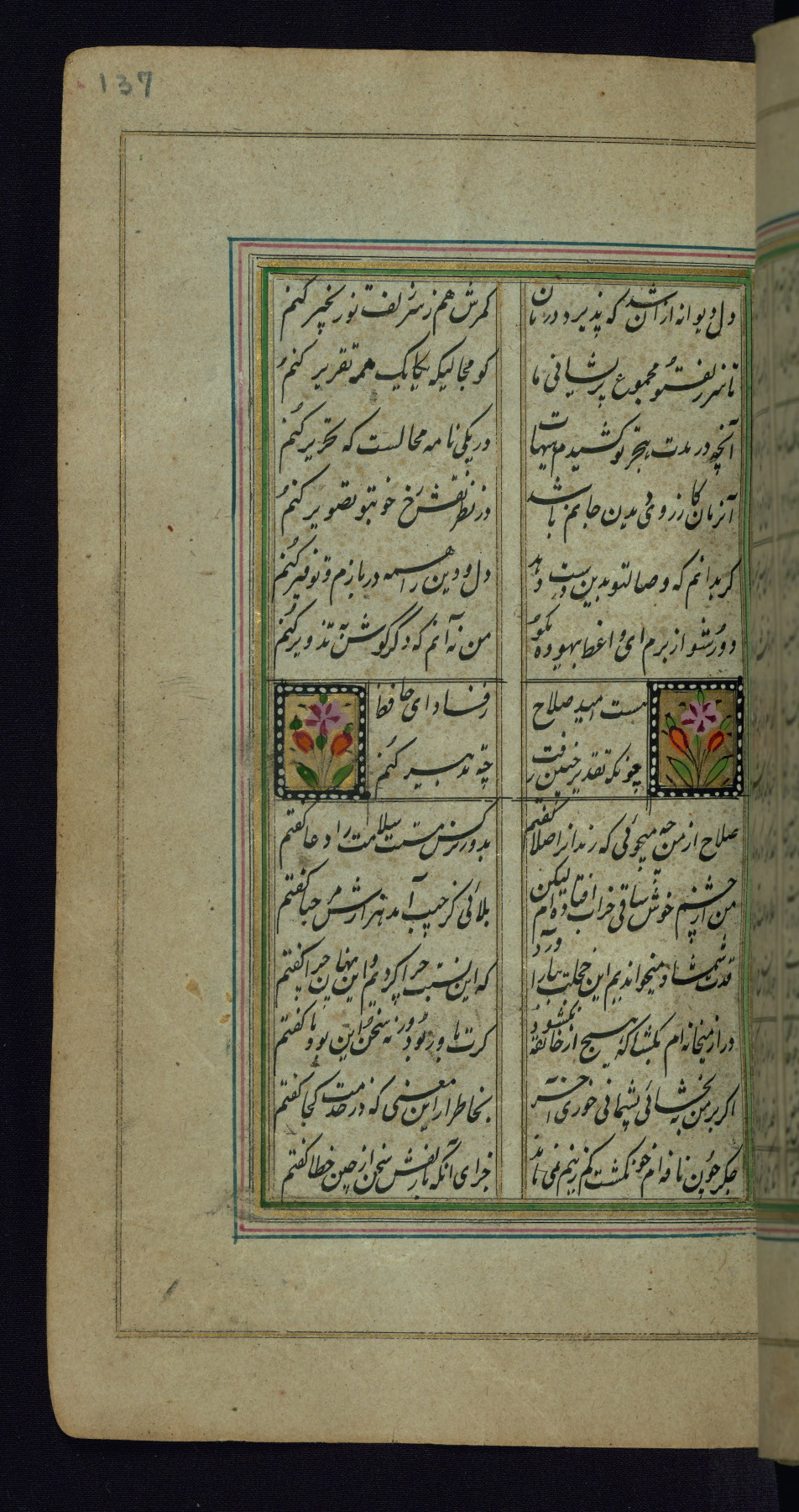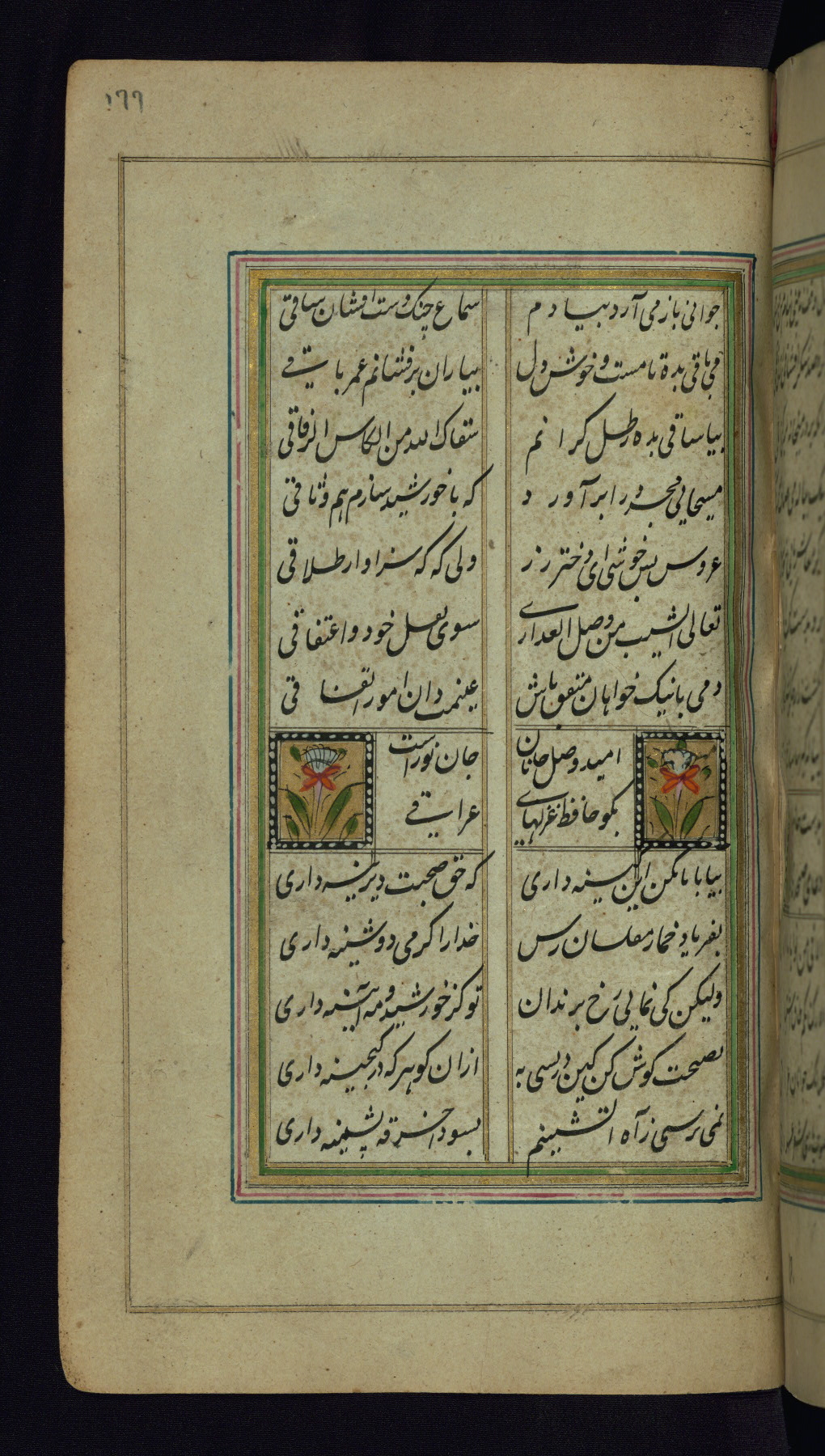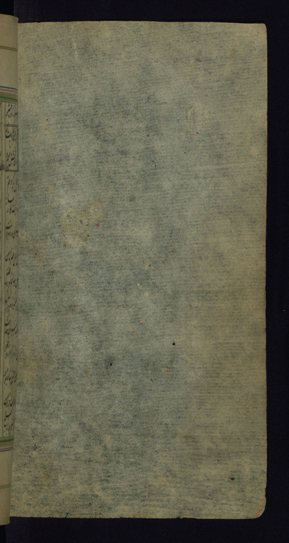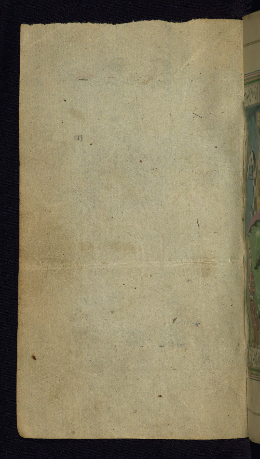 This is an illuminated and illustrated Collection of poems (dīvān) by Shams al-Dīn Muḥammad Ḥāfiz al-Shīrāzī (fl. eighth century AH / fourteenth CE), which was produced in India. According to the colophon, the manuscript was completed on the 19th Rajab 1202[?] AH / 1788[?] CE. It opens with a double-page illuminated incipit (fols. 1b-2a) with headpiece that introduces the preface (dībāchah) (fols. 1b-4b), followed by another double-page illuminated incipit with headpiece opening the main text of the Dīvān (fols. 5b-6a). The codex is decorated throughout with square and rectangular panels, as well as horizontal bands with floral decoration marking the end of odes, quatrains, or series of verses. There are forty-nine illustrations. The brown leather binding with medallion and pendants is contemporary with the manuscript.