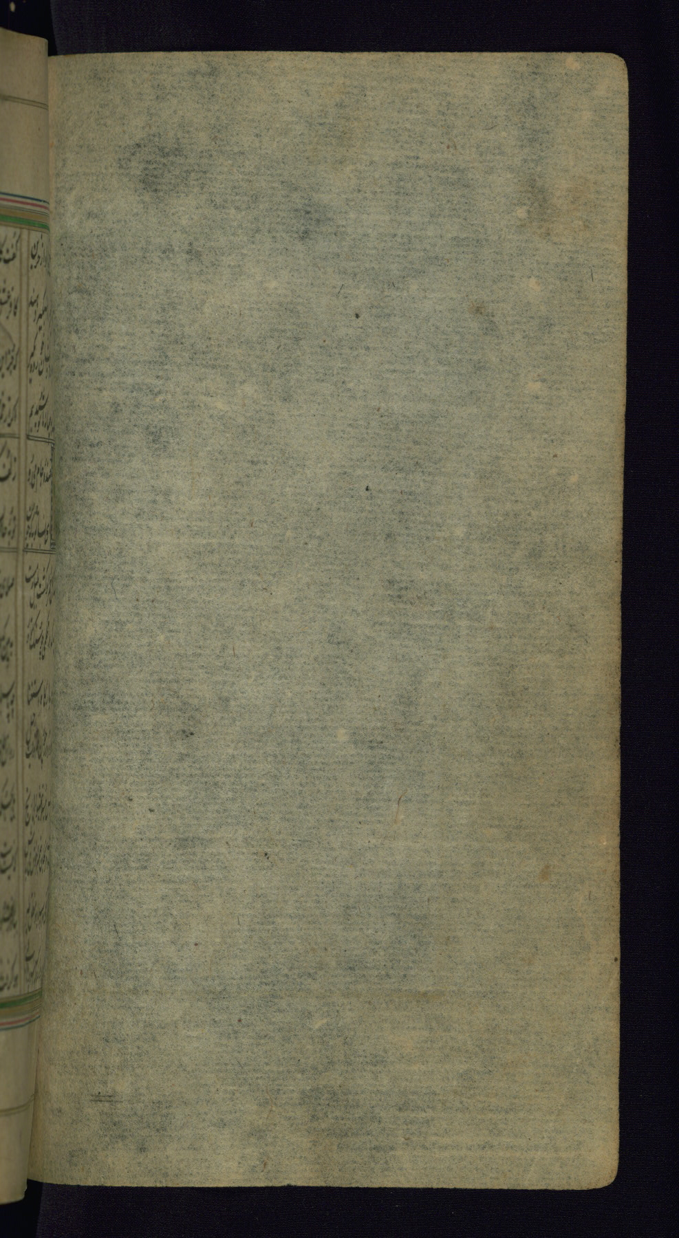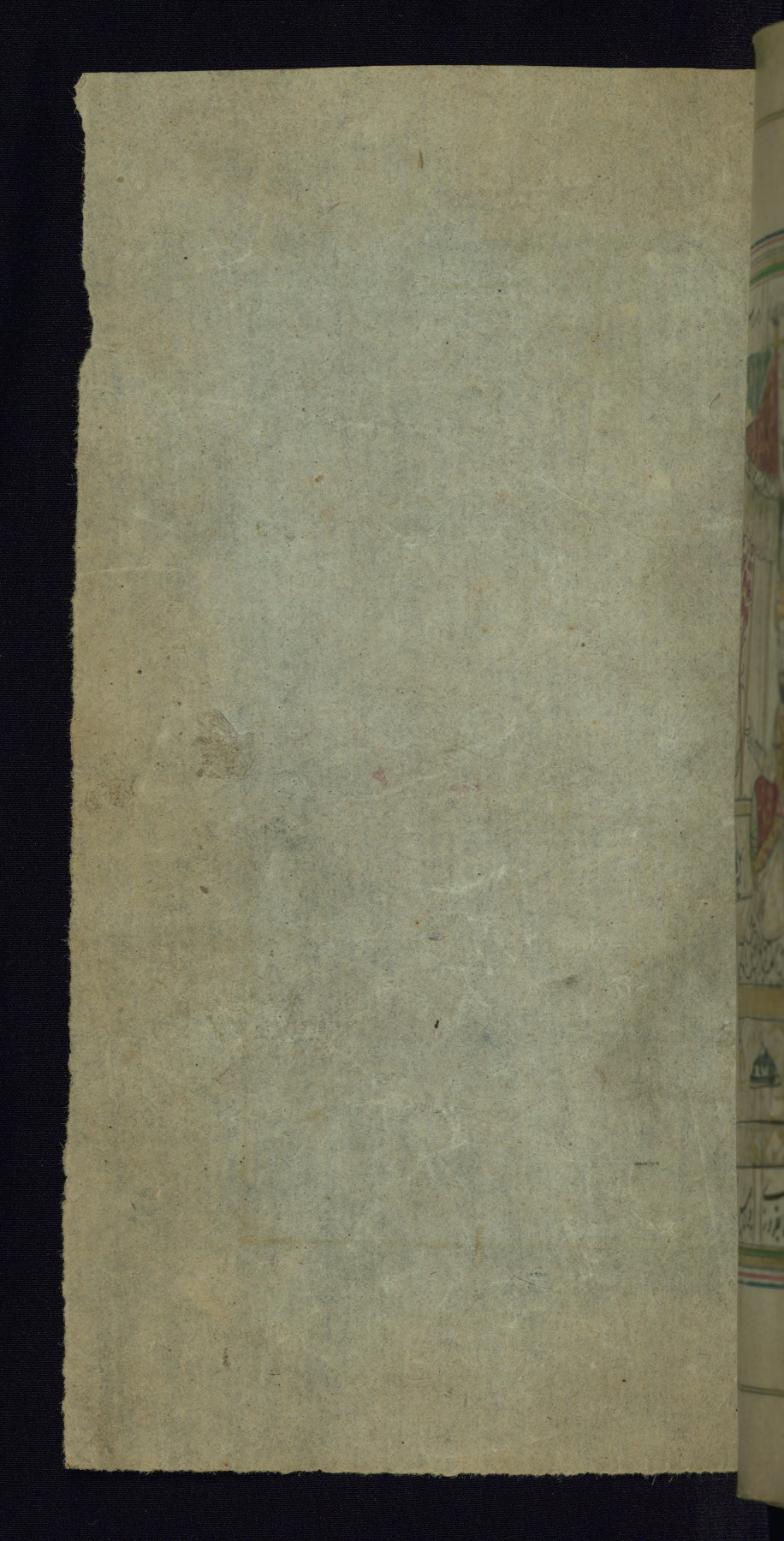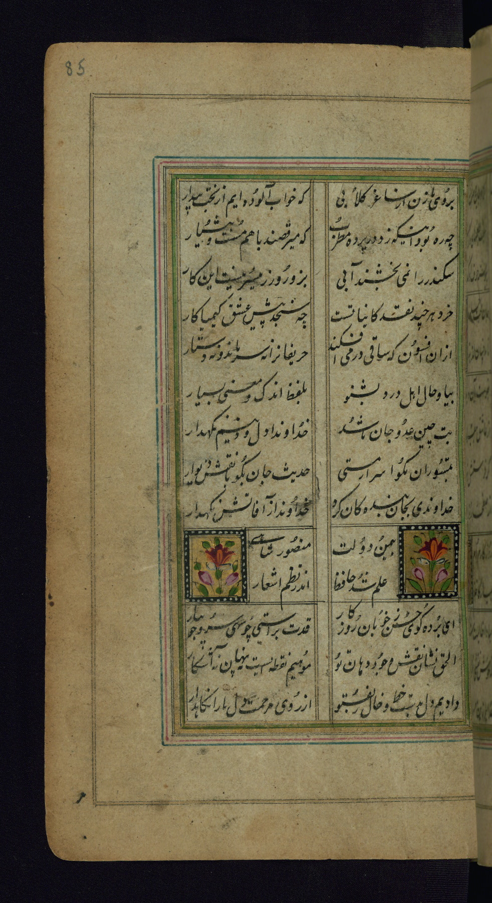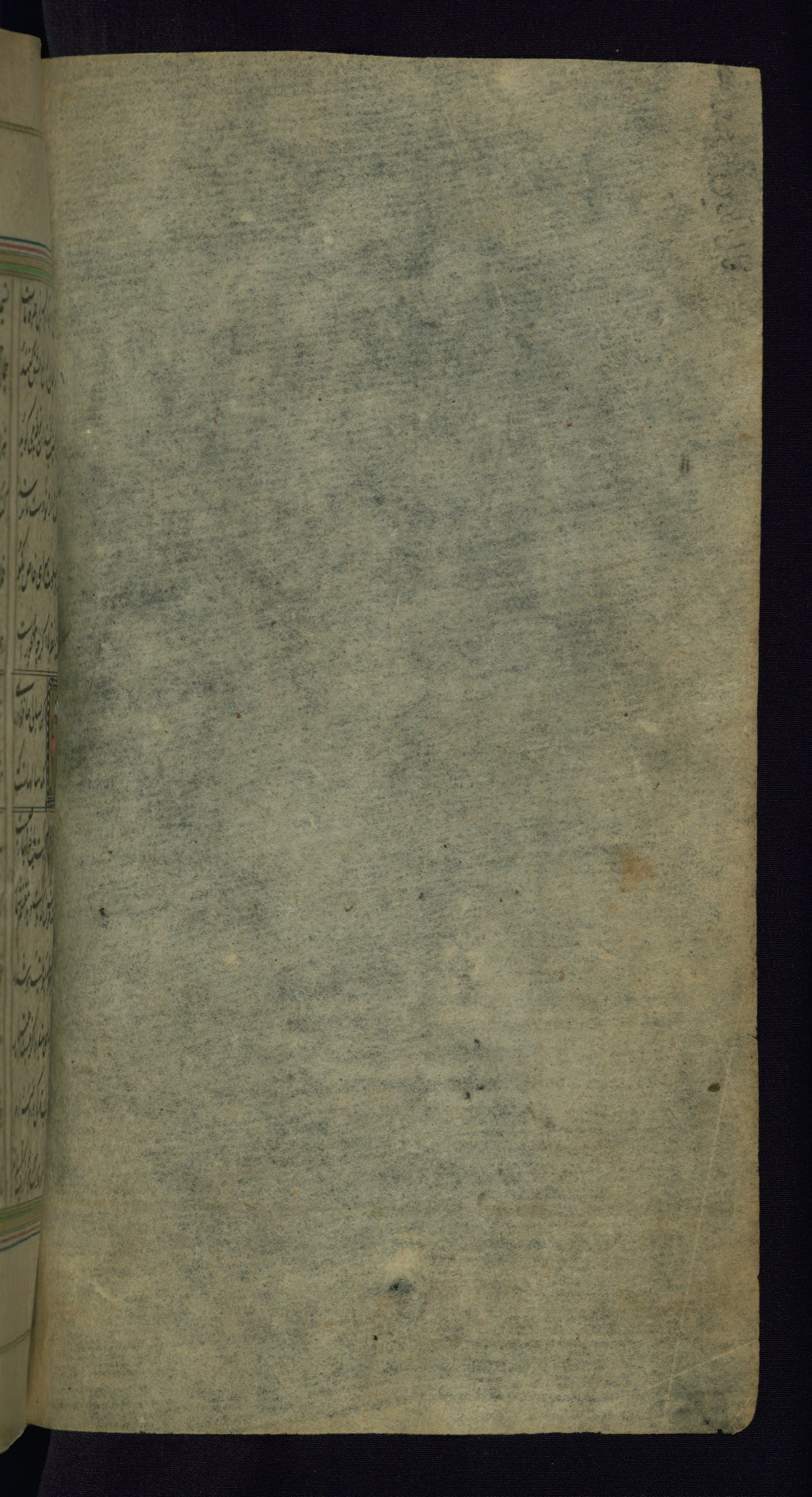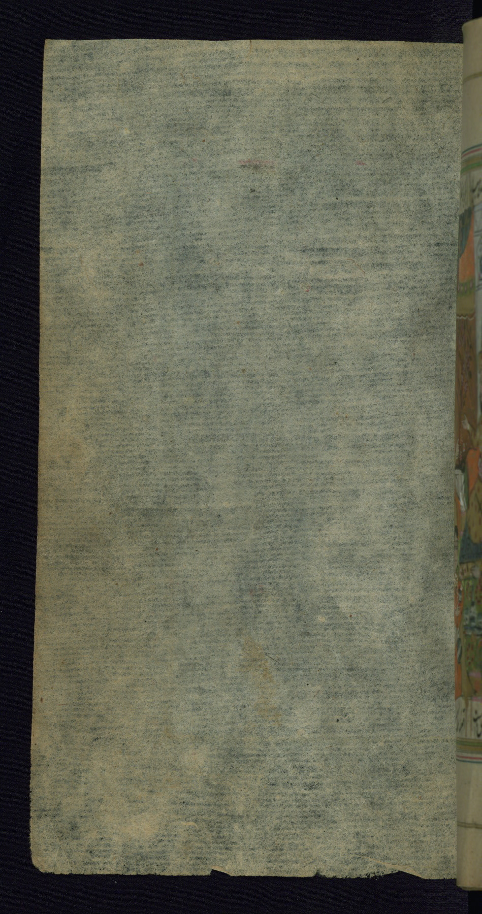 This is an illuminated and illustrated Collection of poems (dīvān) by Shams al-Dīn Muḥammad Ḥāfiz al-Shīrāzī (fl. eighth century AH / fourteenth CE), which was produced in India. According to the colophon, the manuscript was completed on the 19th Rajab 1202[?] AH / 1788[?] CE. It opens with a double-page illuminated incipit (fols. 1b-2a) with headpiece that introduces the preface (dībāchah) (fols. 1b-4b), followed by another double-page illuminated incipit with headpiece opening the main text of the Dīvān (fols. 5b-6a). The codex is decorated throughout with square and rectangular panels, as well as horizontal bands with floral decoration marking the end of odes, quatrains, or series of verses. There are forty-nine illustrations. The brown leather binding with medallion and pendants is contemporary with the manuscript.