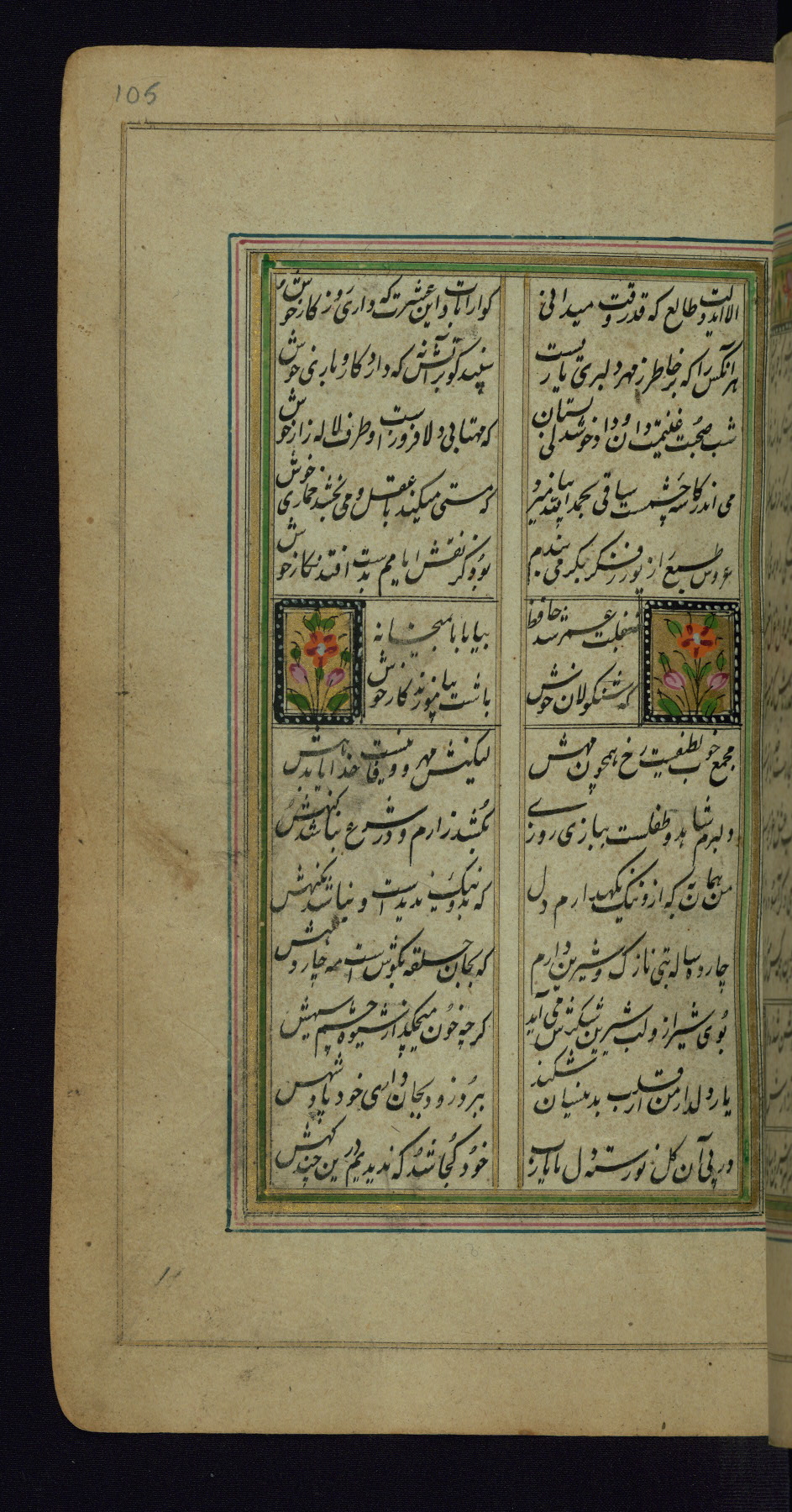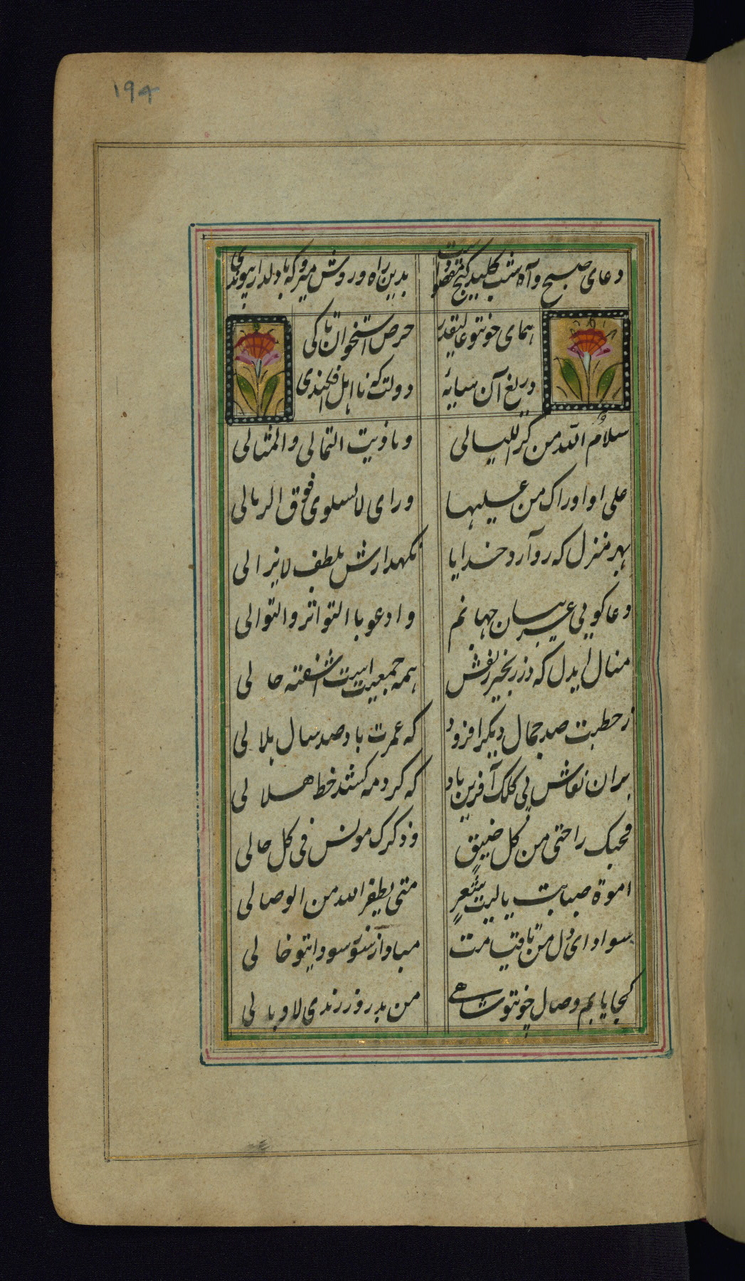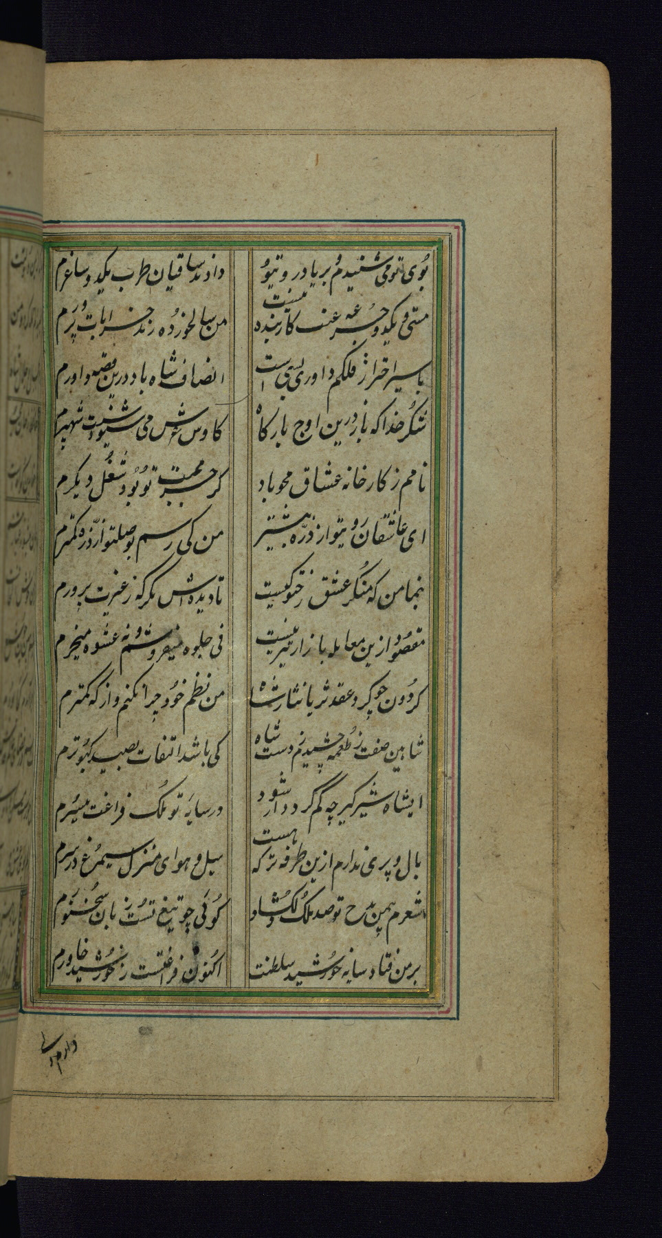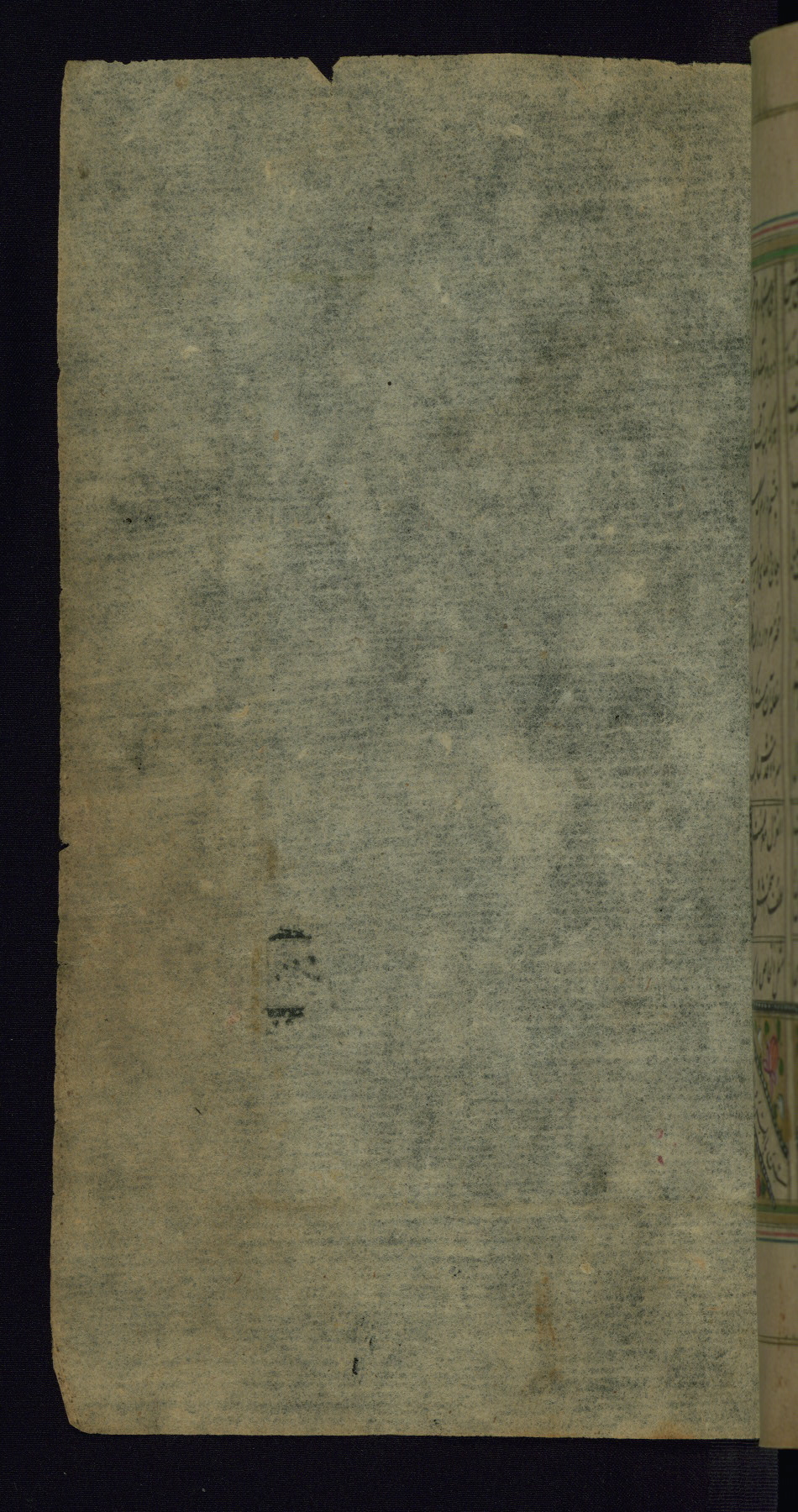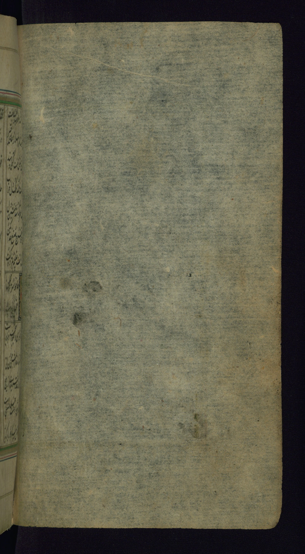 This is an illuminated and illustrated Collection of poems (dīvān) by Shams al-Dīn Muḥammad Ḥāfiz al-Shīrāzī (fl. eighth century AH / fourteenth CE), which was produced in India. According to the colophon, the manuscript was completed on the 19th Rajab 1202[?] AH / 1788[?] CE. It opens with a double-page illuminated incipit (fols. 1b-2a) with headpiece that introduces the preface (dībāchah) (fols. 1b-4b), followed by another double-page illuminated incipit with headpiece opening the main text of the Dīvān (fols. 5b-6a). The codex is decorated throughout with square and rectangular panels, as well as horizontal bands with floral decoration marking the end of odes, quatrains, or series of verses. There are forty-nine illustrations. The brown leather binding with medallion and pendants is contemporary with the manuscript.