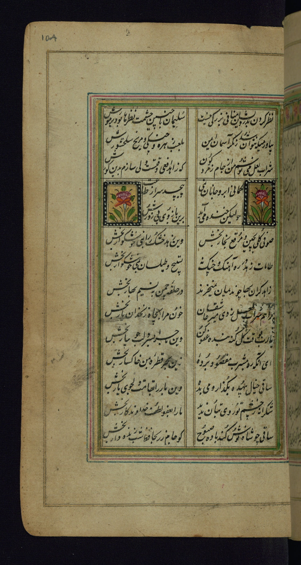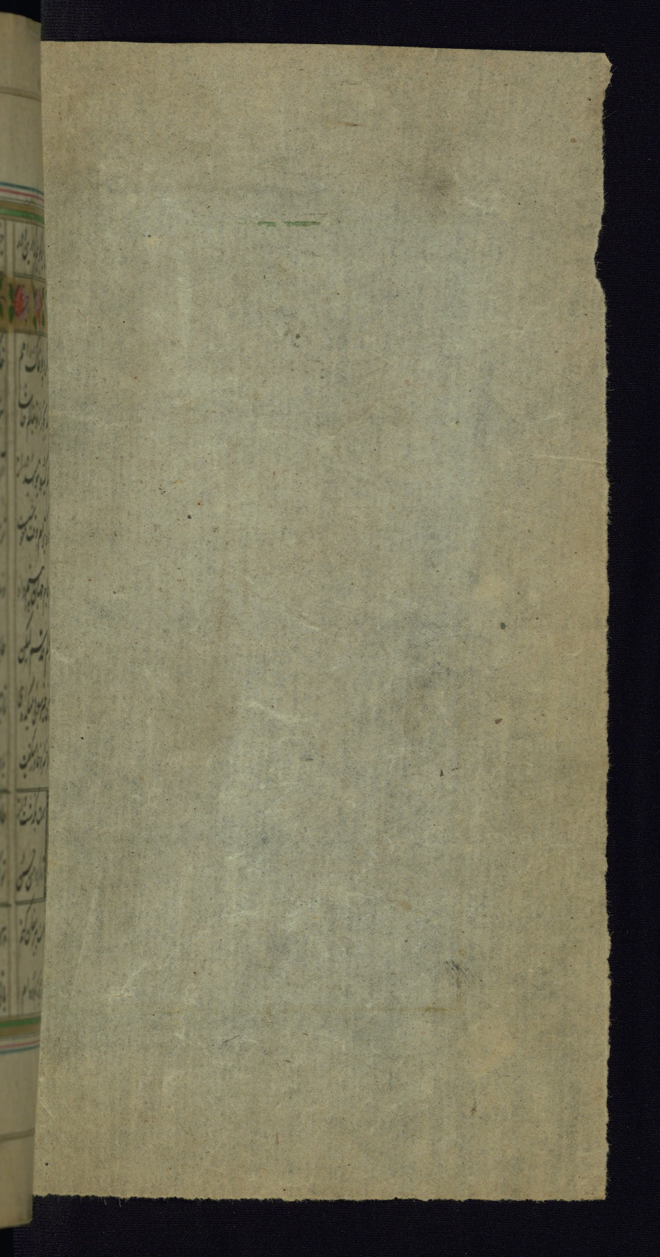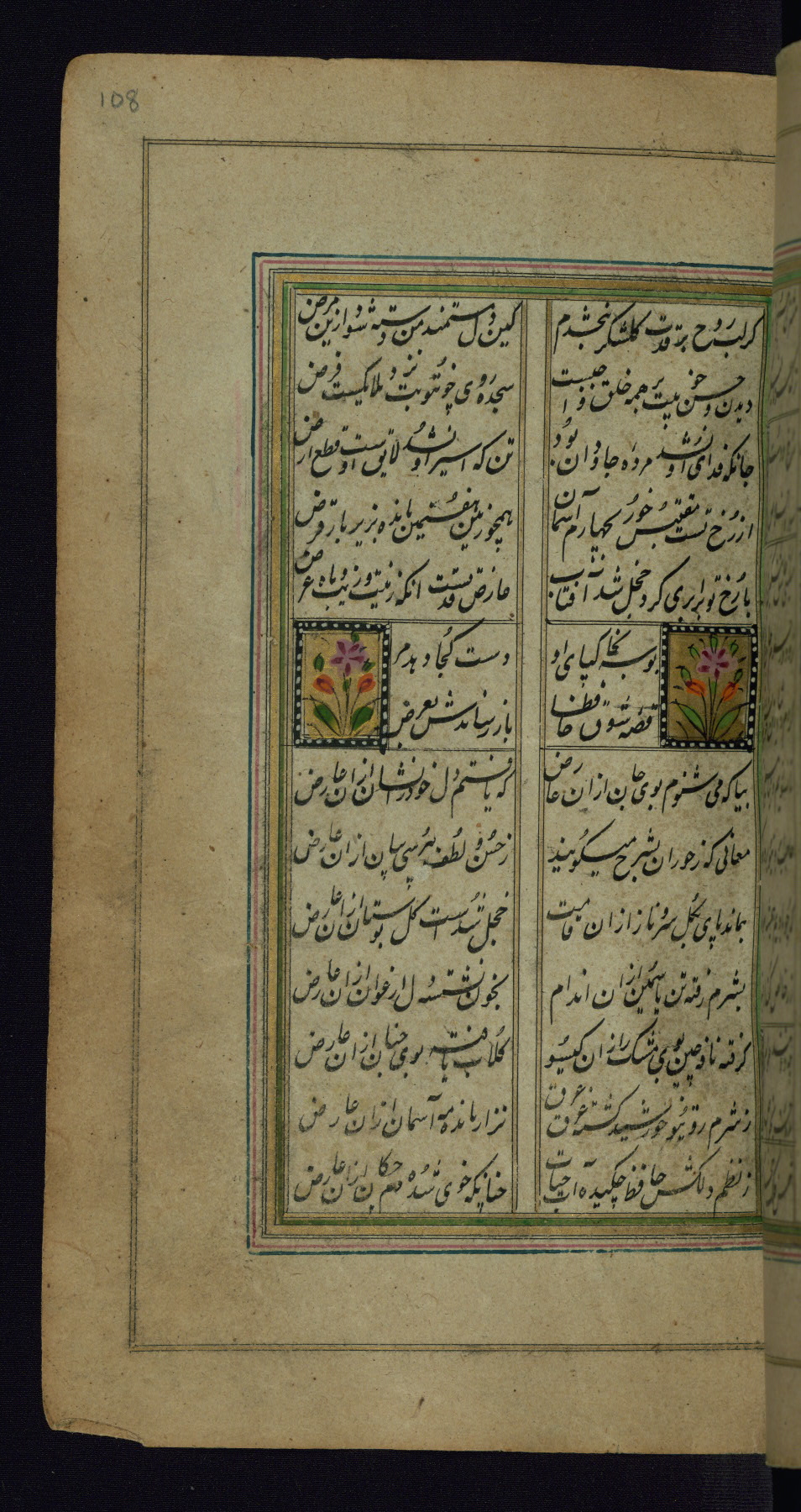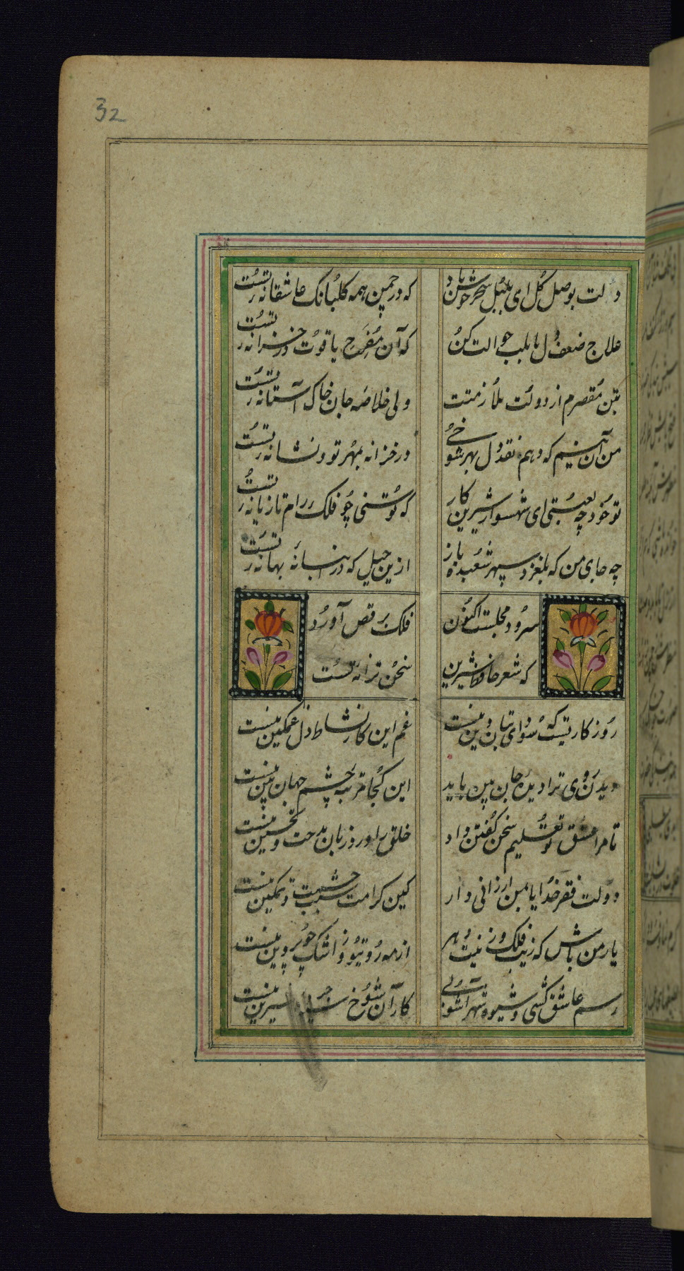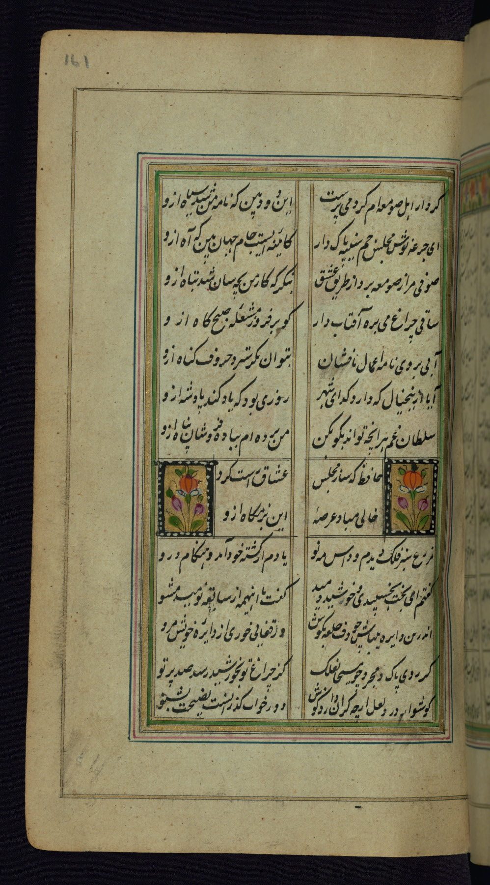 This is an illuminated and illustrated Collection of poems (dīvān) by Shams al-Dīn Muḥammad Ḥāfiz al-Shīrāzī (fl. eighth century AH / fourteenth CE), which was produced in India. According to the colophon, the manuscript was completed on the 19th Rajab 1202[?] AH / 1788[?] CE. It opens with a double-page illuminated incipit (fols. 1b-2a) with headpiece that introduces the preface (dībāchah) (fols. 1b-4b), followed by another double-page illuminated incipit with headpiece opening the main text of the Dīvān (fols. 5b-6a). The codex is decorated throughout with square and rectangular panels, as well as horizontal bands with floral decoration marking the end of odes, quatrains, or series of verses. There are forty-nine illustrations. The brown leather binding with medallion and pendants is contemporary with the manuscript.