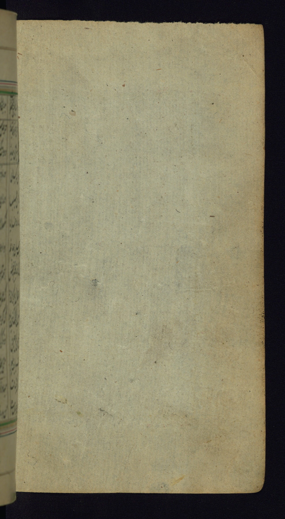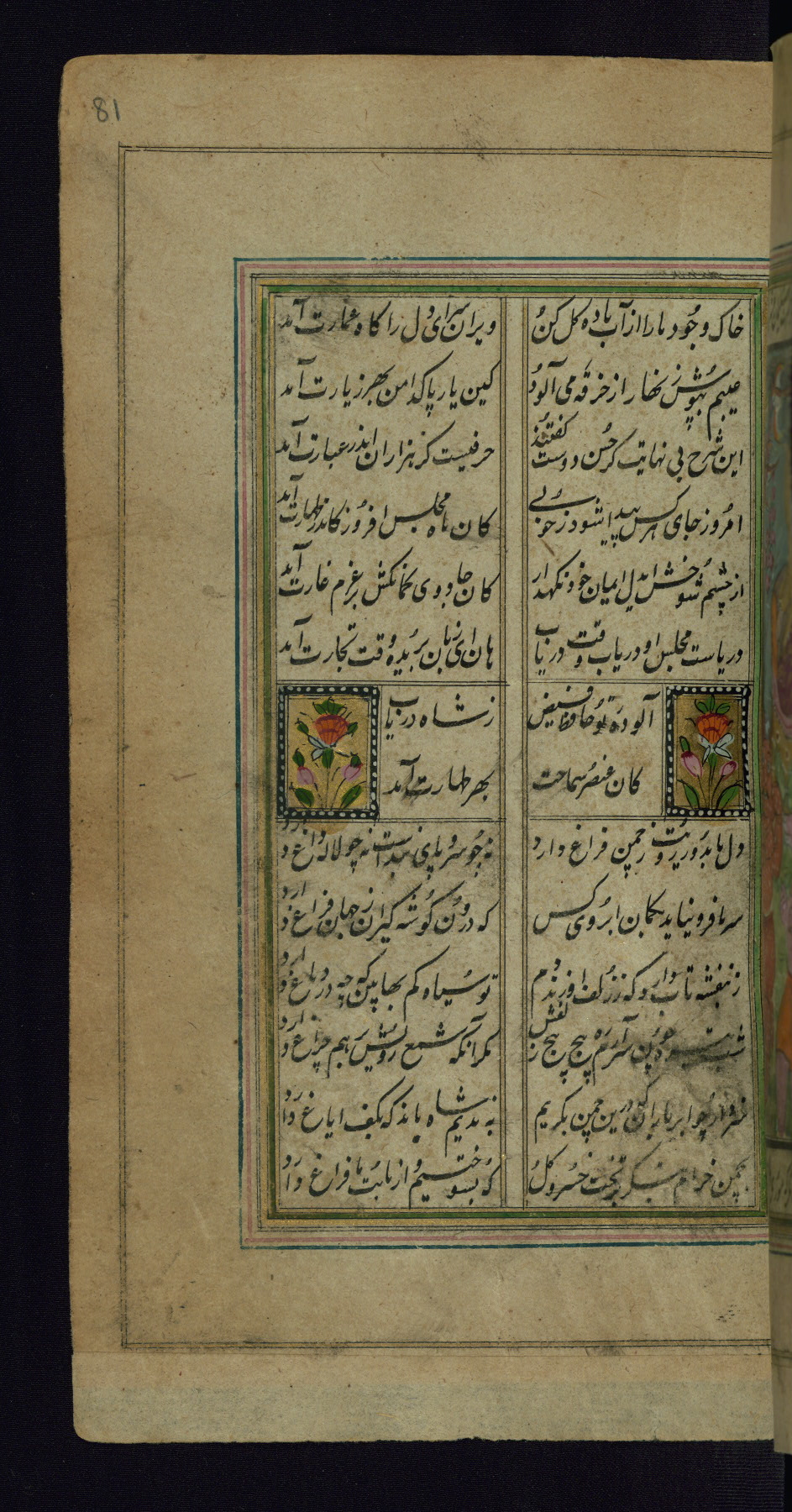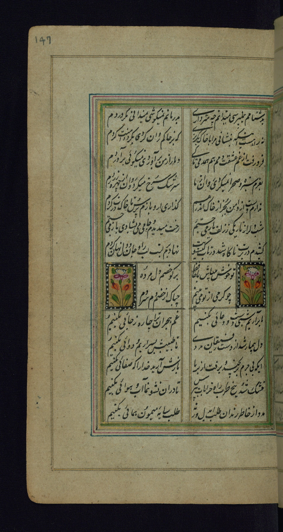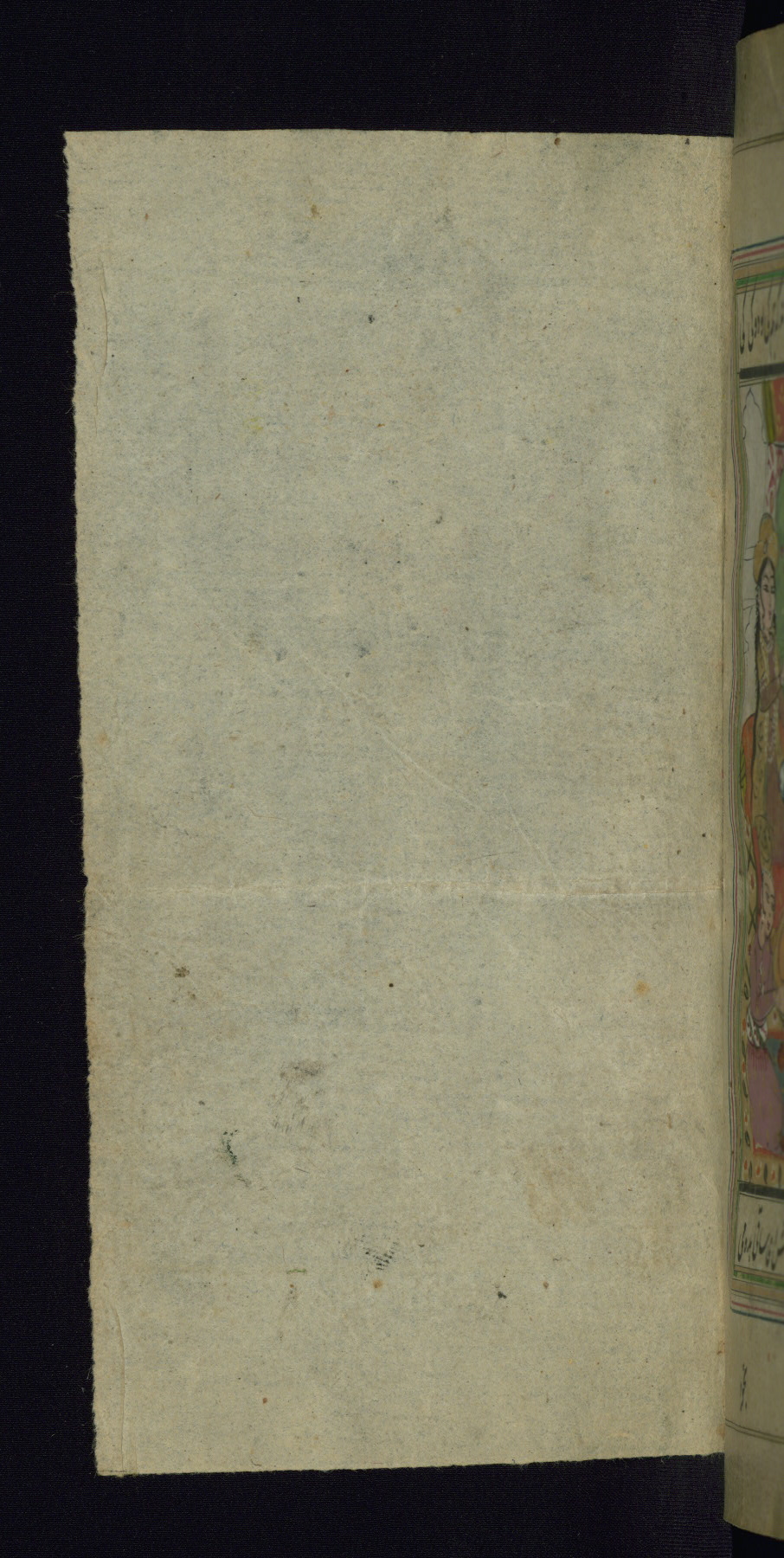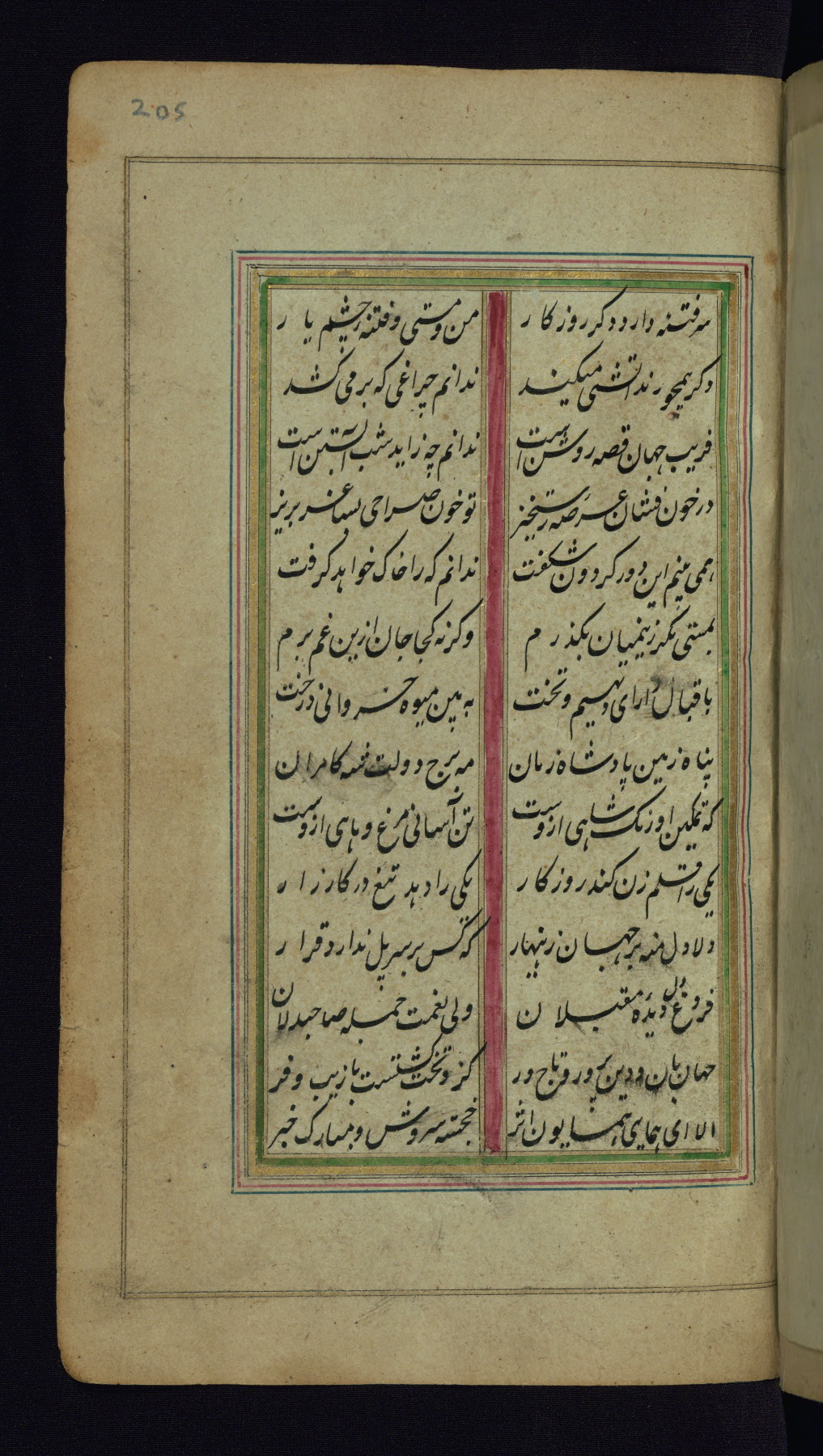 This is an illuminated and illustrated Collection of poems (dīvān) by Shams al-Dīn Muḥammad Ḥāfiz al-Shīrāzī (fl. eighth century AH / fourteenth CE), which was produced in India. According to the colophon, the manuscript was completed on the 19th Rajab 1202[?] AH / 1788[?] CE. It opens with a double-page illuminated incipit (fols. 1b-2a) with headpiece that introduces the preface (dībāchah) (fols. 1b-4b), followed by another double-page illuminated incipit with headpiece opening the main text of the Dīvān (fols. 5b-6a). The codex is decorated throughout with square and rectangular panels, as well as horizontal bands with floral decoration marking the end of odes, quatrains, or series of verses. There are forty-nine illustrations. The brown leather binding with medallion and pendants is contemporary with the manuscript.