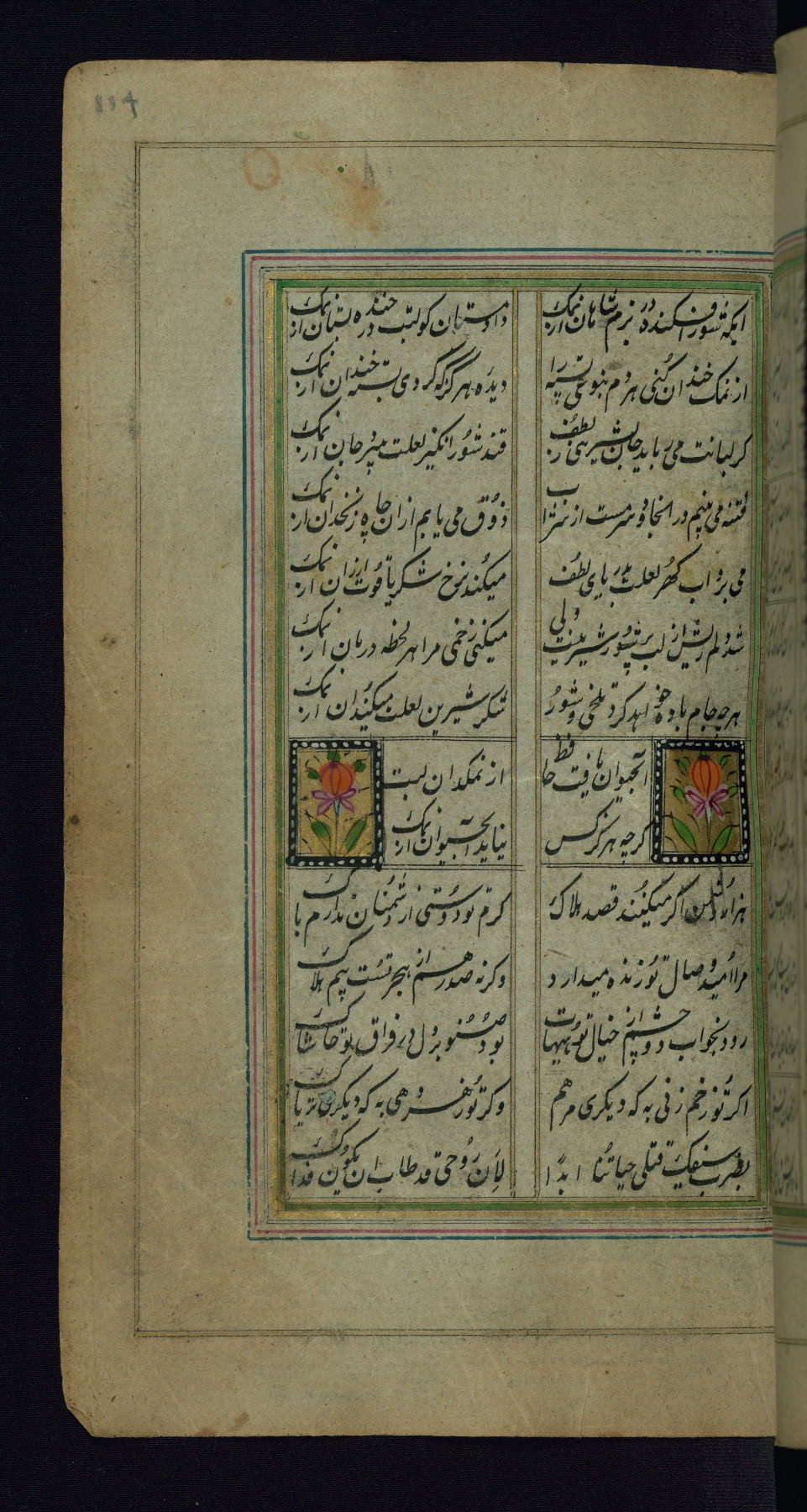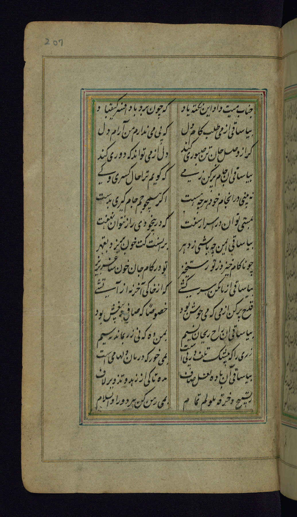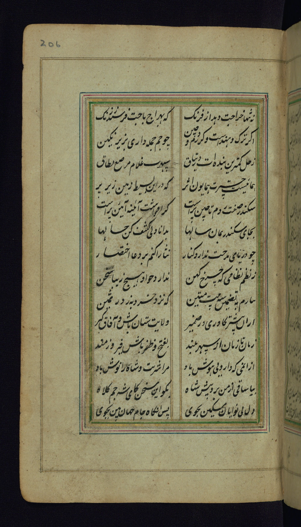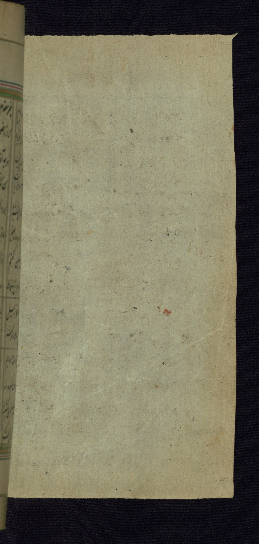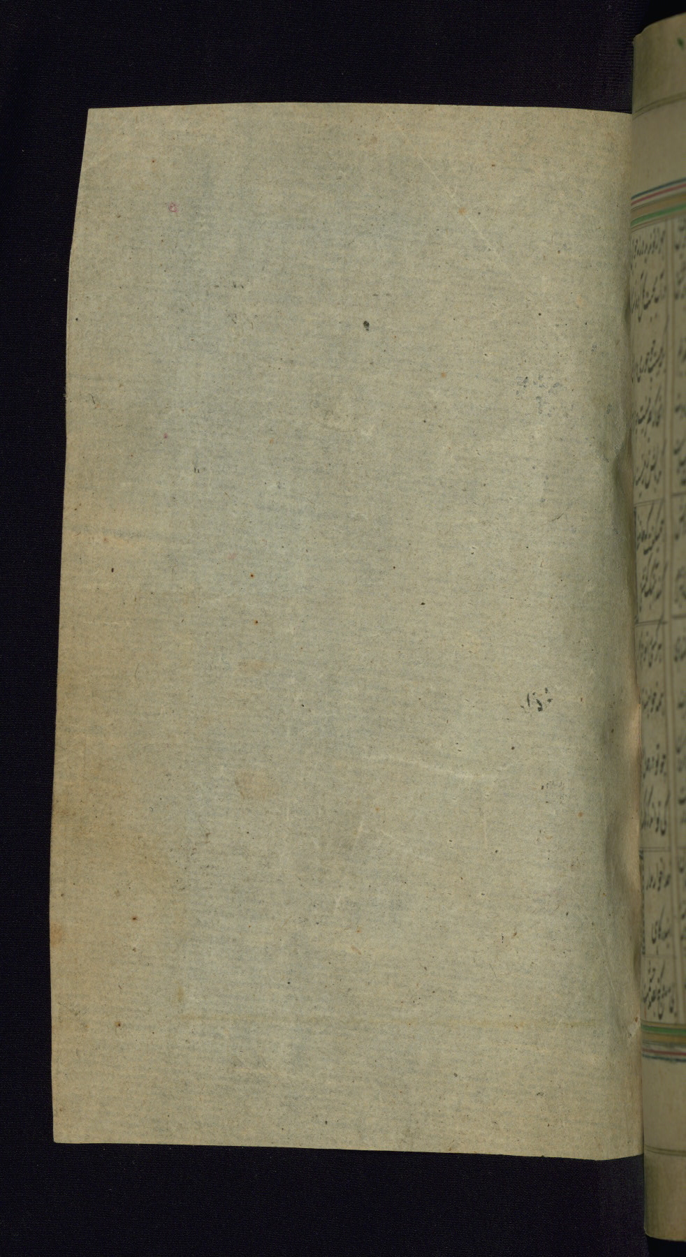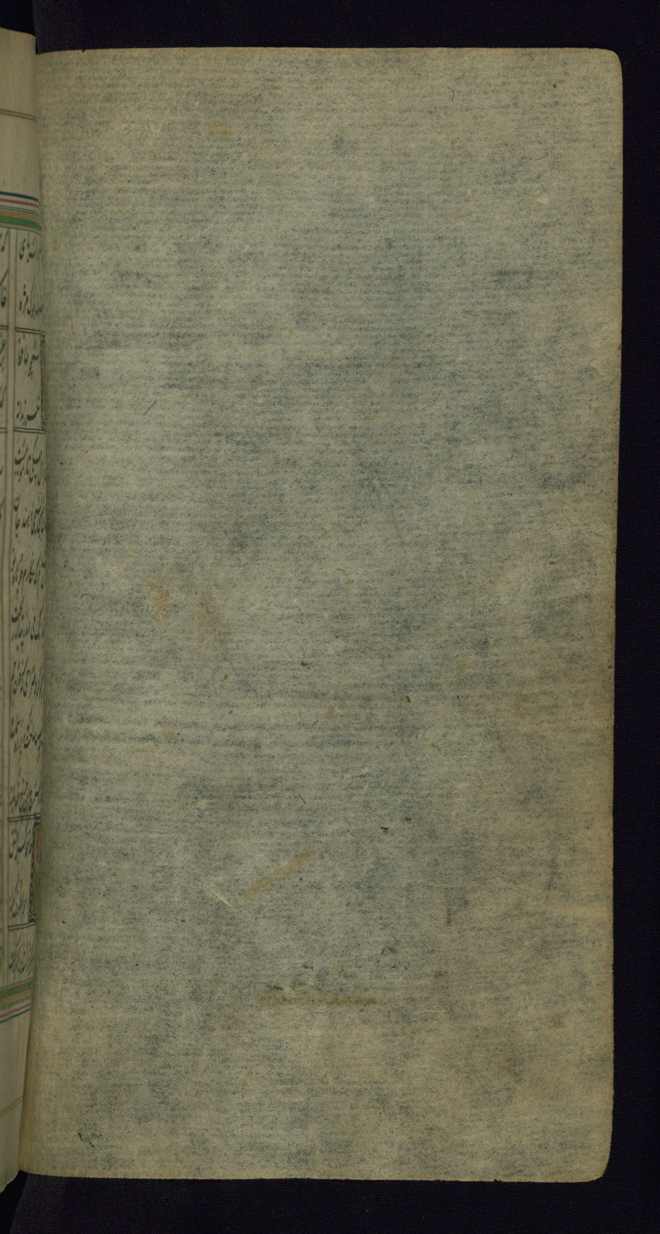 This is an illuminated and illustrated Collection of poems (dīvān) by Shams al-Dīn Muḥammad Ḥāfiz al-Shīrāzī (fl. eighth century AH / fourteenth CE), which was produced in India. According to the colophon, the manuscript was completed on the 19th Rajab 1202[?] AH / 1788[?] CE. It opens with a double-page illuminated incipit (fols. 1b-2a) with headpiece that introduces the preface (dībāchah) (fols. 1b-4b), followed by another double-page illuminated incipit with headpiece opening the main text of the Dīvān (fols. 5b-6a). The codex is decorated throughout with square and rectangular panels, as well as horizontal bands with floral decoration marking the end of odes, quatrains, or series of verses. There are forty-nine illustrations. The brown leather binding with medallion and pendants is contemporary with the manuscript.