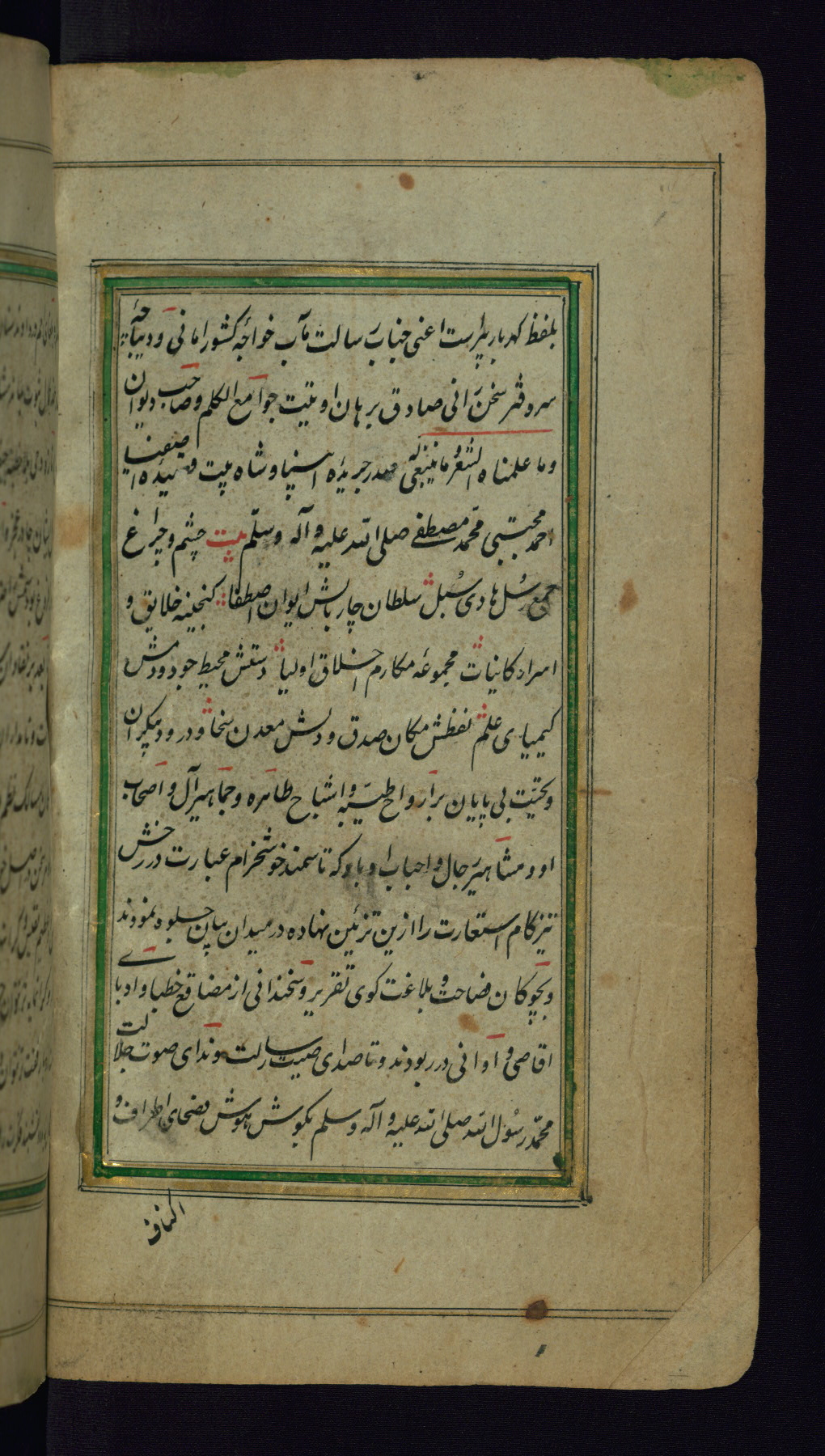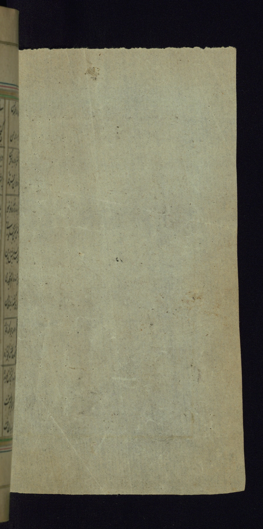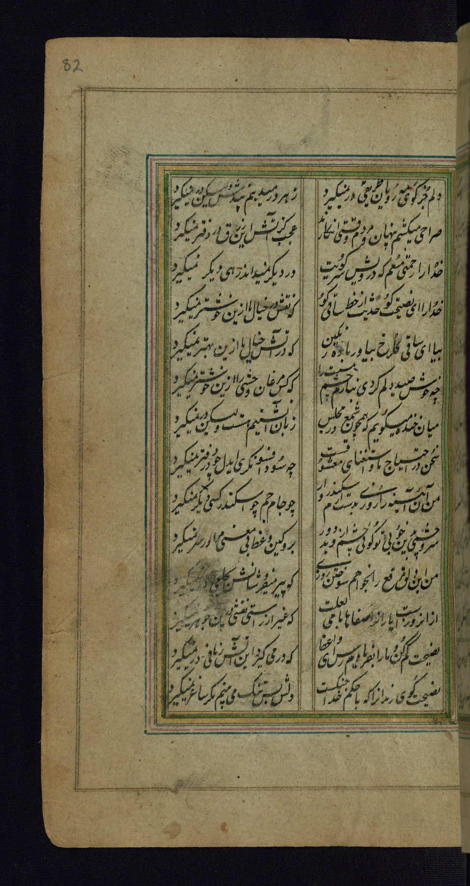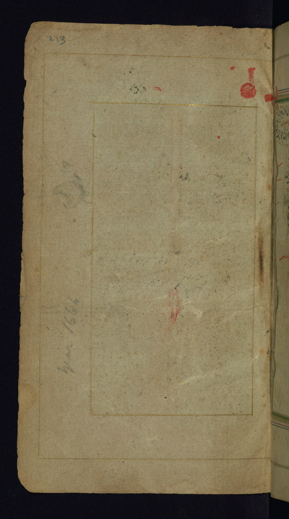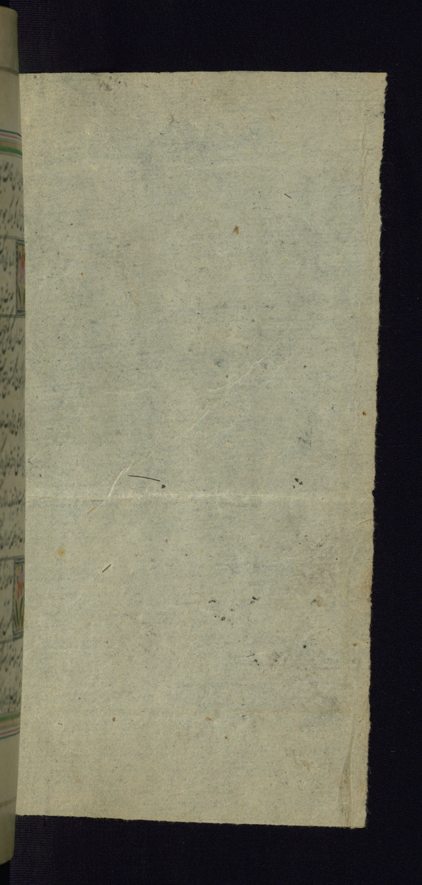 This is an illuminated and illustrated Collection of poems (dīvān) by Shams al-Dīn Muḥammad Ḥāfiz al-Shīrāzī (fl. eighth century AH / fourteenth CE), which was produced in India. According to the colophon, the manuscript was completed on the 19th Rajab 1202[?] AH / 1788[?] CE. It opens with a double-page illuminated incipit (fols. 1b-2a) with headpiece that introduces the preface (dībāchah) (fols. 1b-4b), followed by another double-page illuminated incipit with headpiece opening the main text of the Dīvān (fols. 5b-6a). The codex is decorated throughout with square and rectangular panels, as well as horizontal bands with floral decoration marking the end of odes, quatrains, or series of verses. There are forty-nine illustrations. The brown leather binding with medallion and pendants is contemporary with the manuscript.