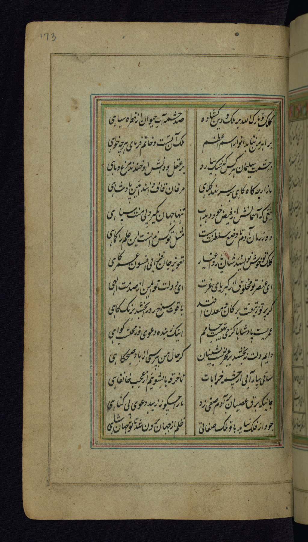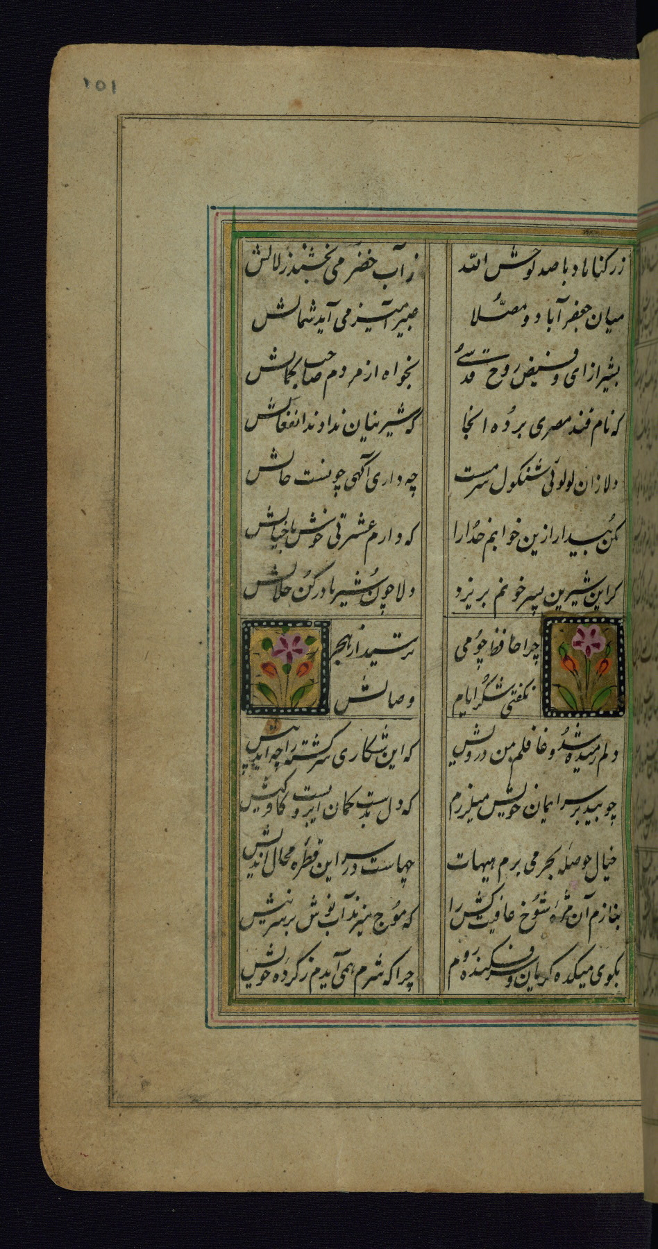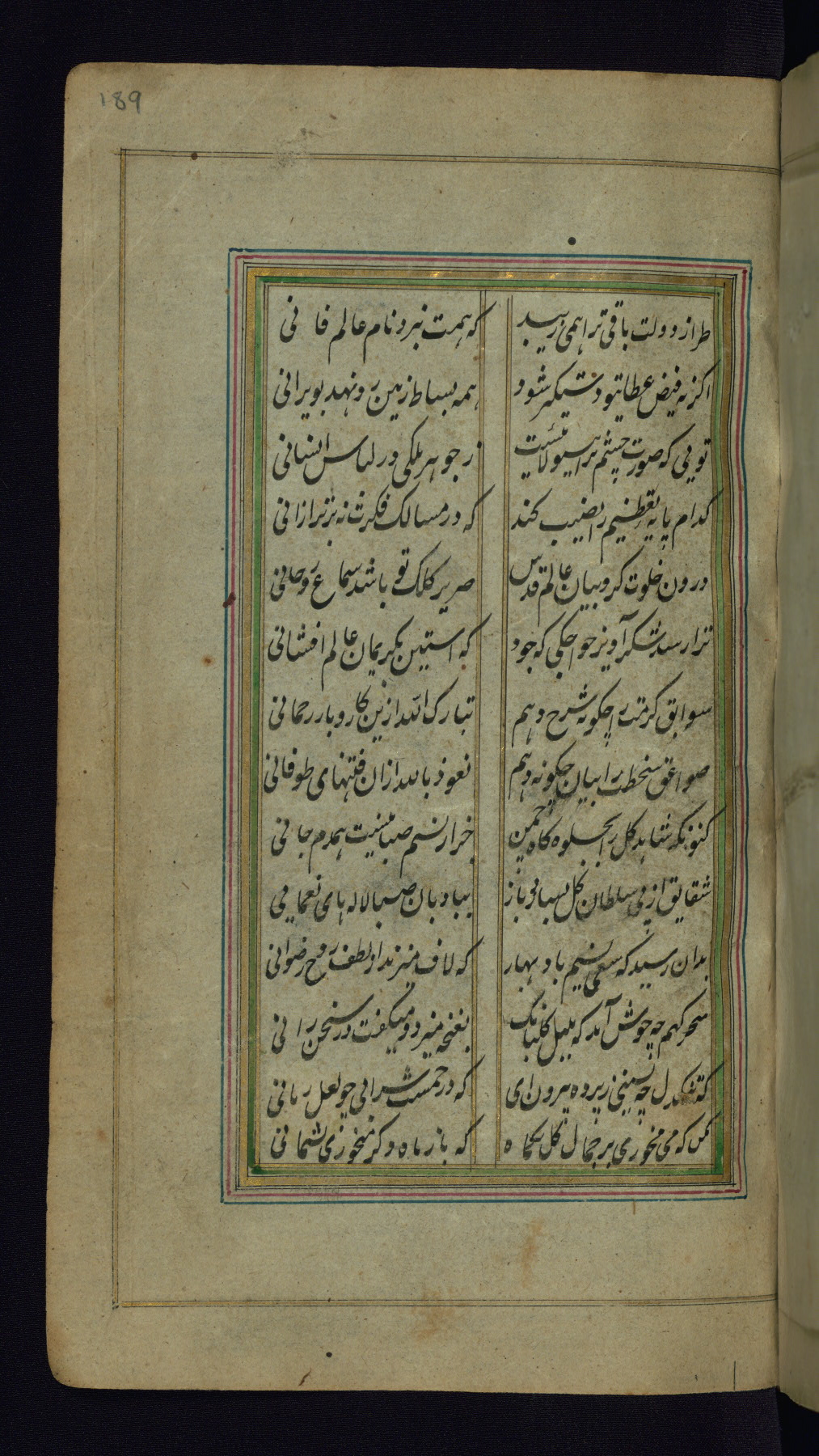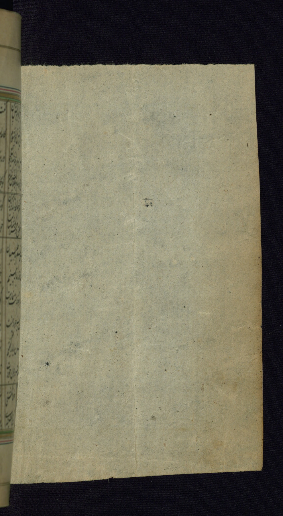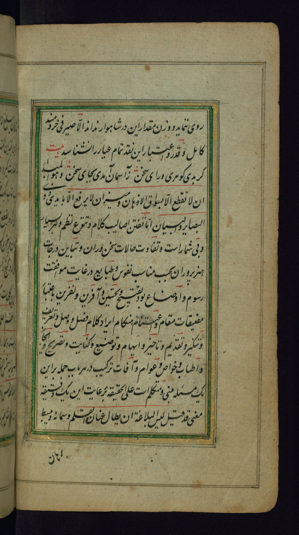 This is an illuminated and illustrated Collection of poems (dīvān) by Shams al-Dīn Muḥammad Ḥāfiz al-Shīrāzī (fl. eighth century AH / fourteenth CE), which was produced in India. According to the colophon, the manuscript was completed on the 19th Rajab 1202[?] AH / 1788[?] CE. It opens with a double-page illuminated incipit (fols. 1b-2a) with headpiece that introduces the preface (dībāchah) (fols. 1b-4b), followed by another double-page illuminated incipit with headpiece opening the main text of the Dīvān (fols. 5b-6a). The codex is decorated throughout with square and rectangular panels, as well as horizontal bands with floral decoration marking the end of odes, quatrains, or series of verses. There are forty-nine illustrations. The brown leather binding with medallion and pendants is contemporary with the manuscript.