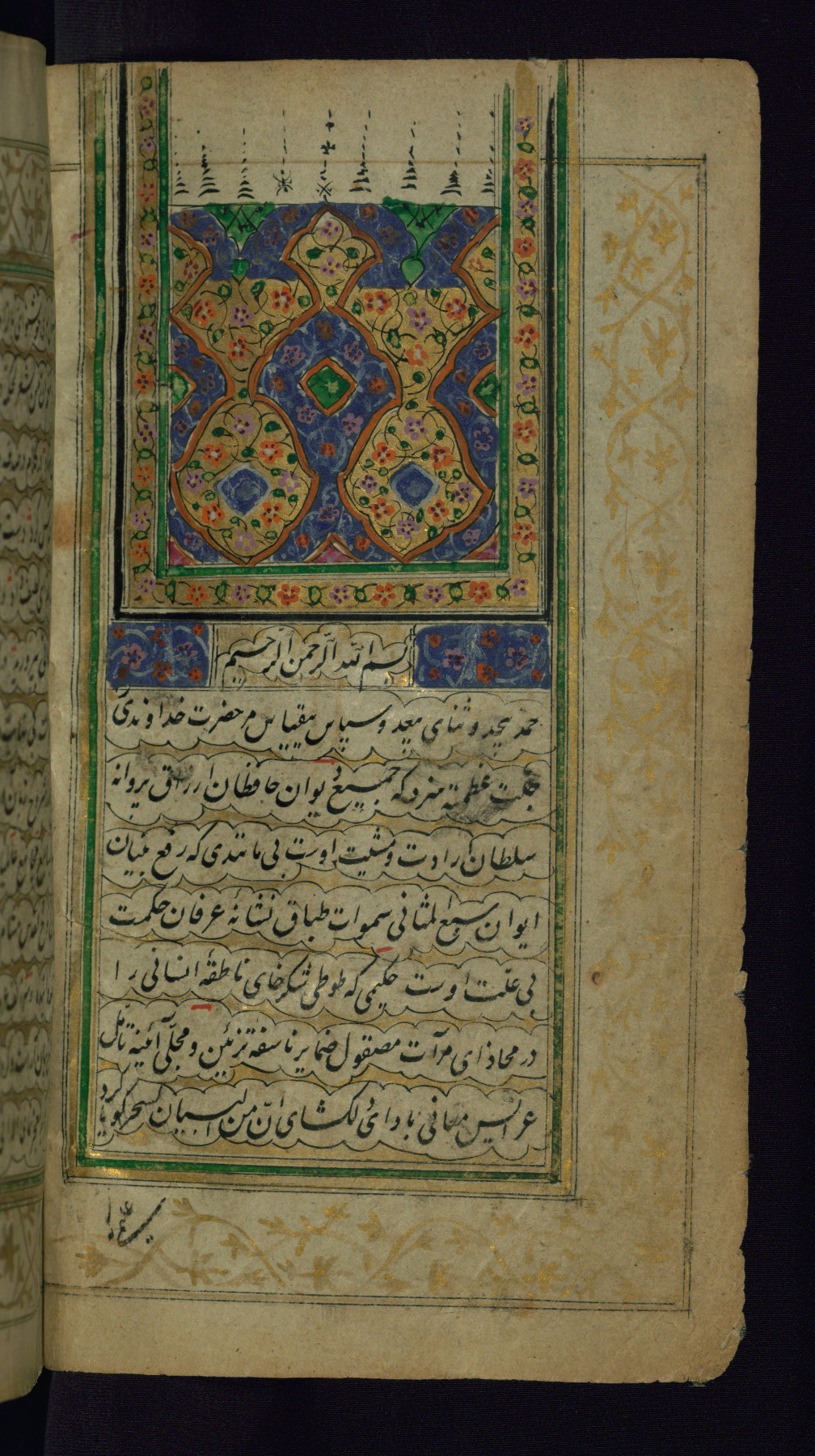 - Label: This incipit page has an illuminated headpiece inscribed with the doxological formula (basmalah). It introduces the preface (dībāchah) of the work. There is gilt interlinear decoration with a flower and vine gilt border.