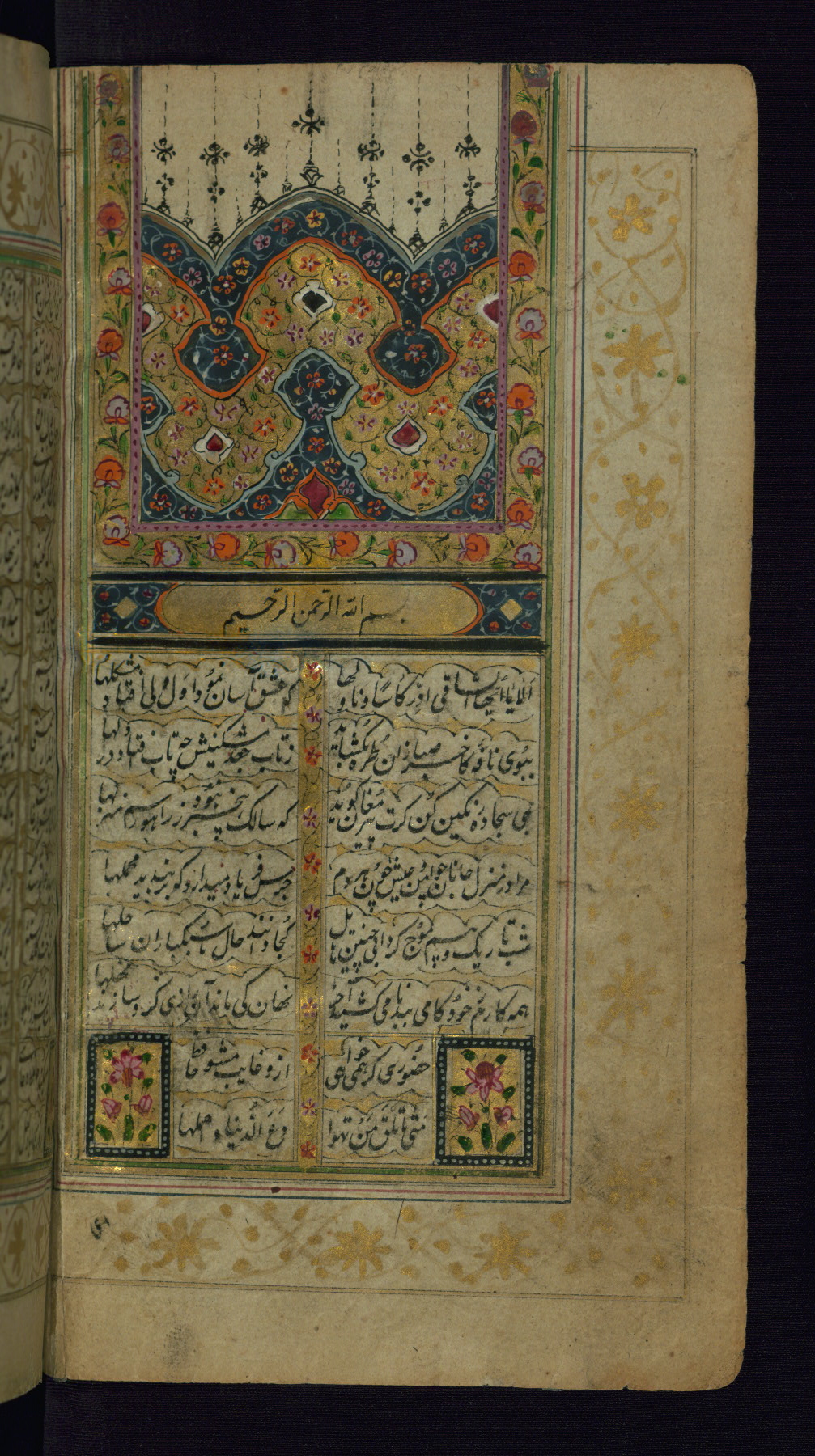 - Label: This incipit page has an illuminated headpiece inscribed with the doxological formula (basmalah) introducing the initial verses of the Dīvān. There is gilt interlinear illumination and rectangular panels with floral motifs in the lower corners of the text area.
