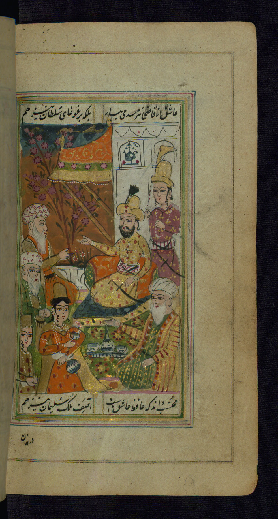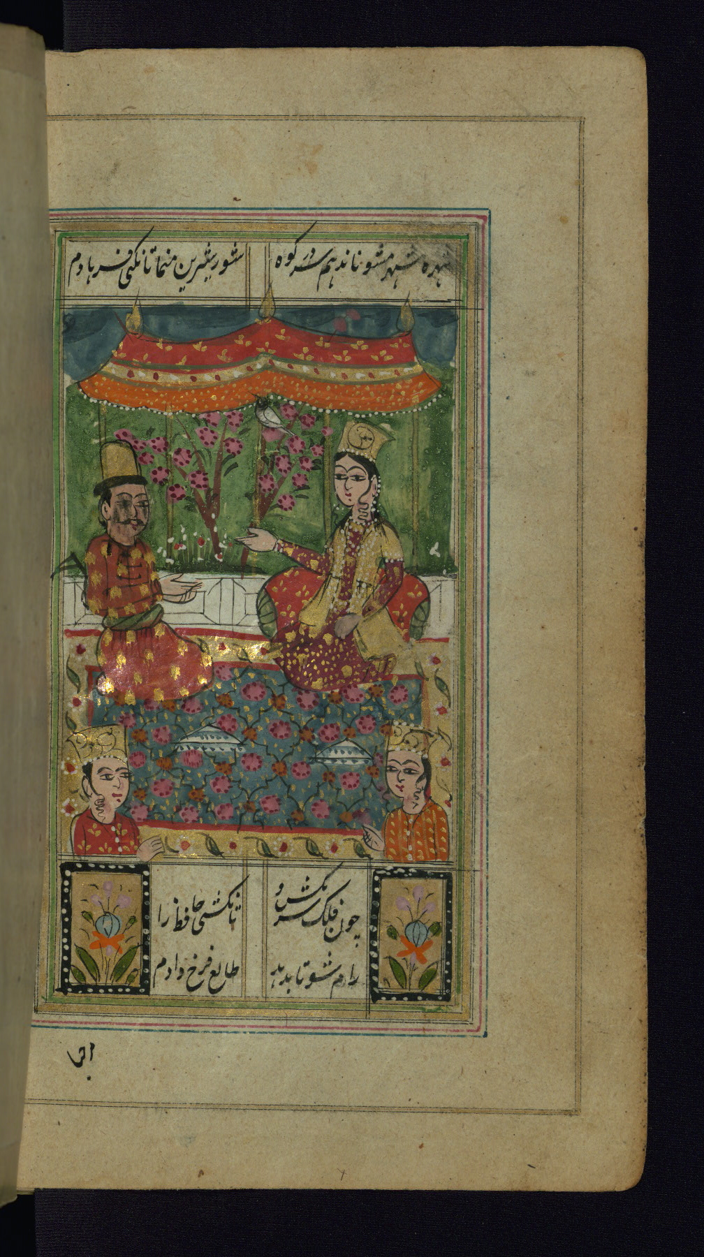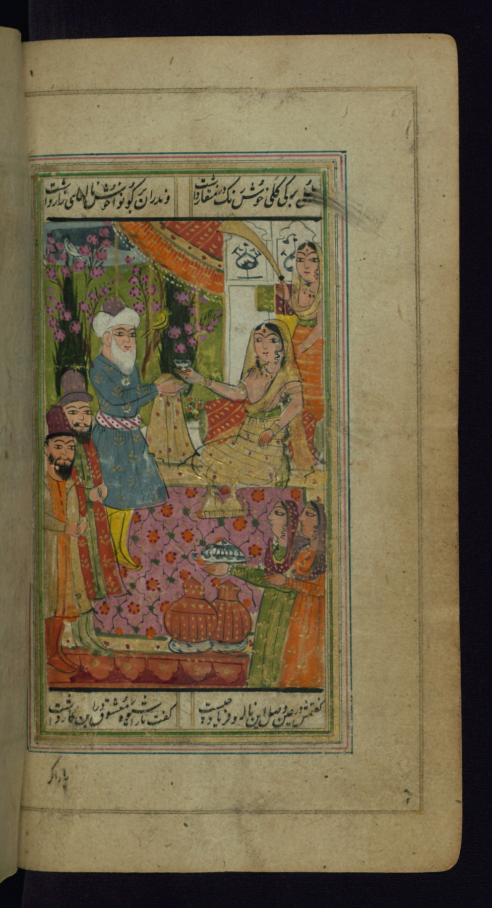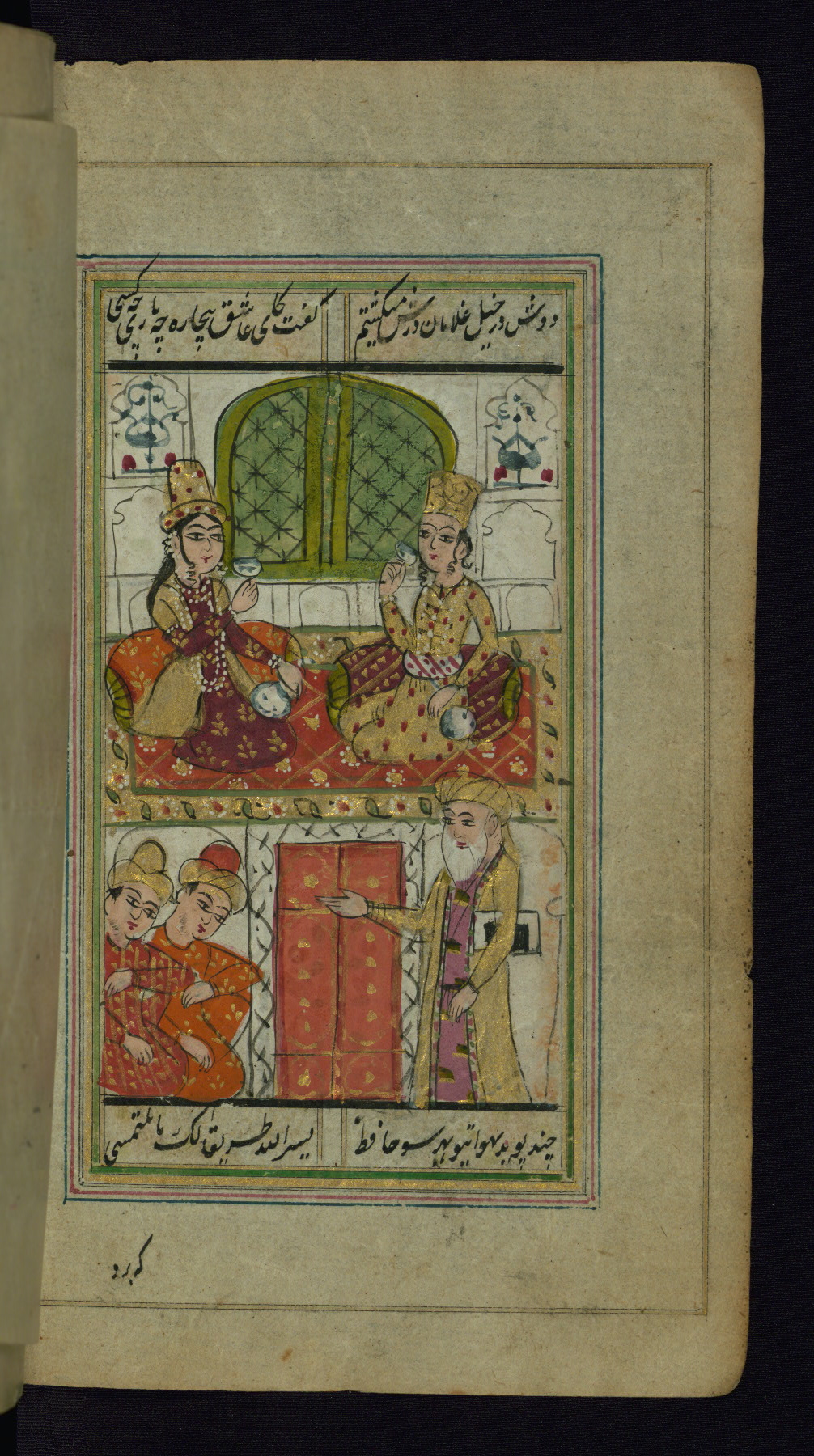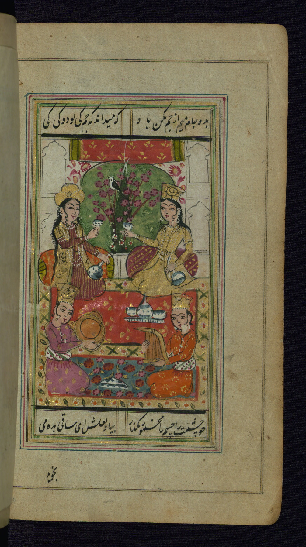 This is an illuminated and illustrated Collection of poems (dīvān) by Shams al-Dīn Muḥammad Ḥāfiz al-Shīrāzī (fl. eighth century AH / fourteenth CE), which was produced in India. According to the colophon, the manuscript was completed on the 19th Rajab 1202[?] AH / 1788[?] CE. It opens with a double-page illuminated incipit (fols. 1b-2a) with headpiece that introduces the preface (dībāchah) (fols. 1b-4b), followed by another double-page illuminated incipit with headpiece opening the main text of the Dīvān (fols. 5b-6a). The codex is decorated throughout with square and rectangular panels, as well as horizontal bands with floral decoration marking the end of odes, quatrains, or series of verses. There are forty-nine illustrations. The brown leather binding with medallion and pendants is contemporary with the manuscript.