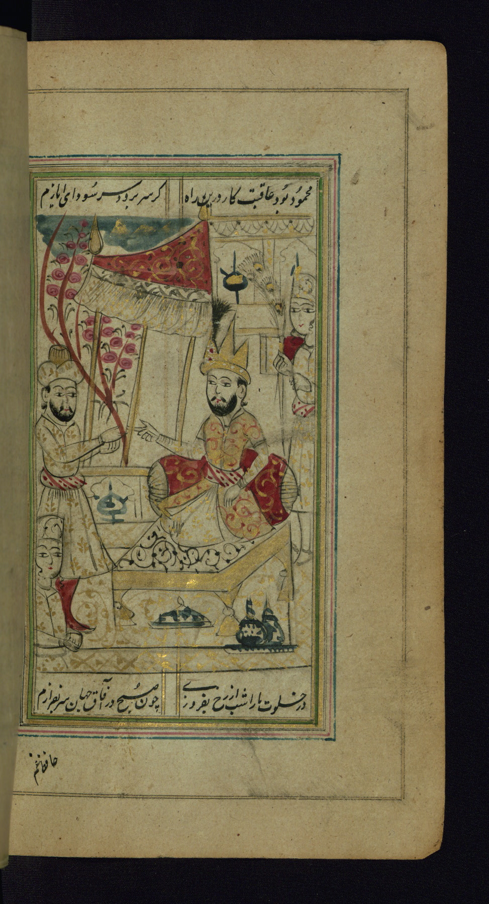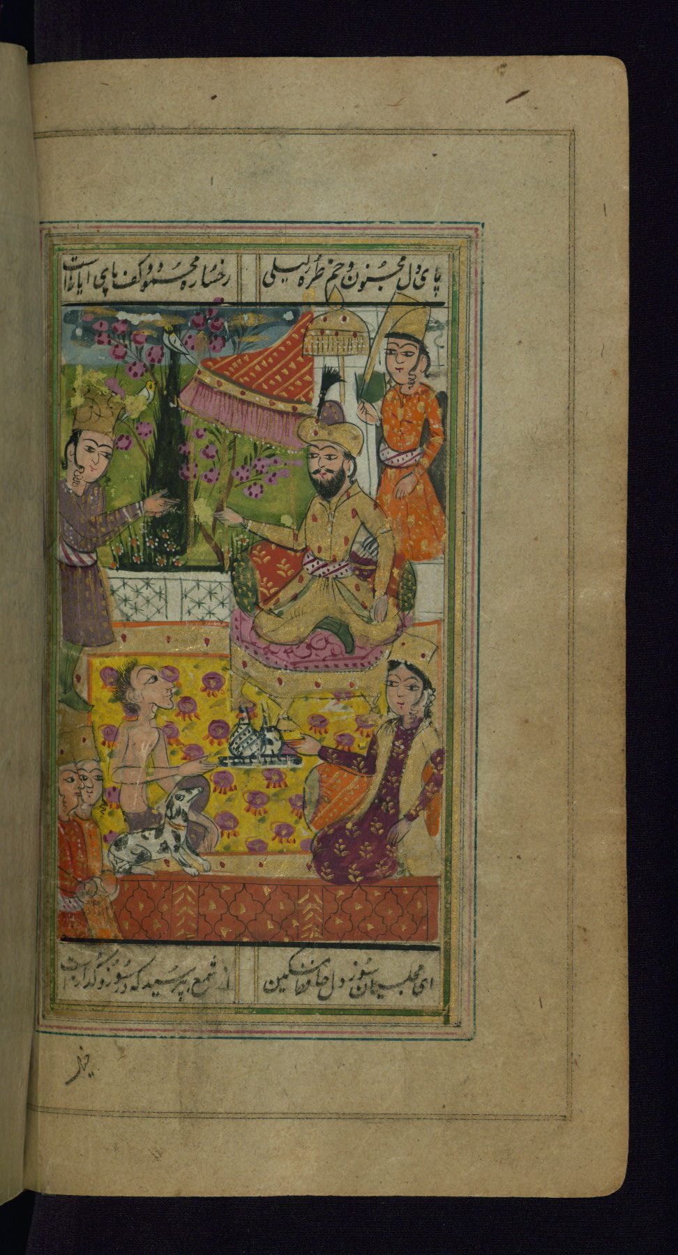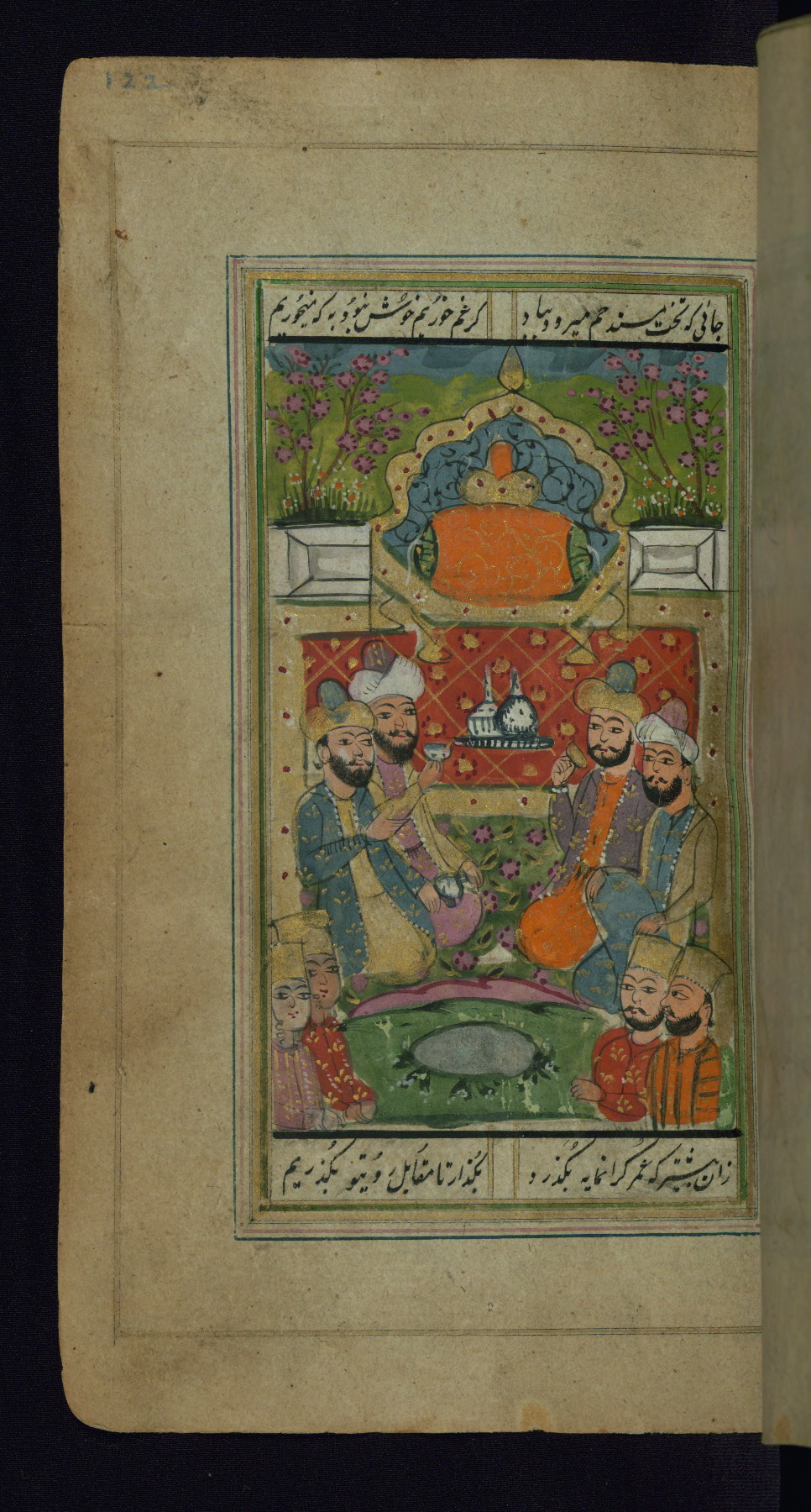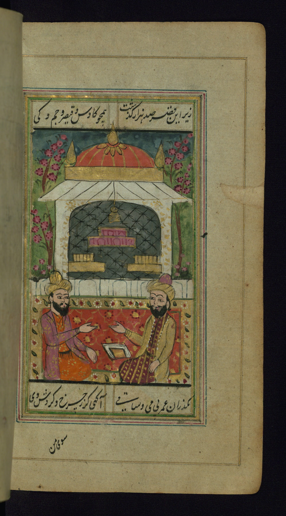 This is an illuminated and illustrated Collection of poems (dīvān) by Shams al-Dīn Muḥammad Ḥāfiz al-Shīrāzī (fl. eighth century AH / fourteenth CE), which was produced in India. According to the colophon, the manuscript was completed on the 19th Rajab 1202[?] AH / 1788[?] CE. It opens with a double-page illuminated incipit (fols. 1b-2a) with headpiece that introduces the preface (dībāchah) (fols. 1b-4b), followed by another double-page illuminated incipit with headpiece opening the main text of the Dīvān (fols. 5b-6a). The codex is decorated throughout with square and rectangular panels, as well as horizontal bands with floral decoration marking the end of odes, quatrains, or series of verses. There are forty-nine illustrations. The brown leather binding with medallion and pendants is contemporary with the manuscript.