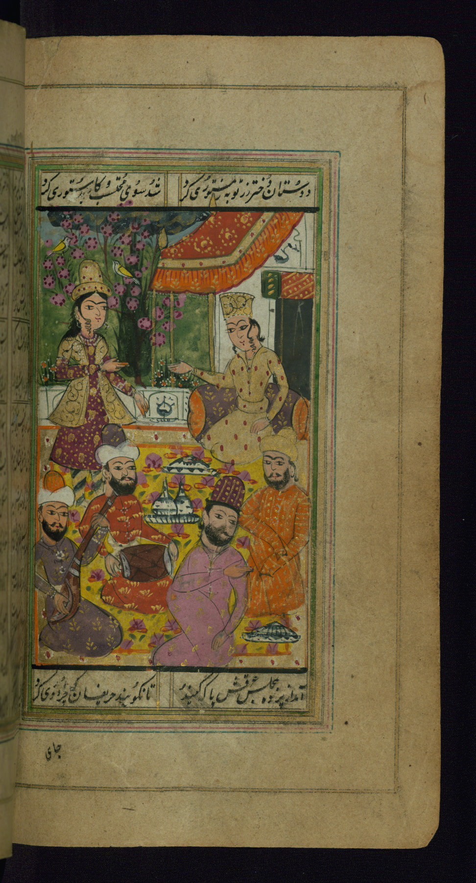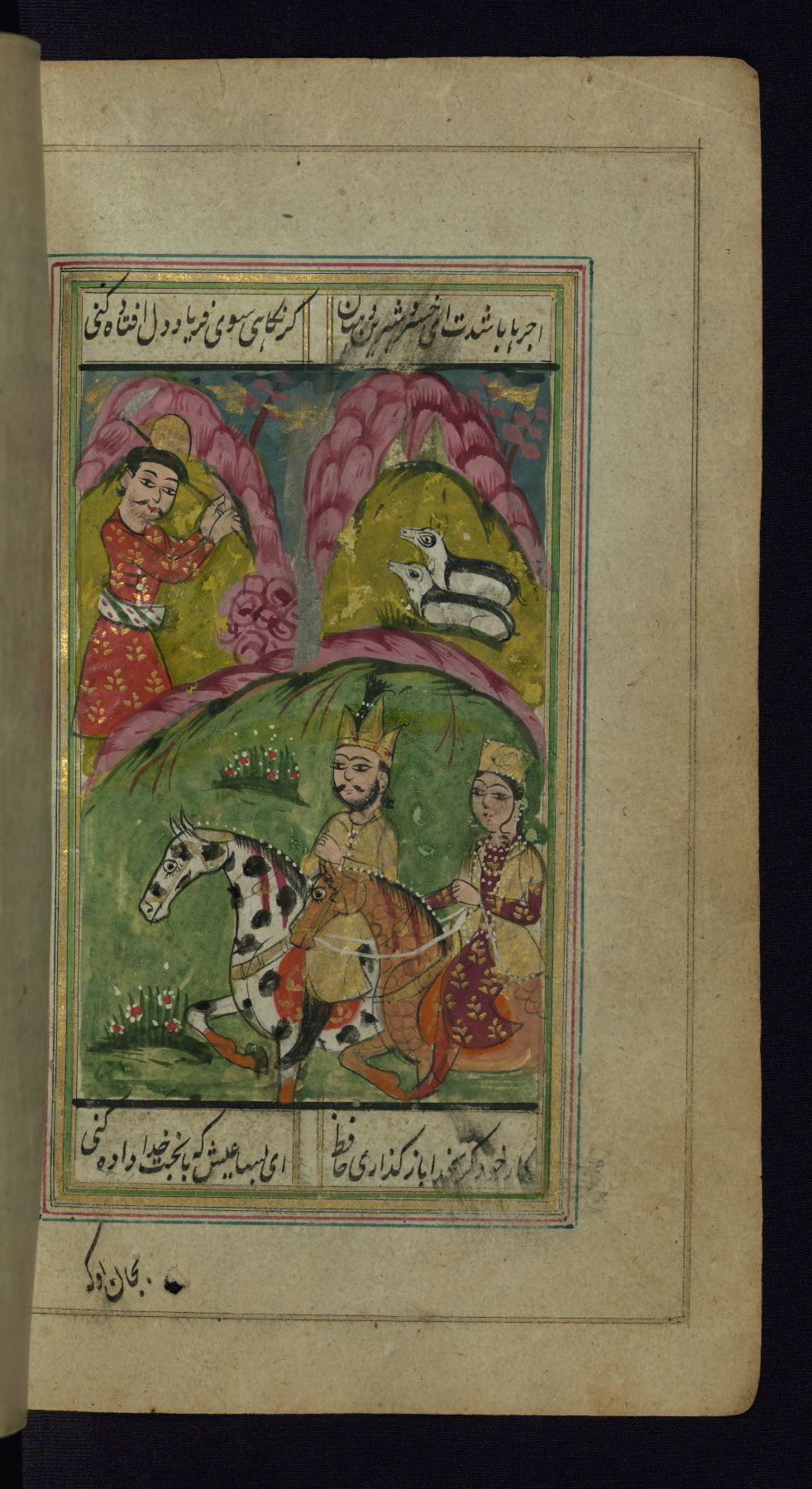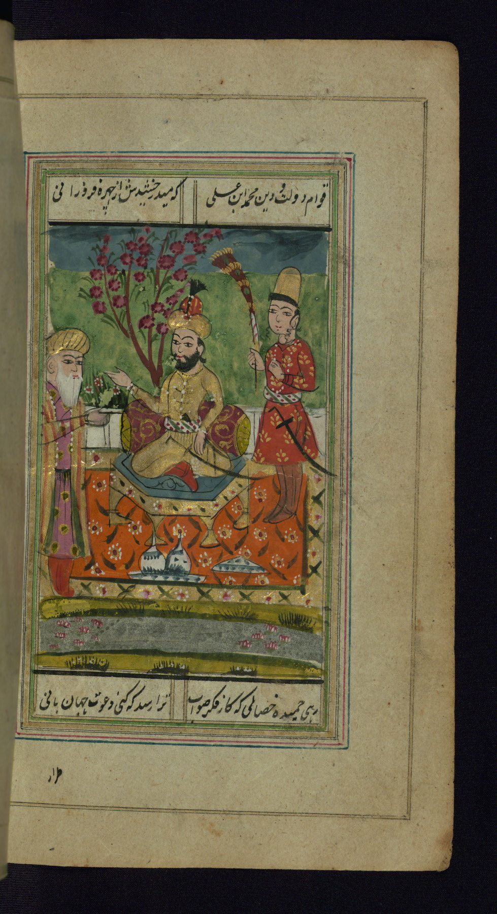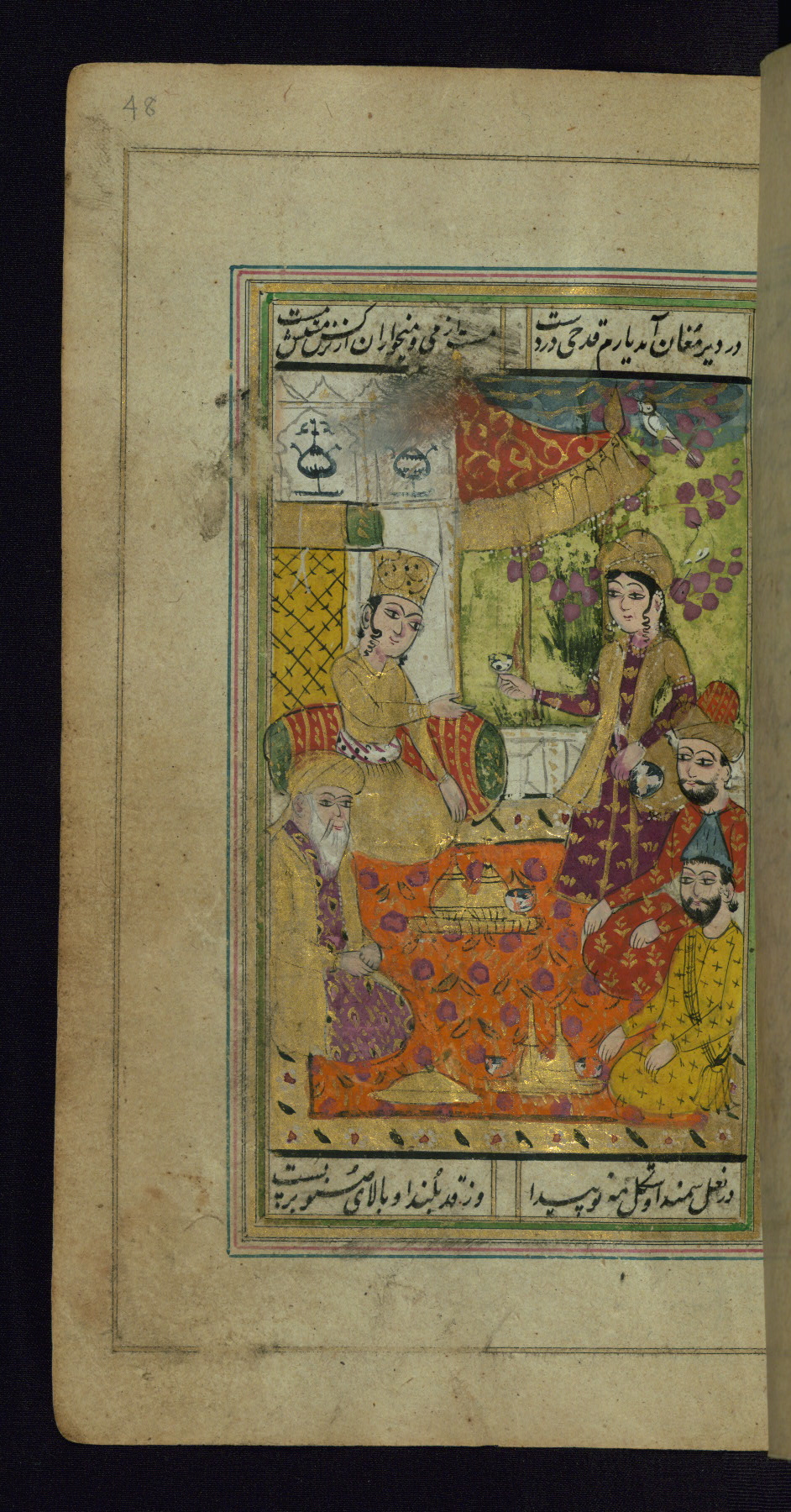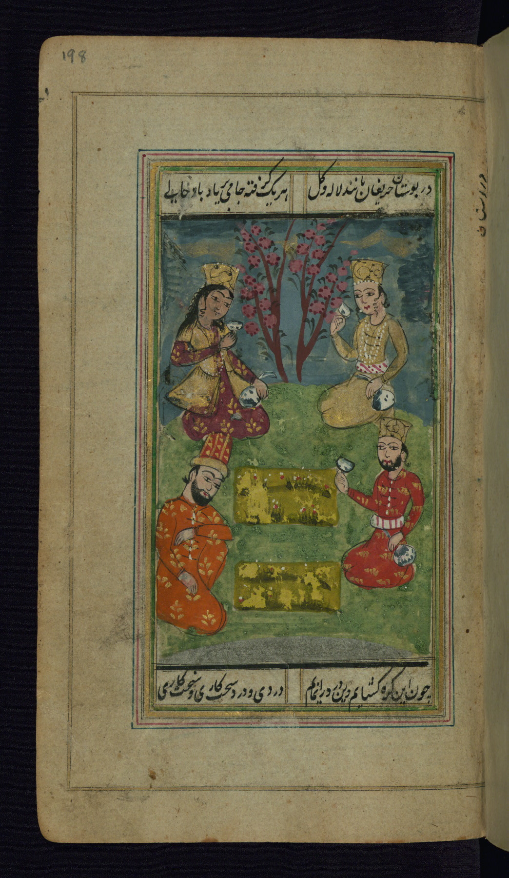 This is an illuminated and illustrated Collection of poems (dīvān) by Shams al-Dīn Muḥammad Ḥāfiz al-Shīrāzī (fl. eighth century AH / fourteenth CE), which was produced in India. According to the colophon, the manuscript was completed on the 19th Rajab 1202[?] AH / 1788[?] CE. It opens with a double-page illuminated incipit (fols. 1b-2a) with headpiece that introduces the preface (dībāchah) (fols. 1b-4b), followed by another double-page illuminated incipit with headpiece opening the main text of the Dīvān (fols. 5b-6a). The codex is decorated throughout with square and rectangular panels, as well as horizontal bands with floral decoration marking the end of odes, quatrains, or series of verses. There are forty-nine illustrations. The brown leather binding with medallion and pendants is contemporary with the manuscript.