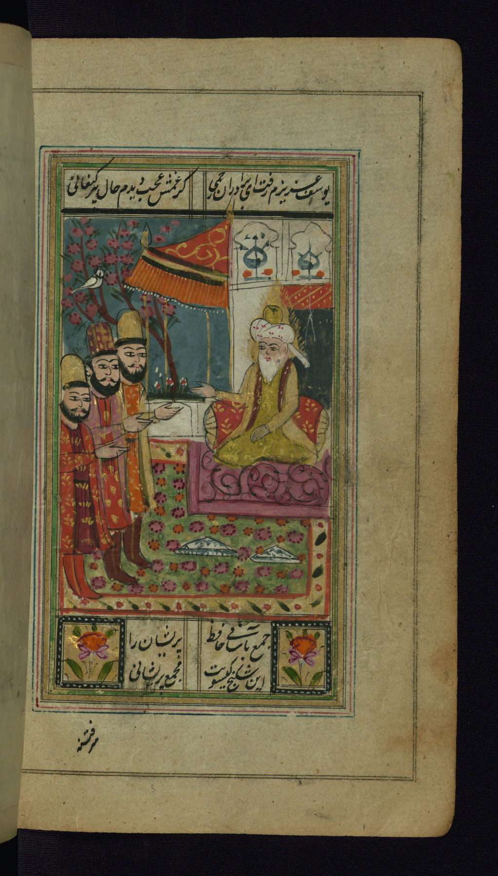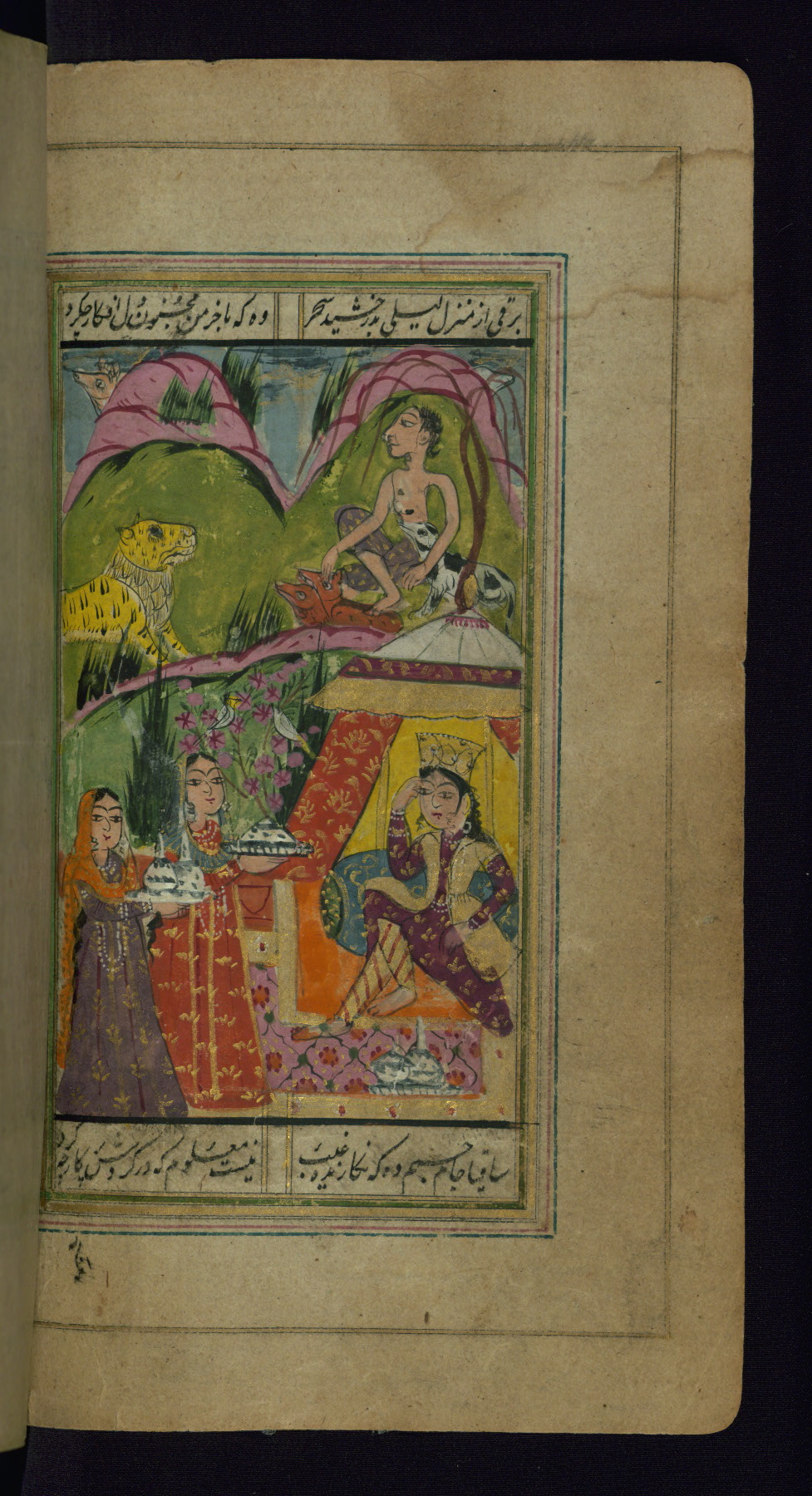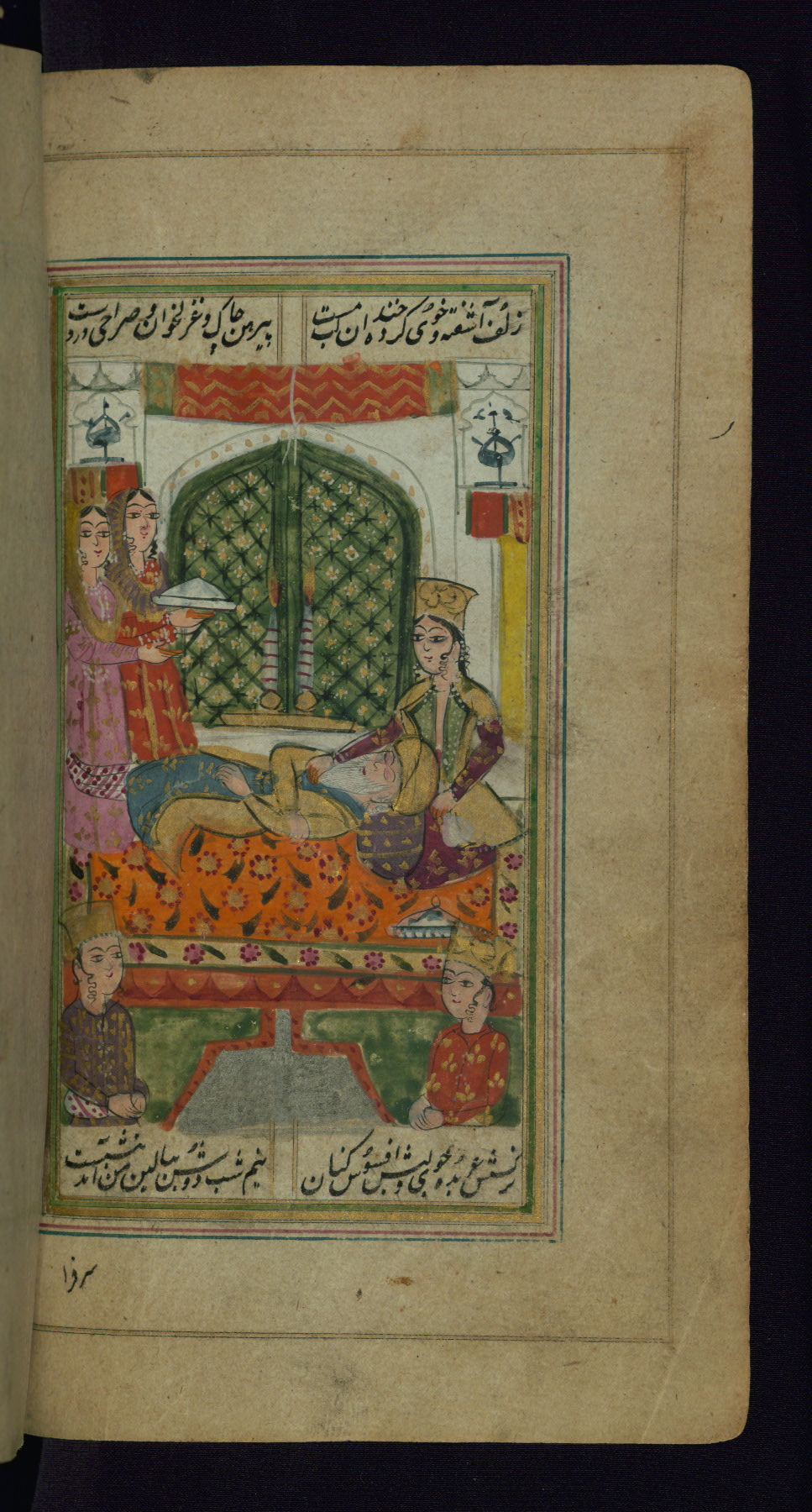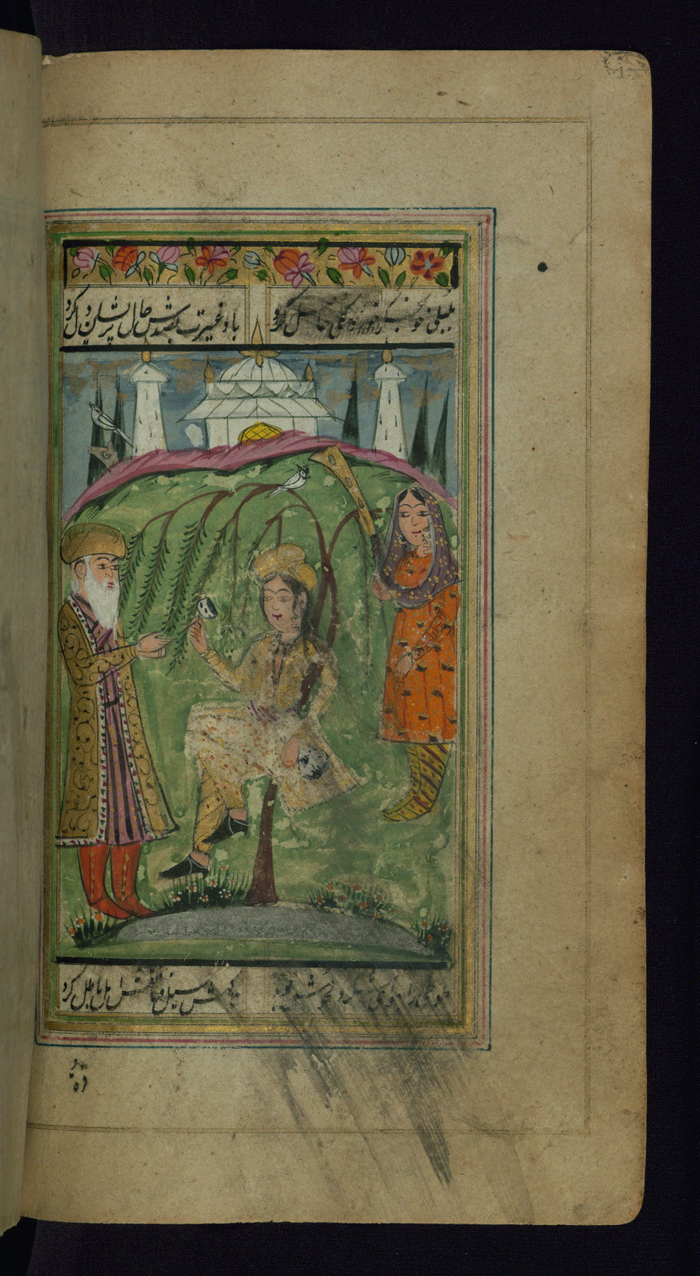This is an illuminated and illustrated Collection of poems (dīvān) by Shams al-Dīn Muḥammad Ḥāfiz al-Shīrāzī (fl. eighth century AH / fourteenth CE), which was produced in India. According to the colophon, the manuscript was completed on the 19th Rajab 1202[?] AH / 1788[?] CE. It opens with a double-page illuminated incipit (fols. 1b-2a) with headpiece that introduces the preface (dībāchah) (fols. 1b-4b), followed by another double-page illuminated incipit with headpiece opening the main text of the Dīvān (fols. 5b-6a). The codex is decorated throughout with square and rectangular panels, as well as horizontal bands with floral decoration marking the end of odes, quatrains, or series of verses. There are forty-nine illustrations. The brown leather binding with medallion and pendants is contemporary with the manuscript.