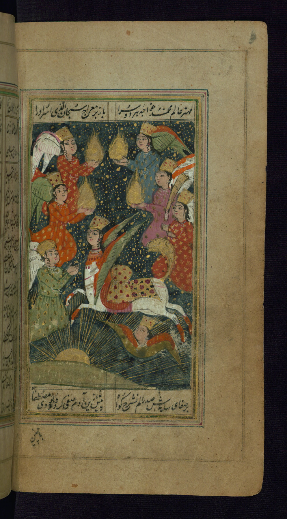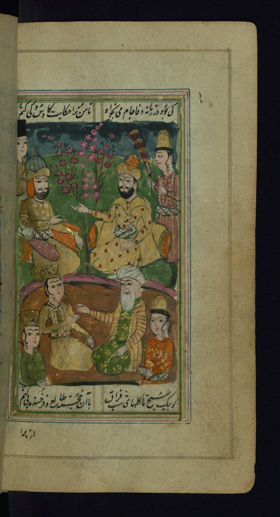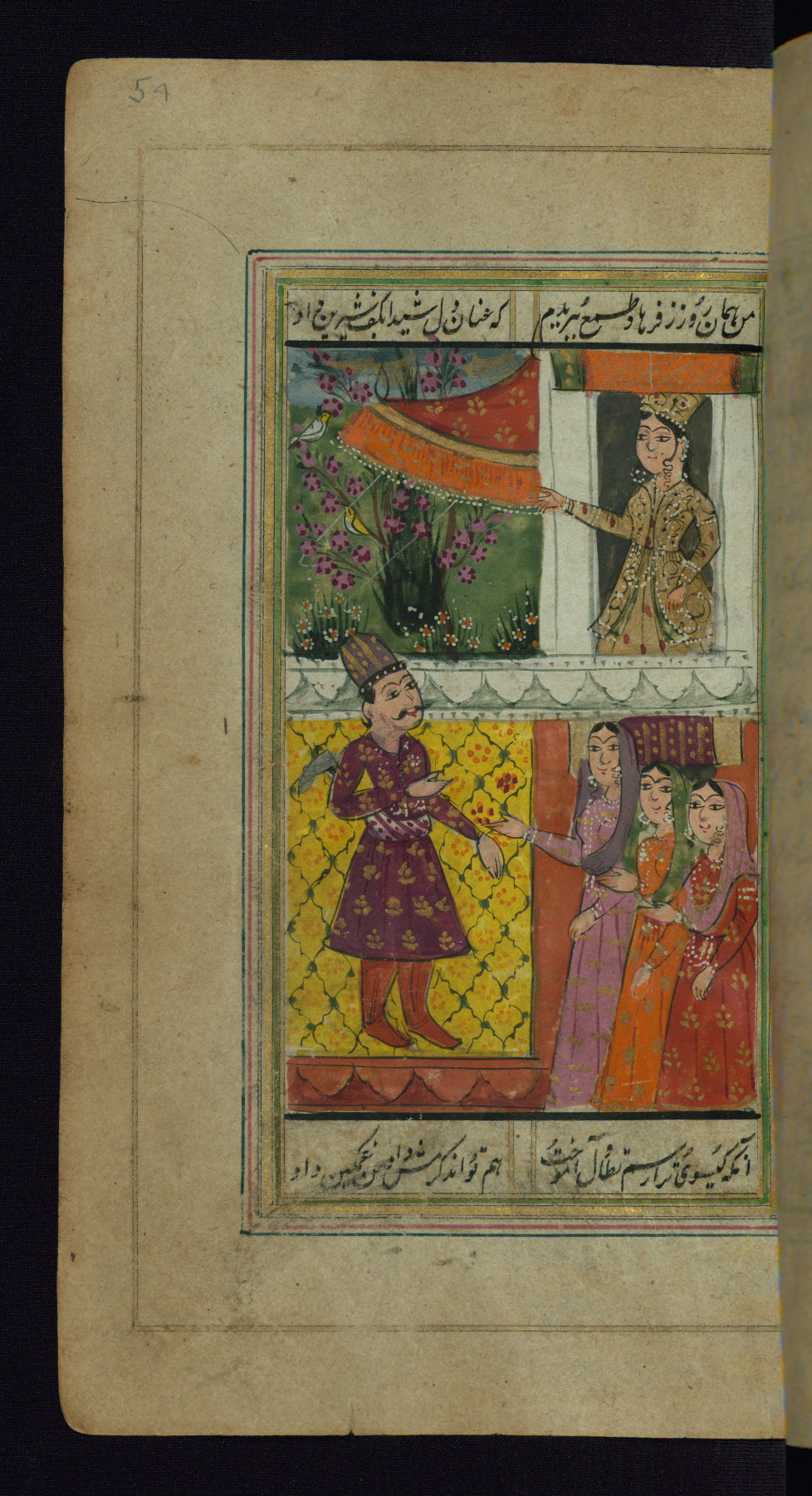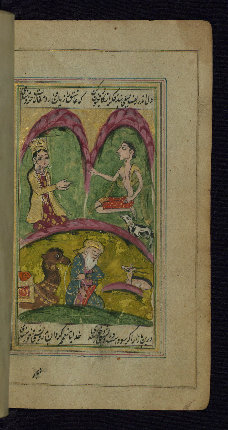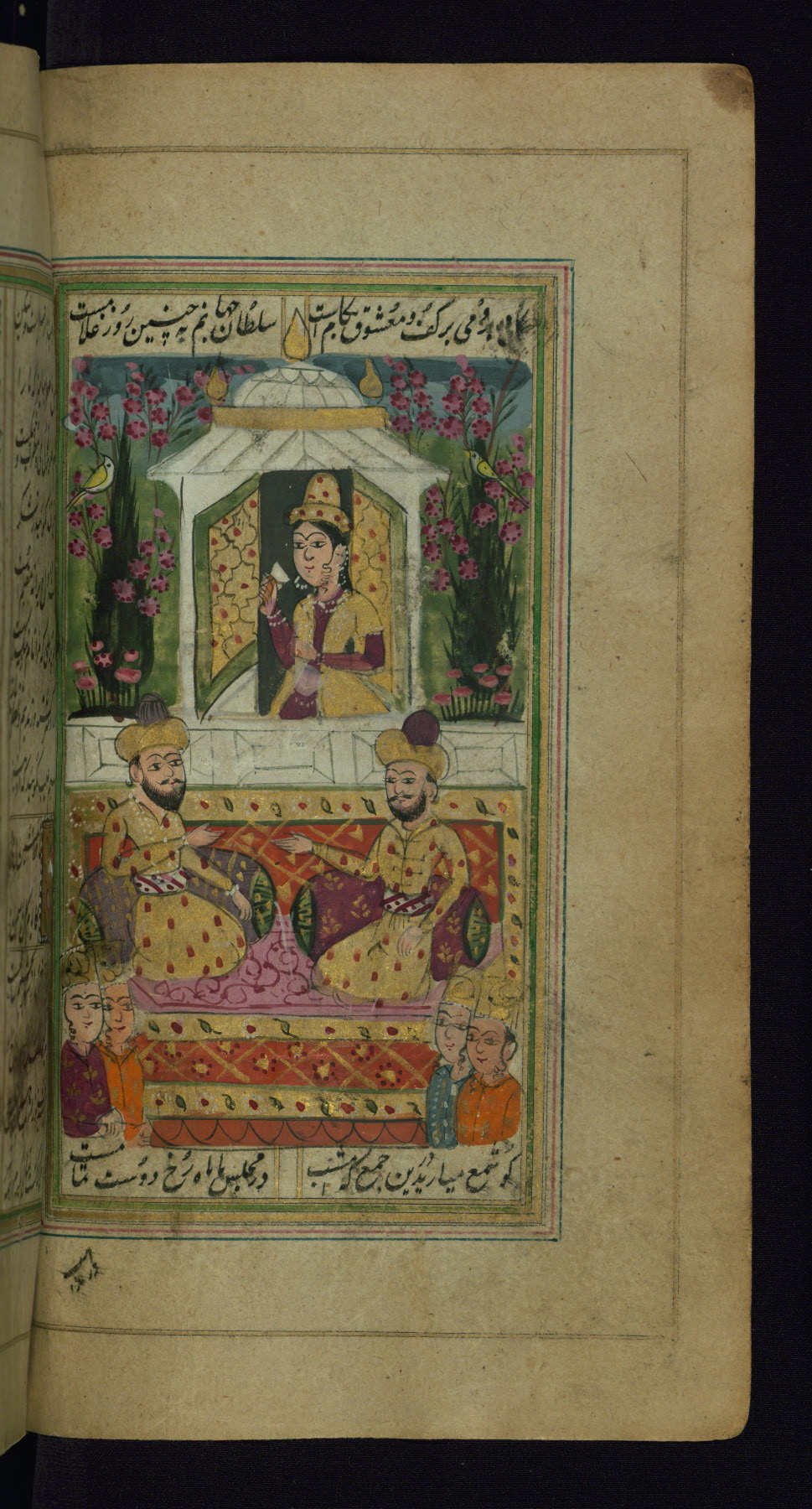 This is an illuminated and illustrated Collection of poems (dīvān) by Shams al-Dīn Muḥammad Ḥāfiz al-Shīrāzī (fl. eighth century AH / fourteenth CE), which was produced in India. According to the colophon, the manuscript was completed on the 19th Rajab 1202[?] AH / 1788[?] CE. It opens with a double-page illuminated incipit (fols. 1b-2a) with headpiece that introduces the preface (dībāchah) (fols. 1b-4b), followed by another double-page illuminated incipit with headpiece opening the main text of the Dīvān (fols. 5b-6a). The codex is decorated throughout with square and rectangular panels, as well as horizontal bands with floral decoration marking the end of odes, quatrains, or series of verses. There are forty-nine illustrations. The brown leather binding with medallion and pendants is contemporary with the manuscript.