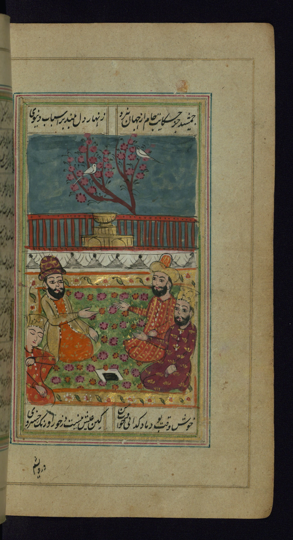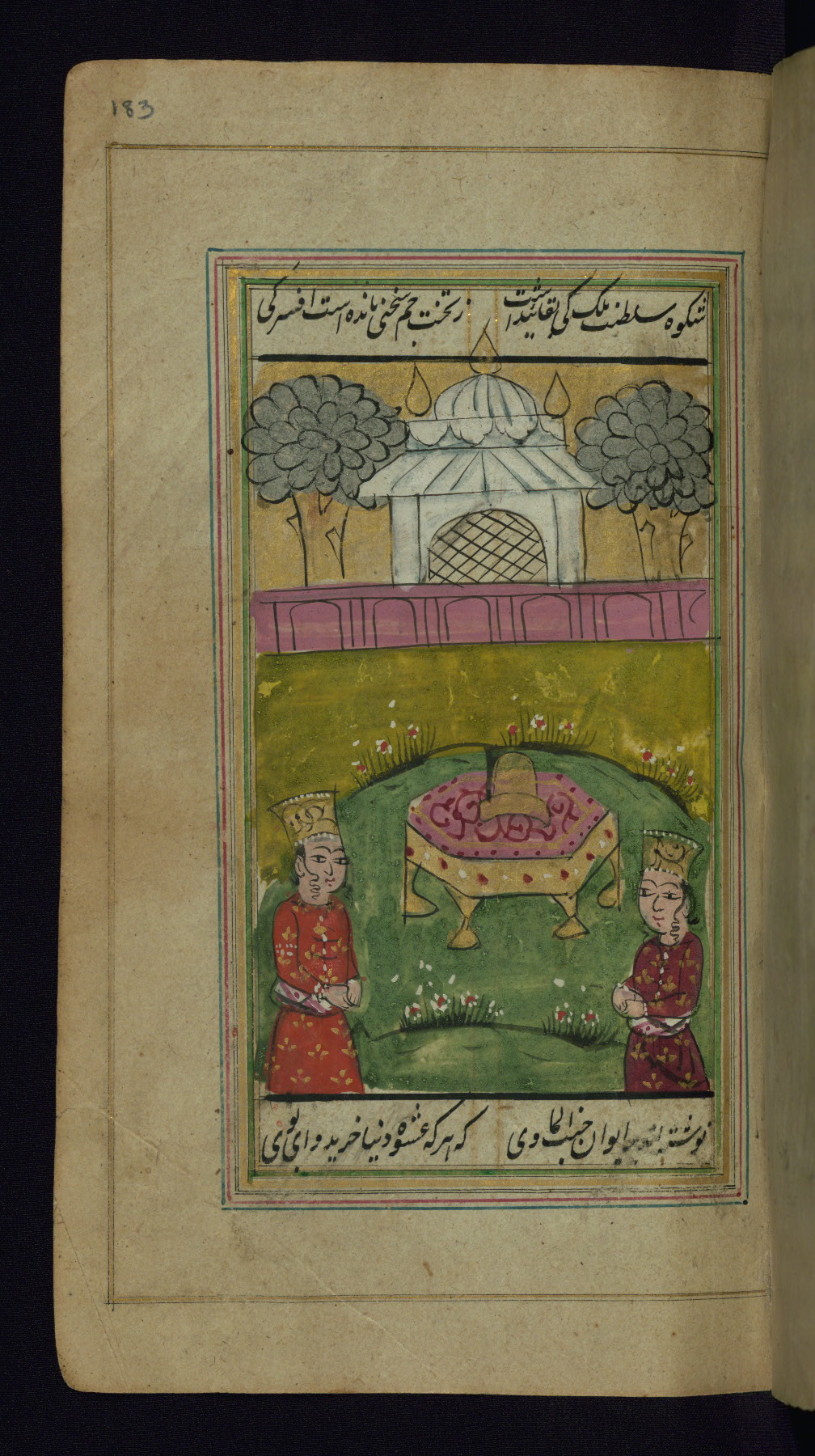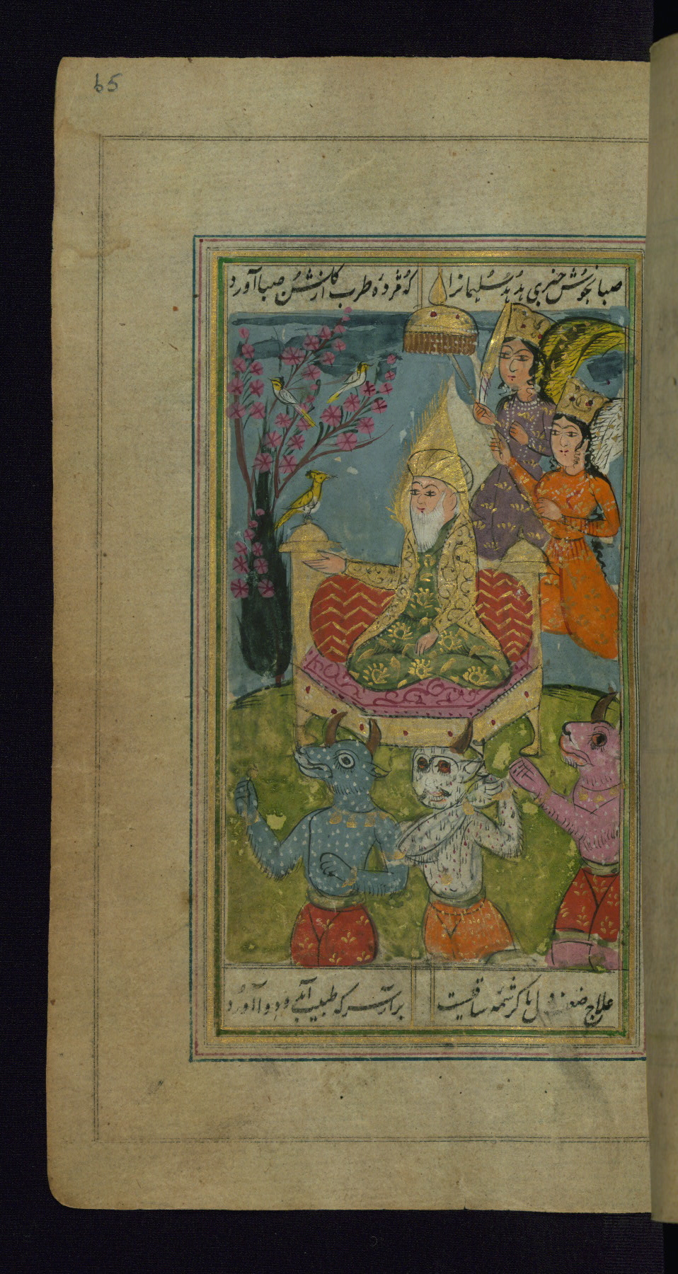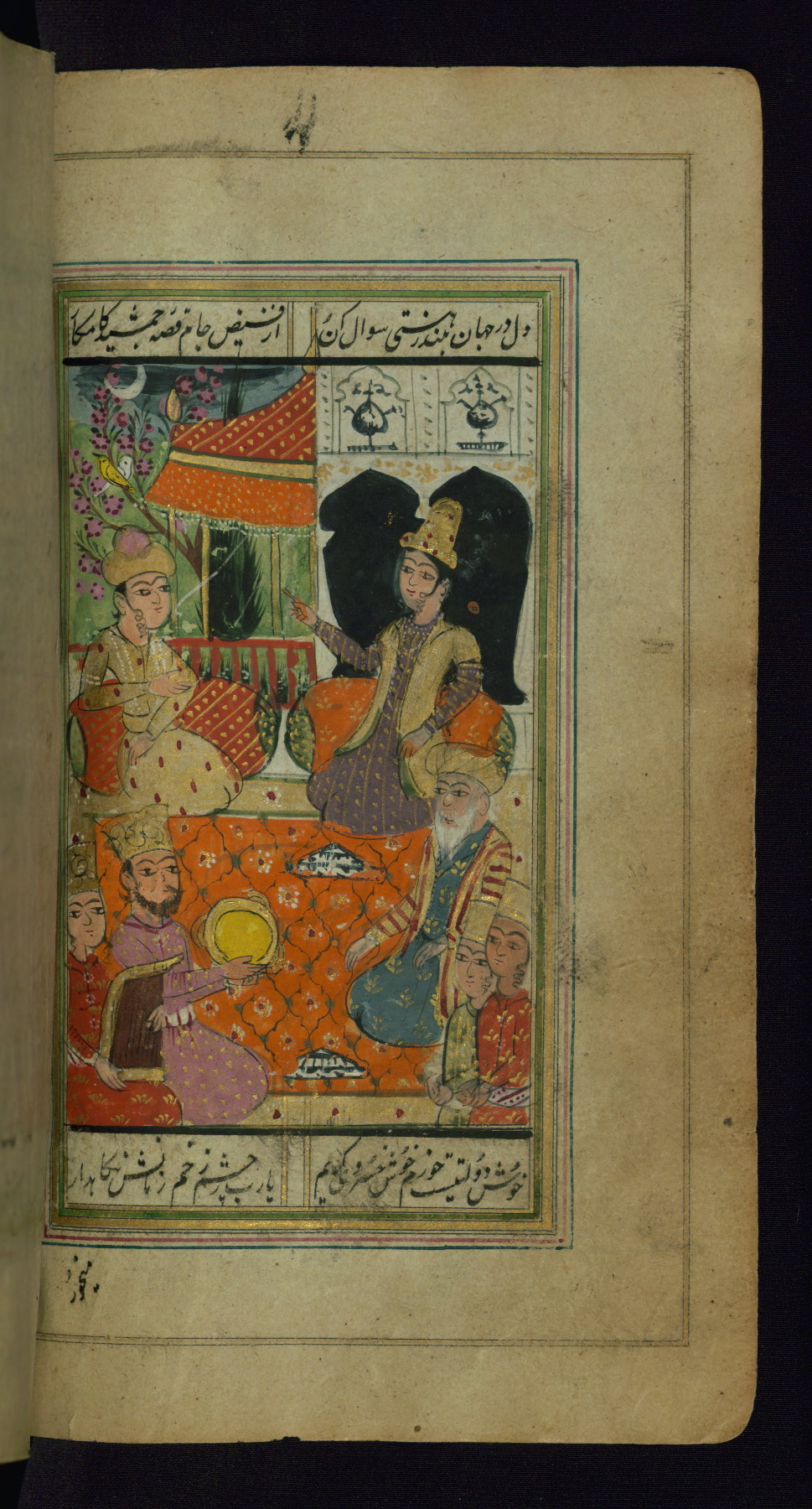 - Label: This scene refers to the first couplet on the page, referring to Jamshīd and his magic bowl (jām).