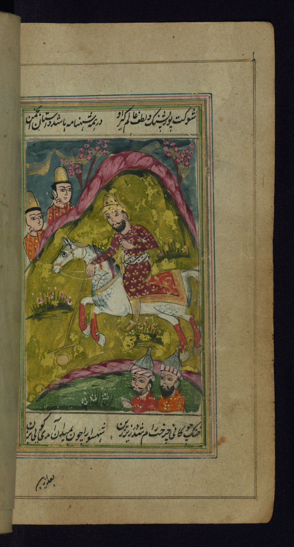 - Label: This illustration relates to the lower verse on this page: "The white horse of fortune became tame under you. You rode well into the field, so go forth and hit the ball."