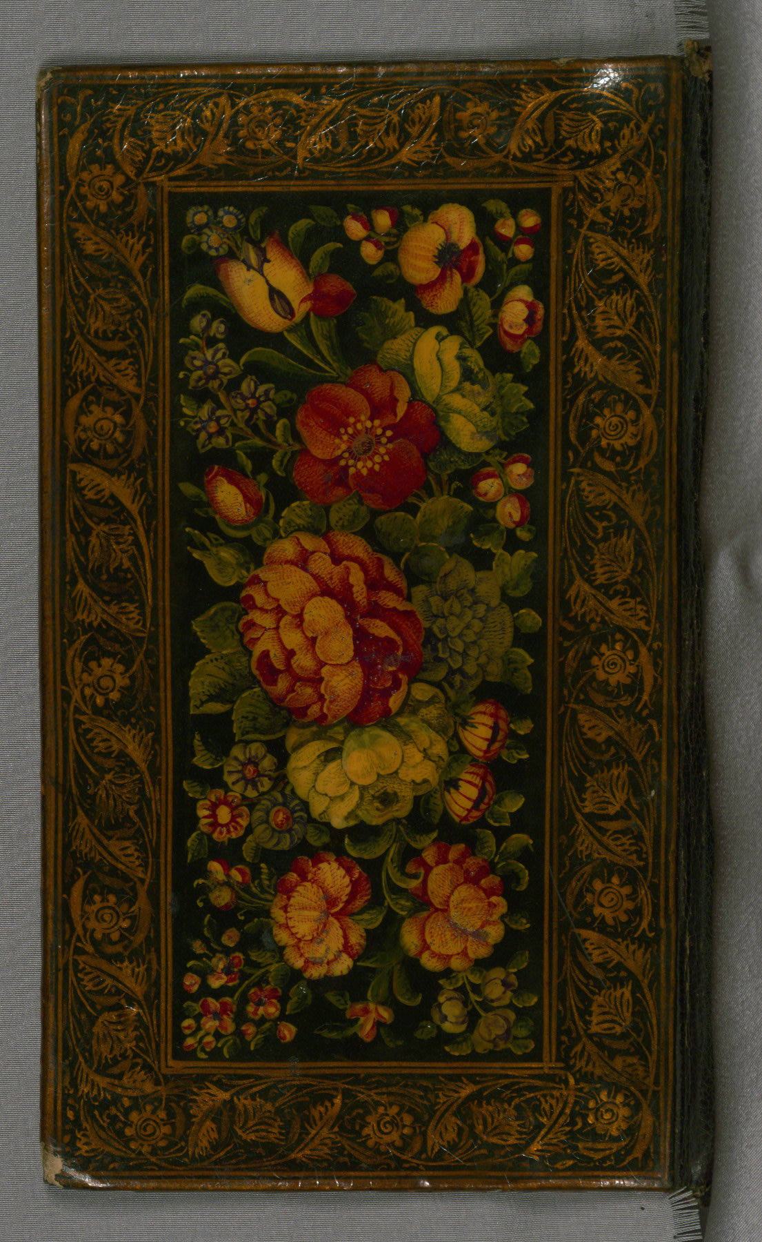 Lacquer binding (without flap); central panel filled with floral design; border with floral gold-painted motifs on a black ground