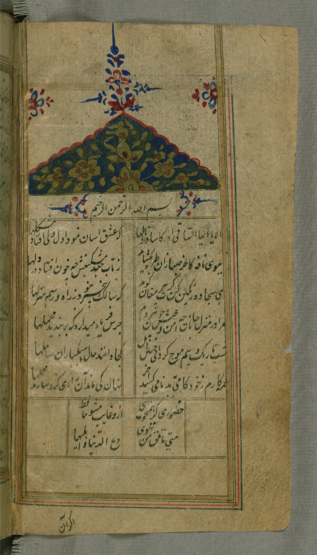 - Label: This painted incipit page has a headpiece inscribed with the doxological formula (basmalah).