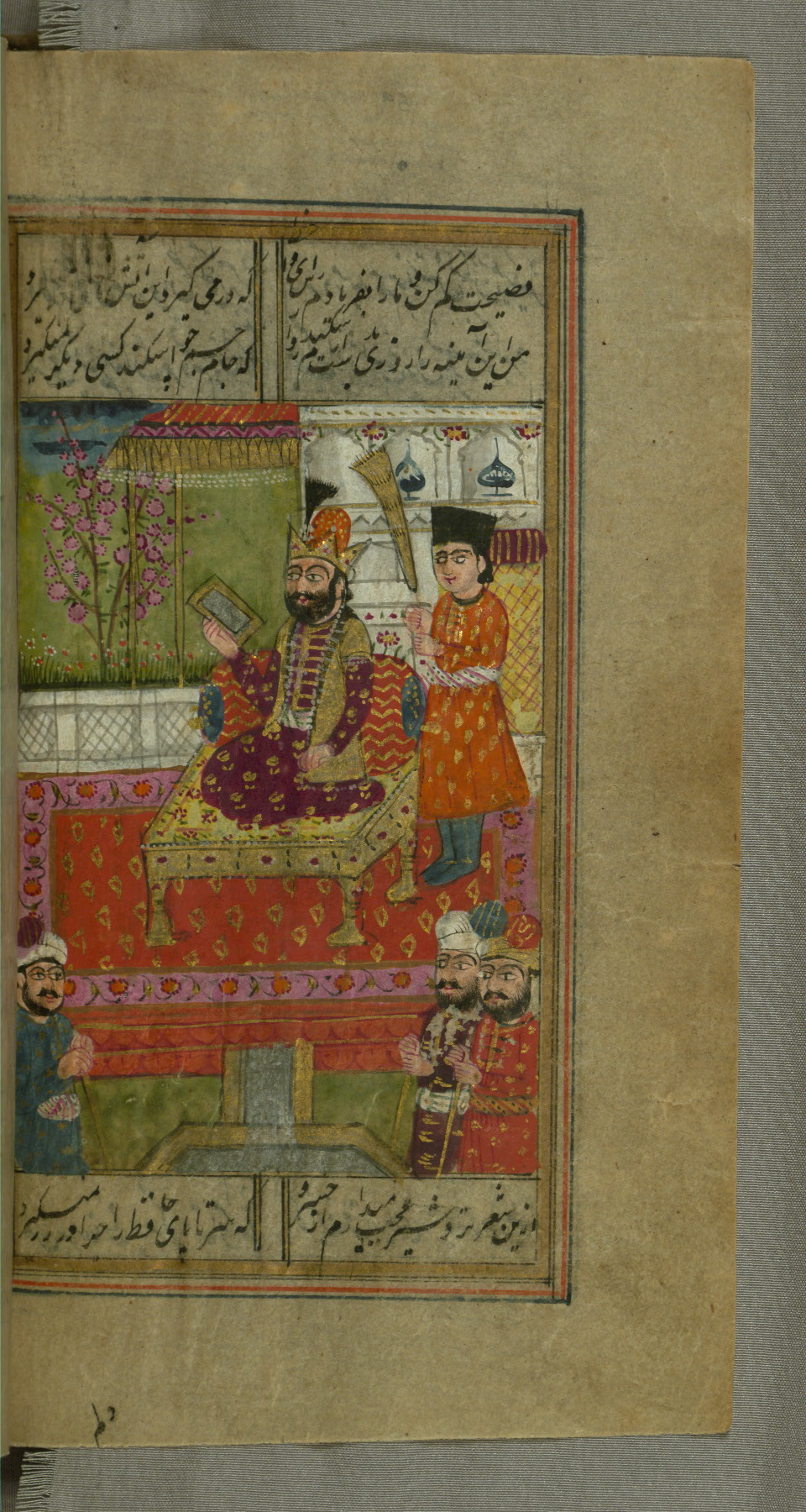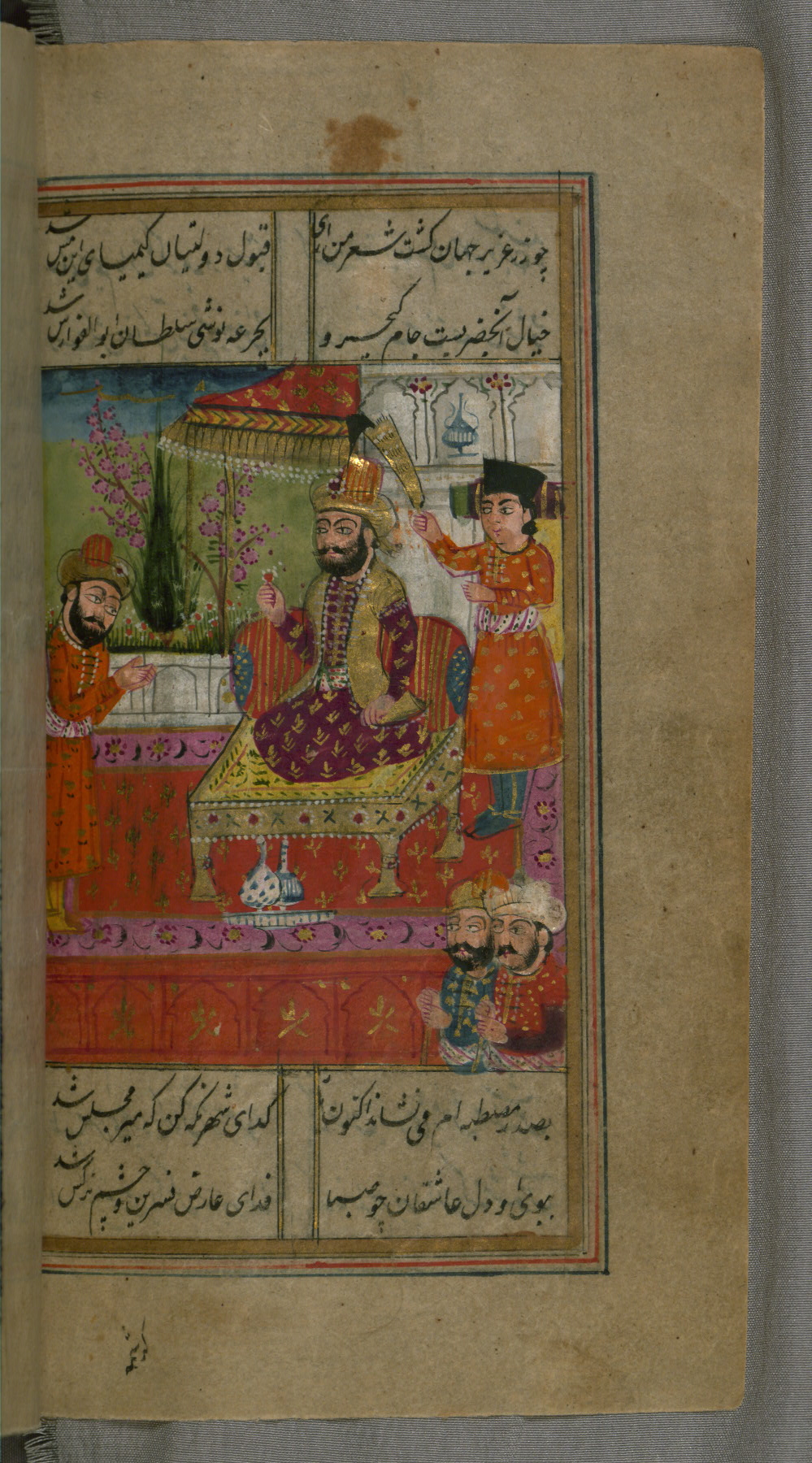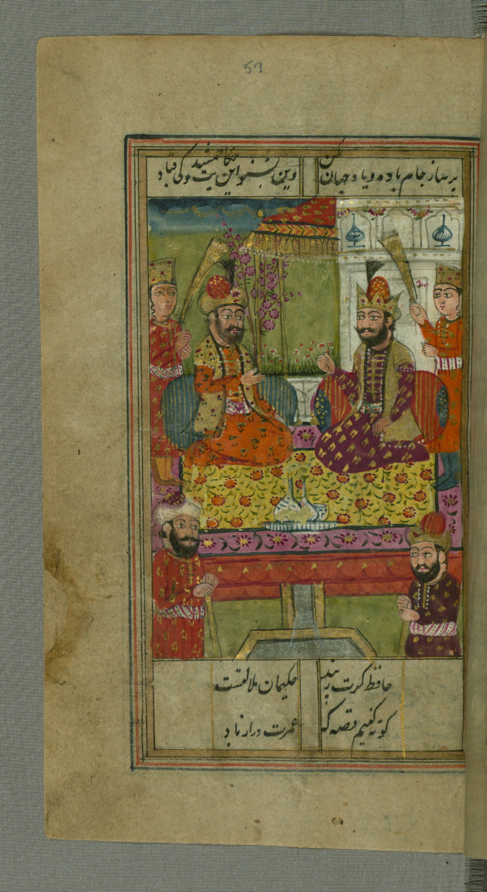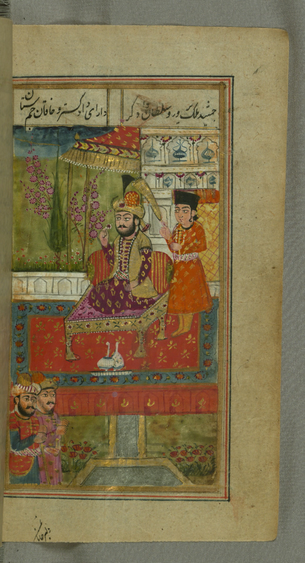 - Label: This page illustrates the first couplet on the page, in which the poet comments that his beloved has hundreds of Jamshīds and Kay Khusraws as slaves.