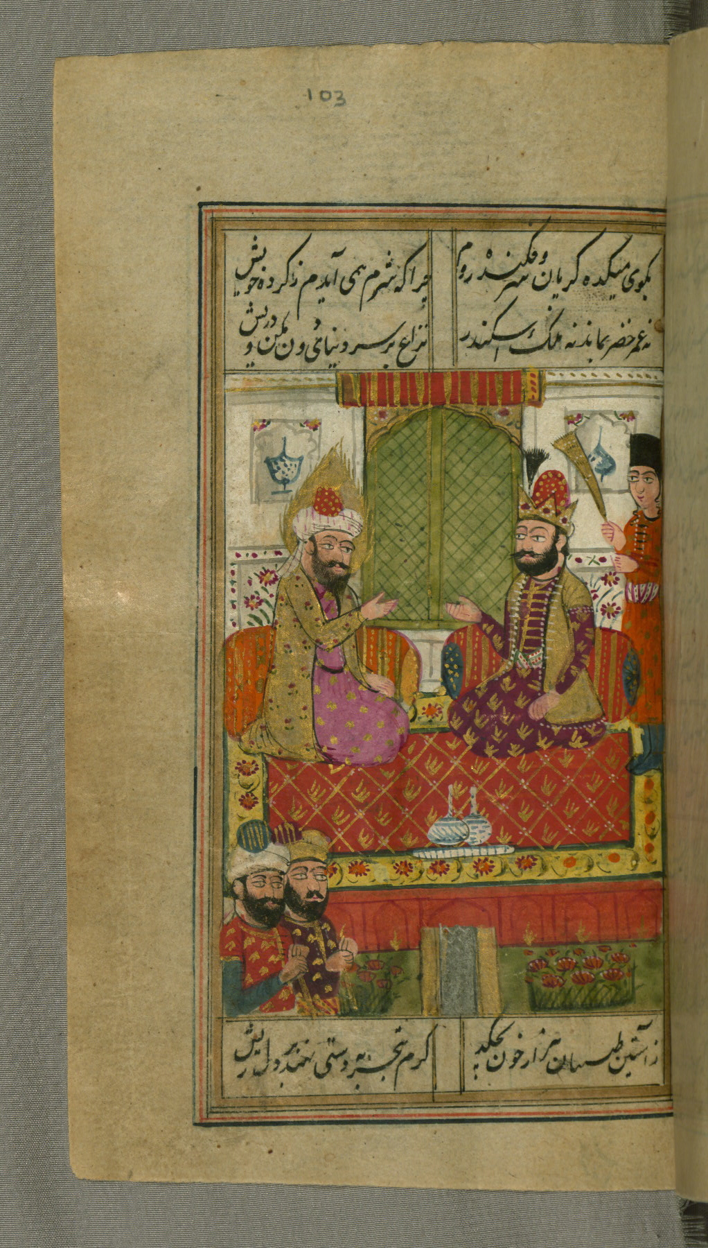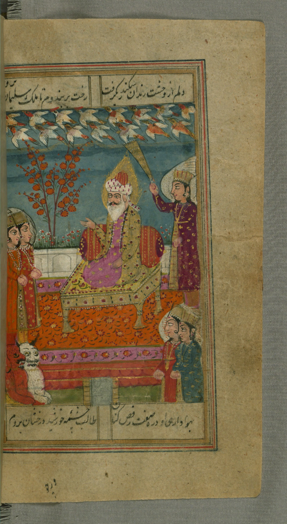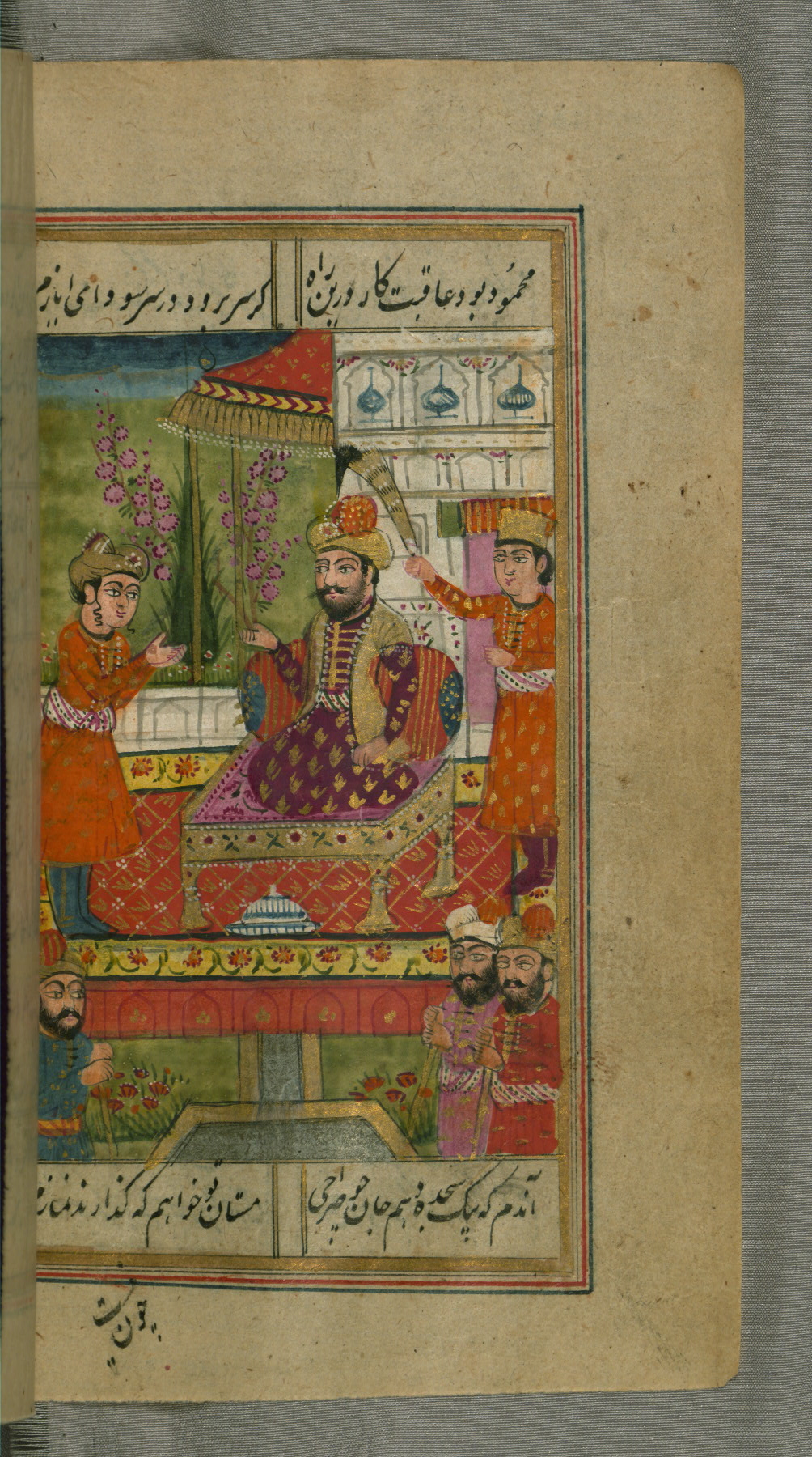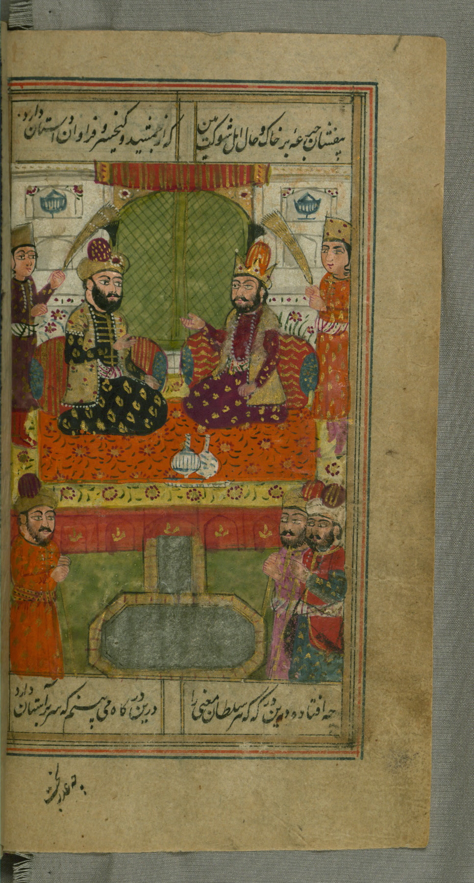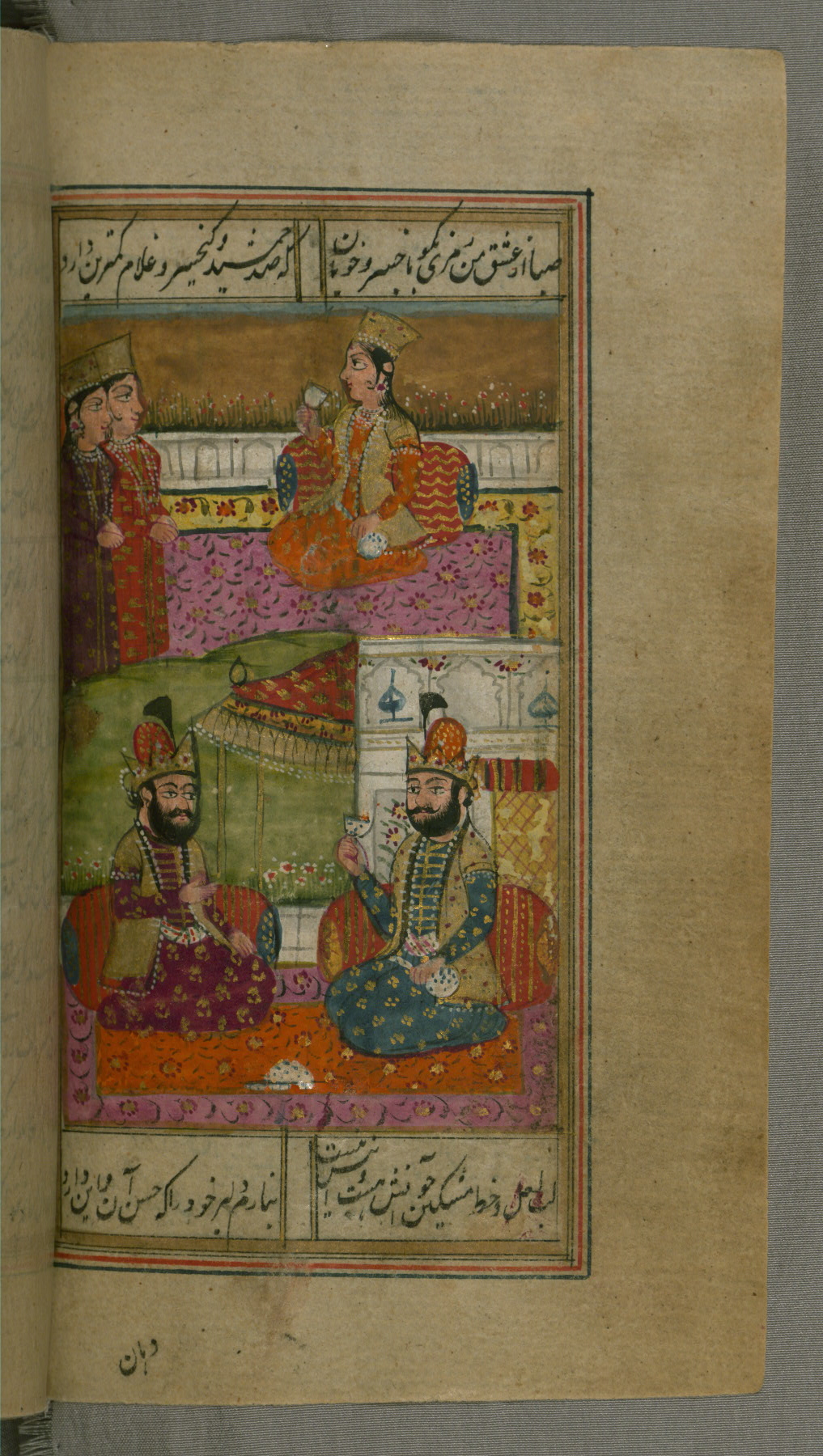 - Label: This page illustrates the first couplet on the page, in which the poet comments that his beloved has hundreds of Jamshīds and Kay Khusraws as slaves.